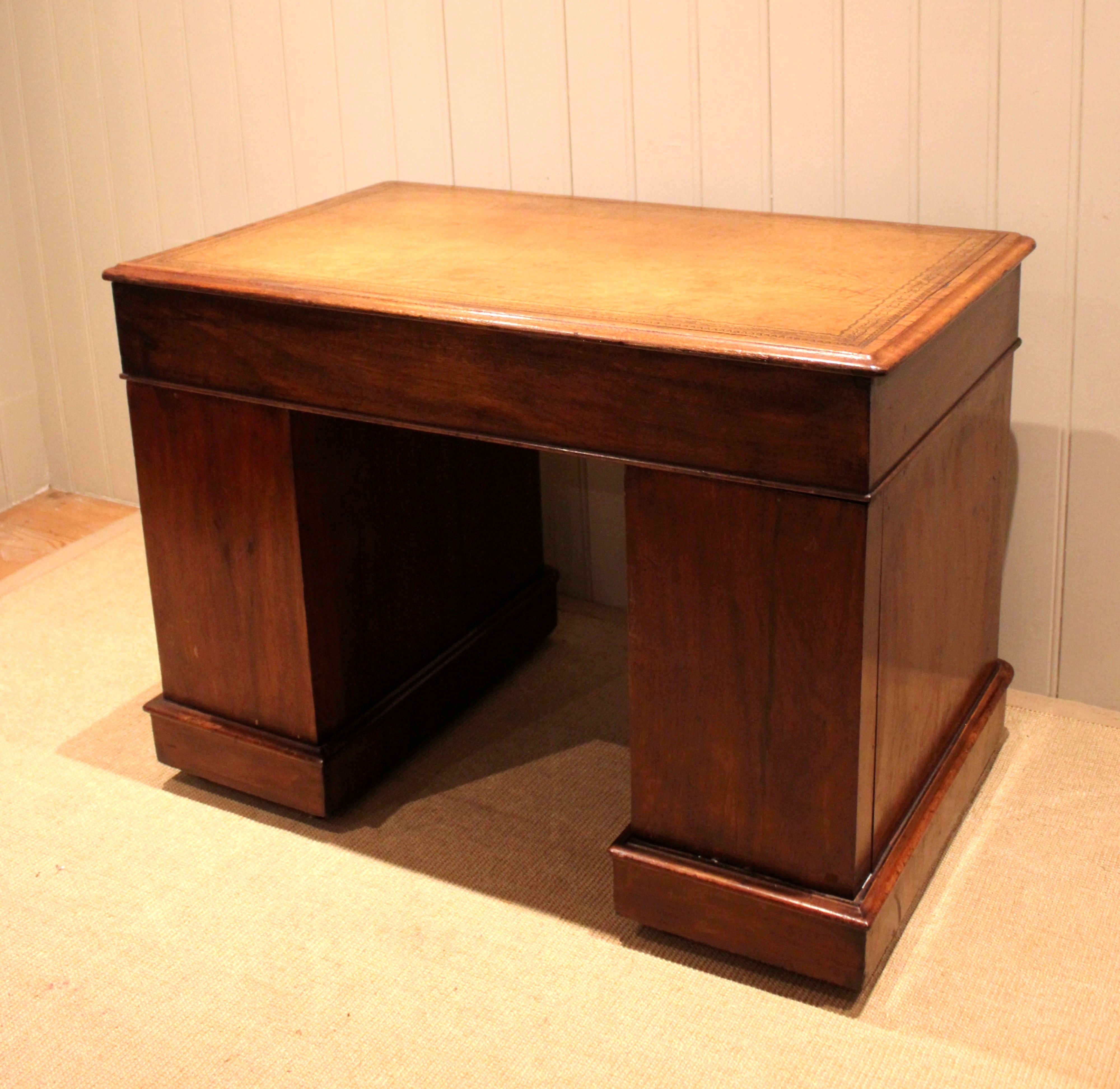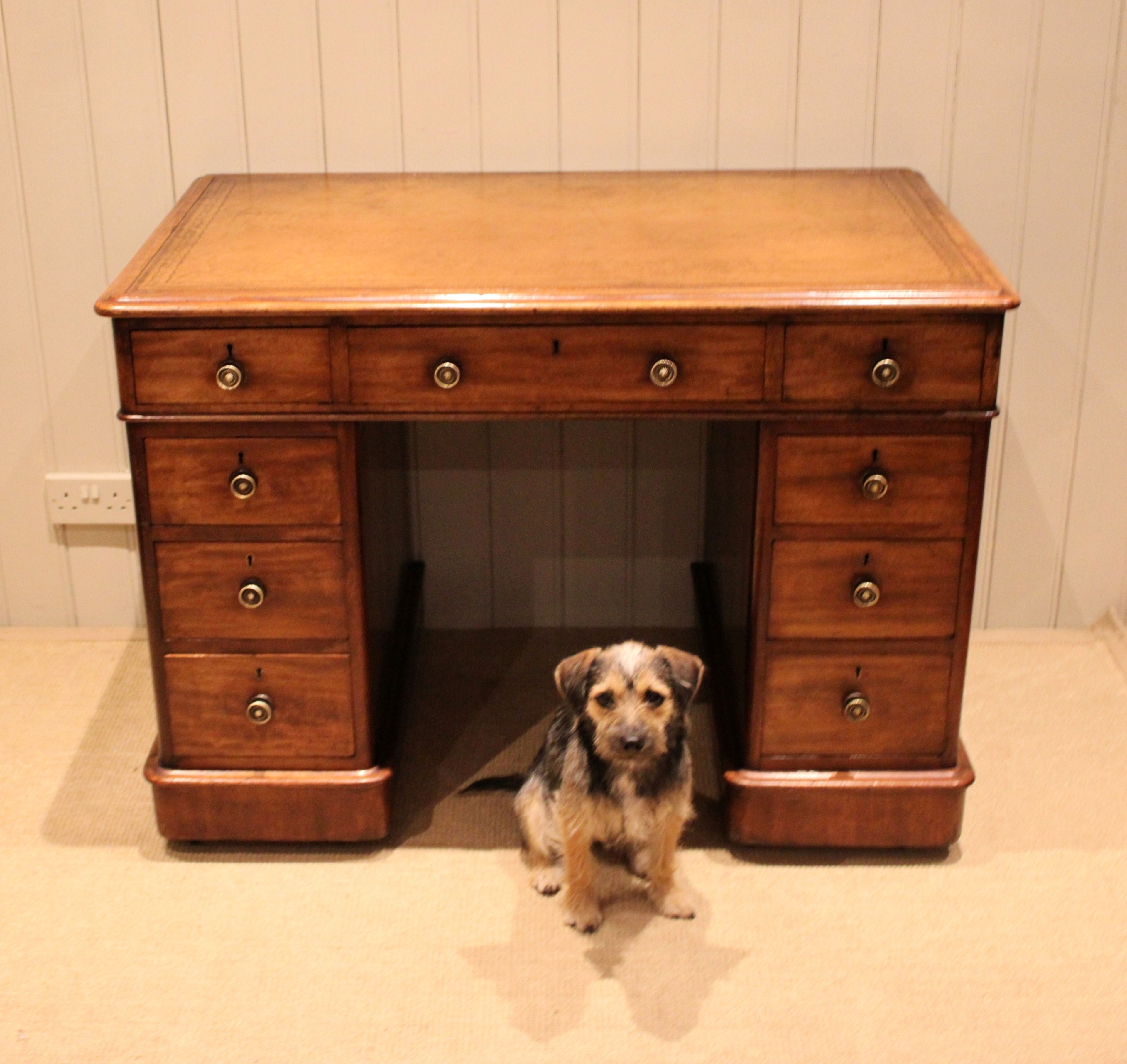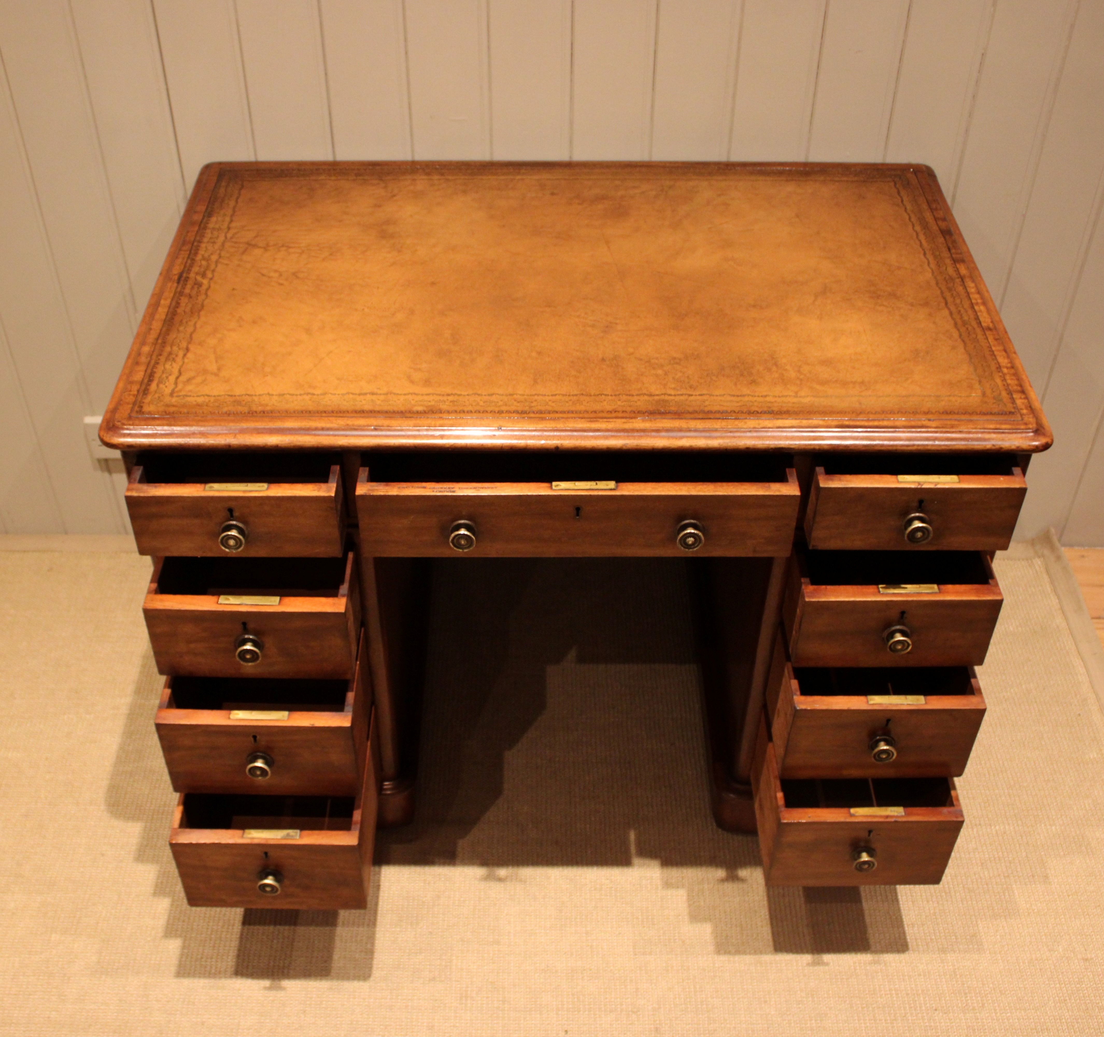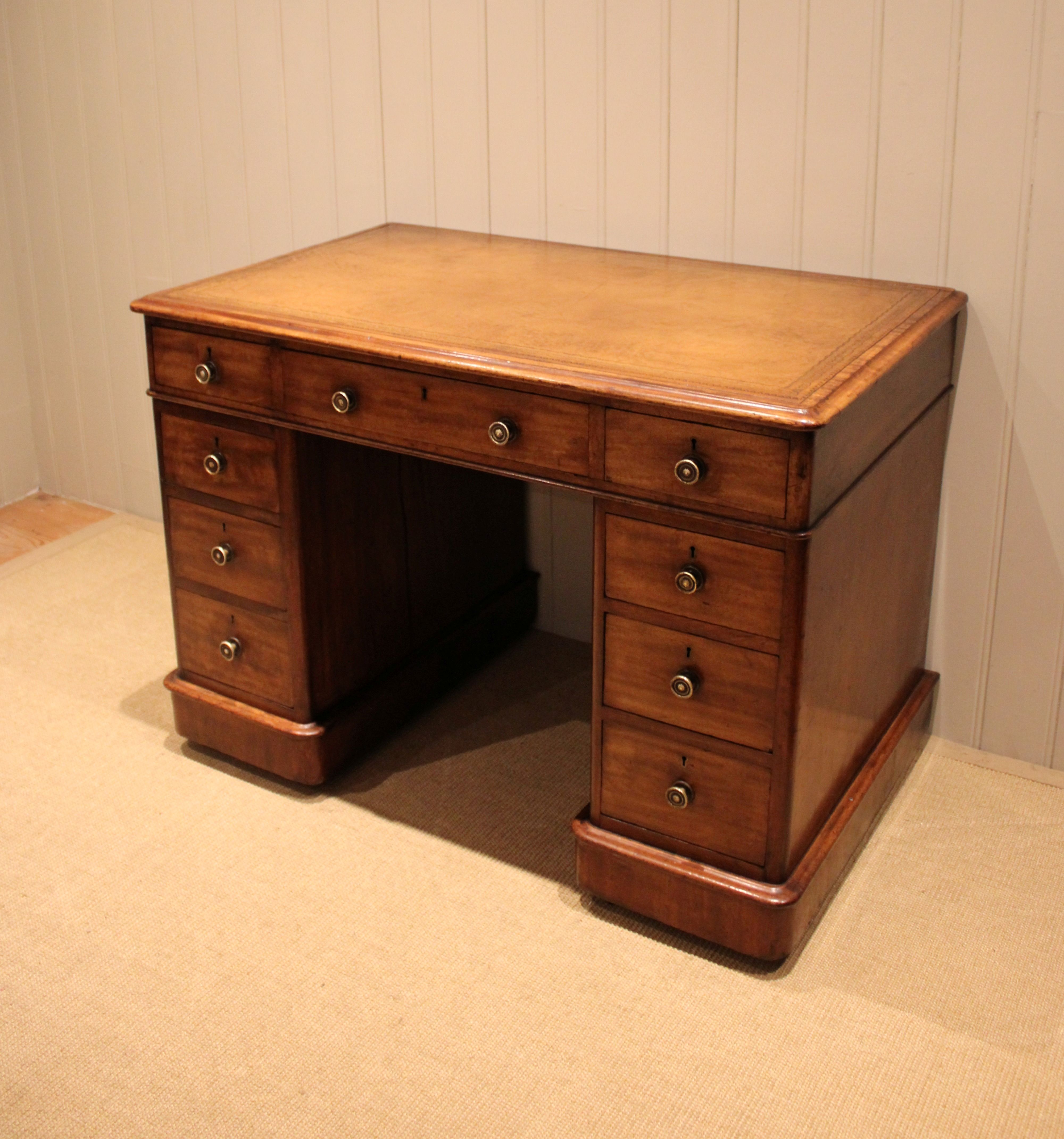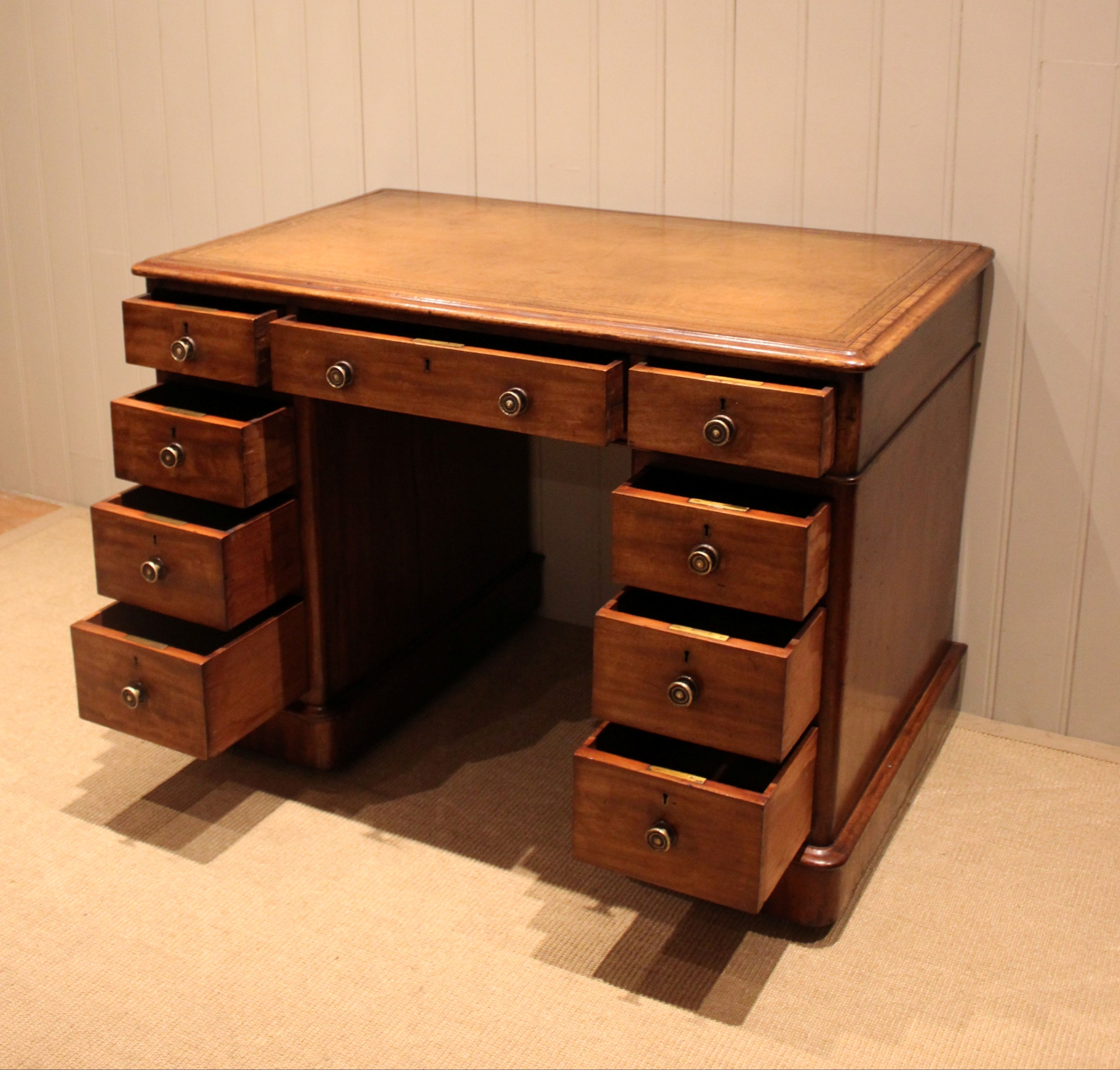 Late 19th century mahogany pedestal desk having a tooled leather top with a central drawer flanked by a further four to each side , raised on a plinth base with the original castors . The pedestal measures 43cm wide by 61 cm high .