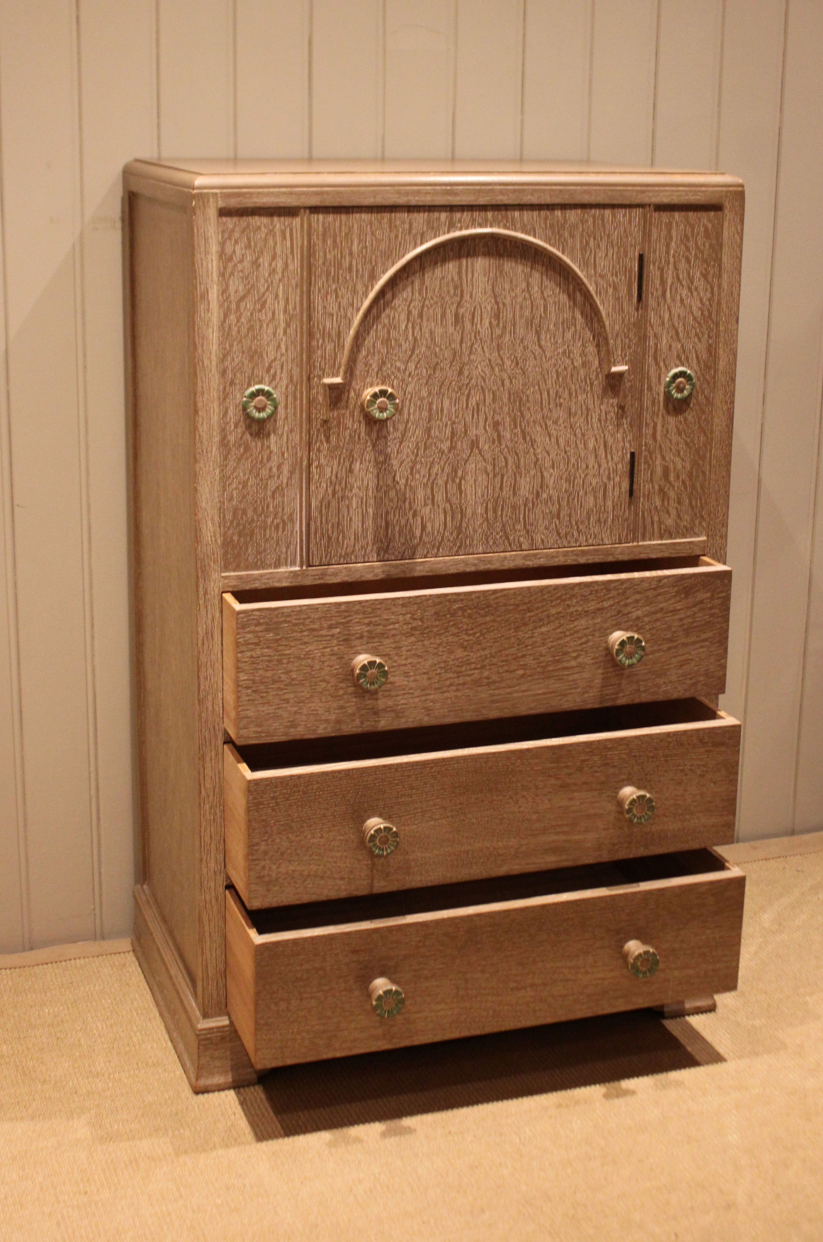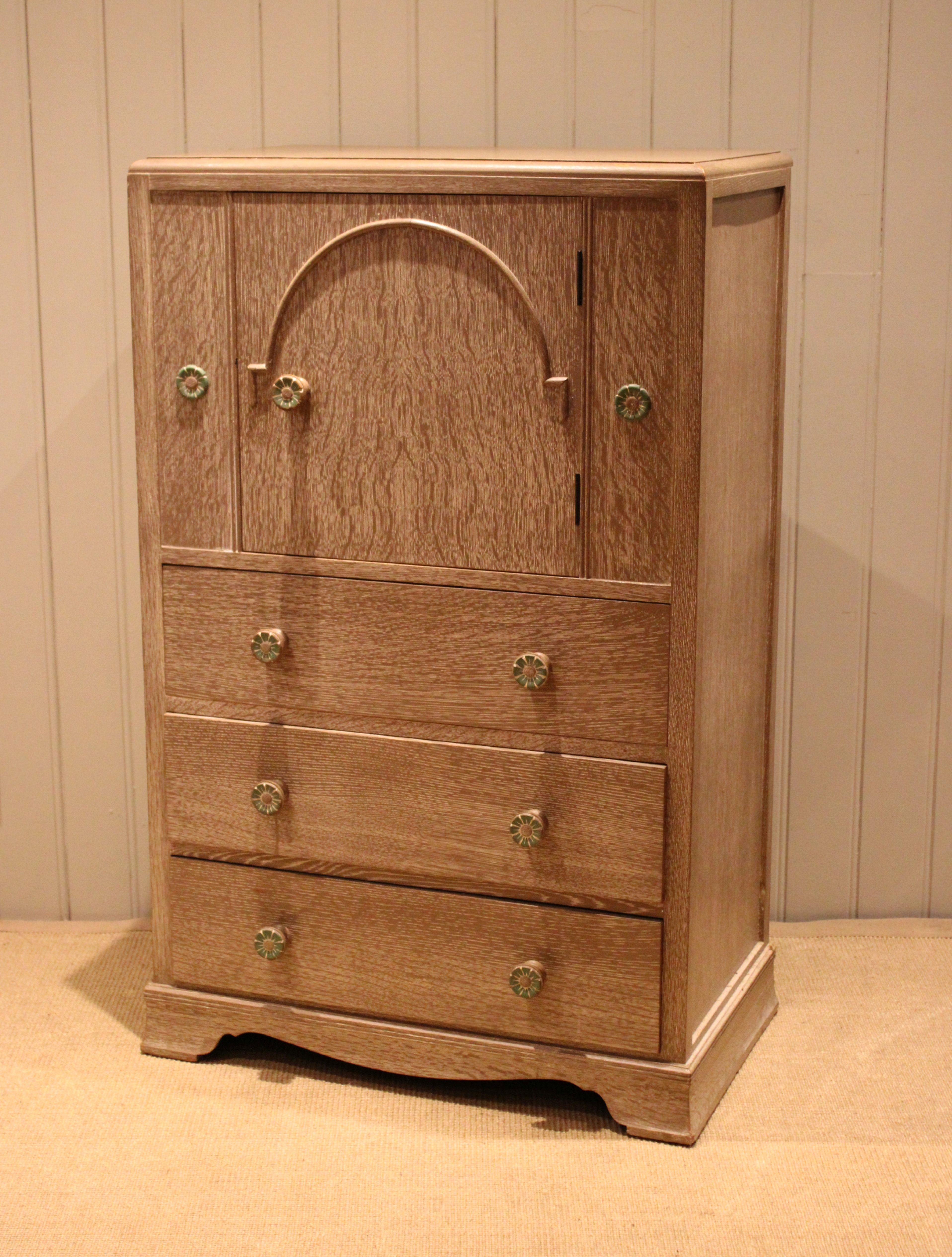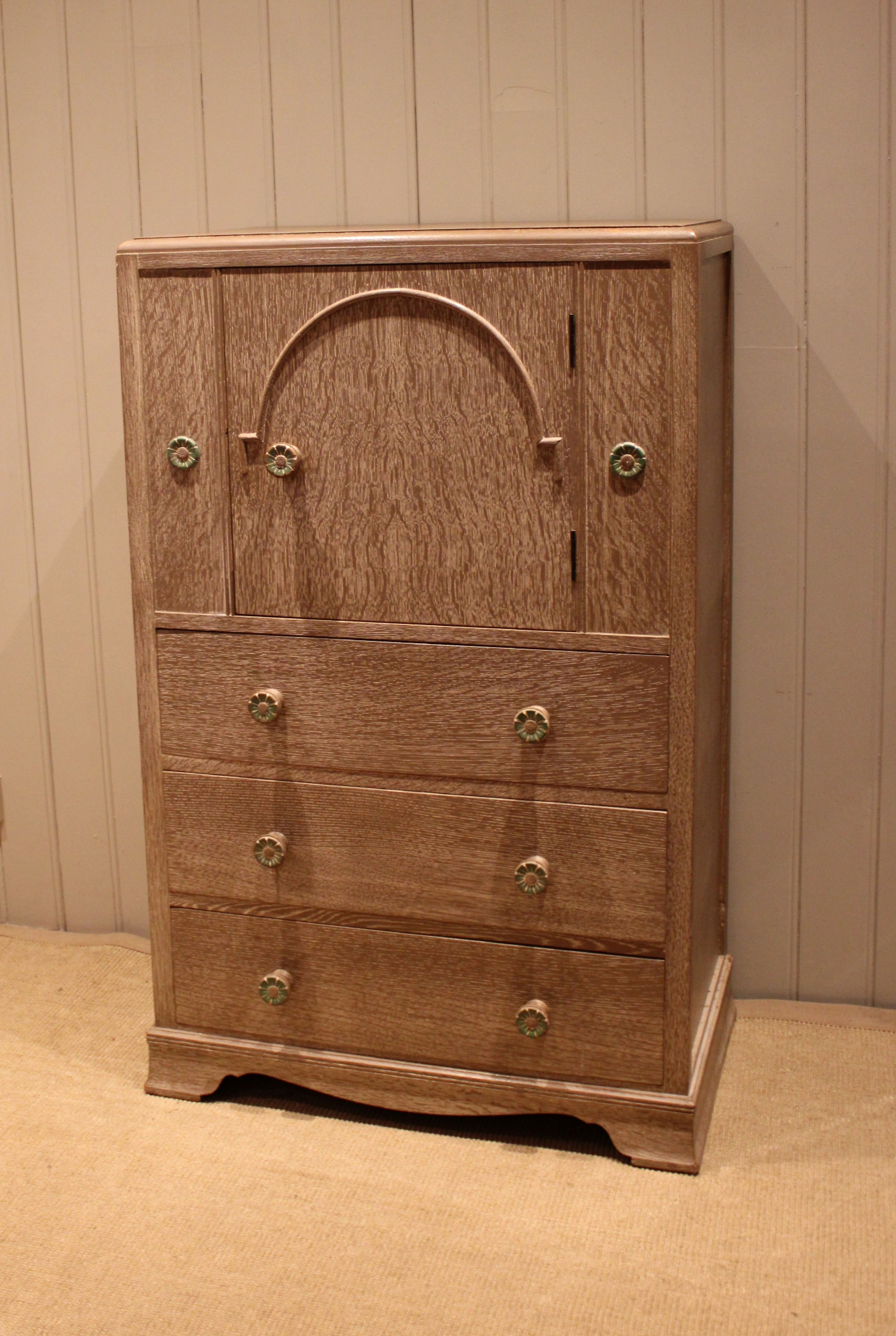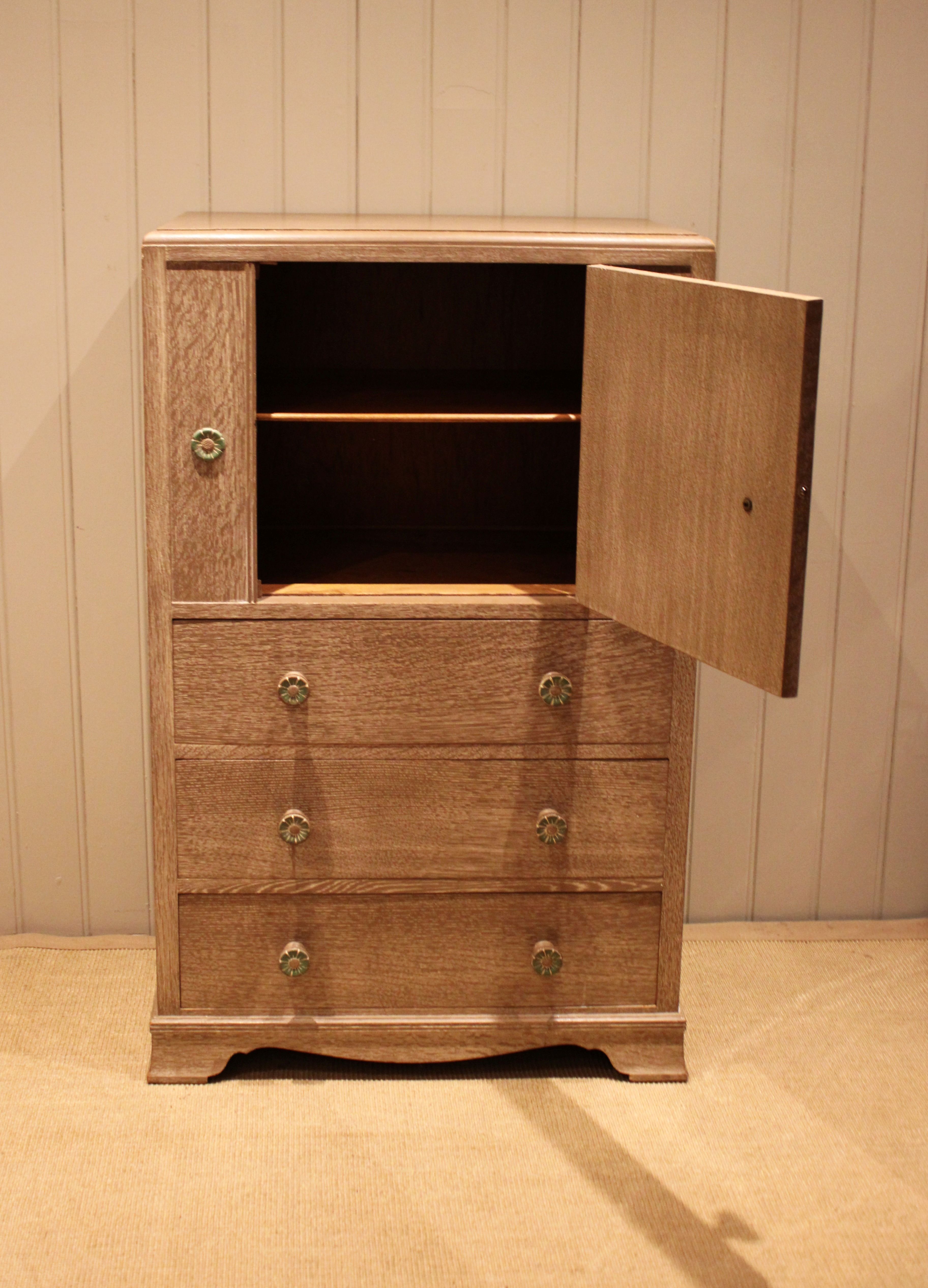 Lime washed grey oak chest having a shelved cupboard to the top , above three long drawers , raised on a plinth base. The drawers are 16 cm deep .