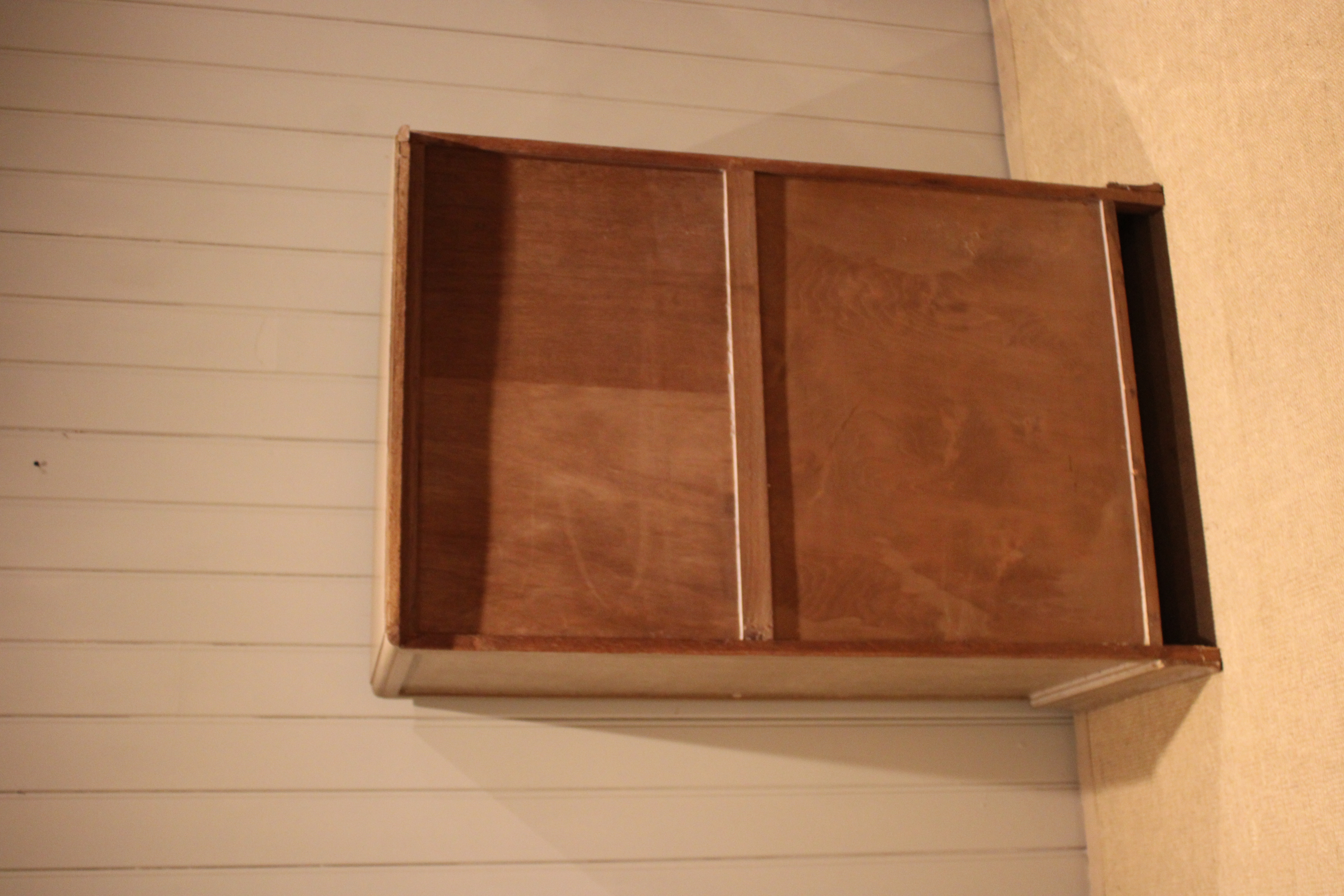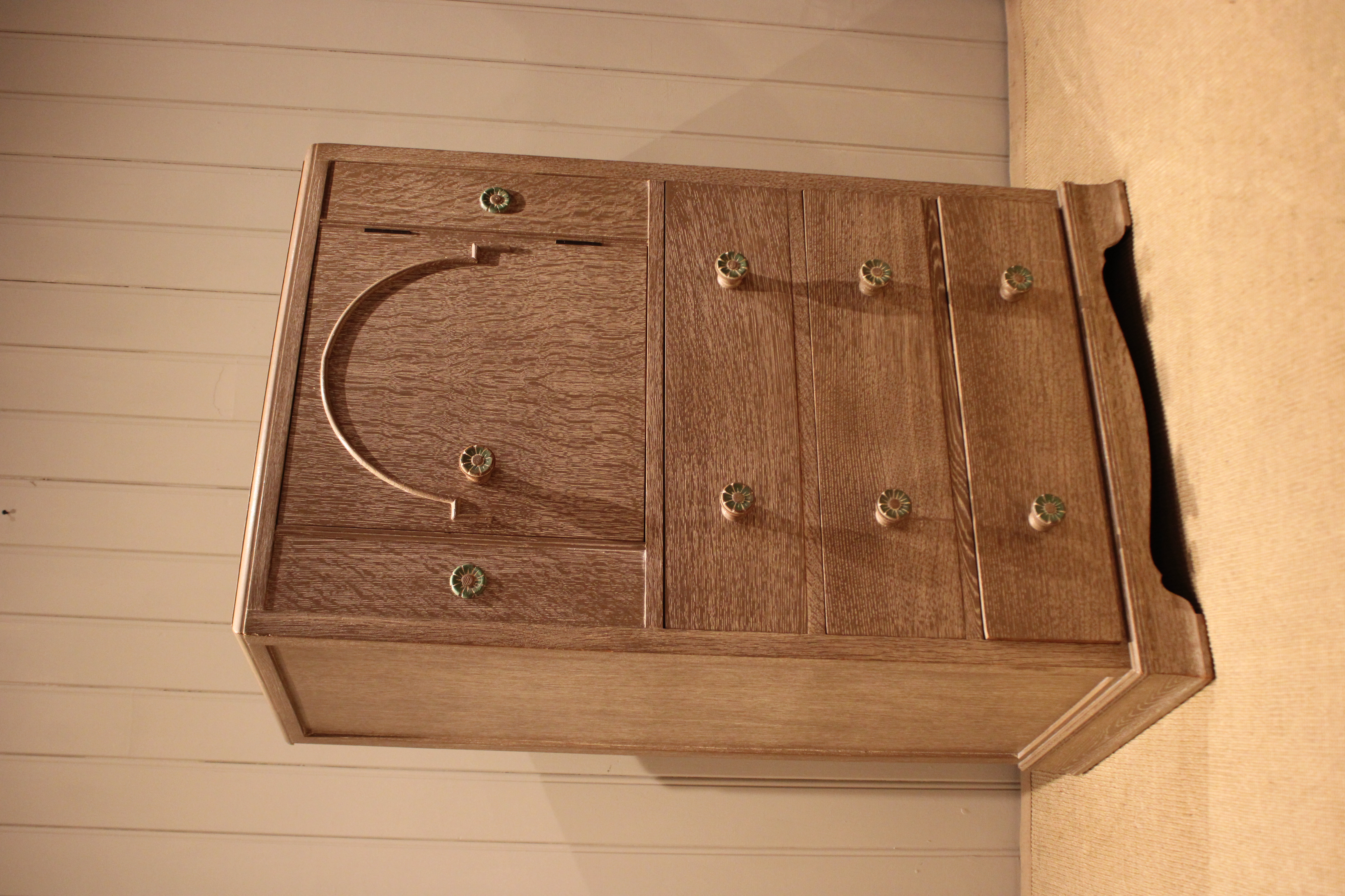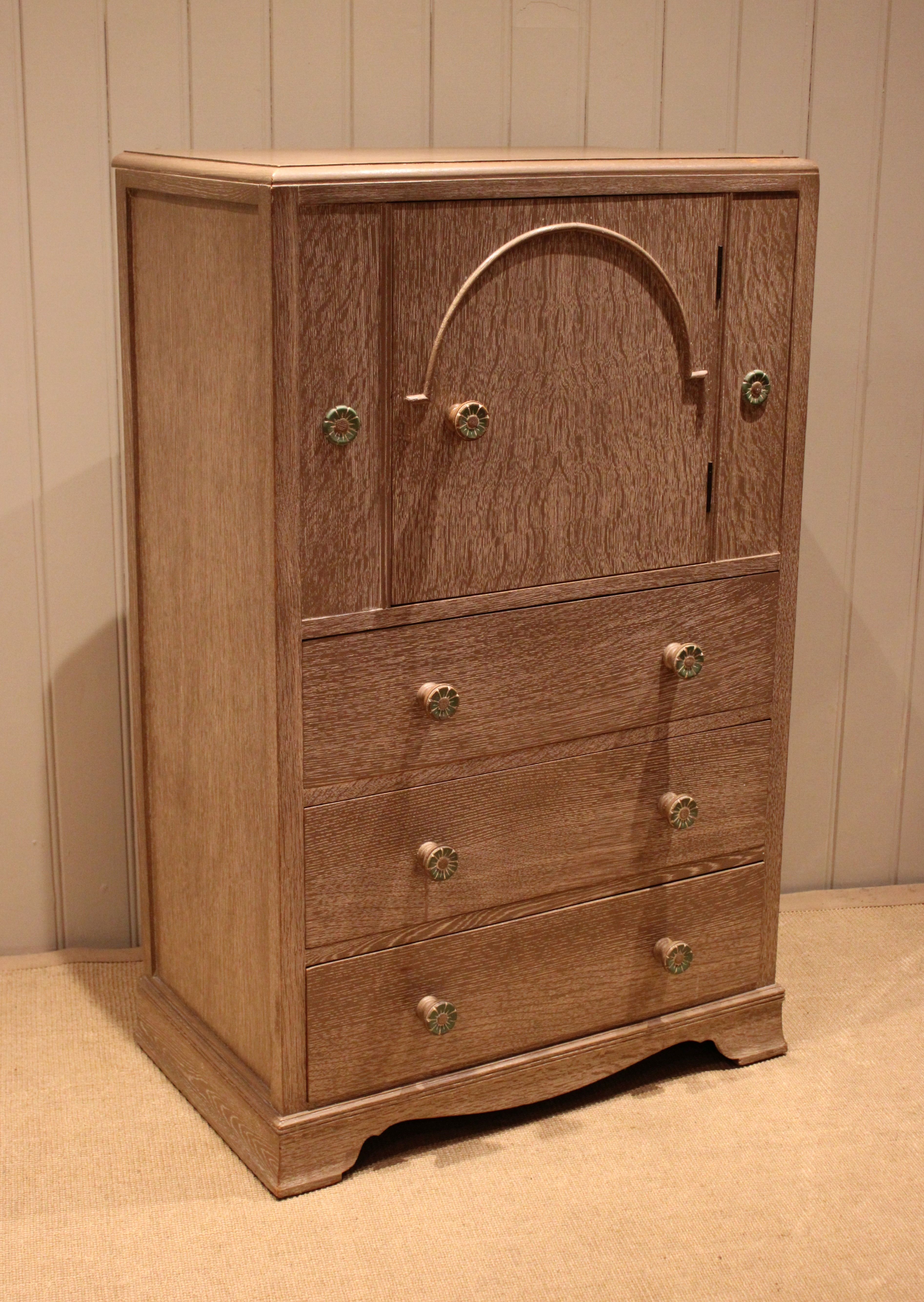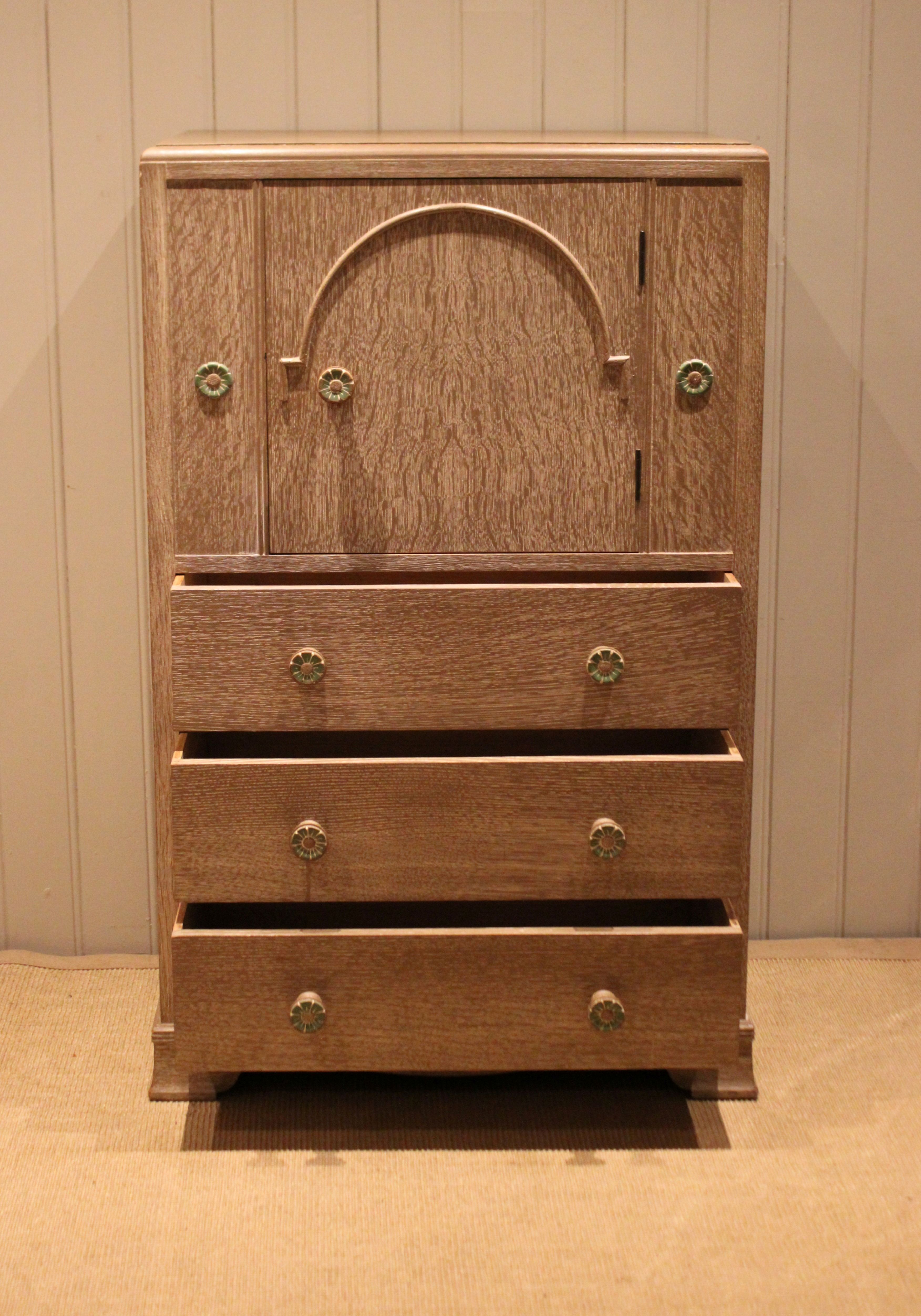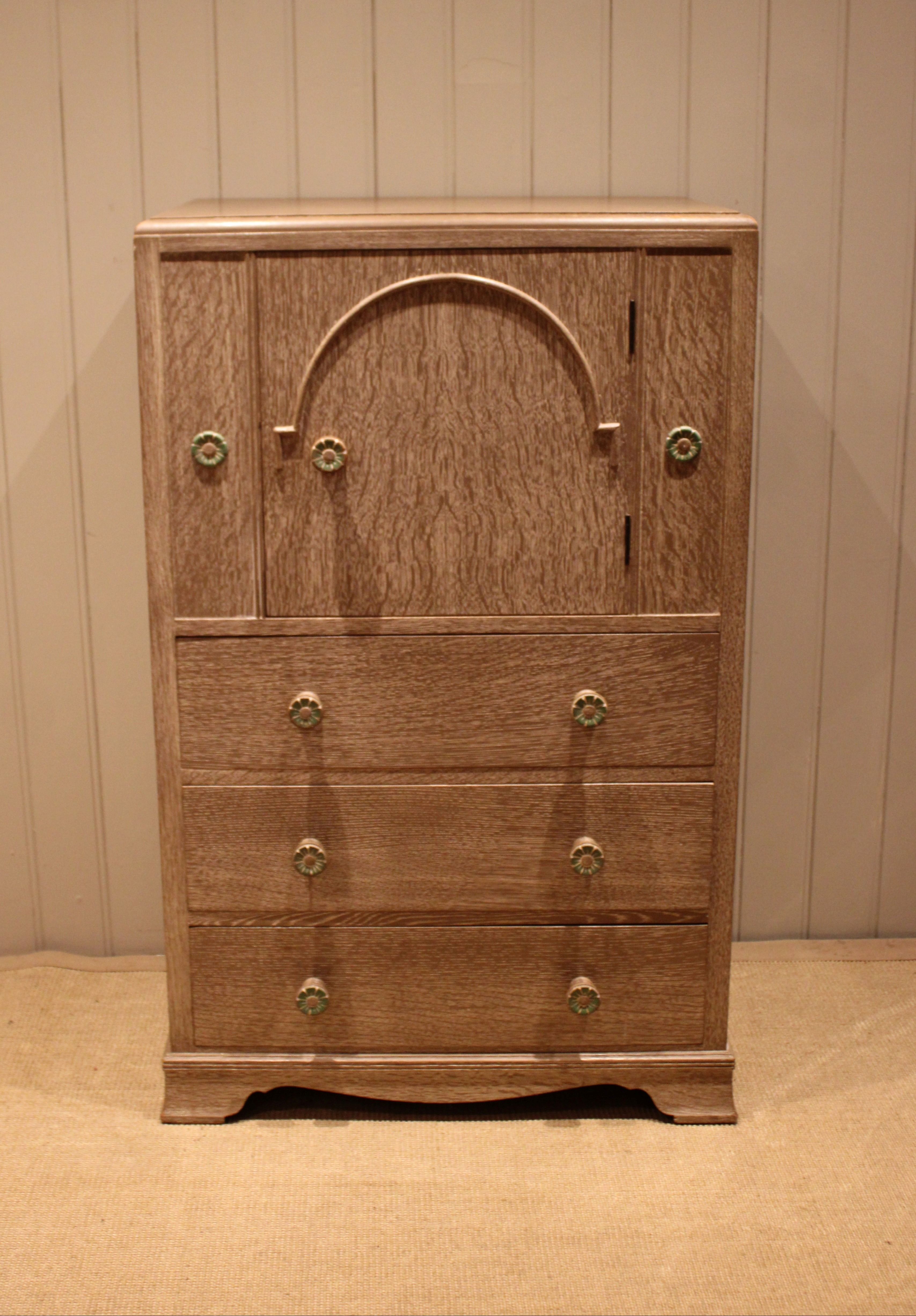 Lime washed grey oak chest having a shelved cupboard to the top , above three long drawers , raised on a plinth base. The drawers are 16 cm deep .