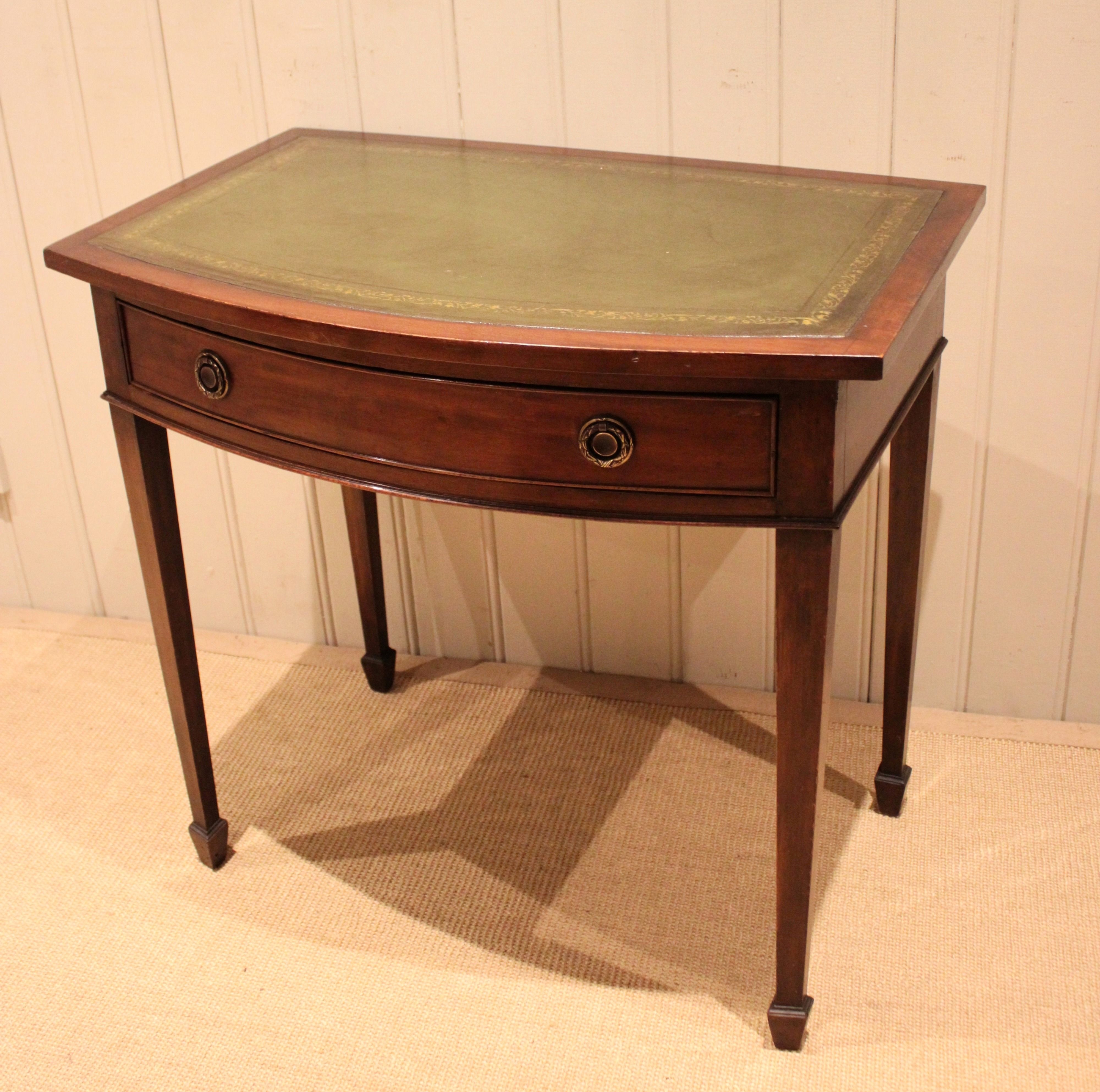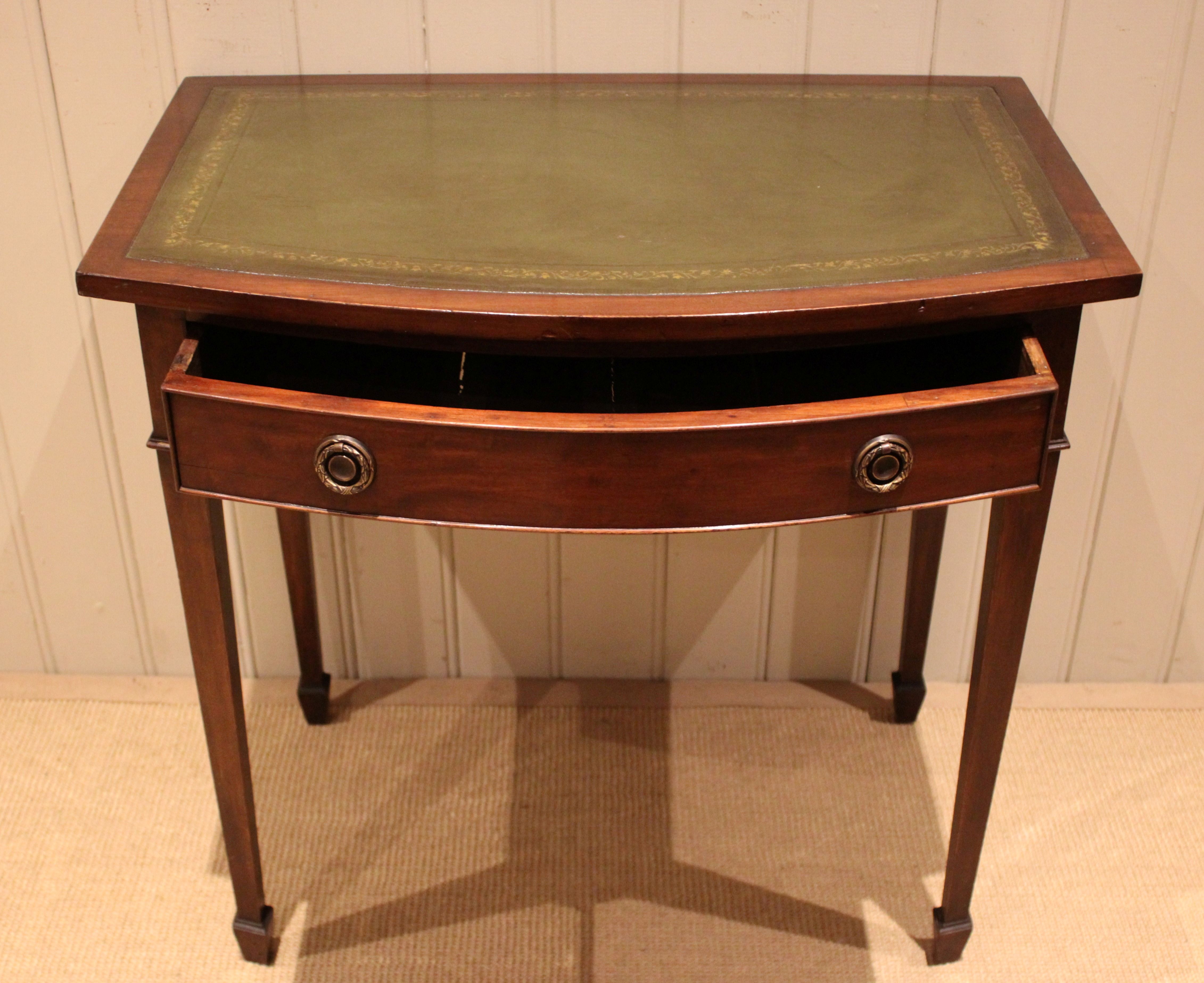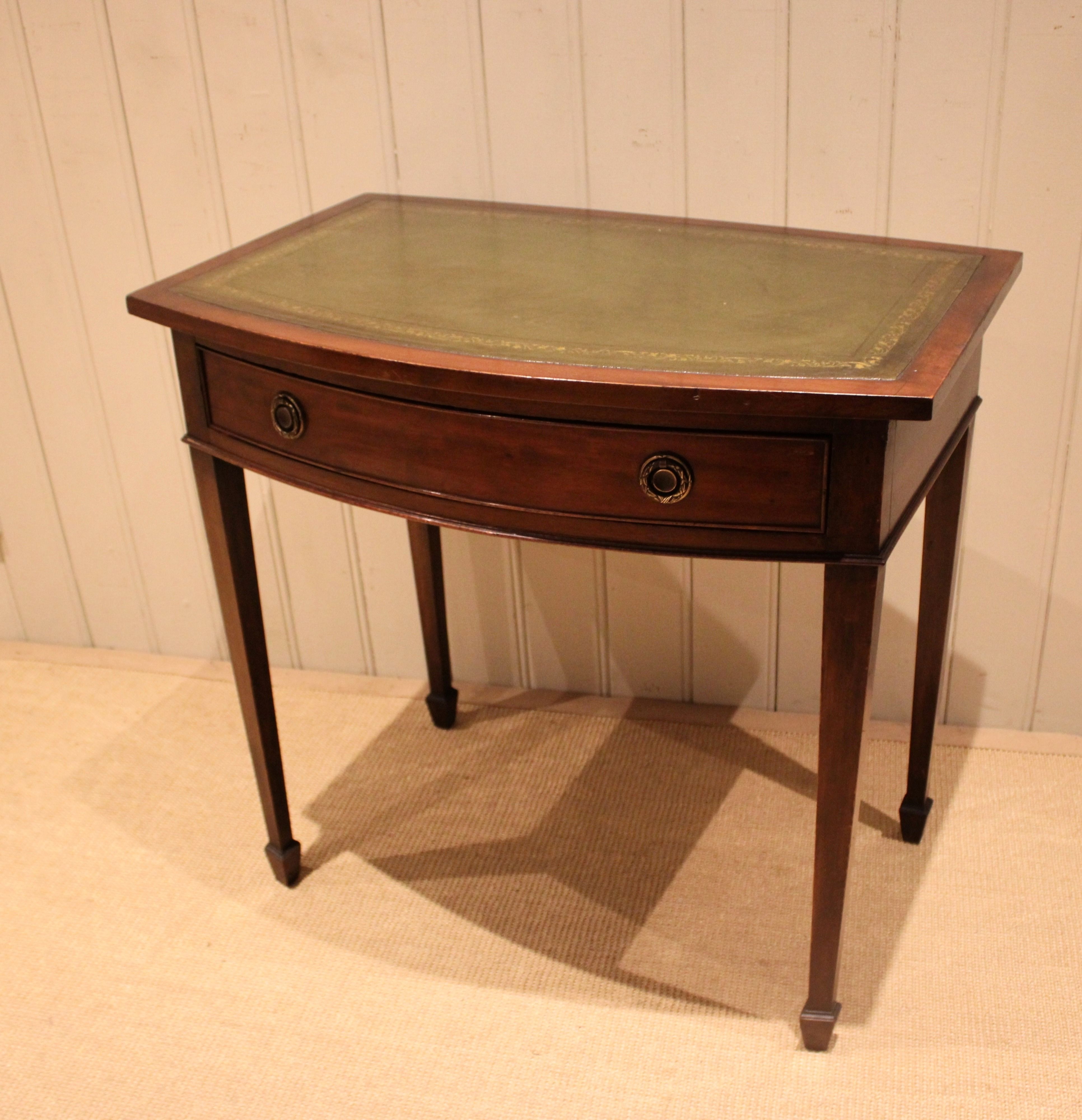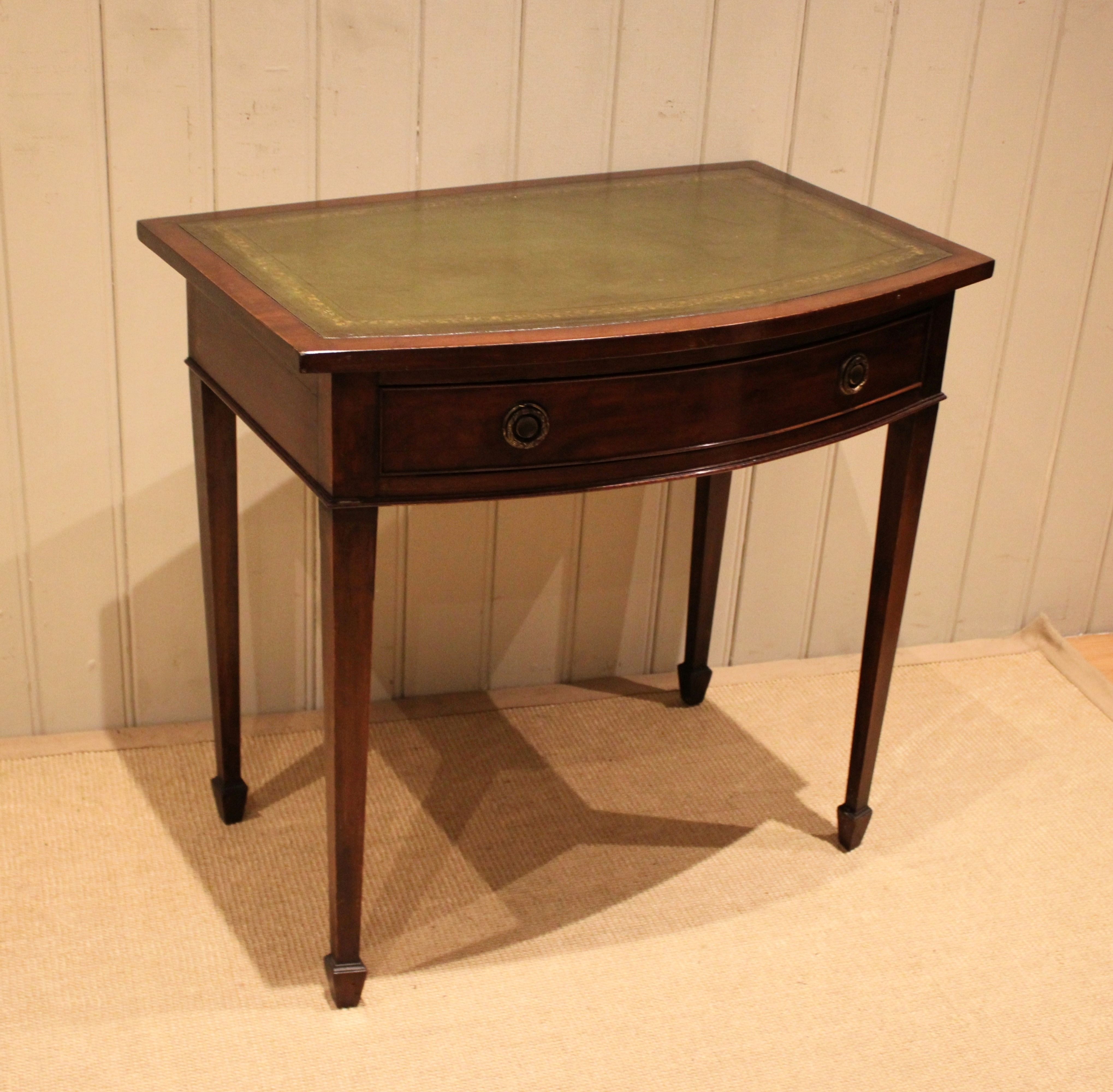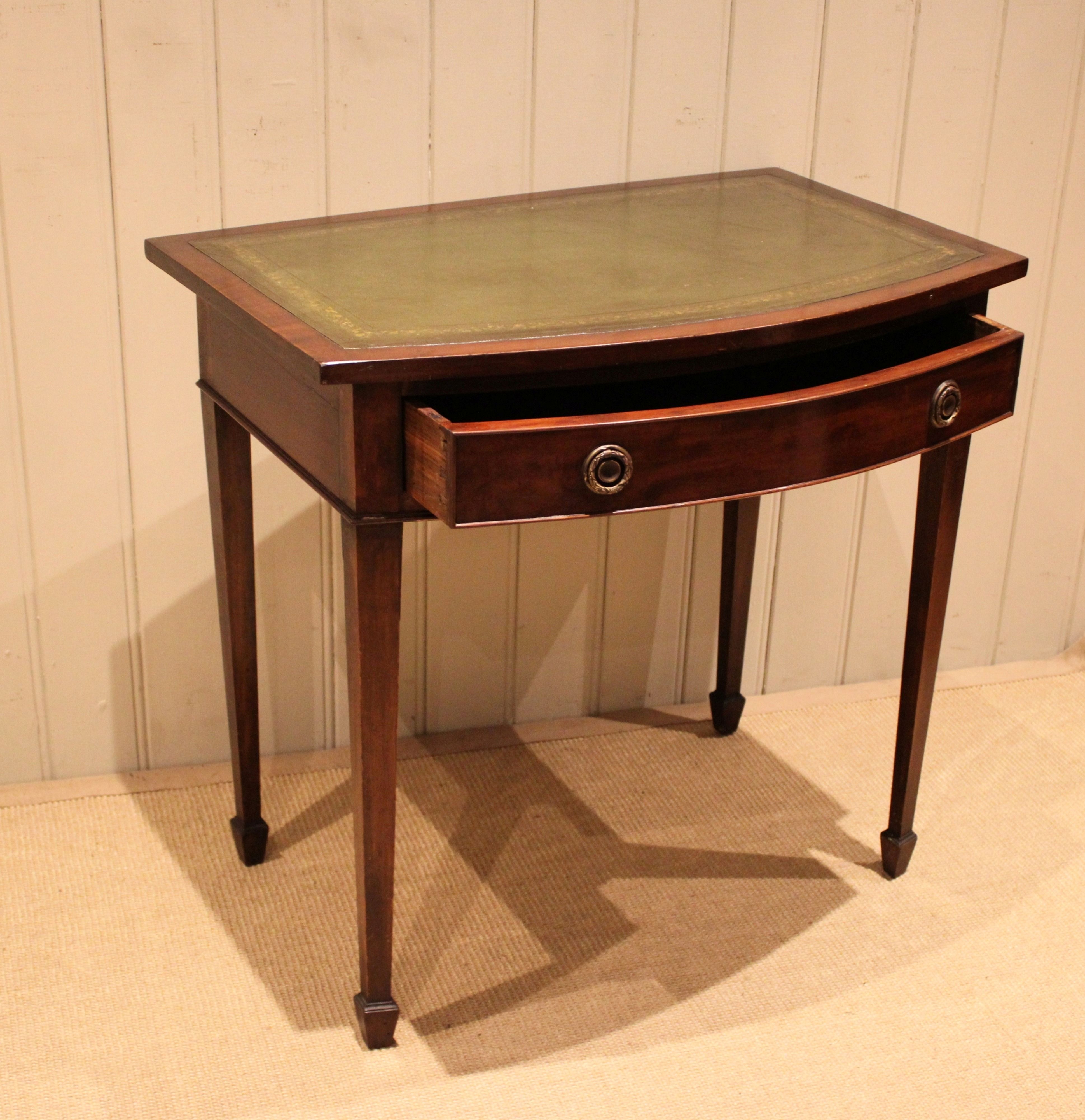 Low bow front mahogany writing table having a green tooled leather top with a single drawer , raised on straight tapering supports with spade feet. The height to the undertier is 56 cm .