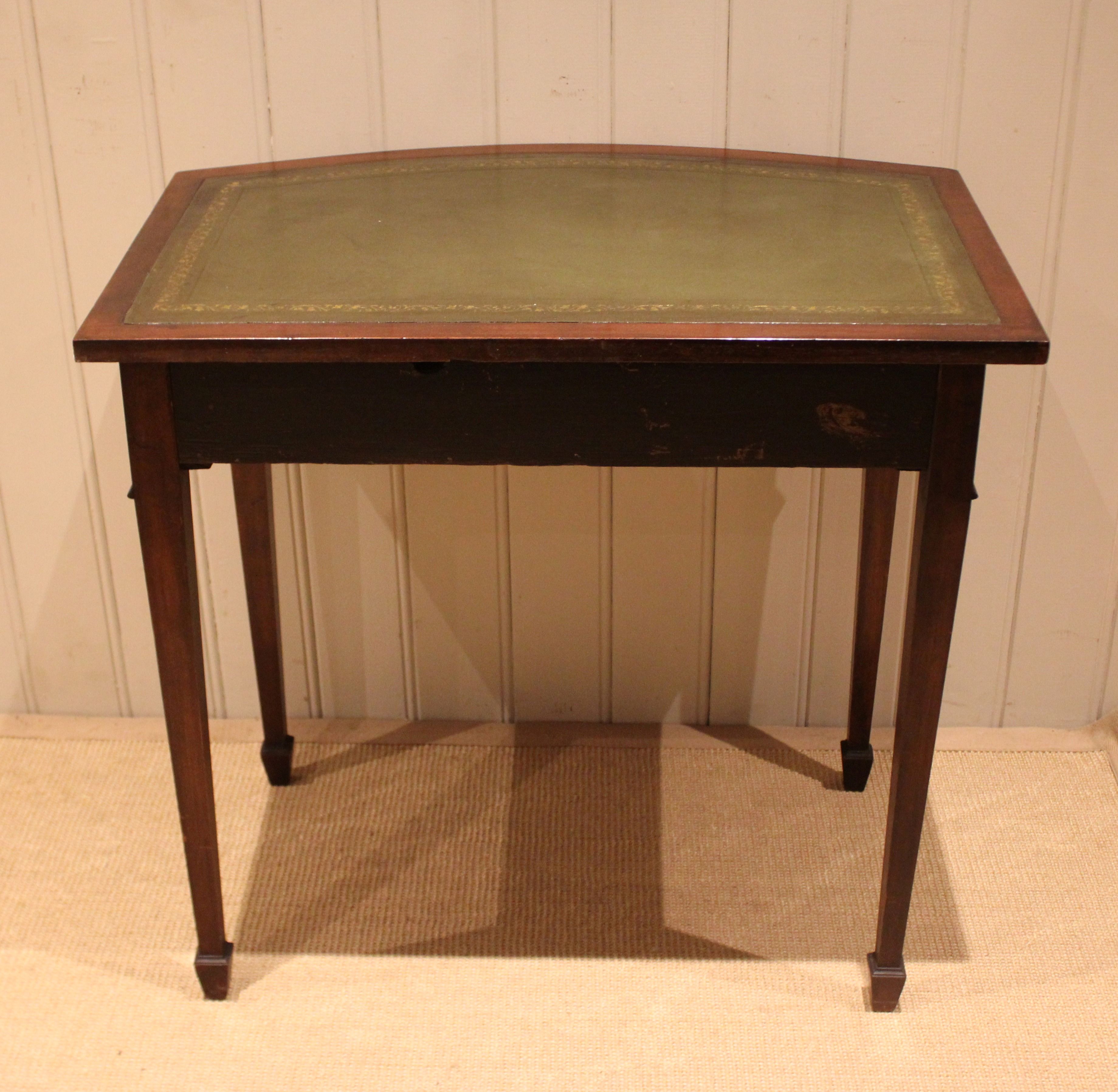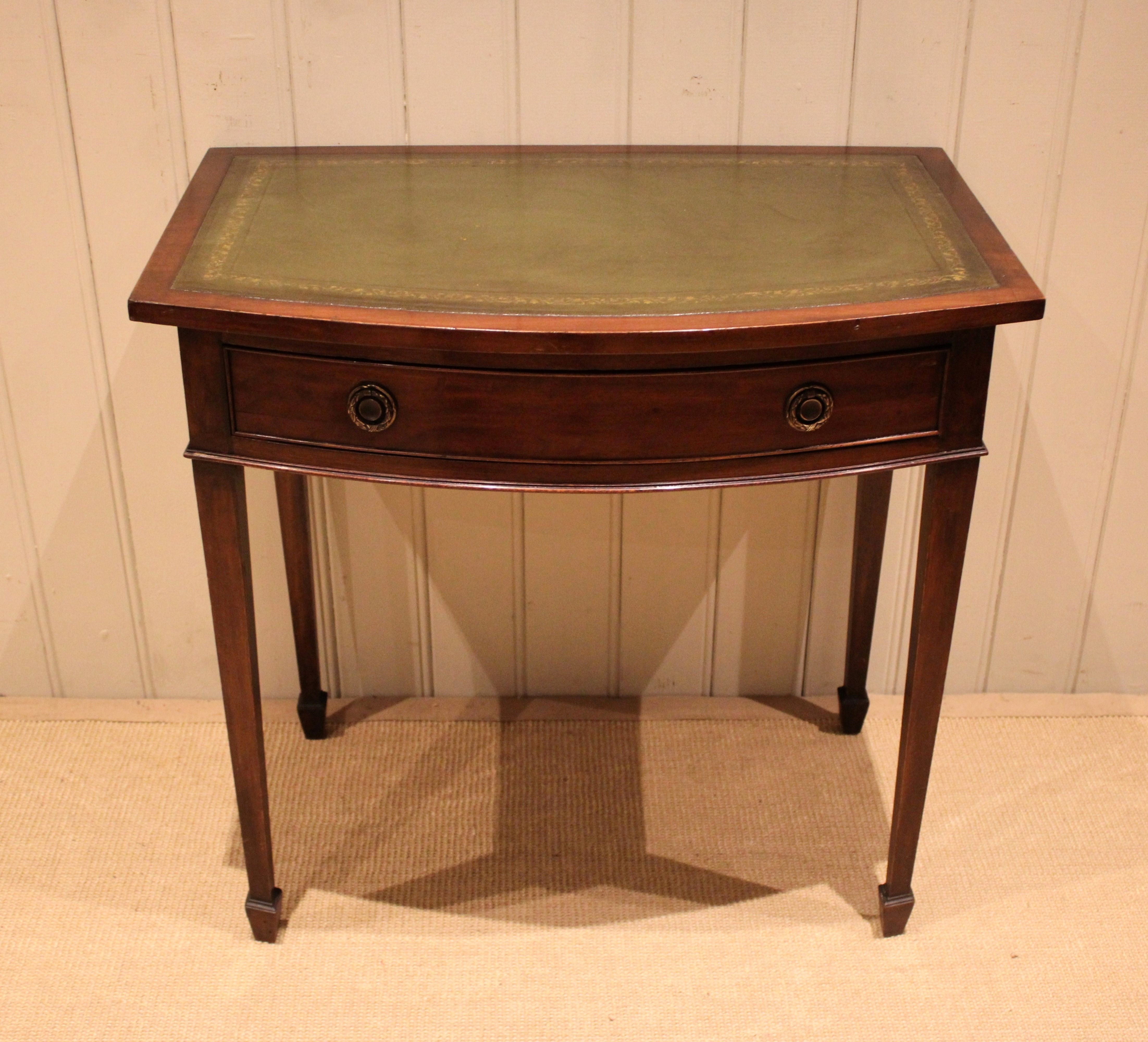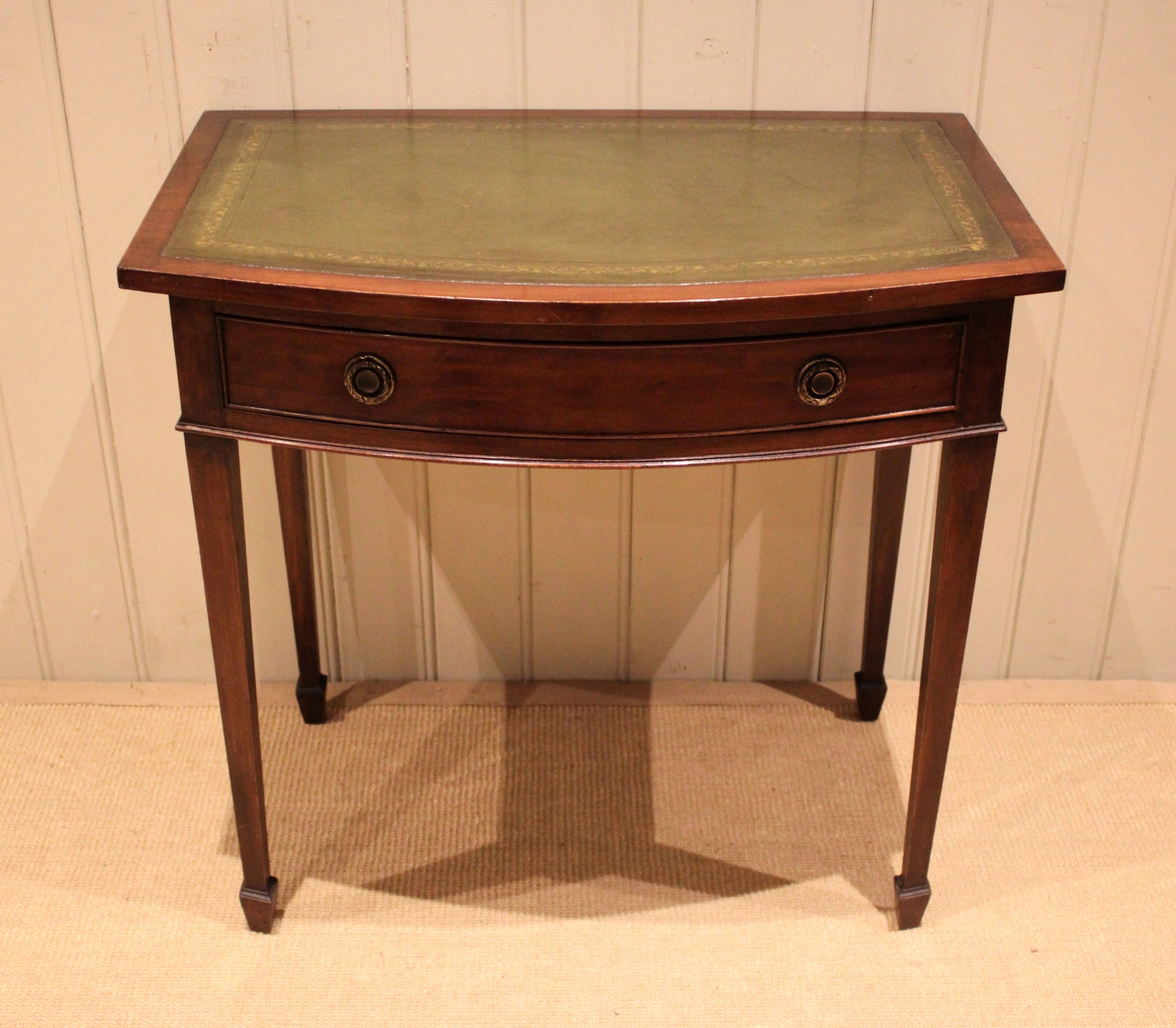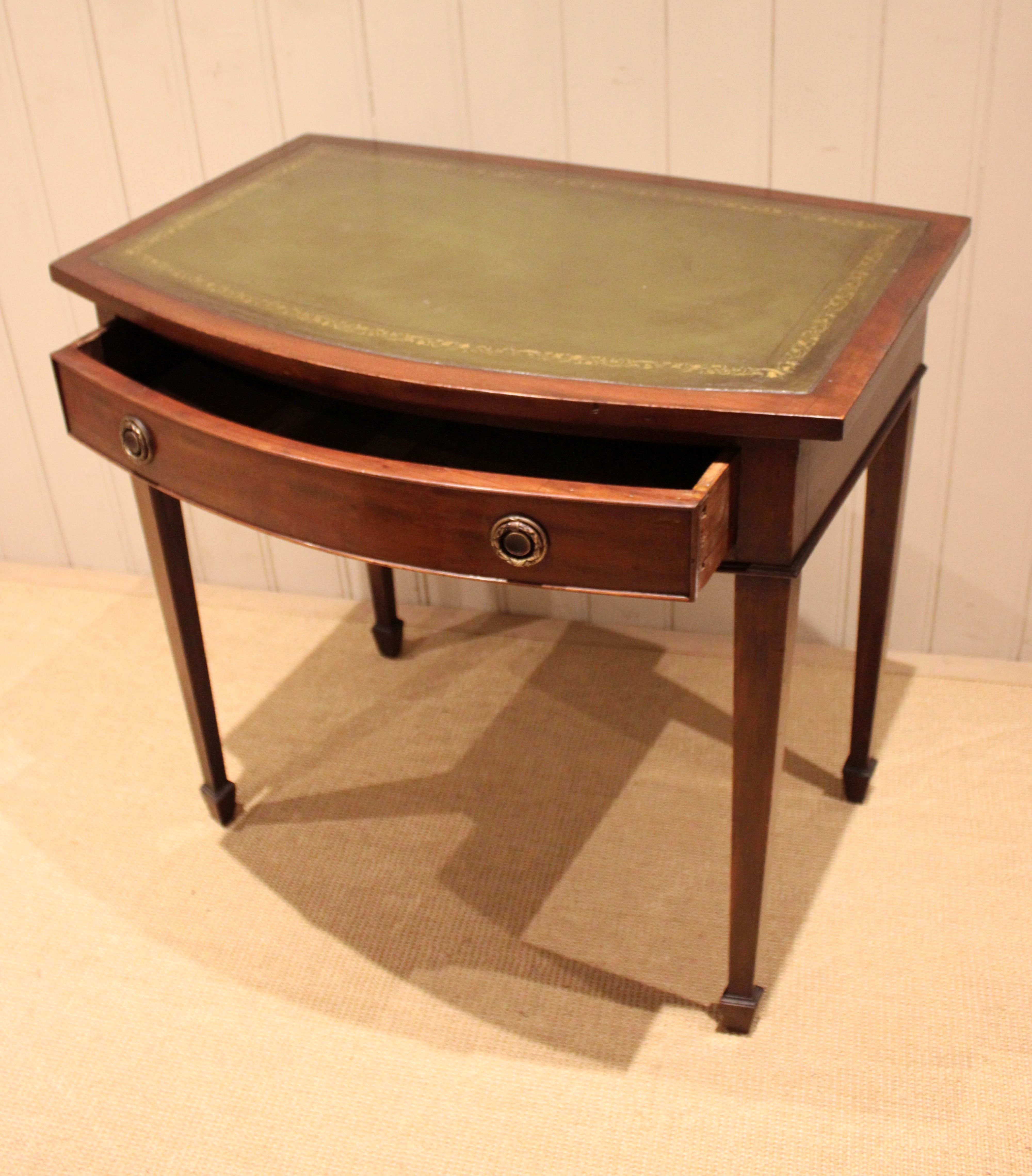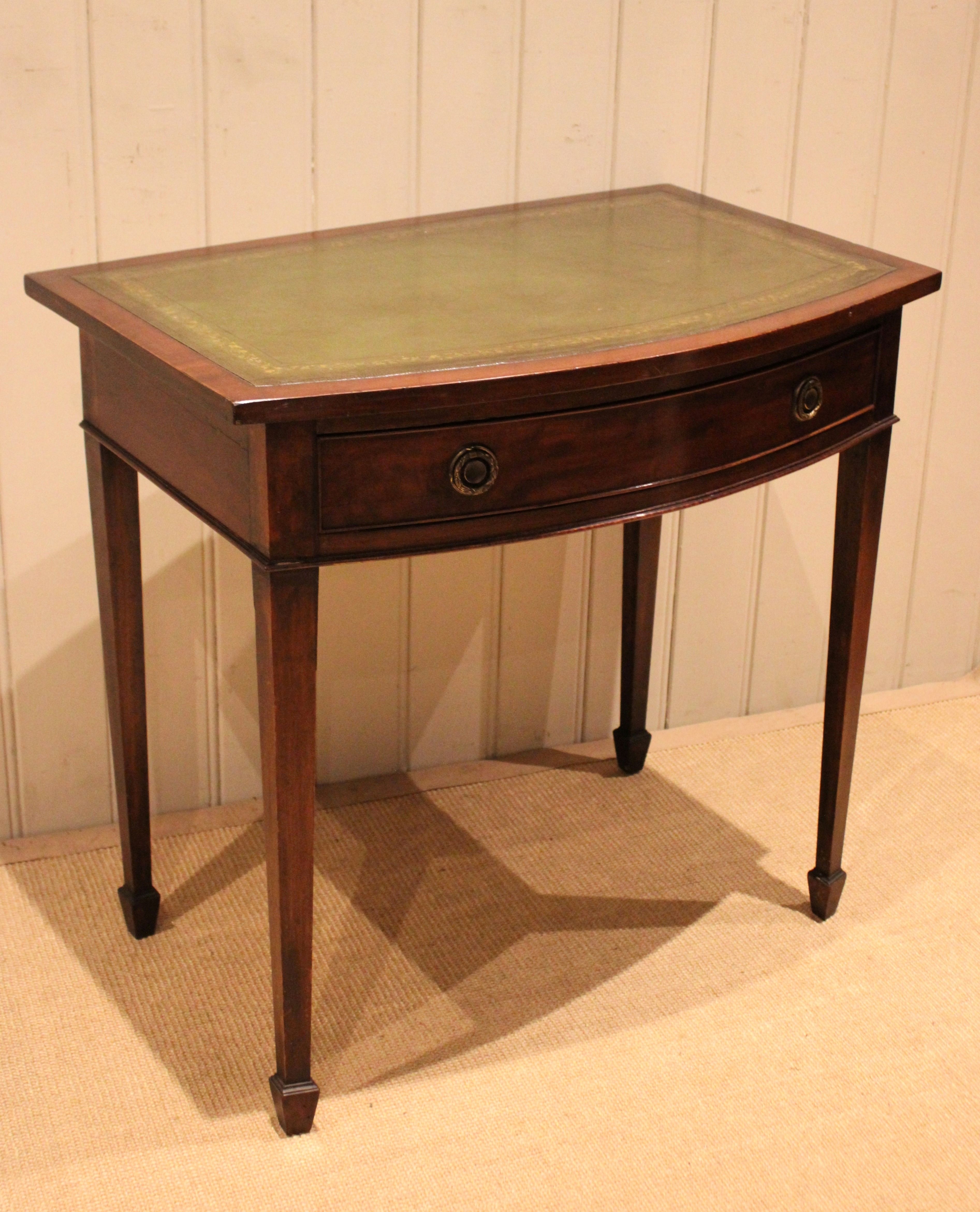 Low bow front mahogany writing table having a green tooled leather top with a single drawer , raised on straight tapering supports with spade feet. The height to the undertier is 56 cm .