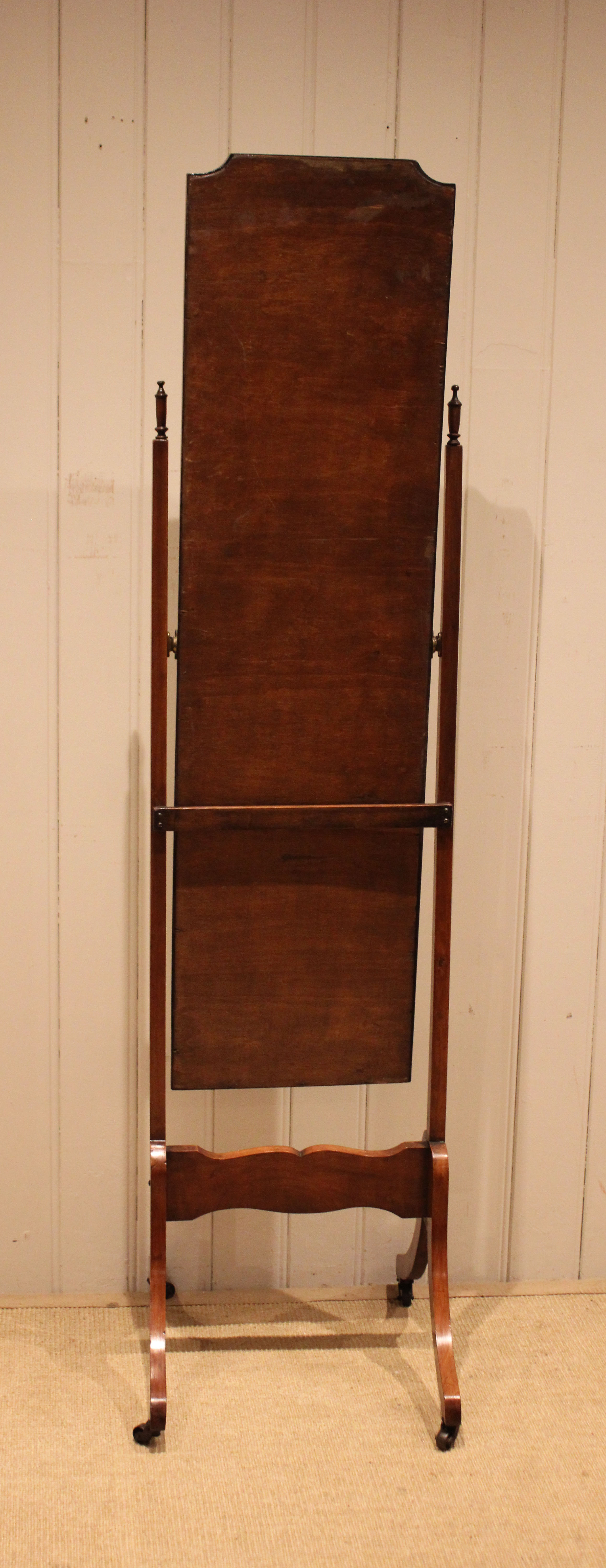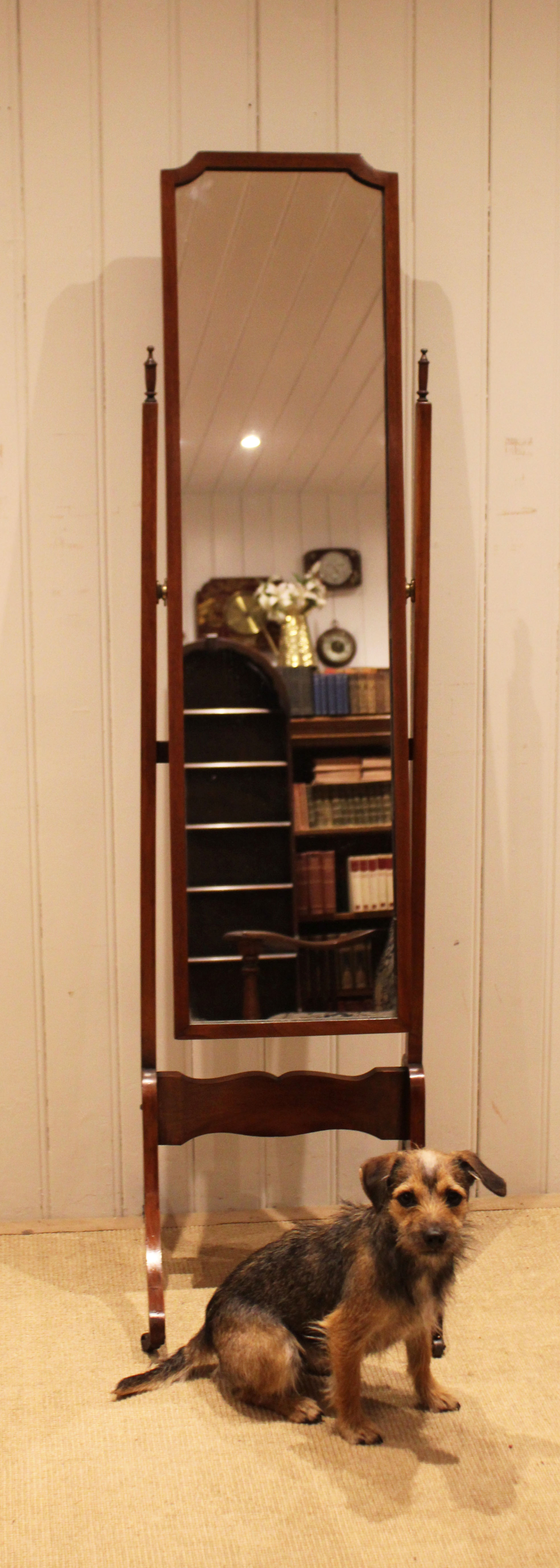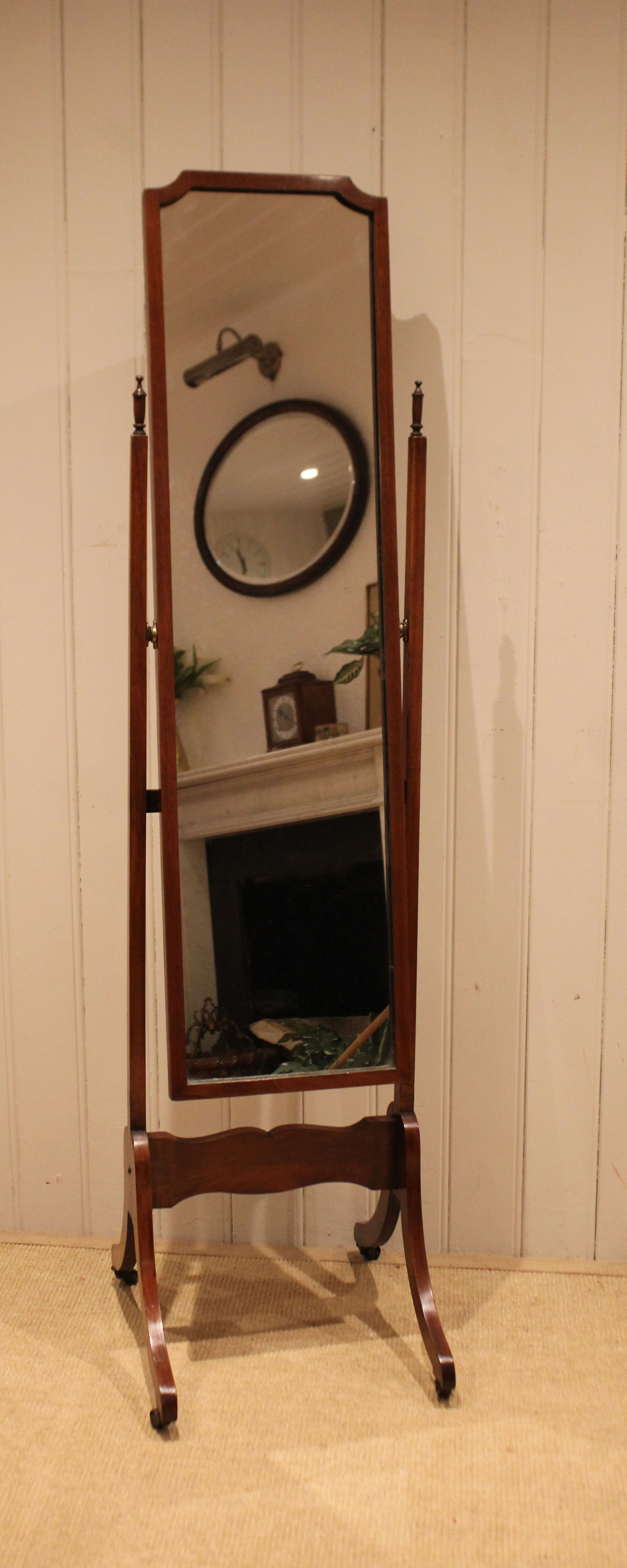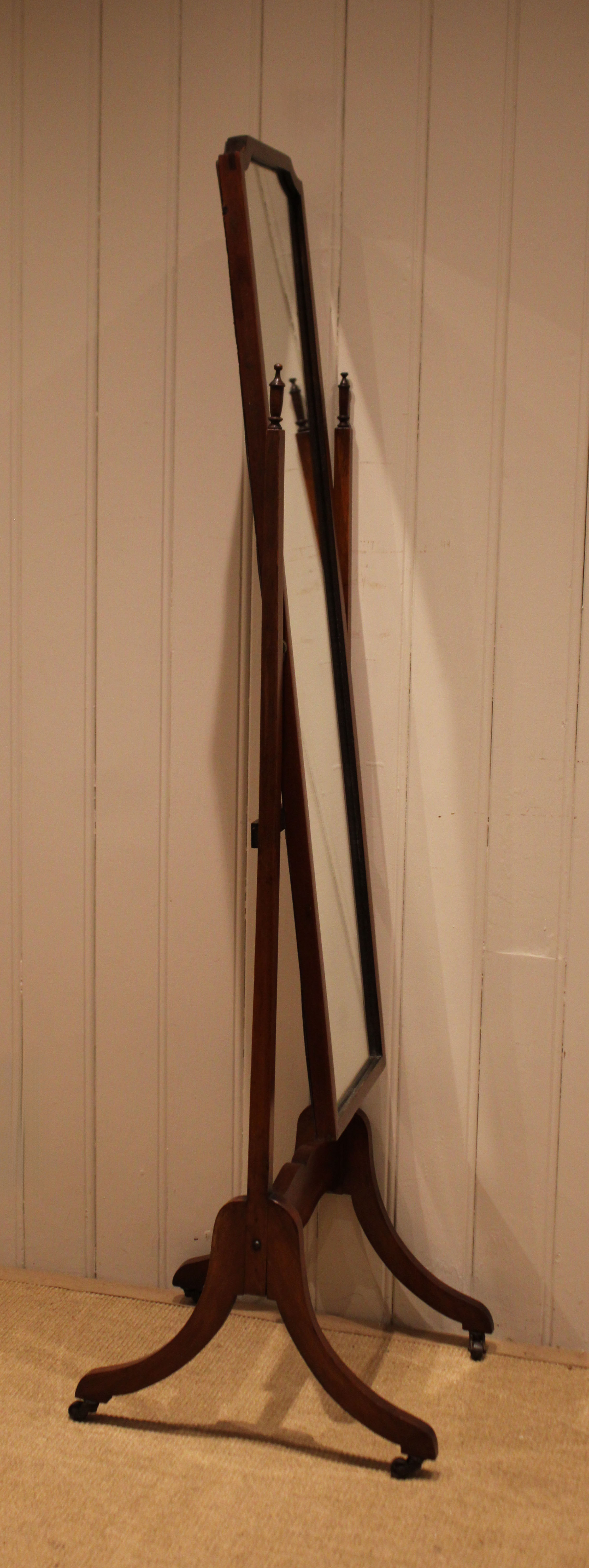 Mahogany cheval mirror having a shaped top , with turned finials , raised on out splayed legs terminating in castors .