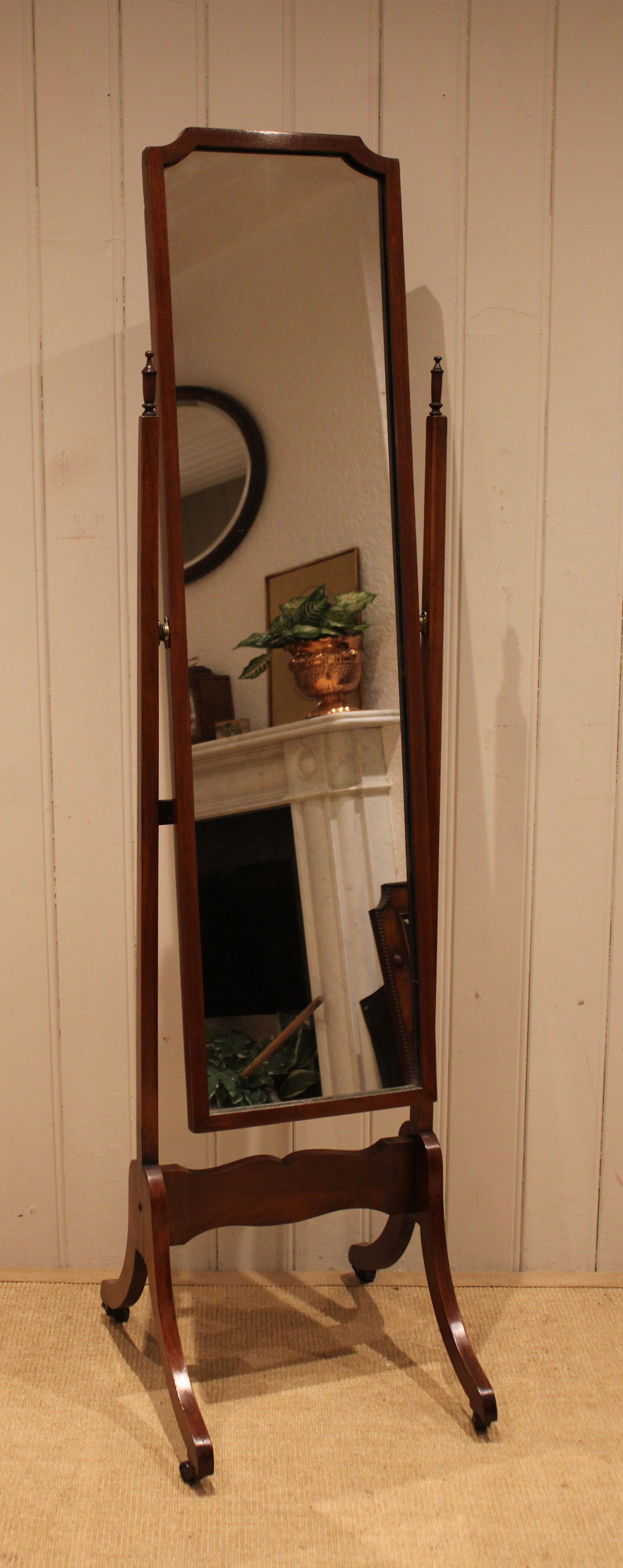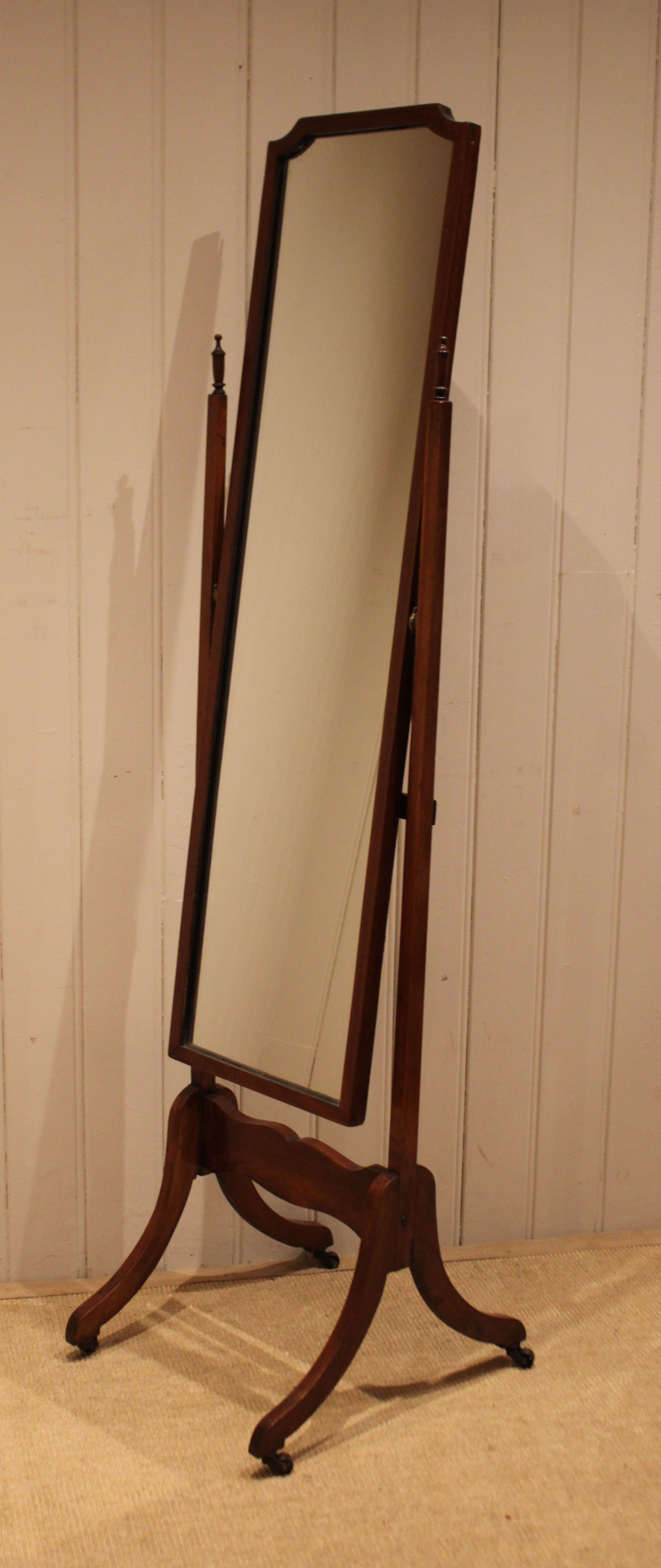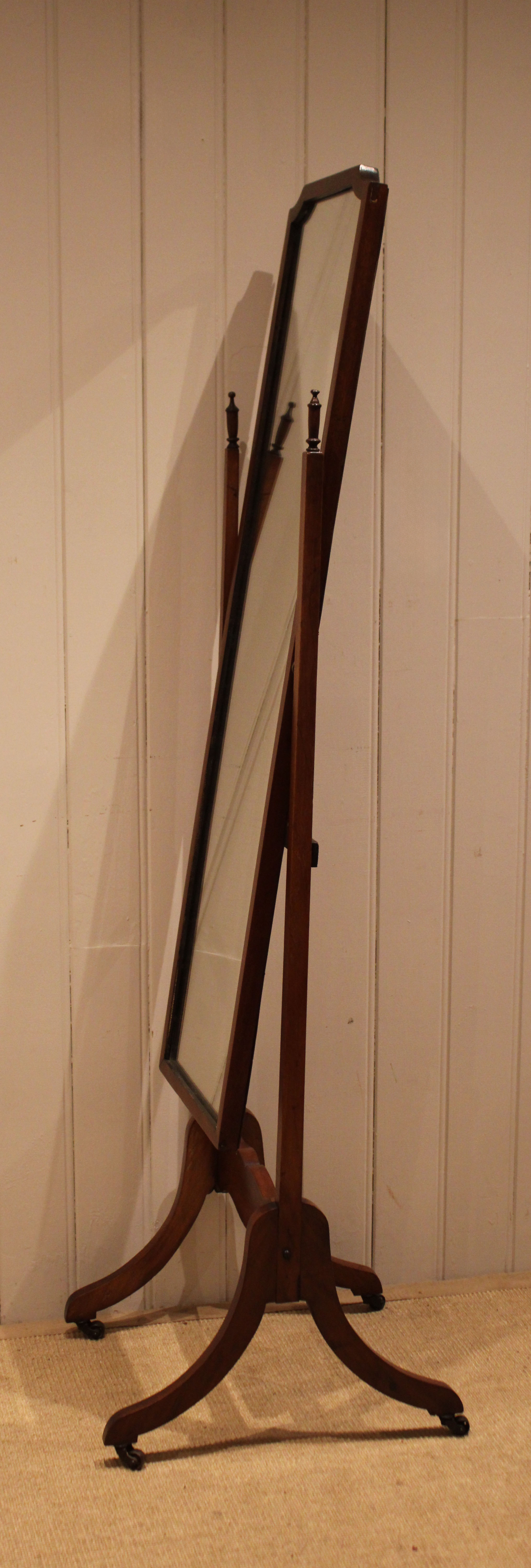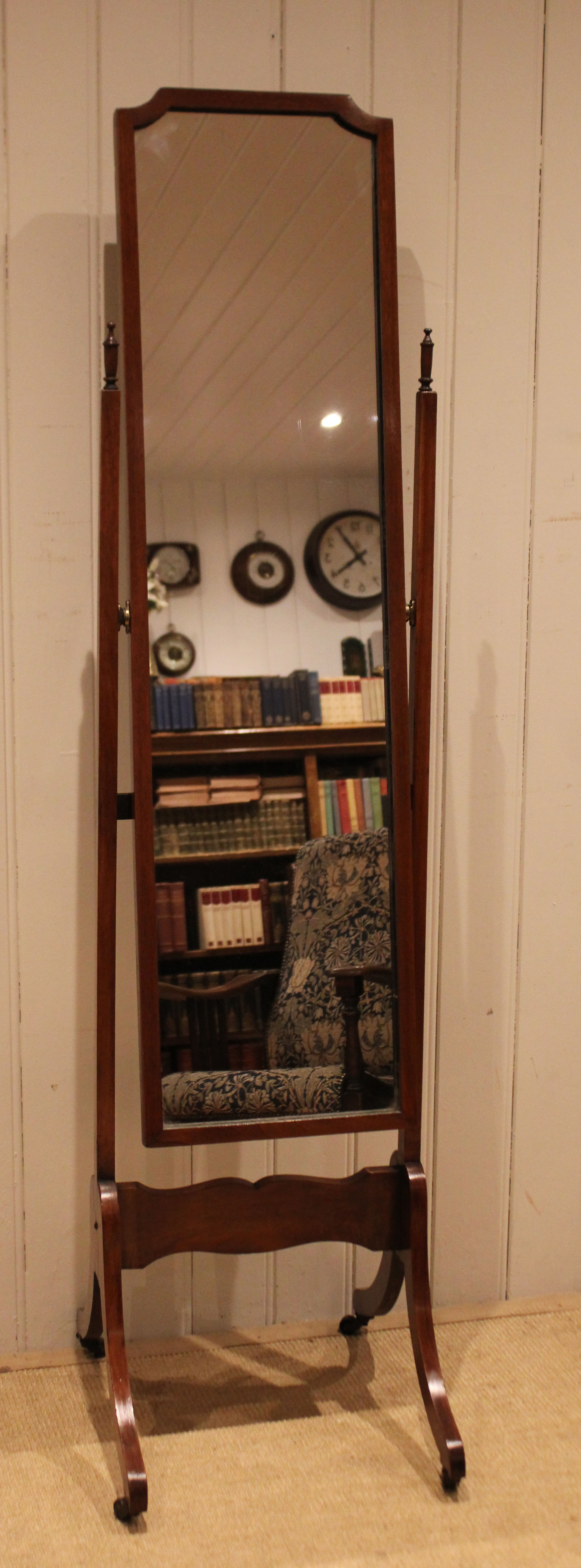 Mahogany cheval mirror having a shaped top , with turned finials , raised on out splayed legs terminating in castors .