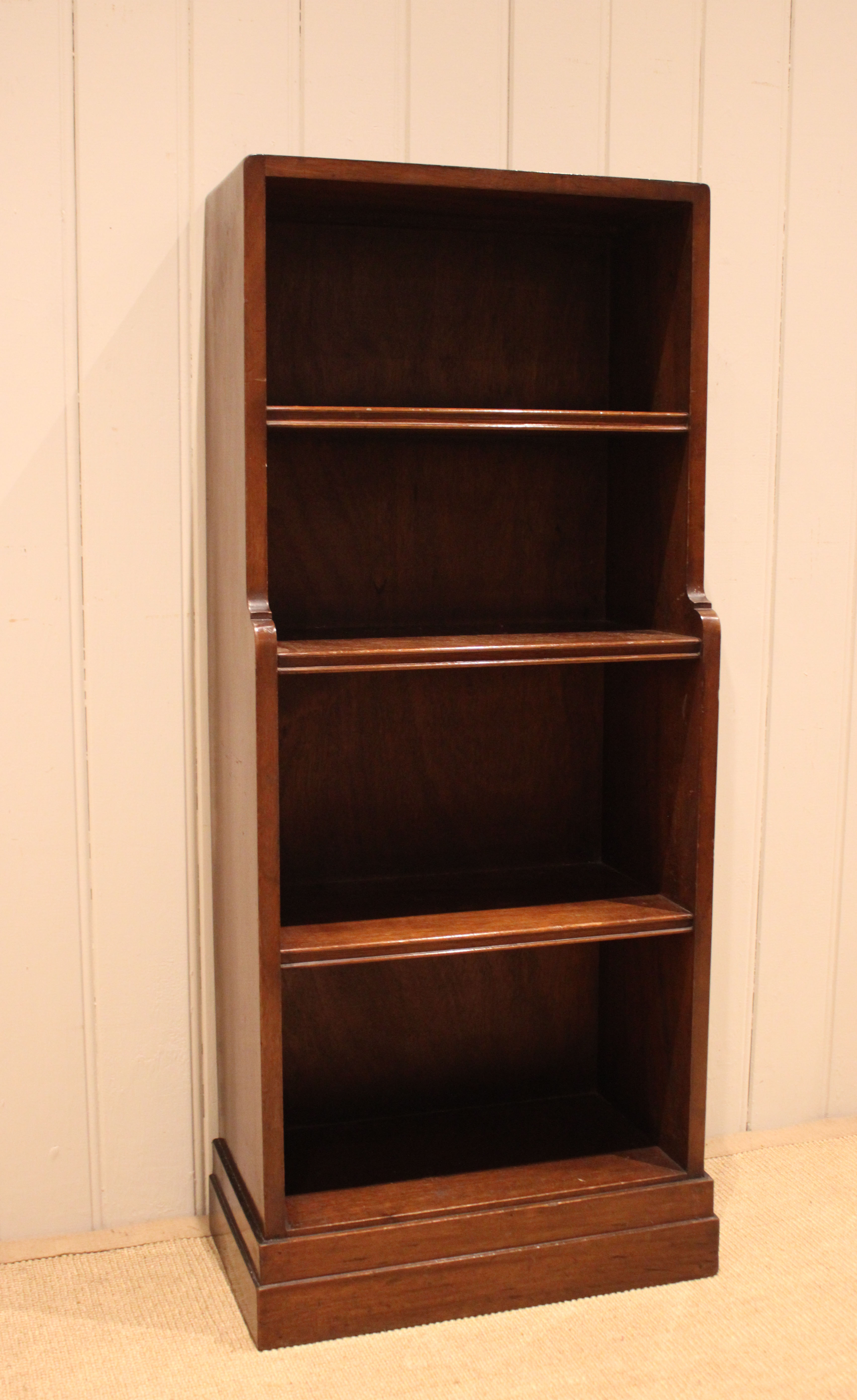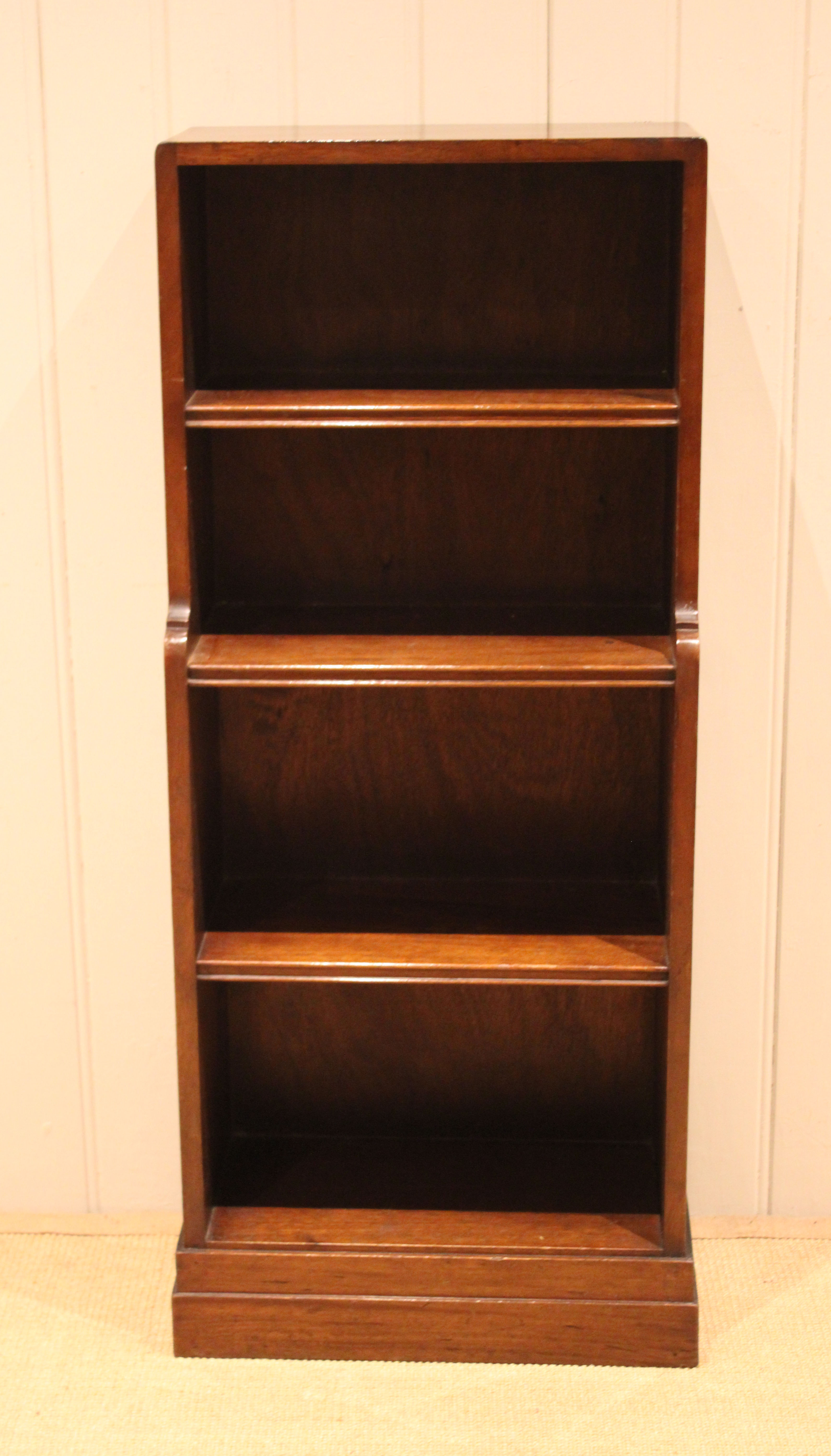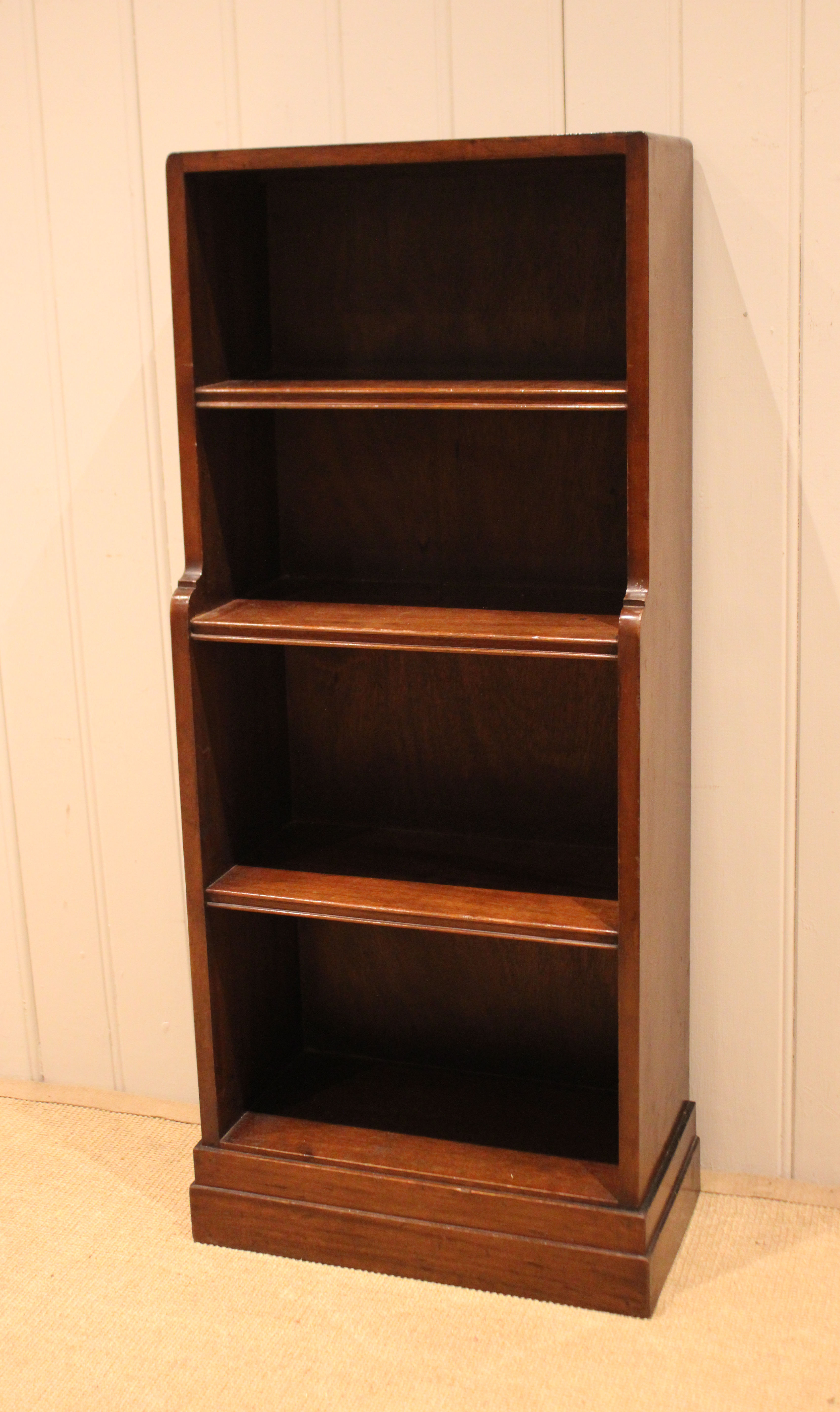 Mahogany open bookcase having three fixed graduated shelves , raised on a plinth base . The shelf dimensions are 41.5 cm wide x 22.5 cm deep and from the bottom up 25 cm high , 25 cm high , 20 cm high and at the top 20 cm high .