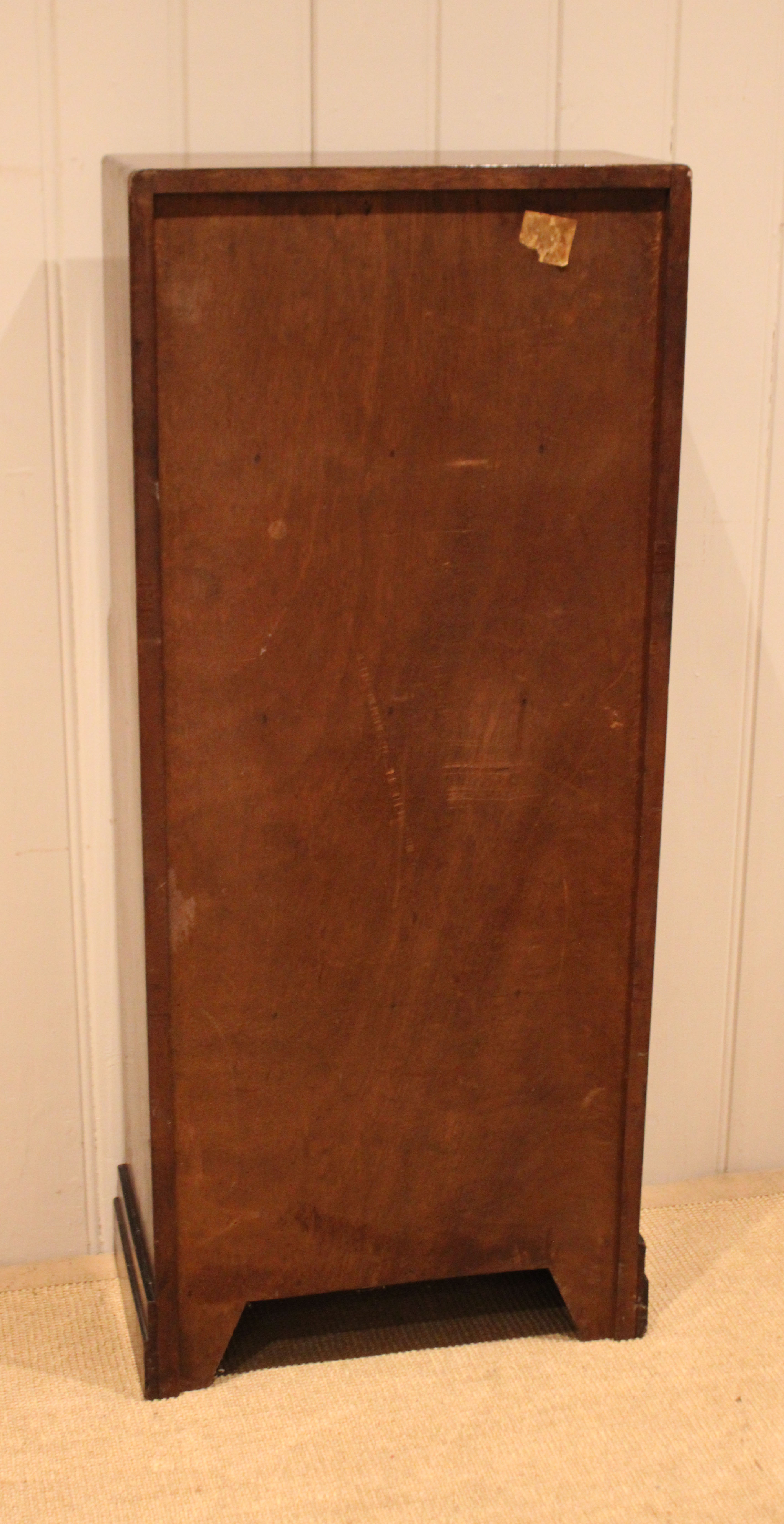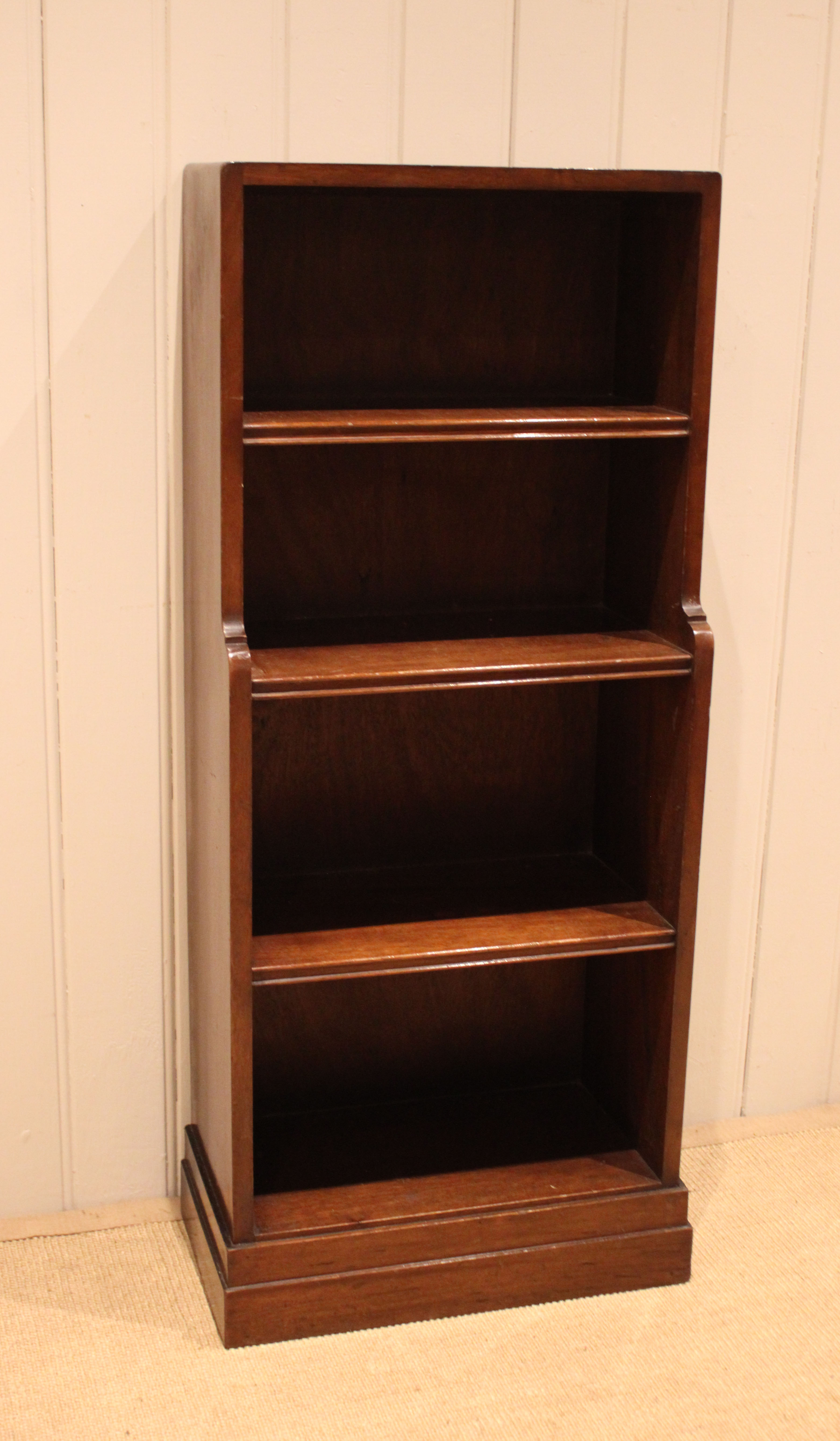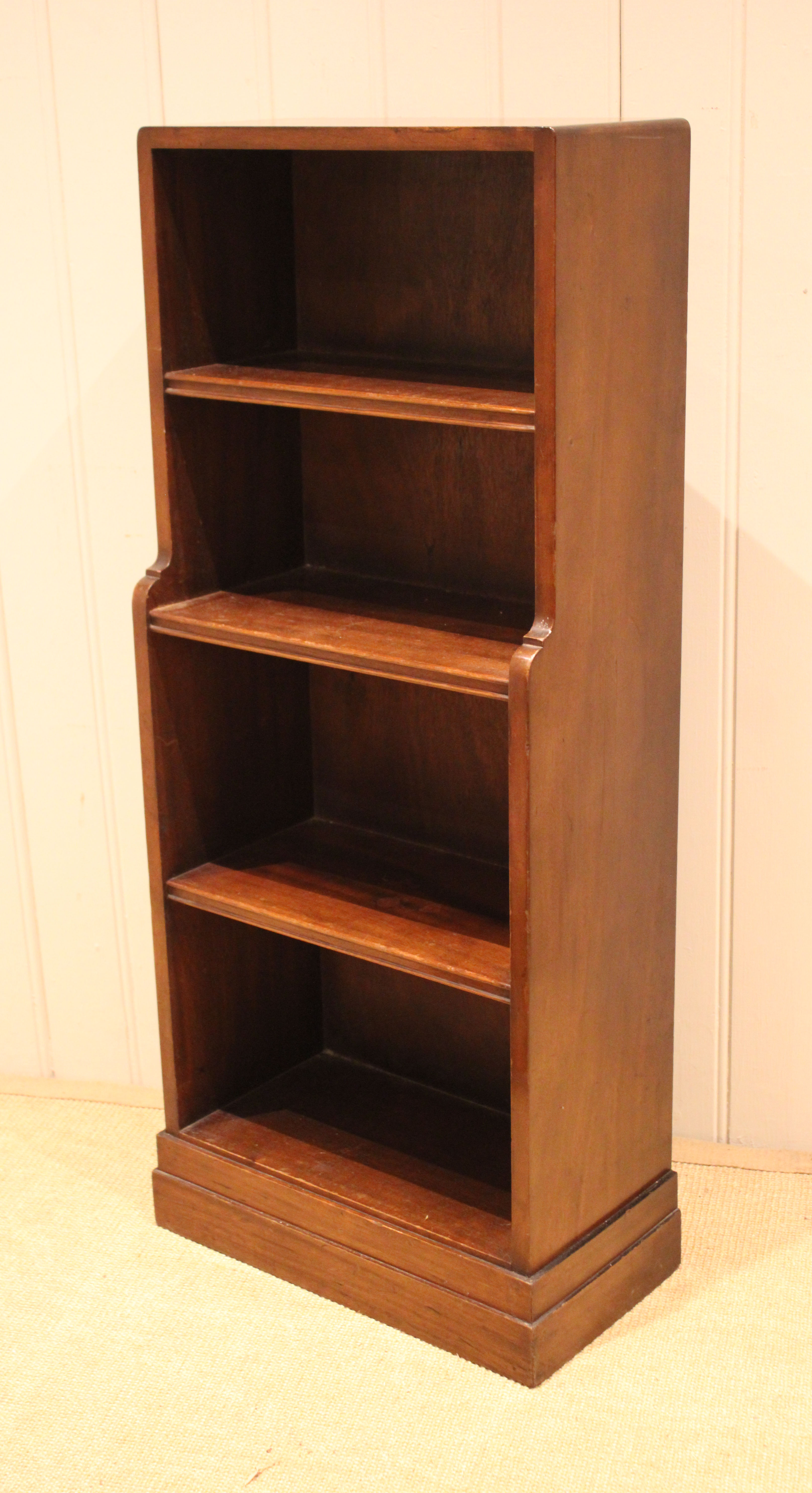 Mahogany open bookcase having three fixed graduated shelves , raised on a plinth base . The shelf dimensions are 41.5 cm wide x 22.5 cm deep and from the bottom up 25 cm high , 25 cm high , 20 cm high and at the top 20 cm high .