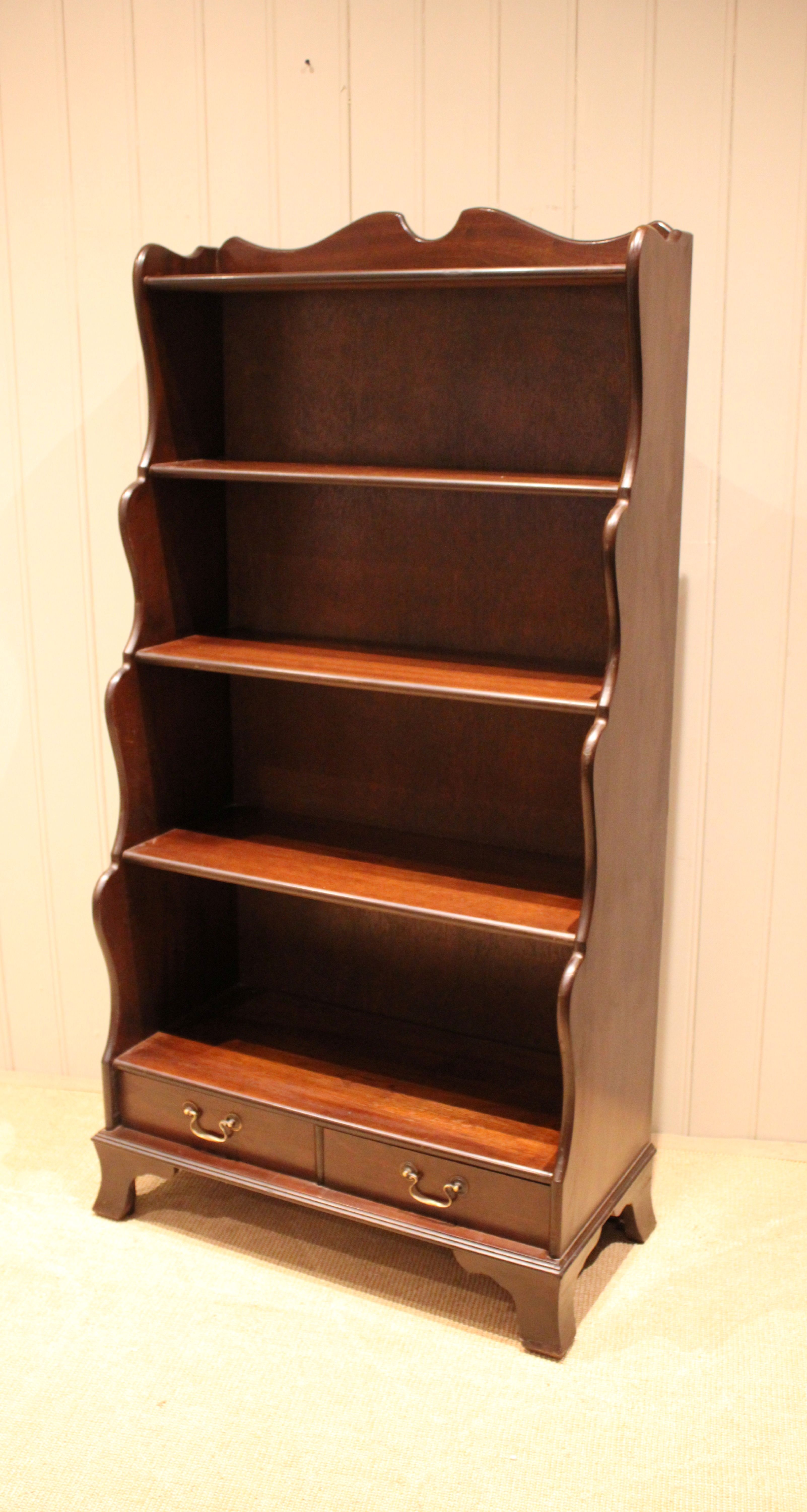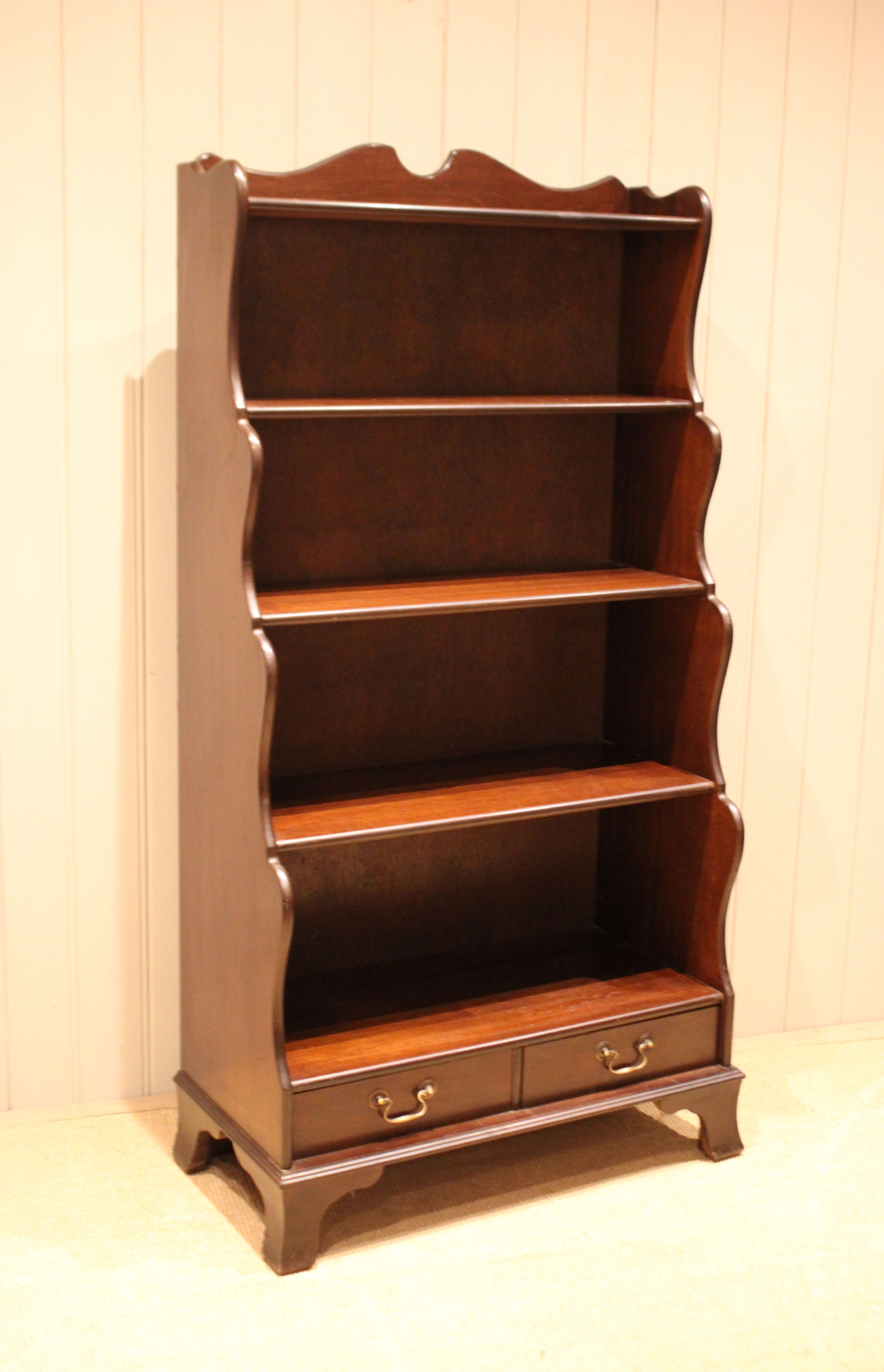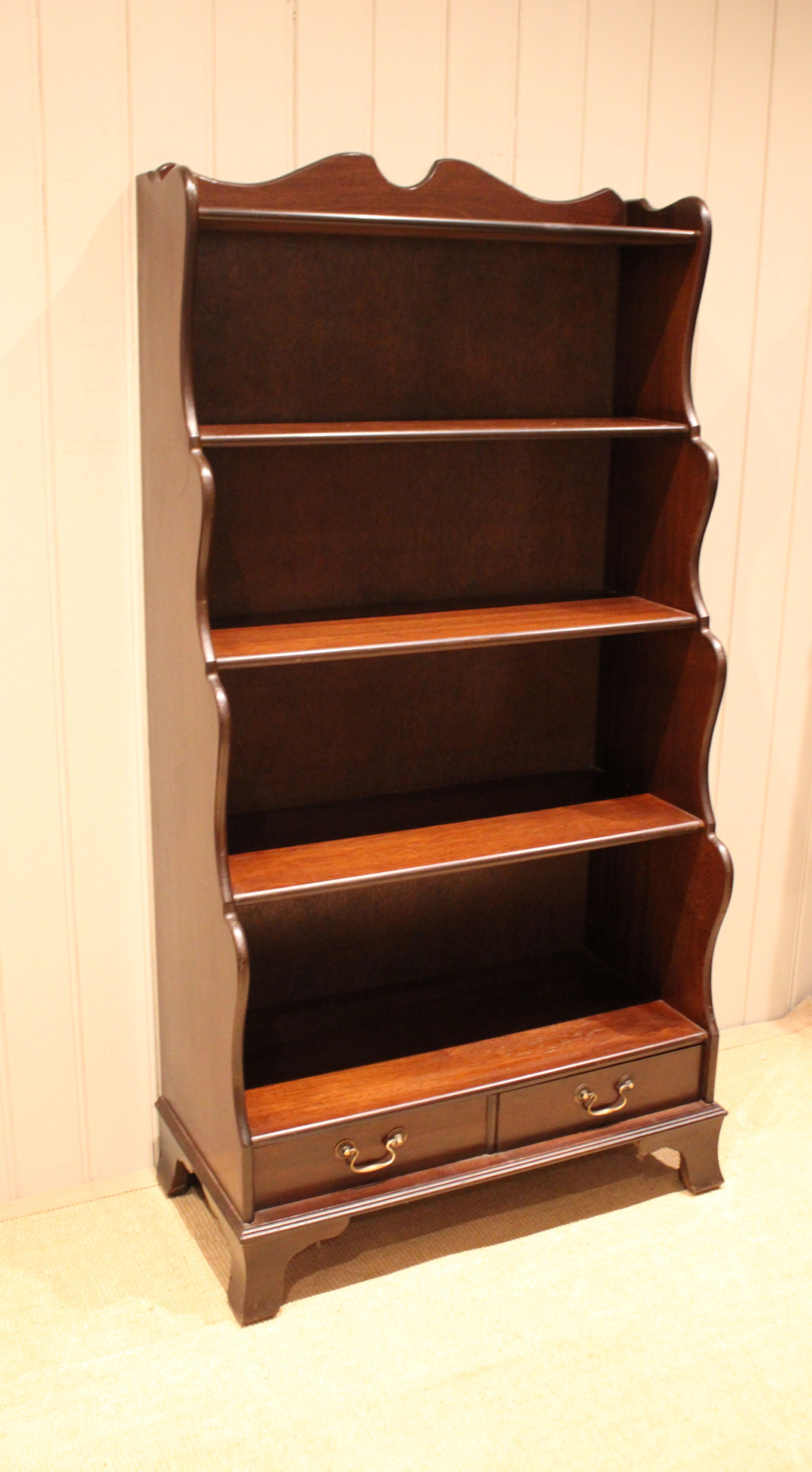 Mahogany waterfall open bookcase having a shaped top with four fixed graduated shelves with a pair of drawers to the bottom , raised on bracket feet . The shelf dimensions are 72.5 cm wide and from the bottom up 30.5 cm high x 34 cm deep , 28 cm high x 29.5 cm deep, 25 cm high x 24.5 cm deep and at the top 25 cm high x 19 cm deep