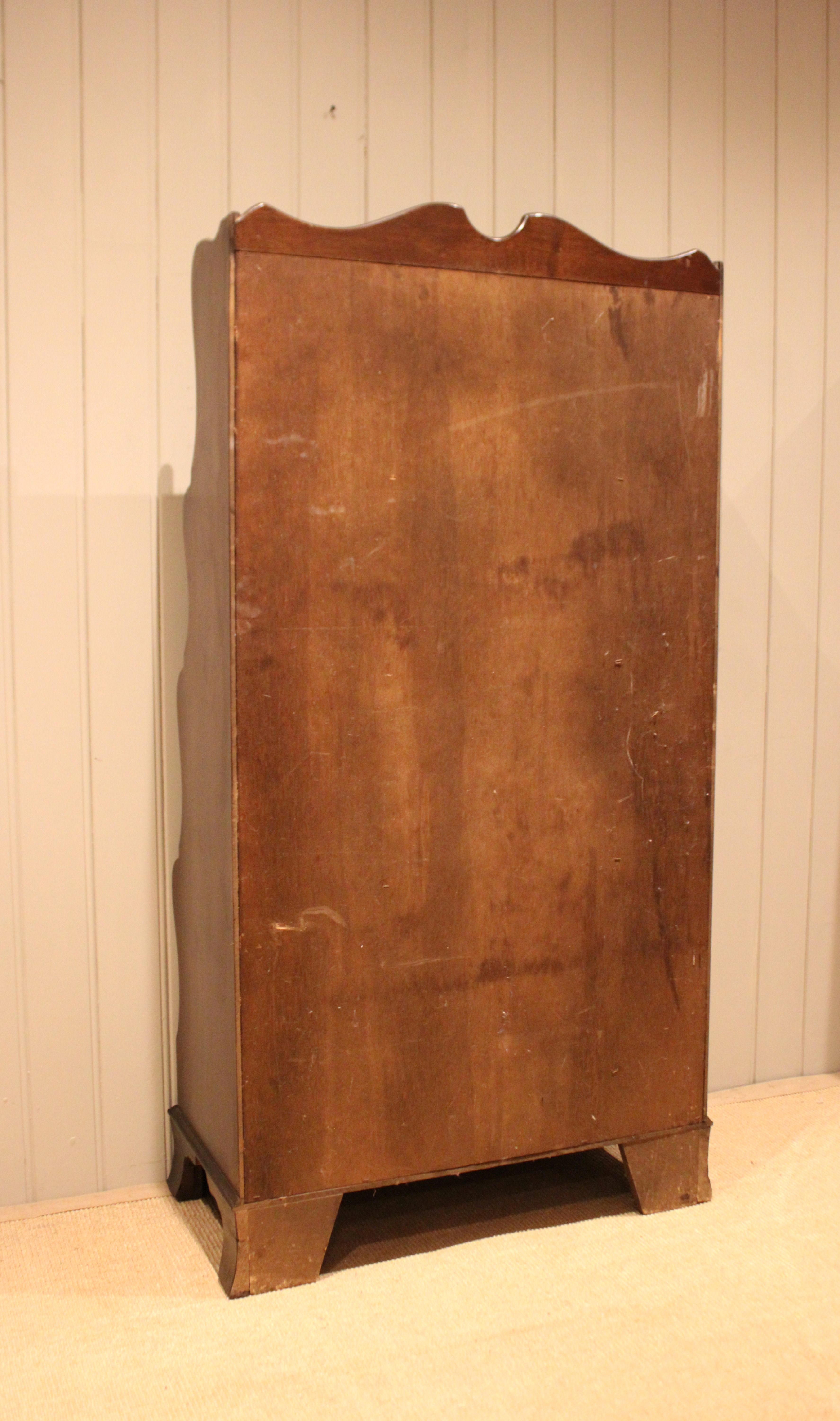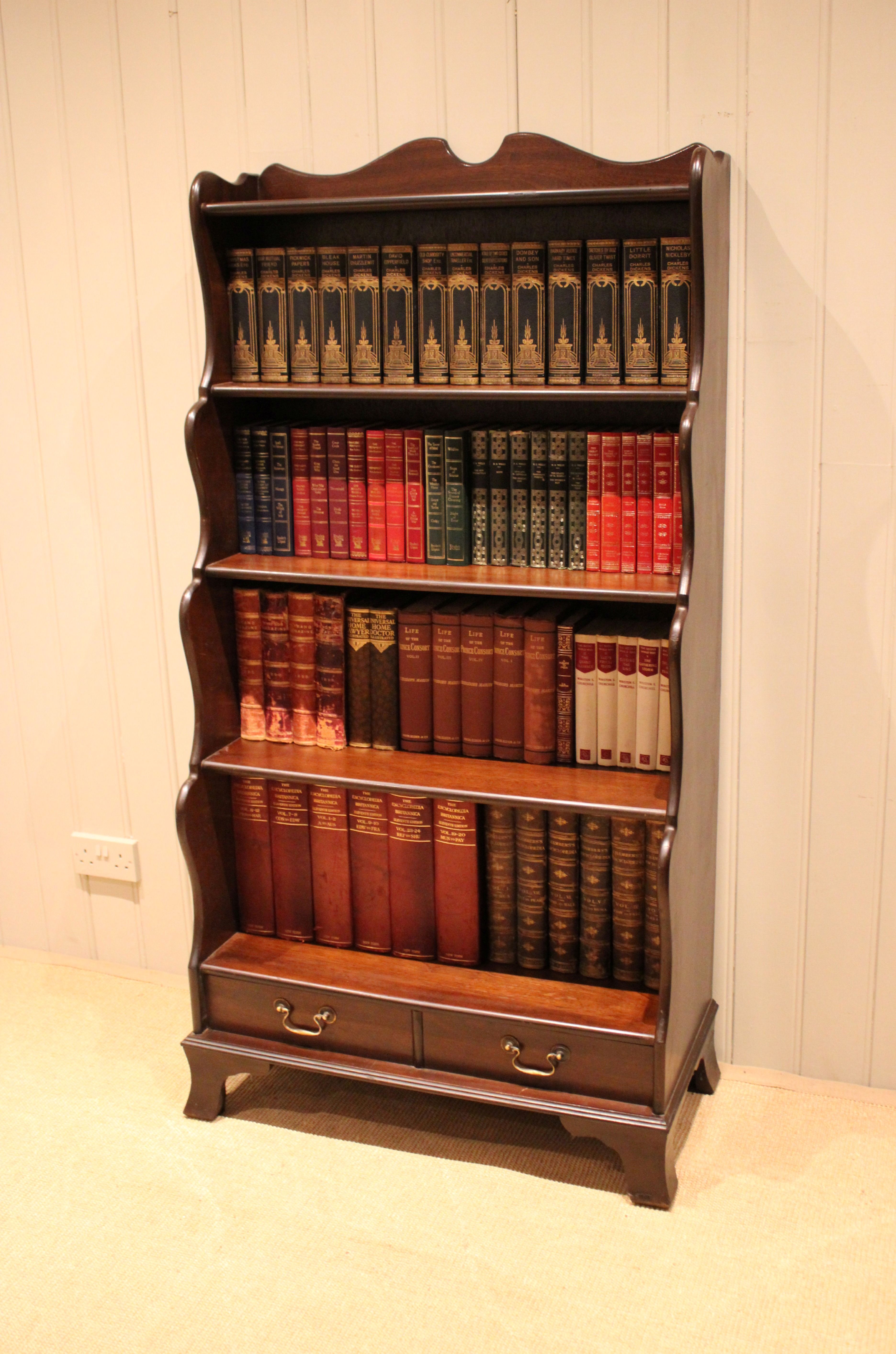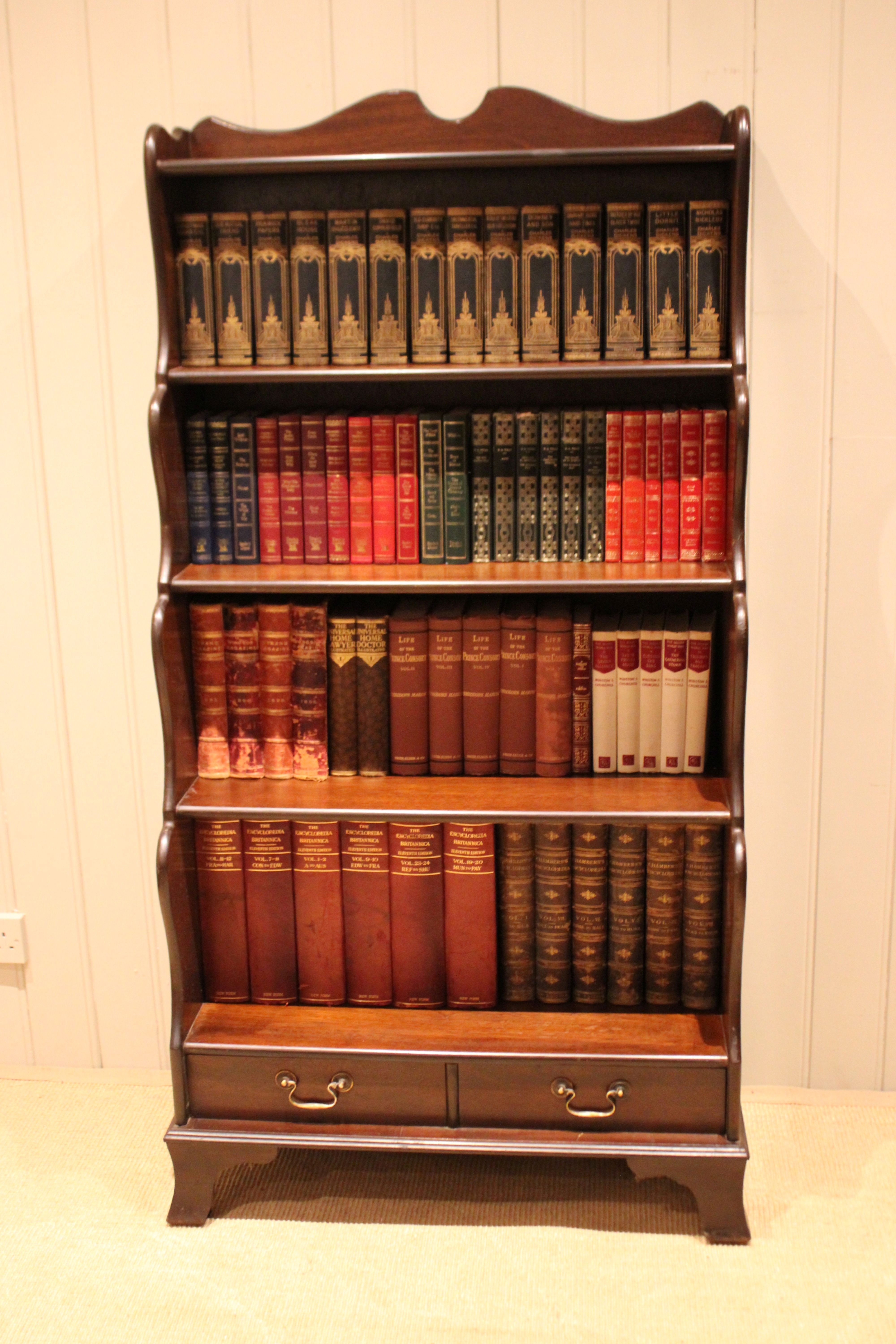 Mahogany waterfall open bookcase having a shaped top with four fixed graduated shelves with a pair of drawers to the bottom , raised on bracket feet . The shelf dimensions are 72.5 cm wide and from the bottom up 30.5 cm high x 34 cm deep , 28 cm high x 29.5 cm deep, 25 cm high x 24.5 cm deep and at the top 25 cm high x 19 cm deep