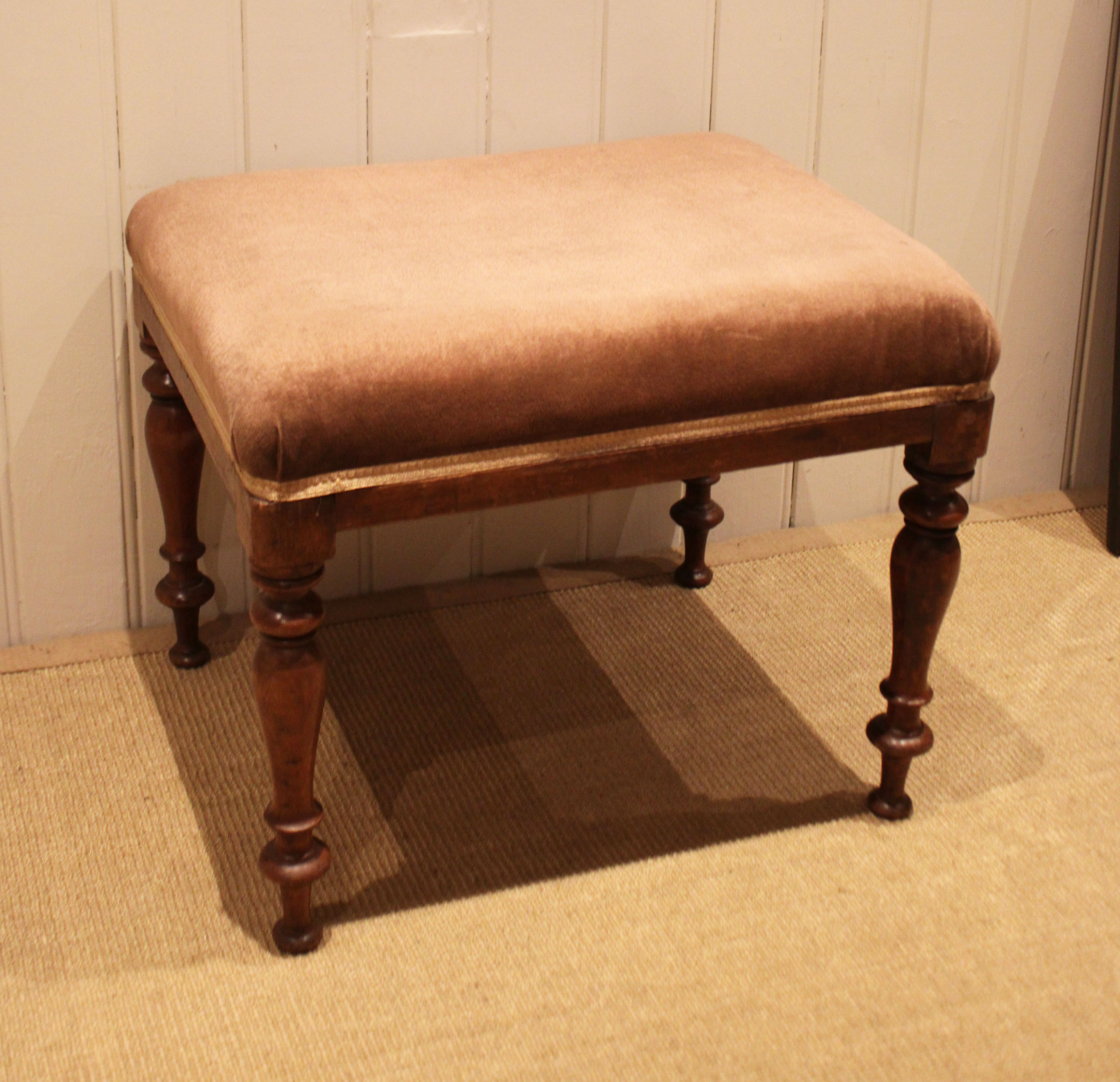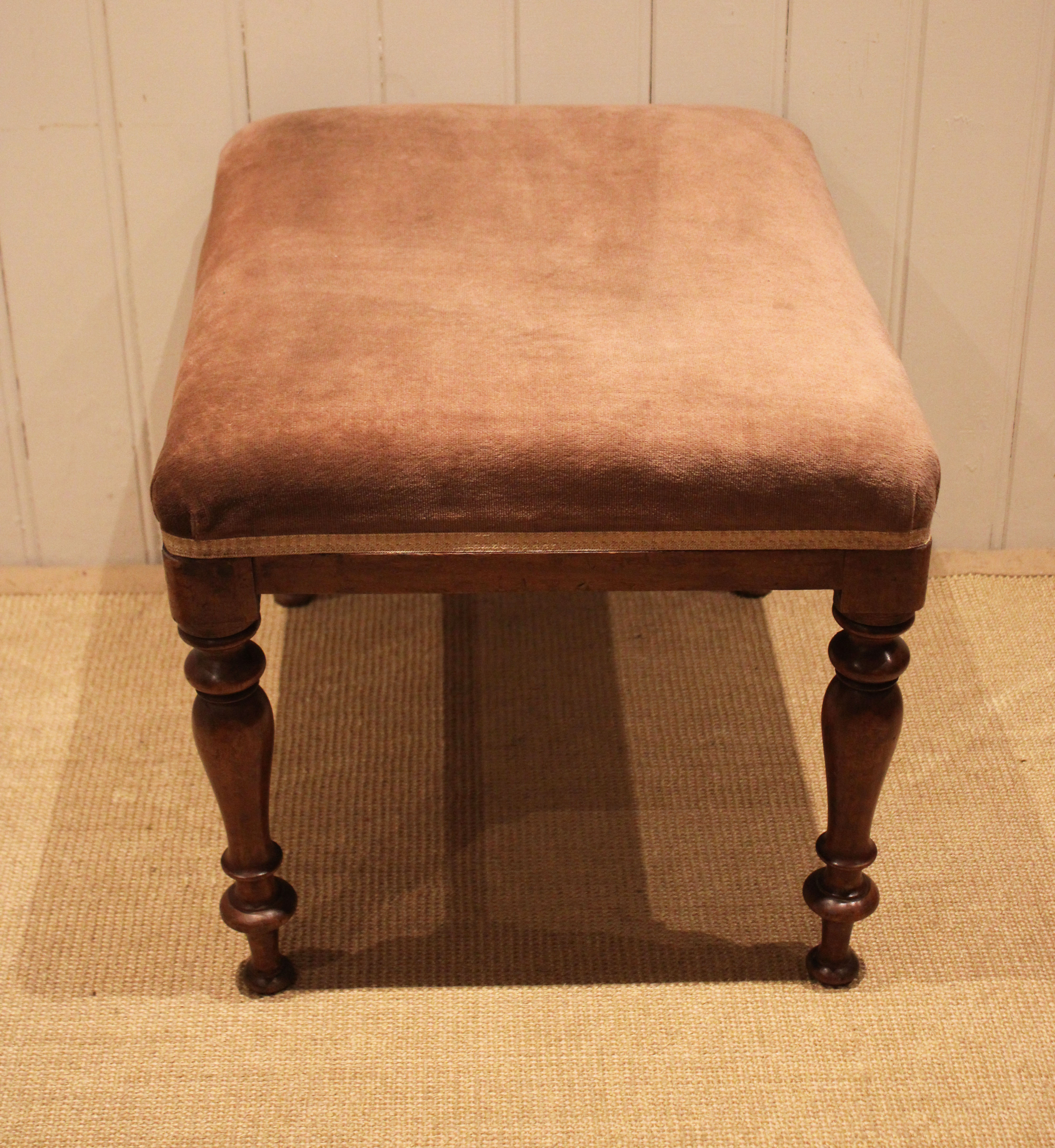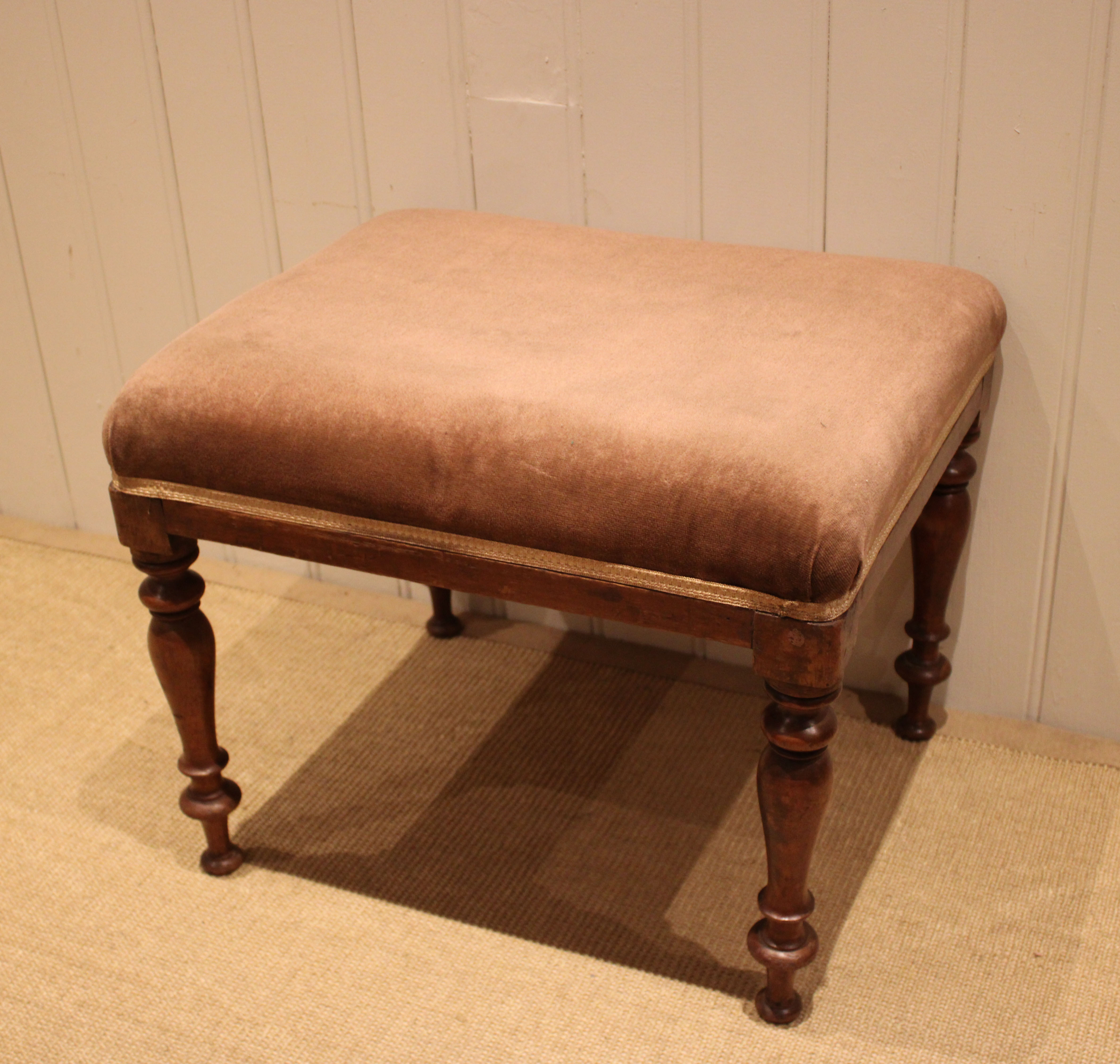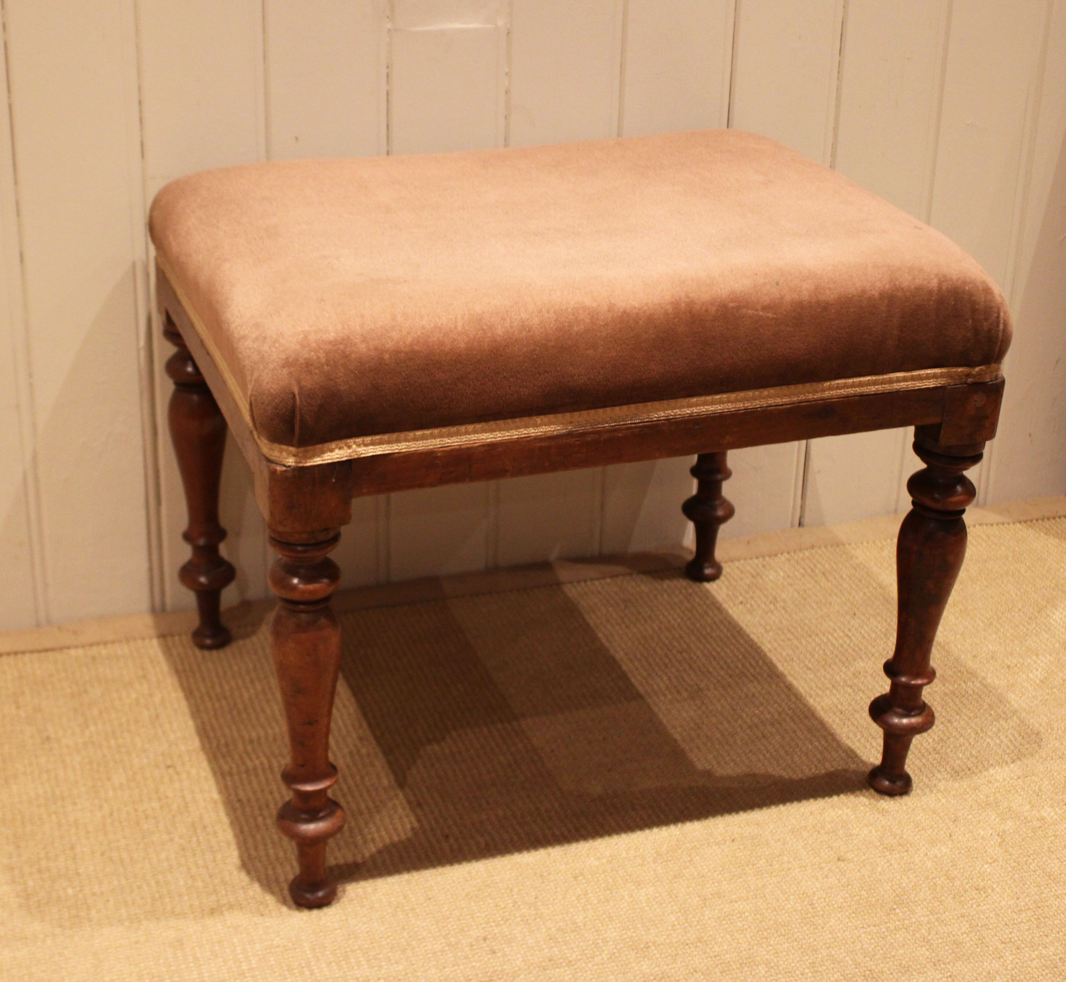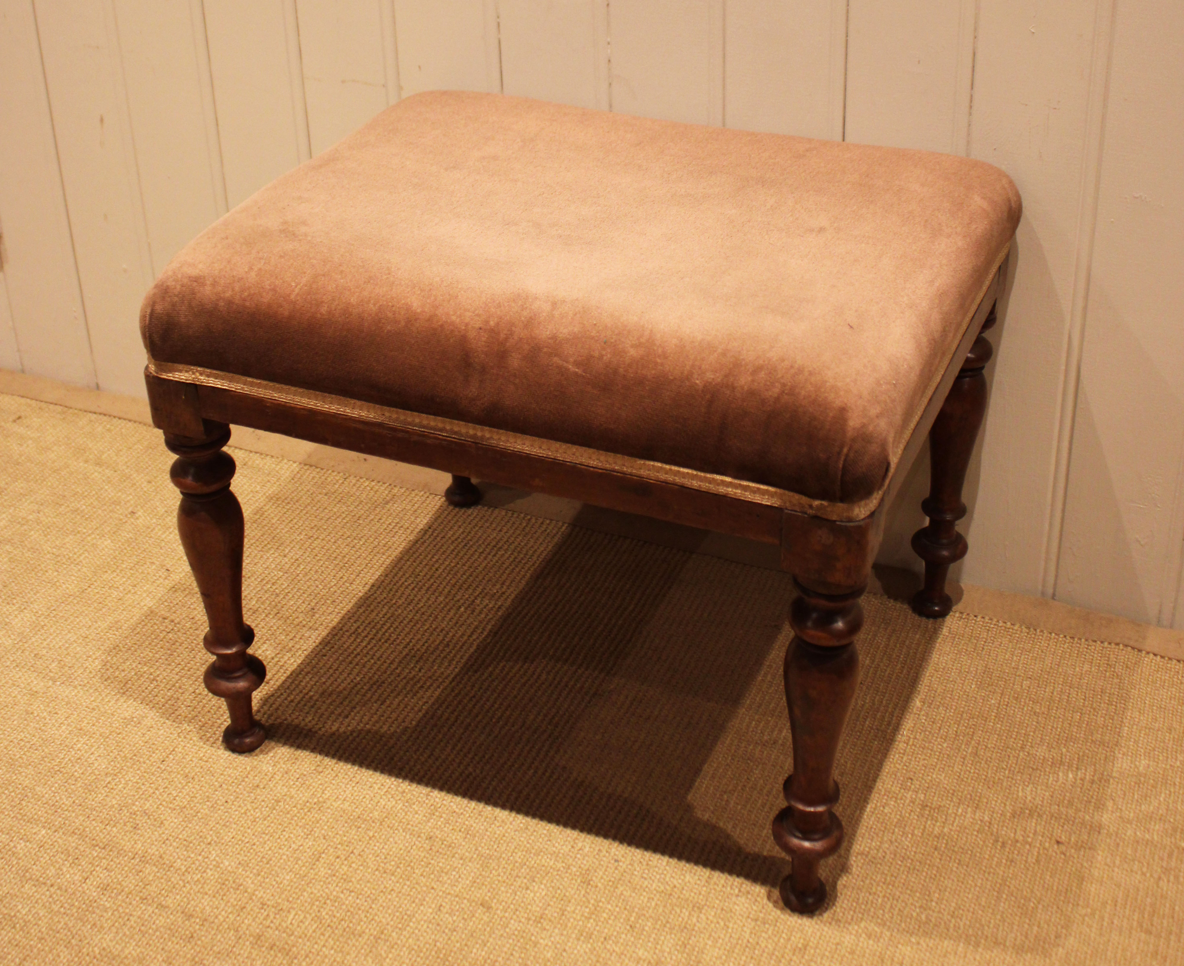 Mahogany upholstered stool raised on turned supports . A great item for a reupholstery project .
