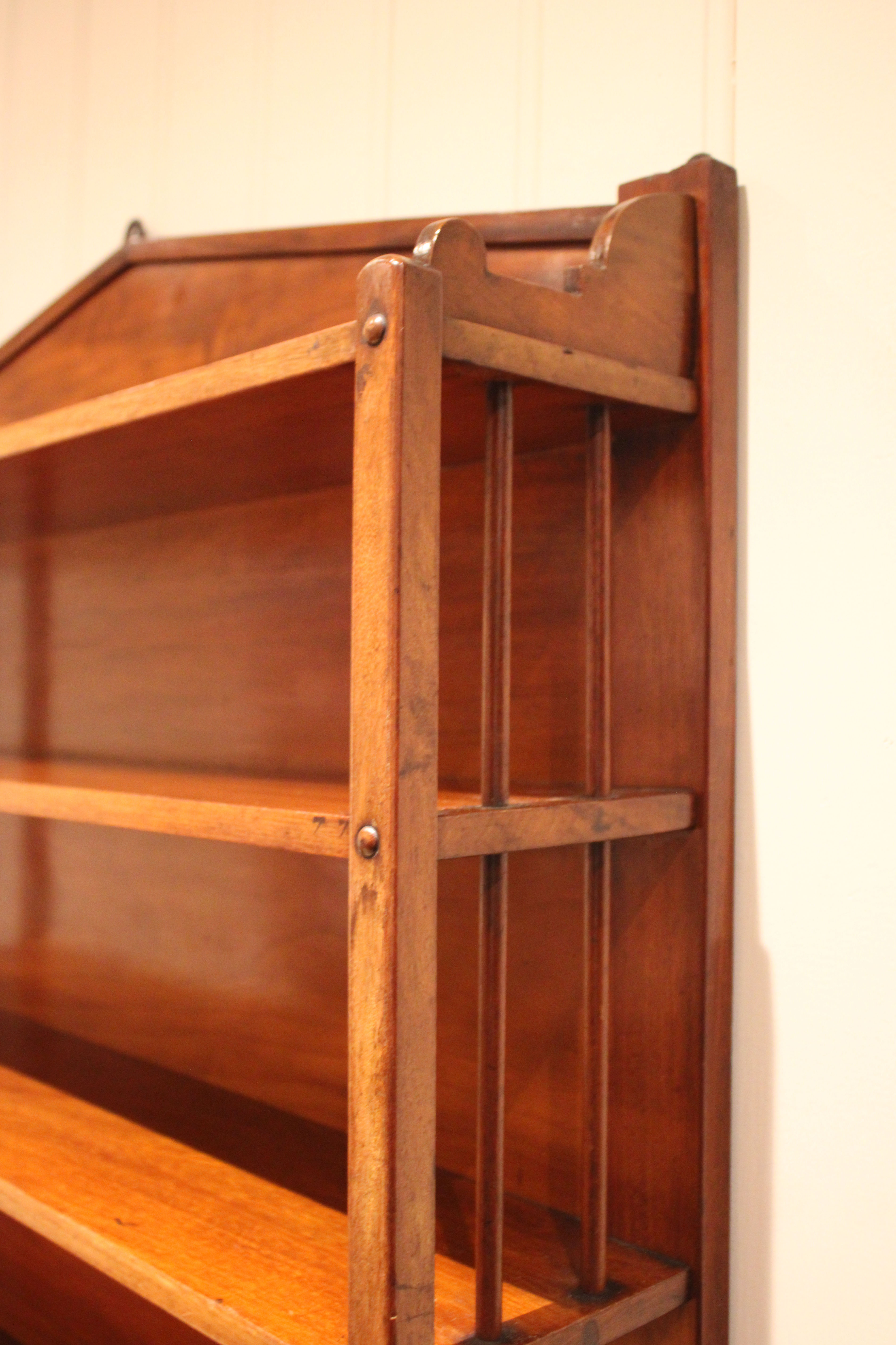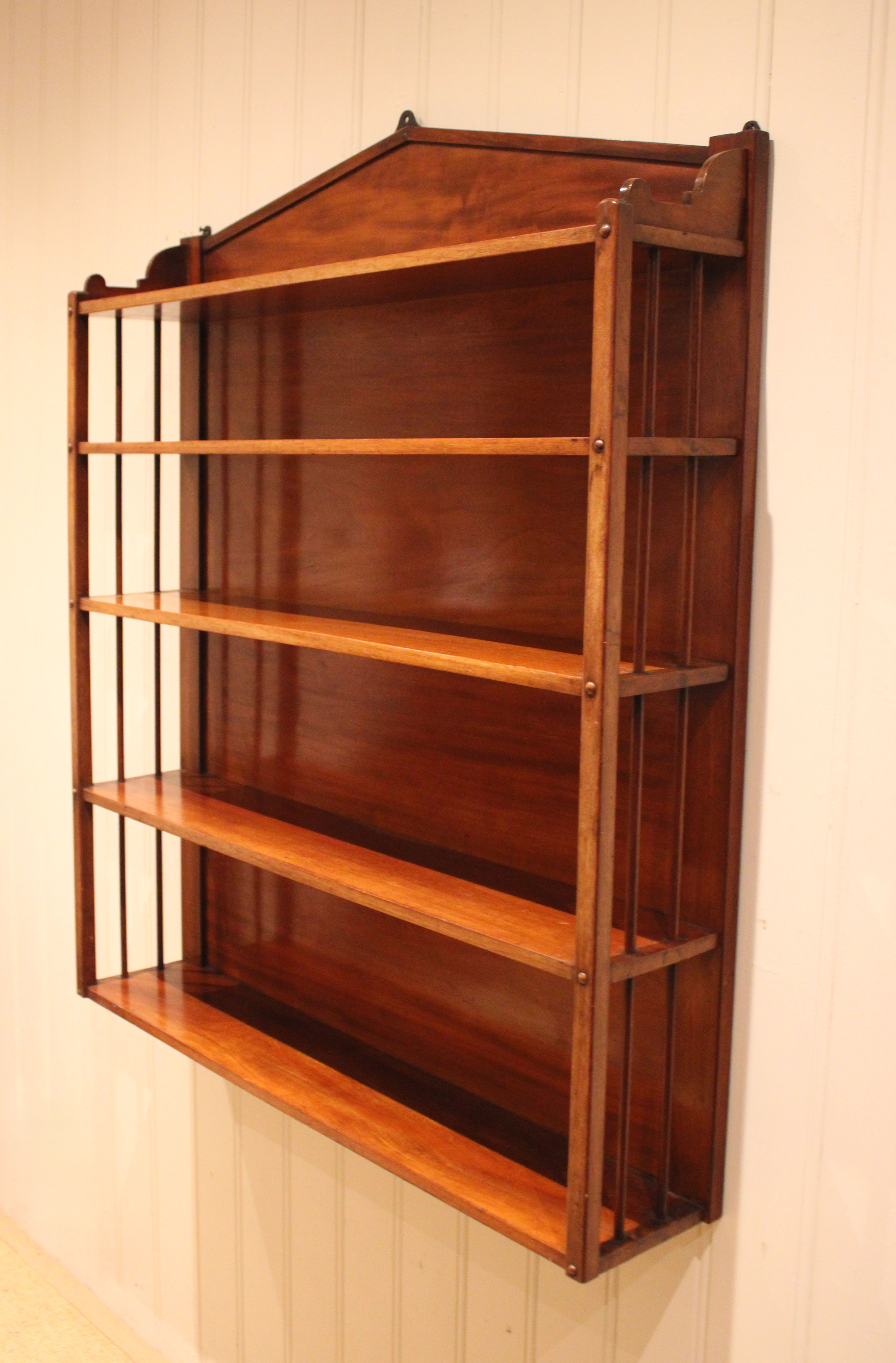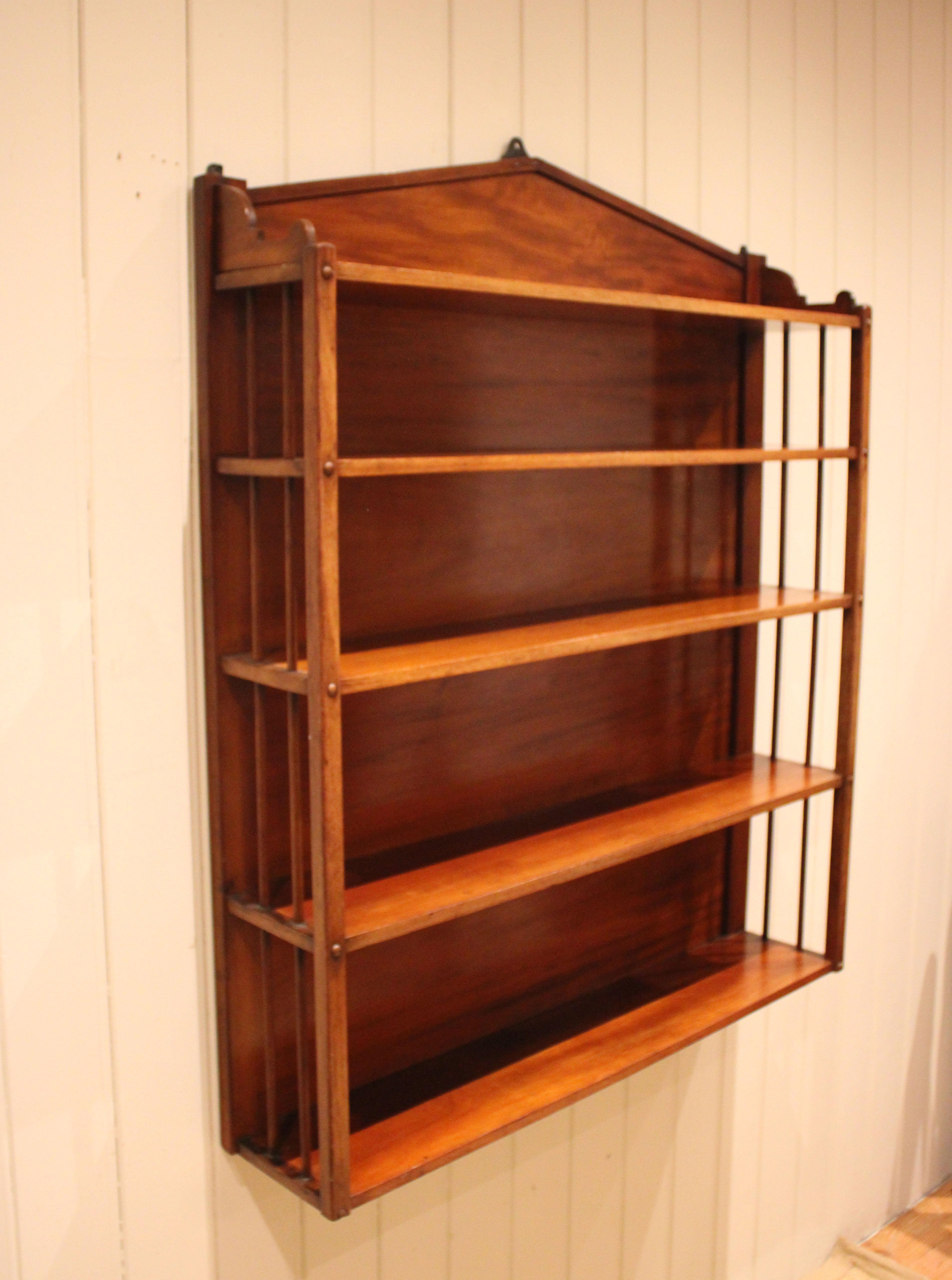 Mahogany William IV wall shelves having four fixed shelves with an architectural top with turned side spindles . The shelves are 88 cm wide and 17 cm deep , from the bottom up the heights are 25 cm ,23 cm , 18 cm and at the top 15.5 cm high .