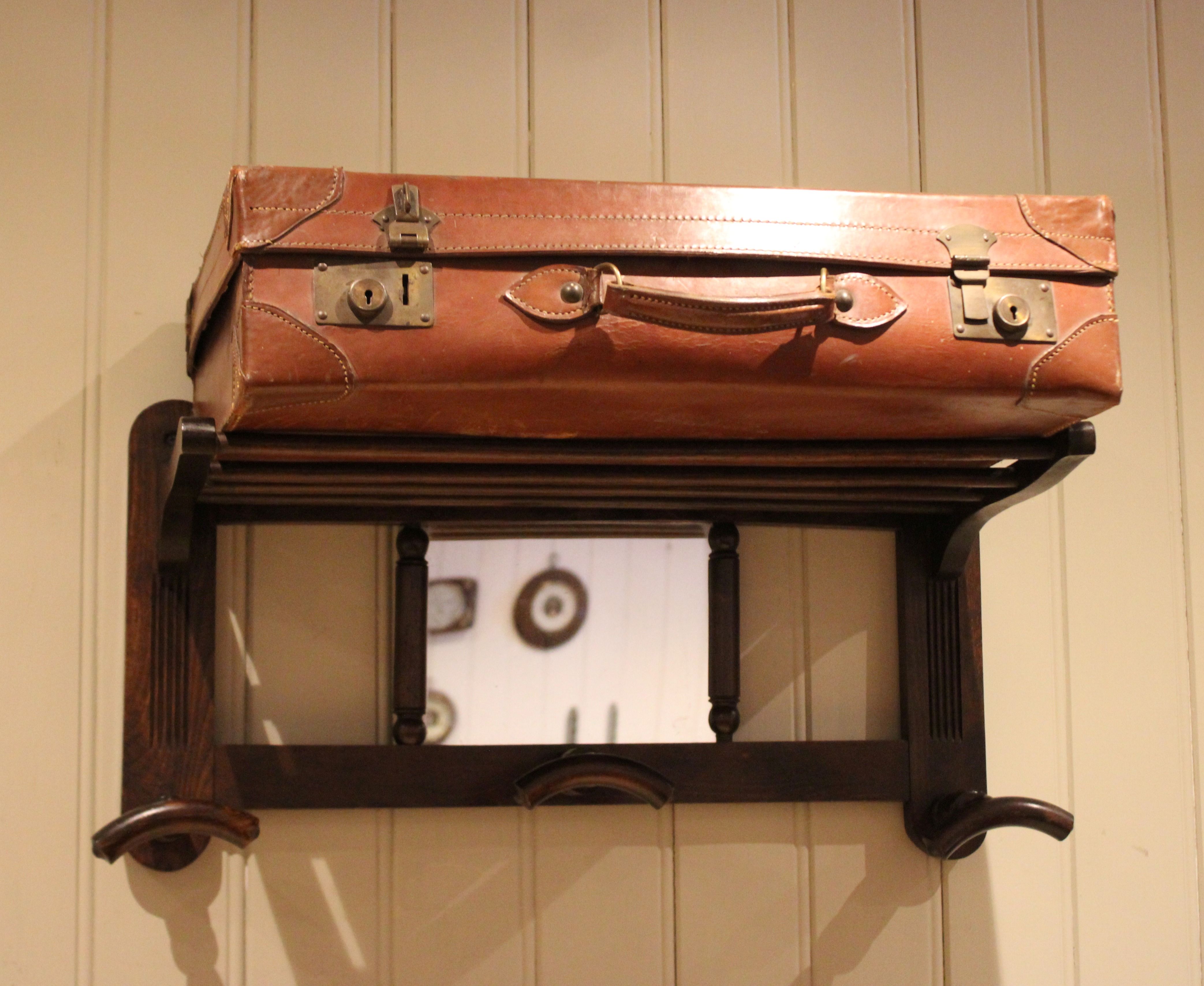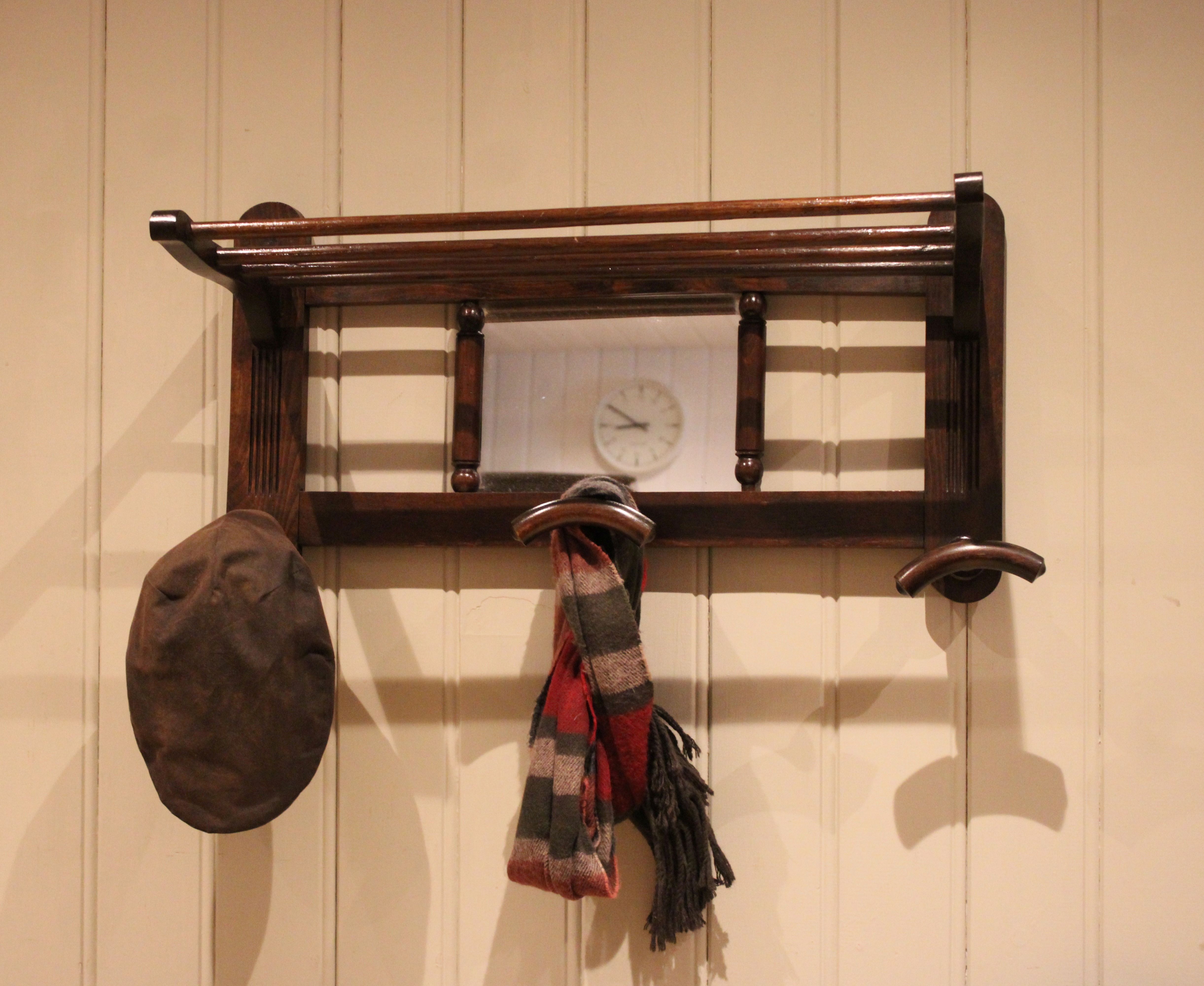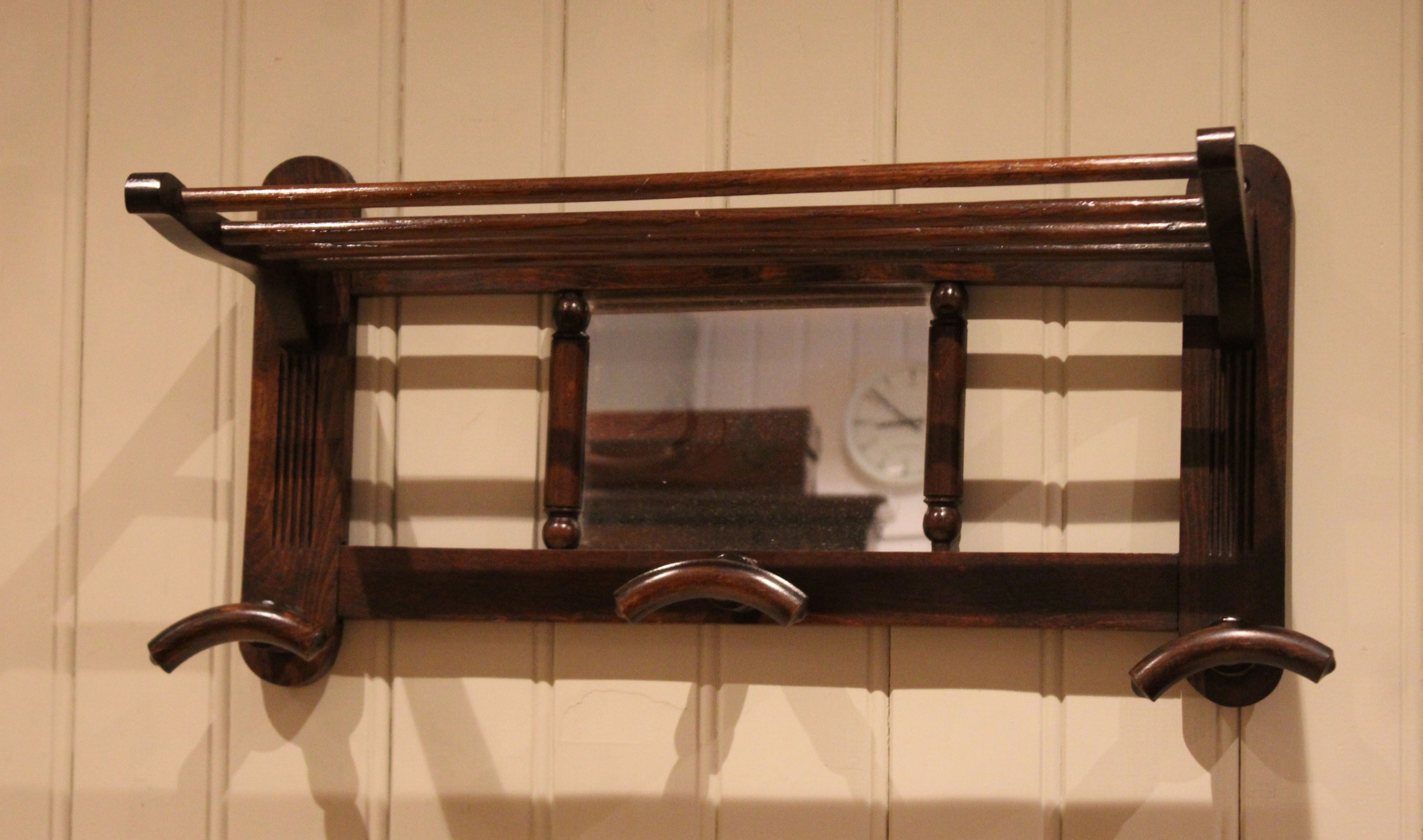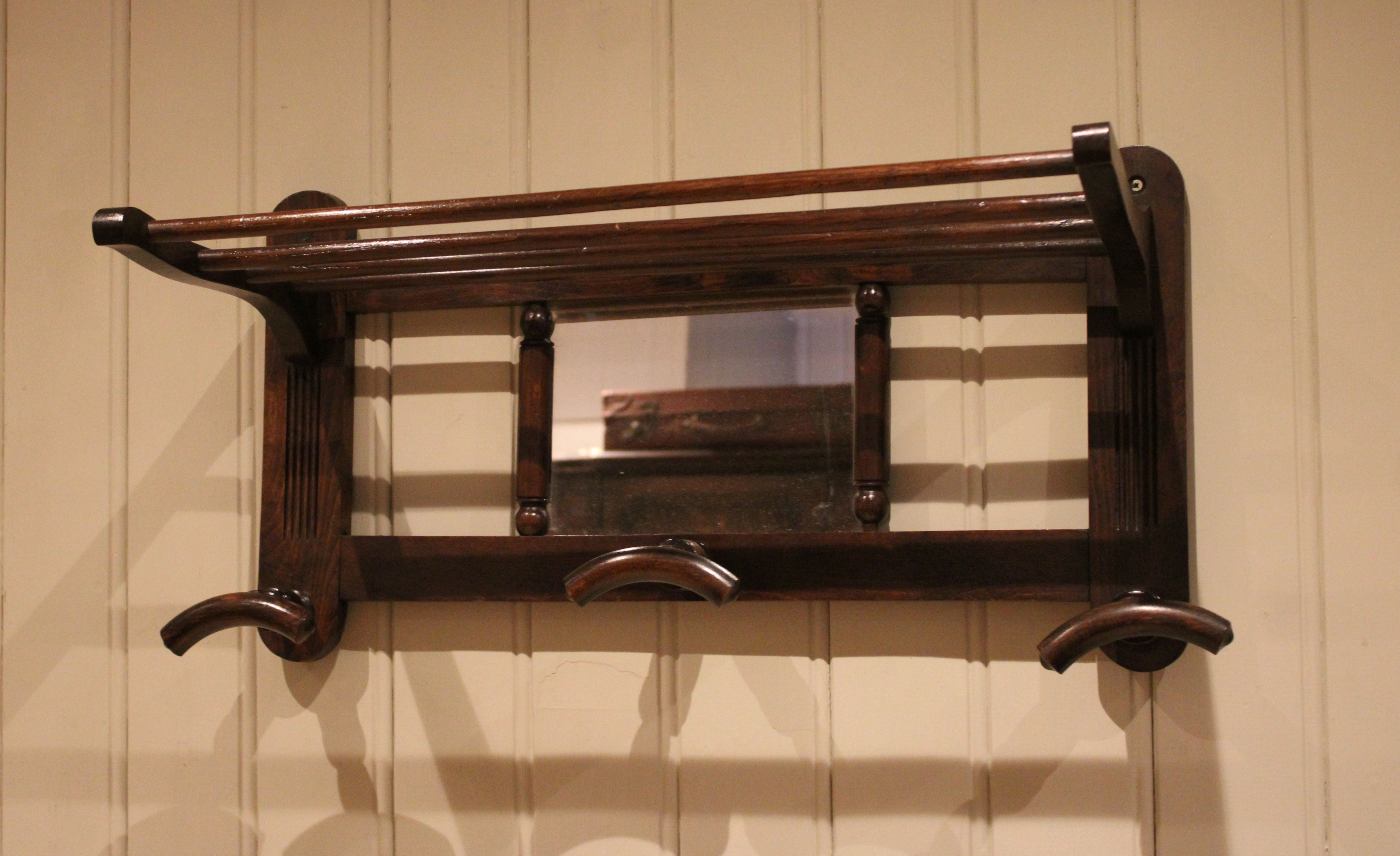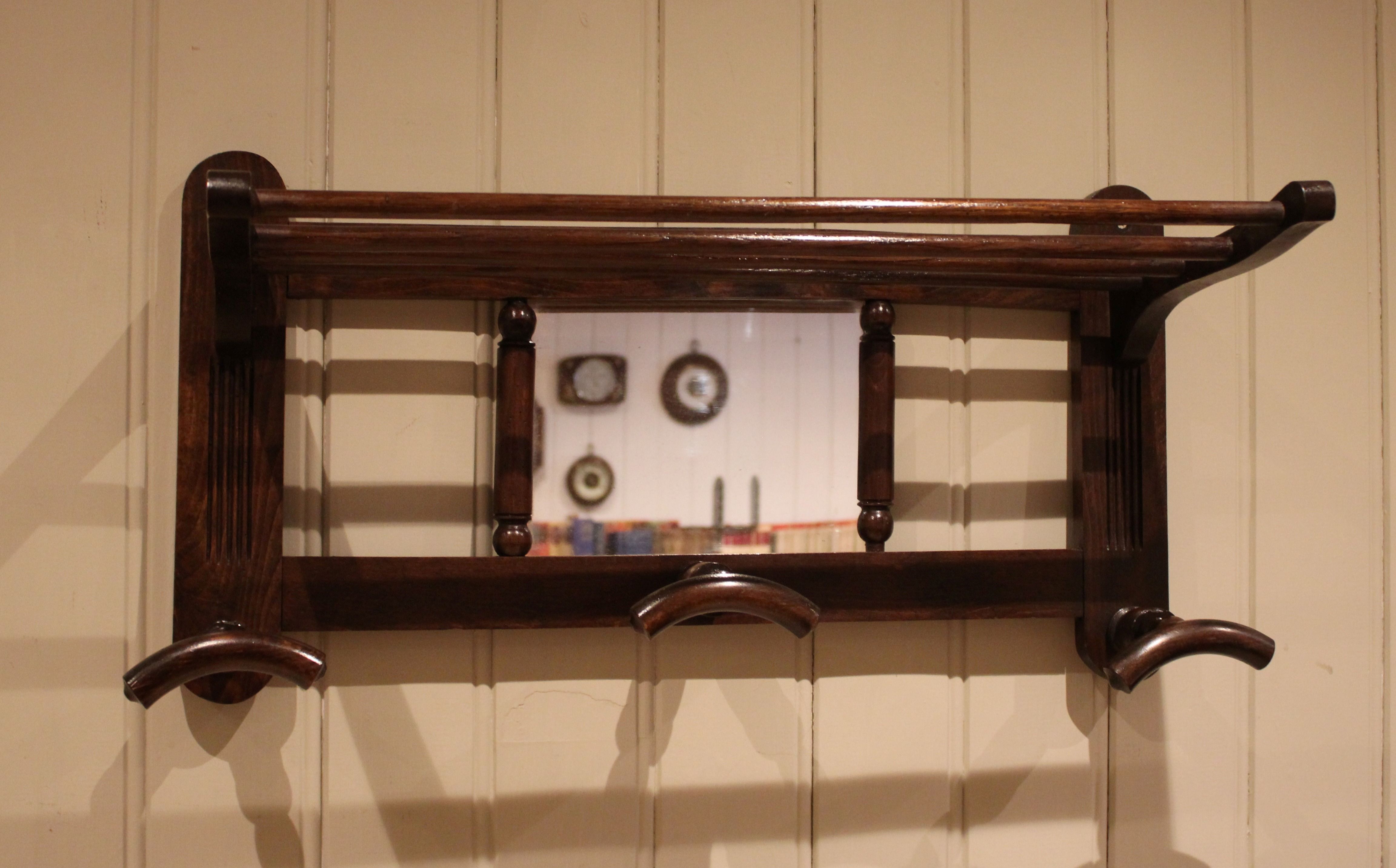 Mirrored beech wood shelf having a central rectangular mirror with three turned hat and coat hooks , with a storage rack/shelf above.