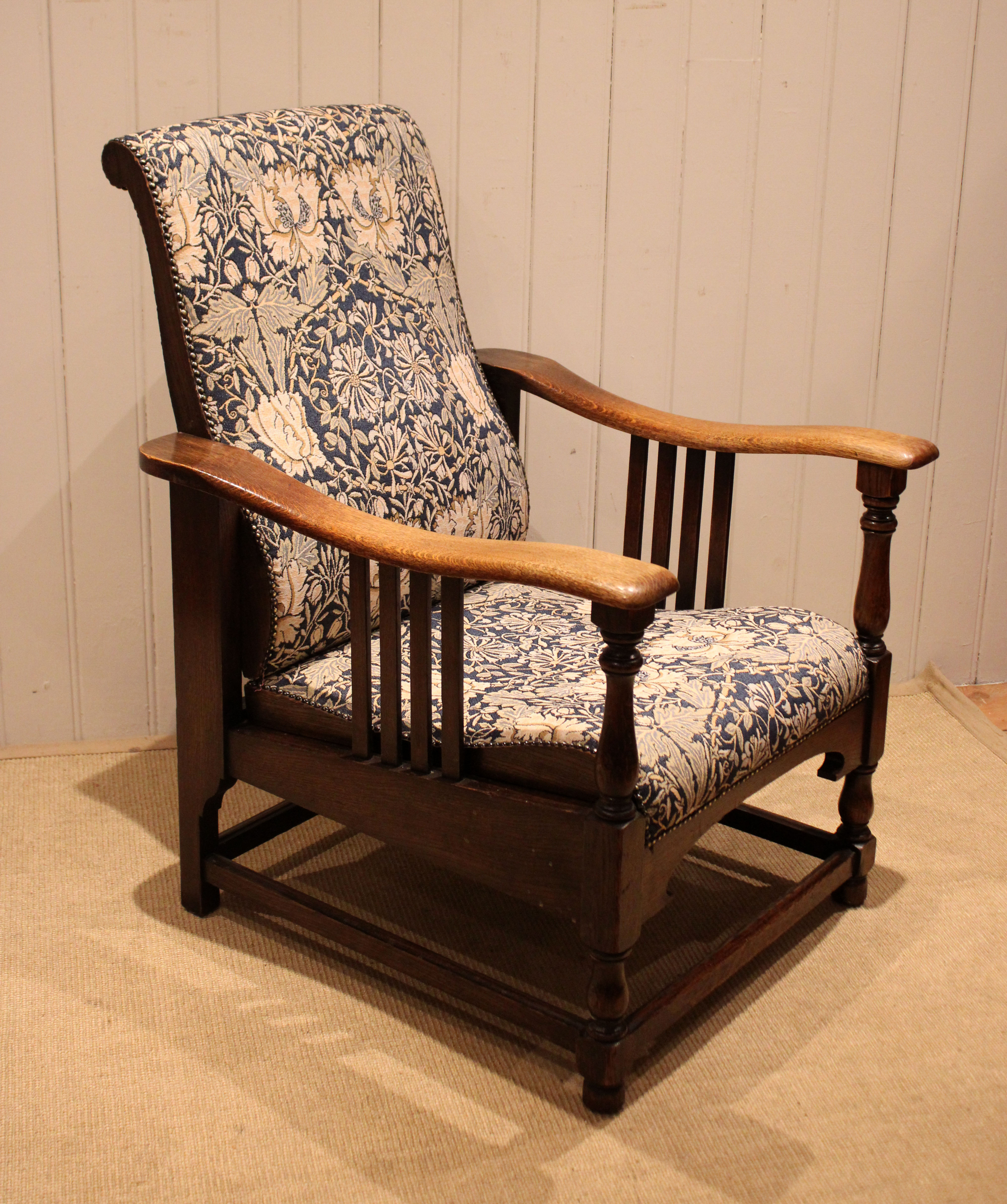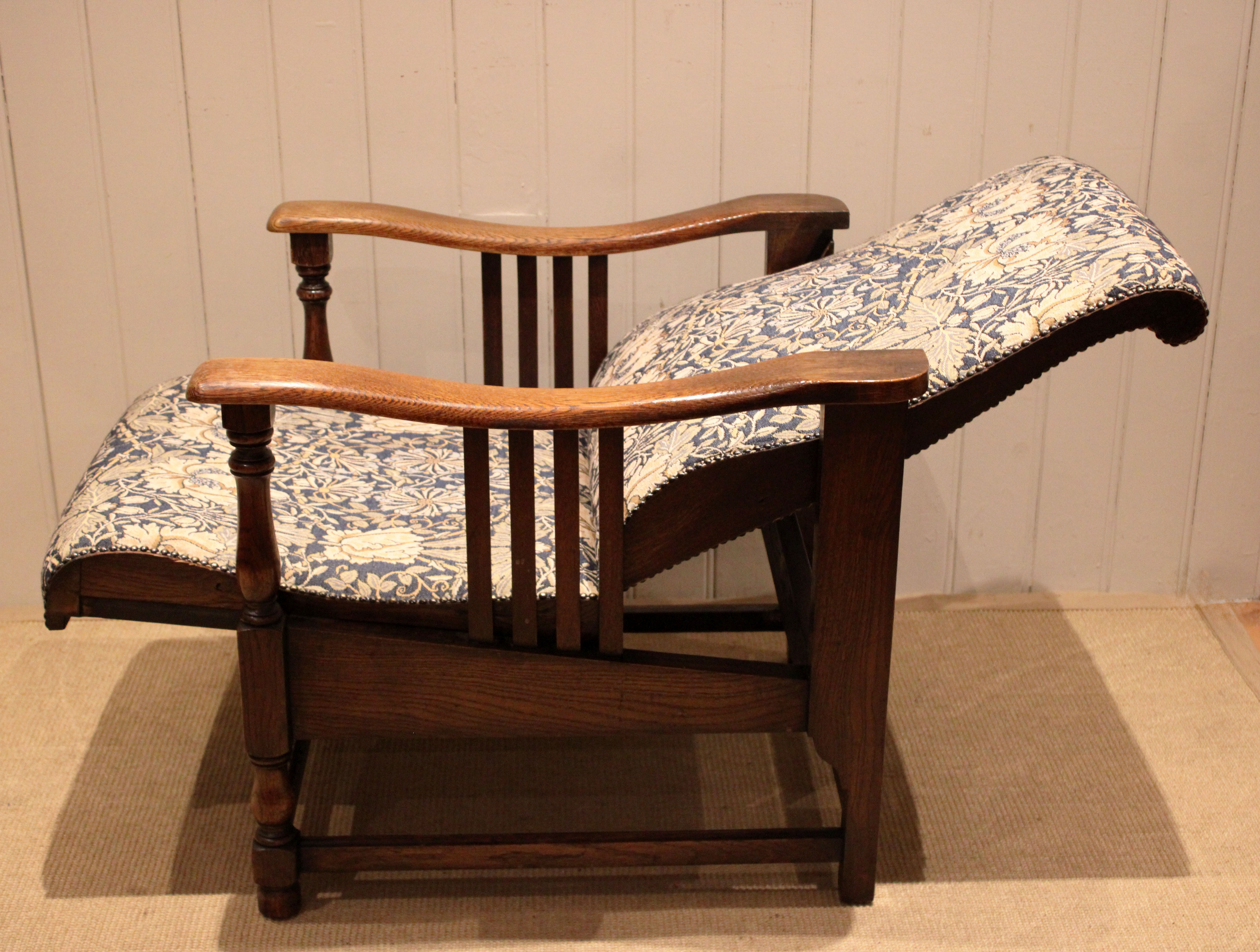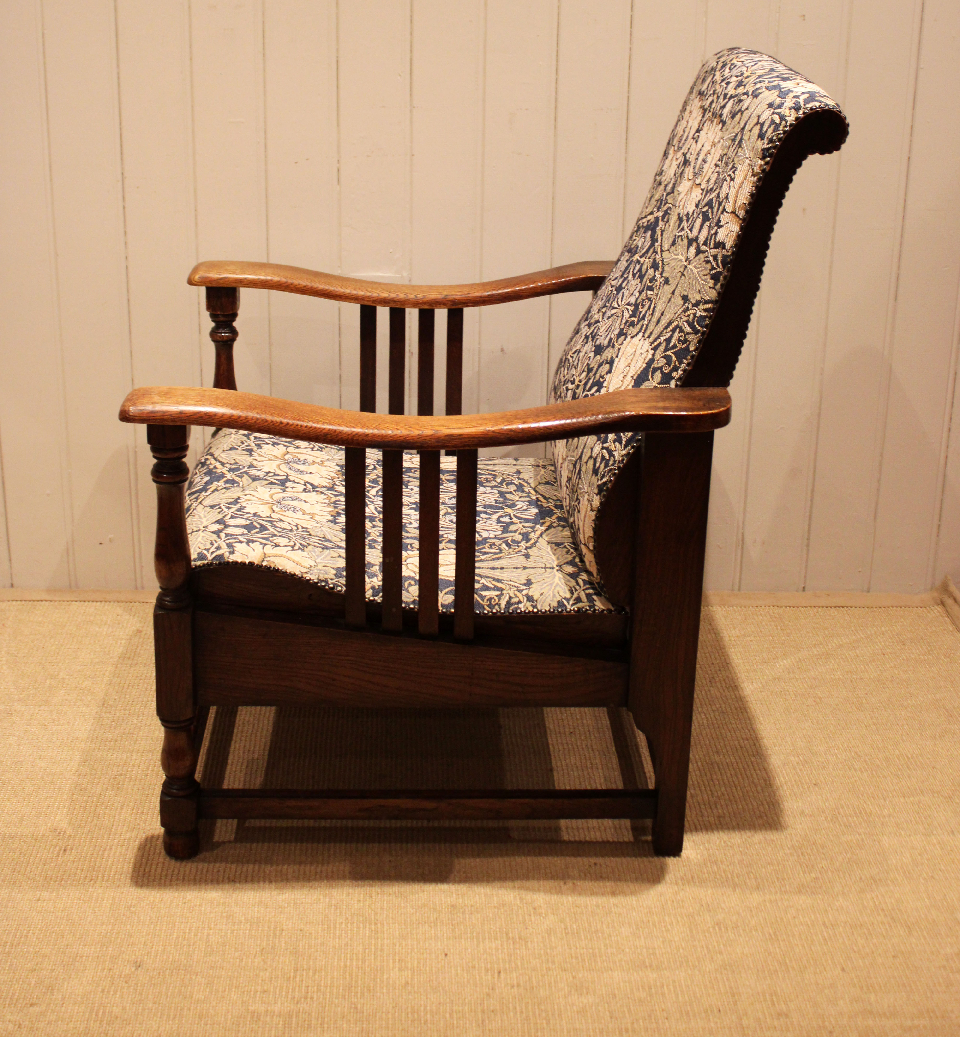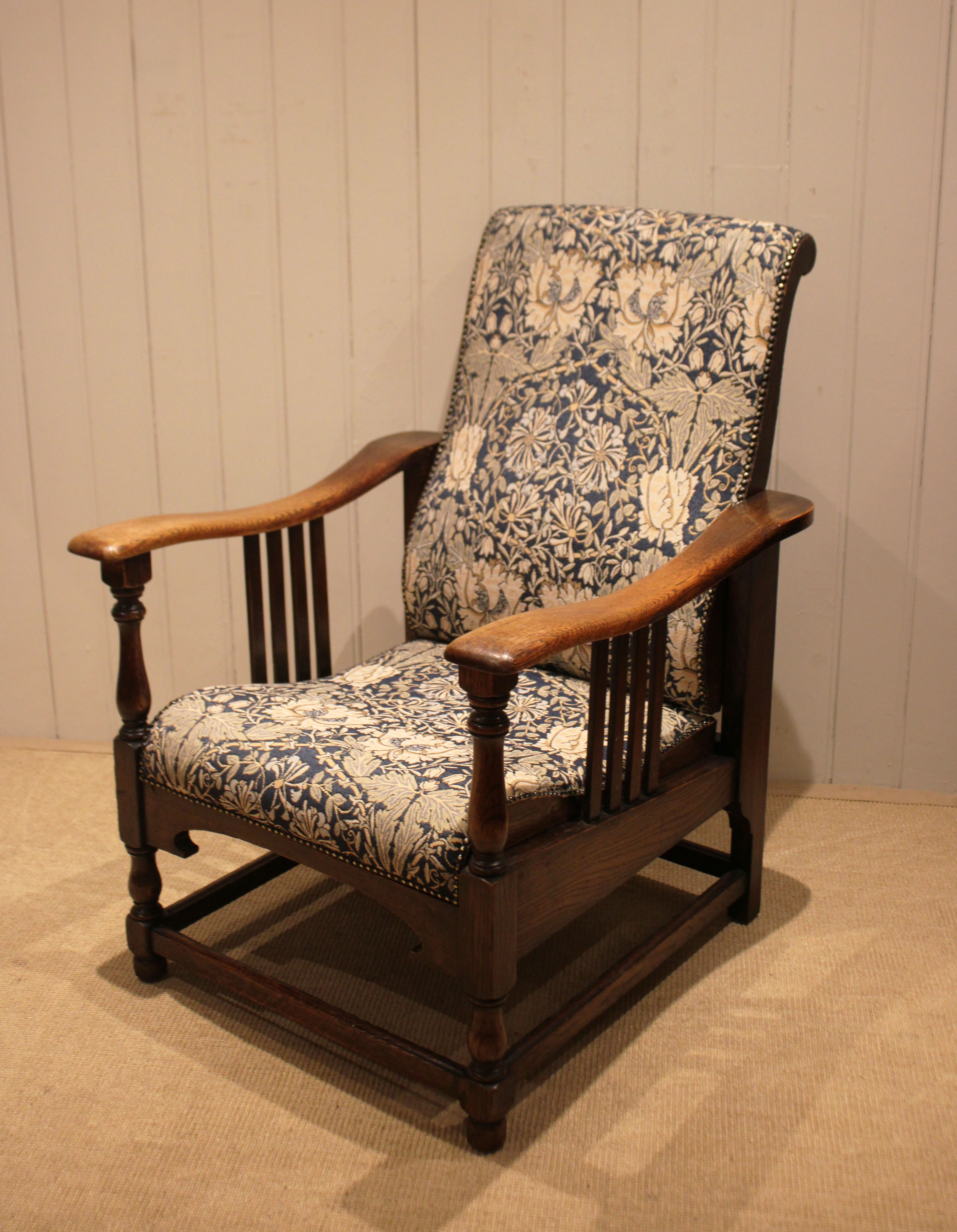 Arts & Crafts oak framed recliner chair, the seat leans back and moves forward to a reclining position , held in place by bodyweight , having a newly upholstered seat and back , with side rails , raised on turned supports , newly reupholstered in a William Morris fabric .