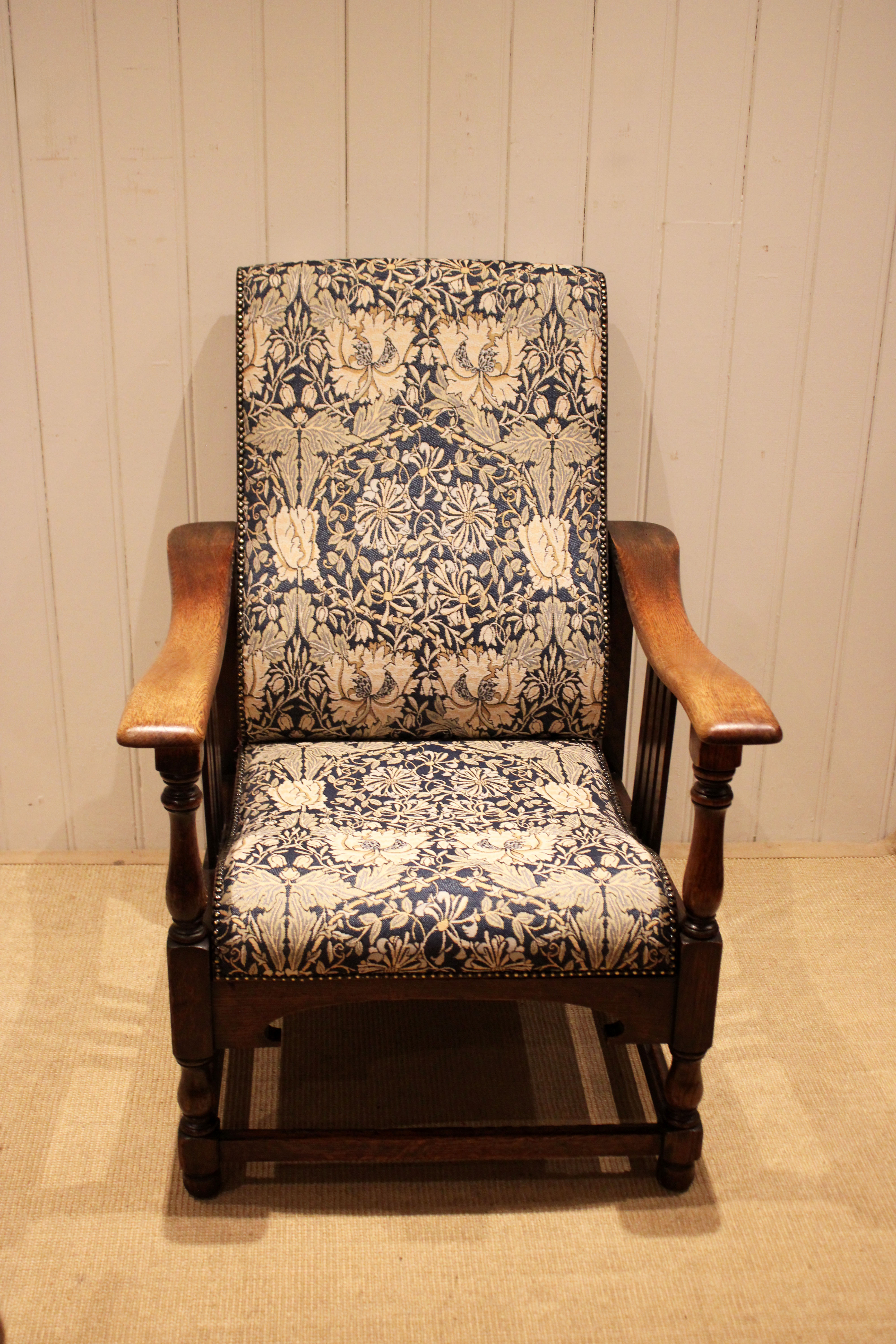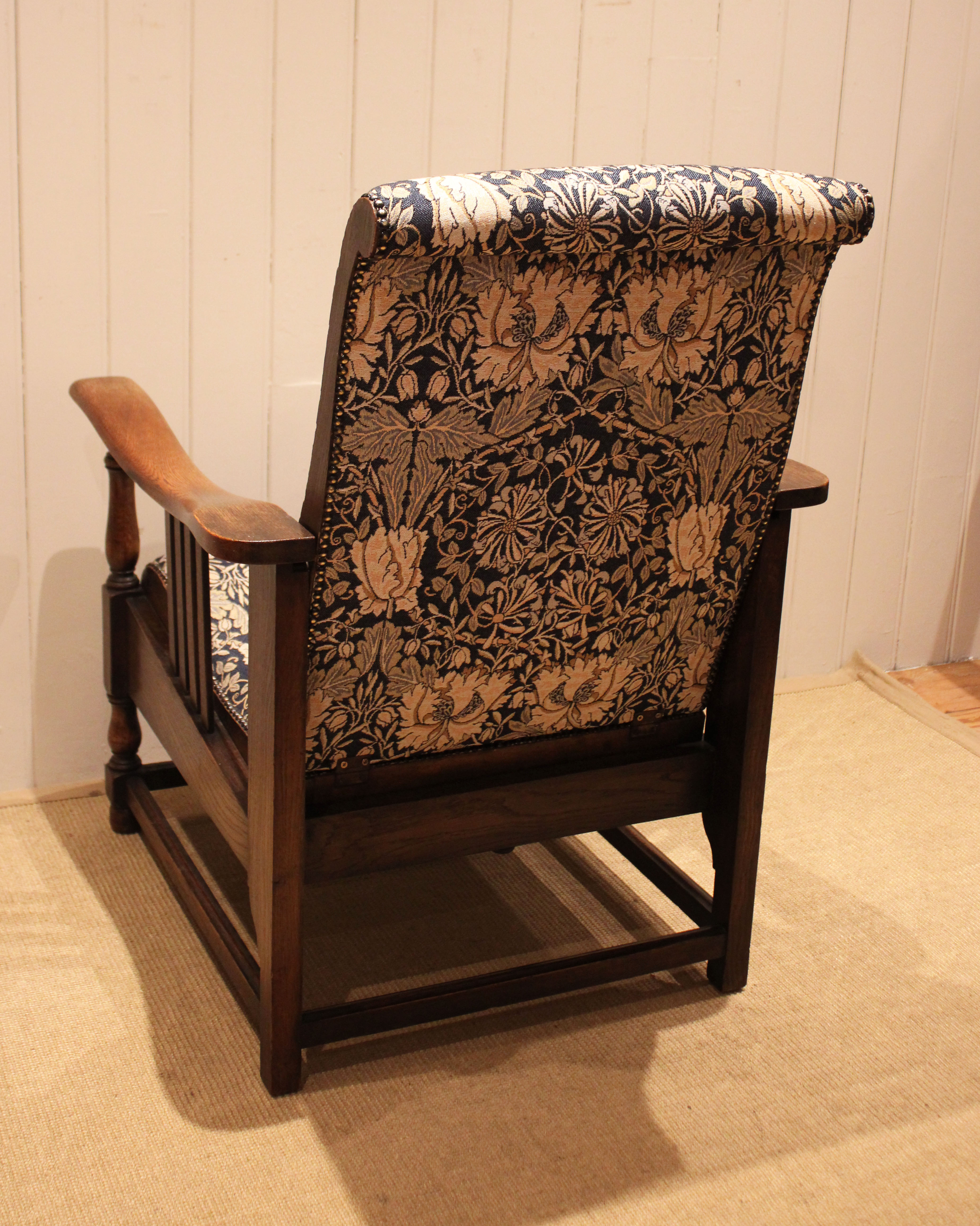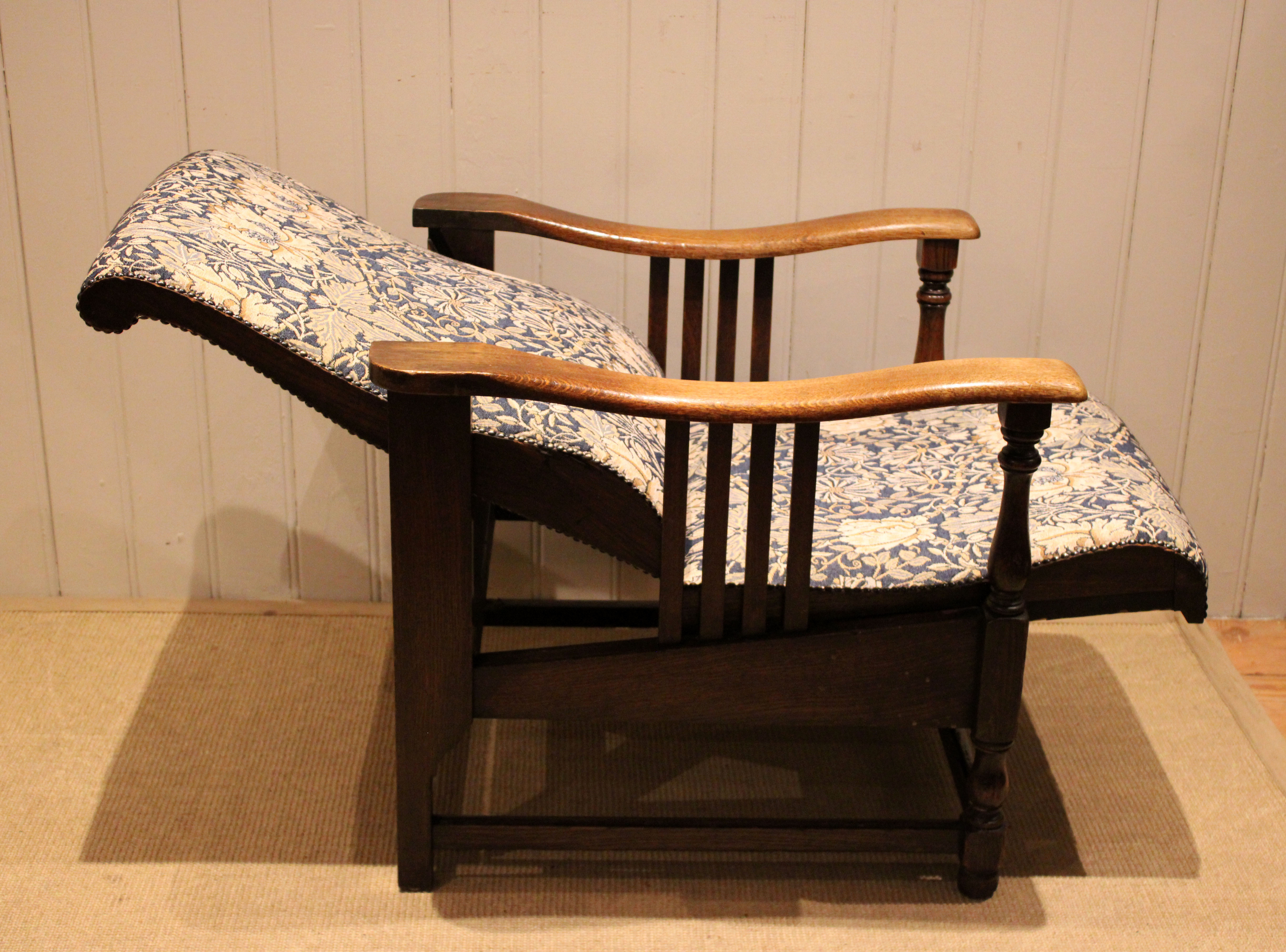 Arts & Crafts oak framed recliner chair, the seat leans back and moves forward to a reclining position , held in place by bodyweight , having a newly upholstered seat and back , with side rails , raised on turned supports , newly reupholstered in a William Morris fabric .
