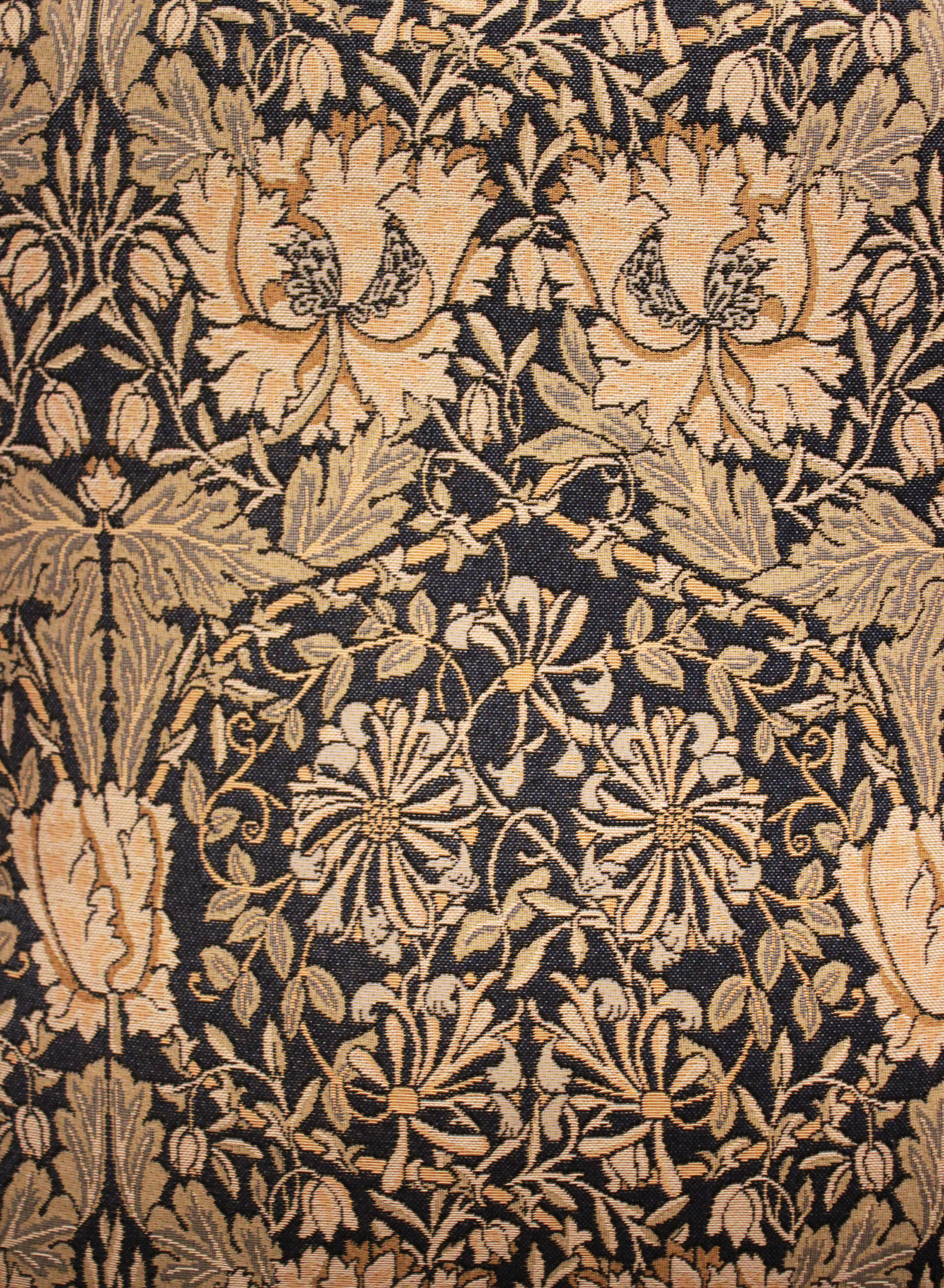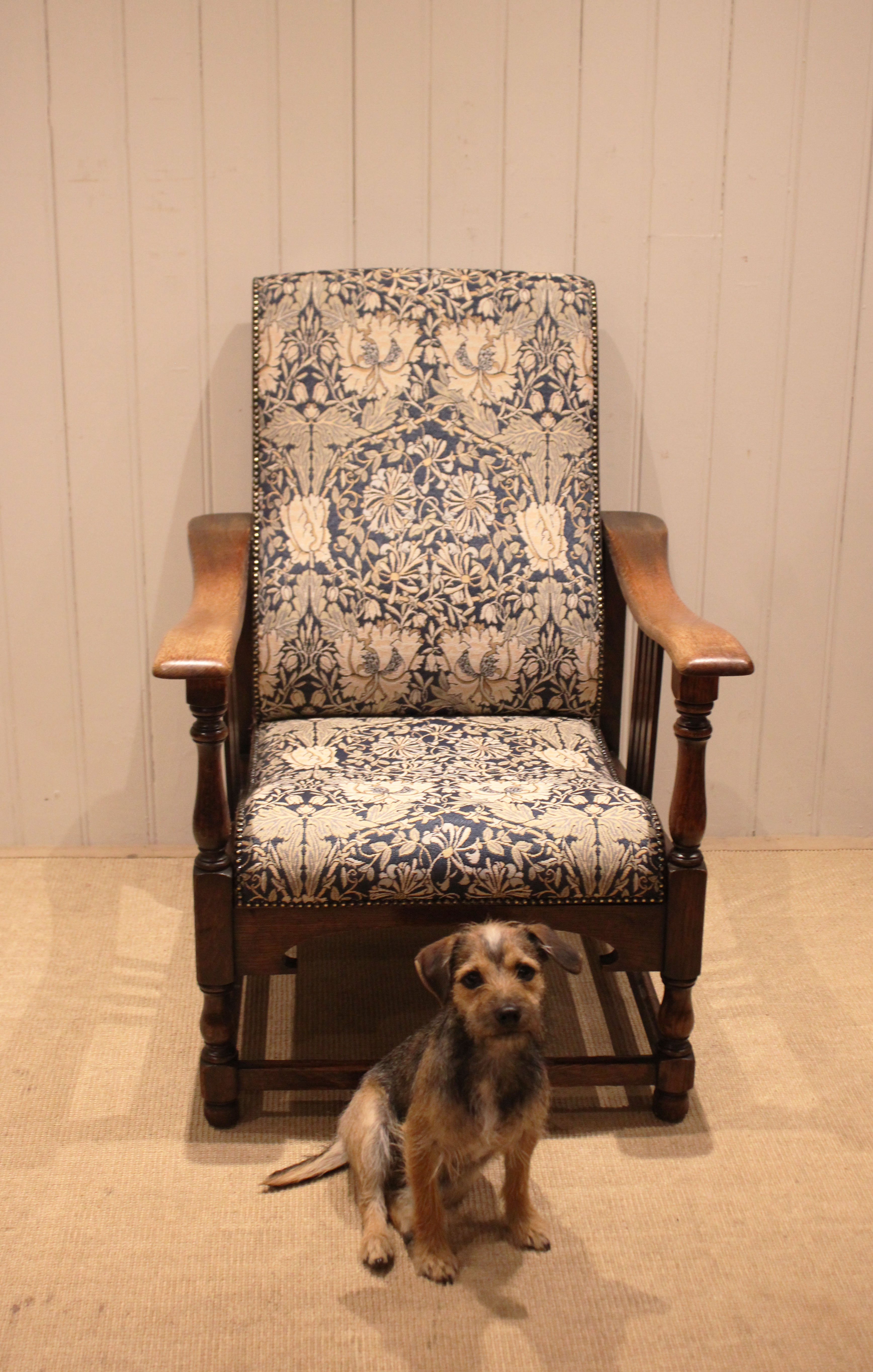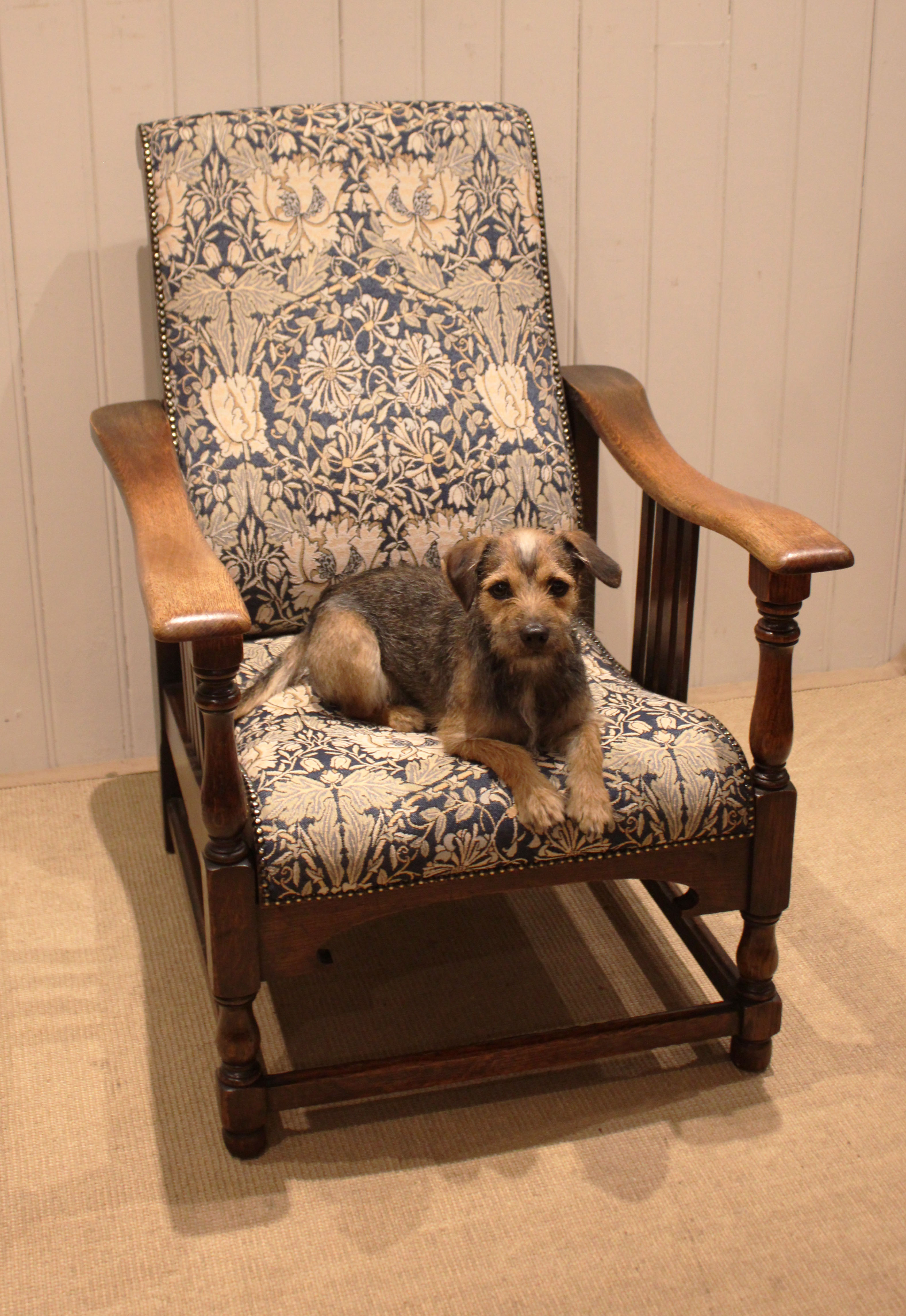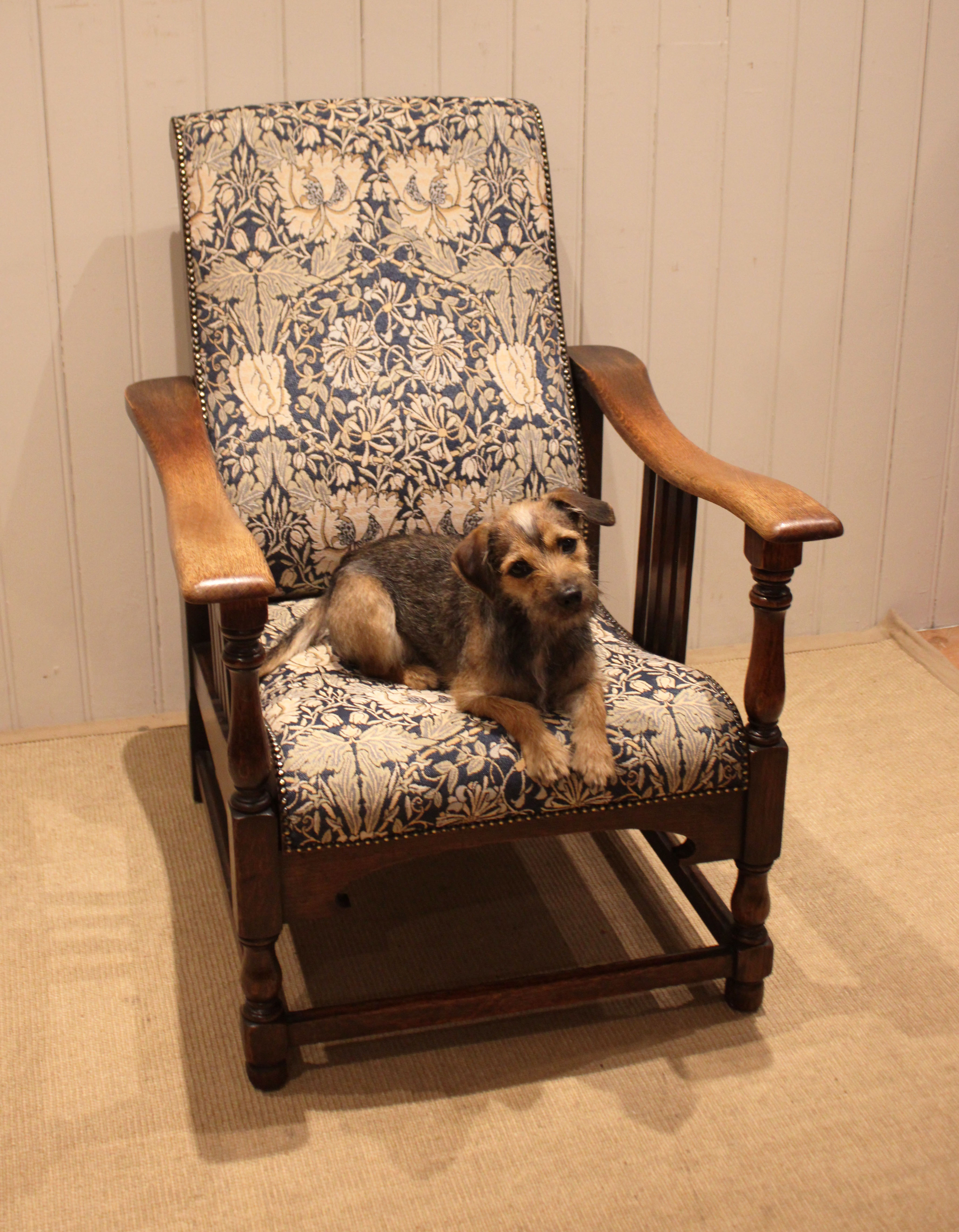Arts & Crafts oak framed recliner chair, the seat leans back and moves forward to a reclining position , held in place by bodyweight , having a newly upholstered seat and back , with side rails , raised on turned supports , newly reupholstered in a William Morris fabric .