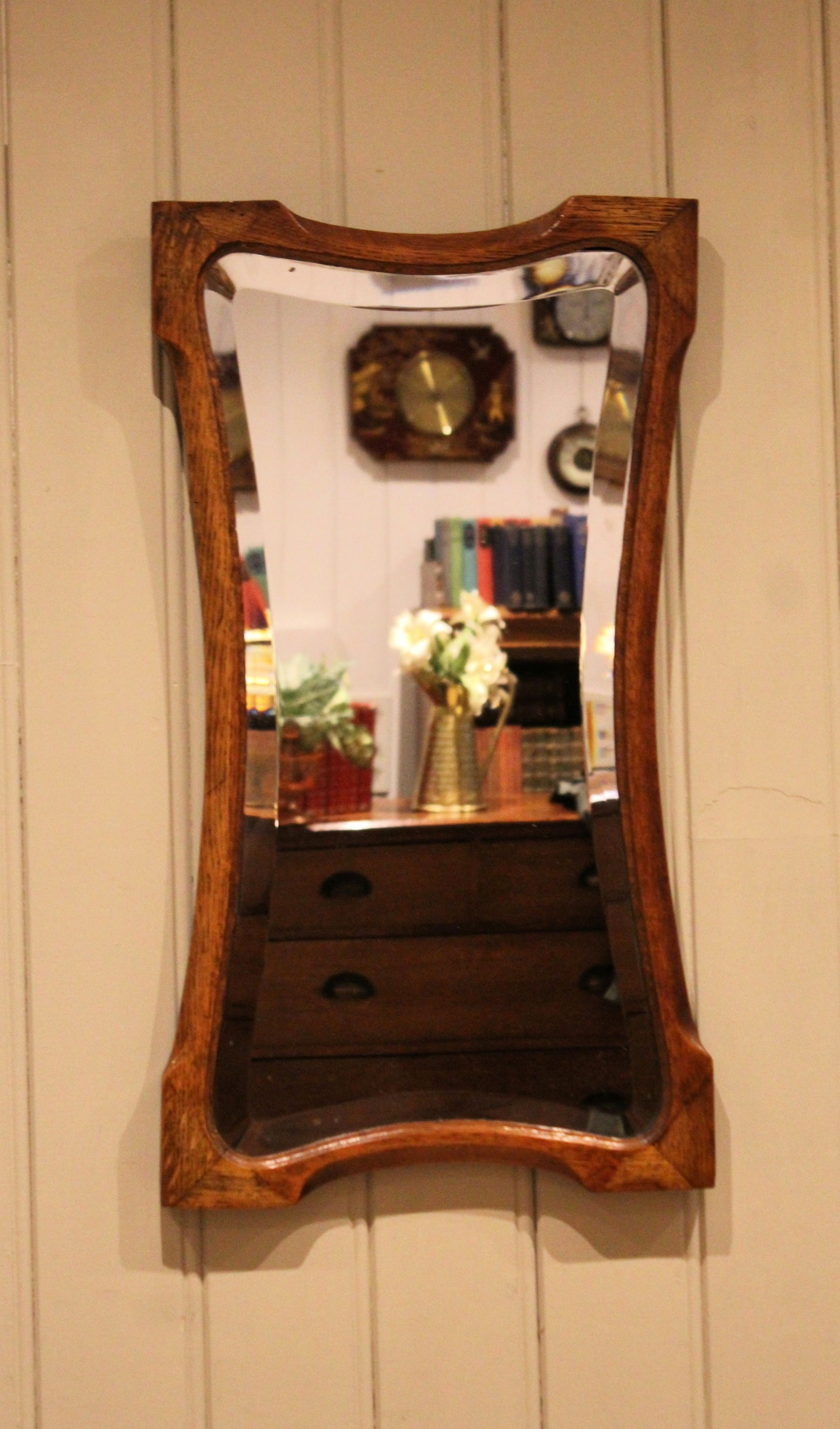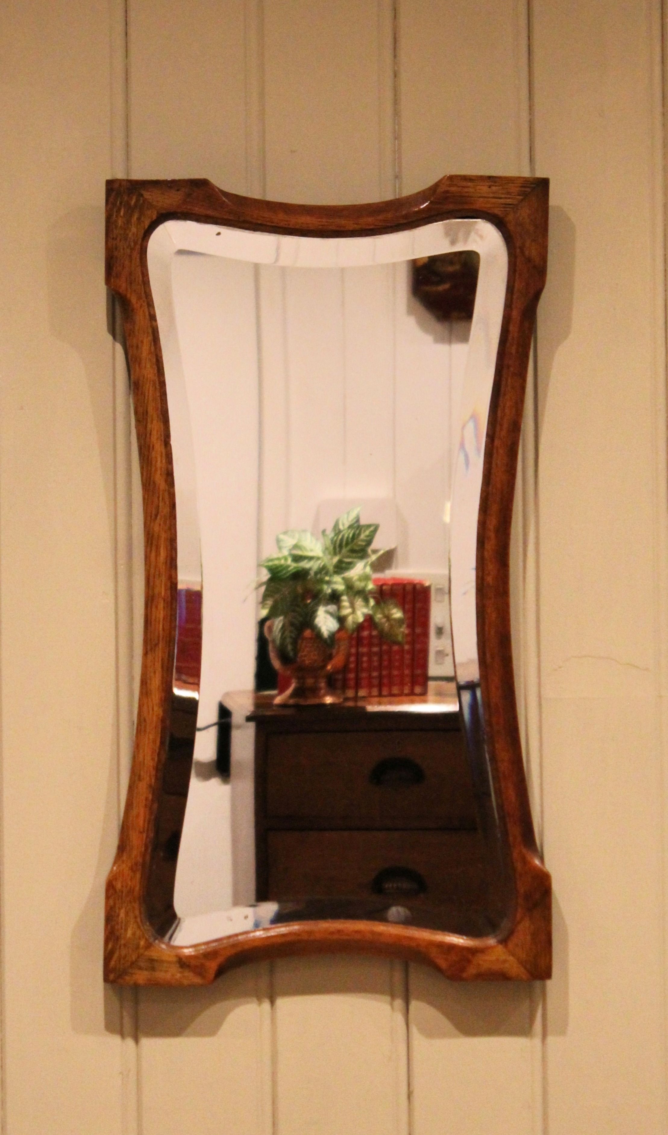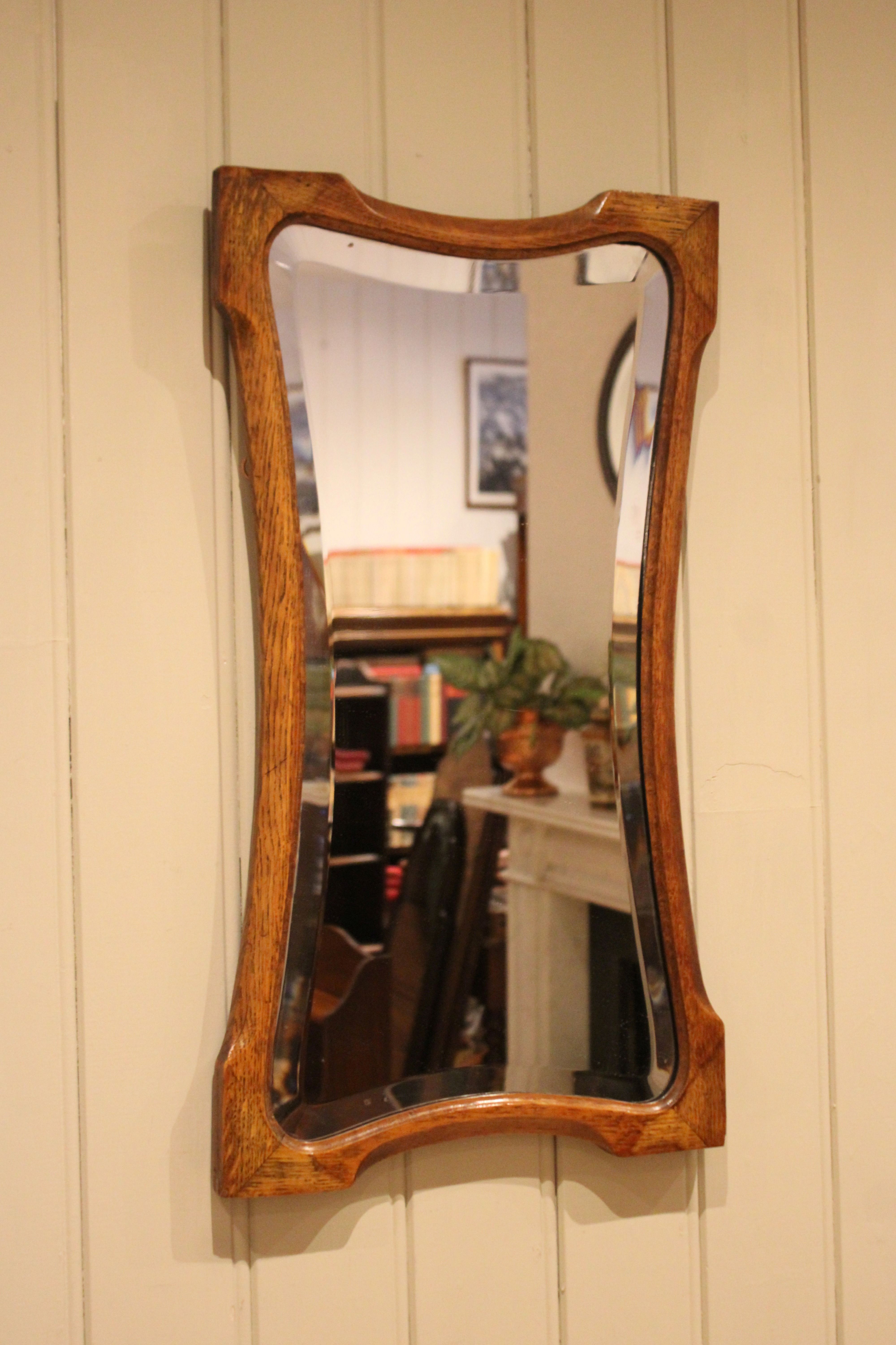 Oak Arts & Crafts style wall mirror having a shaped oak frame with an inset bevel edge mirror.