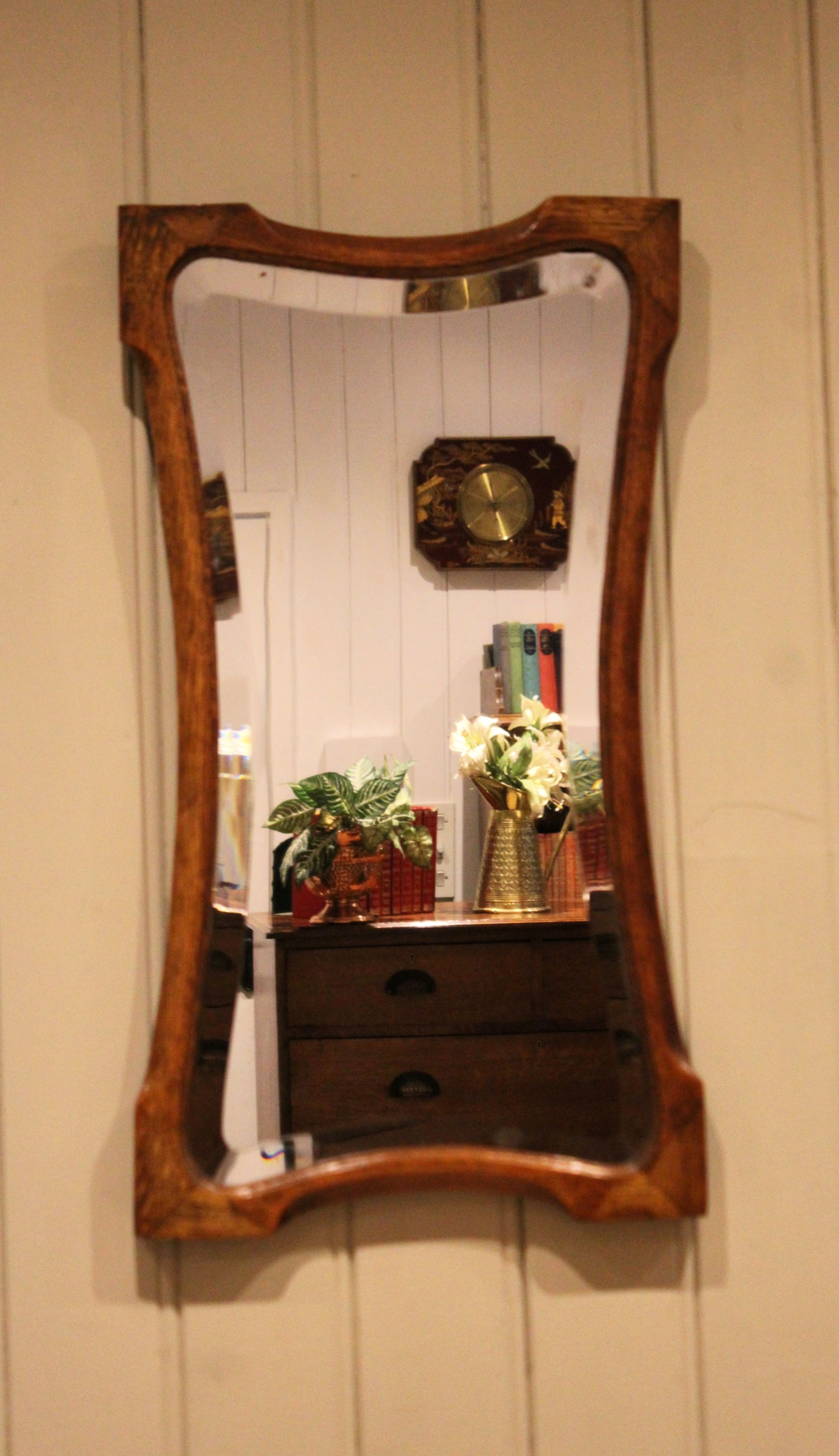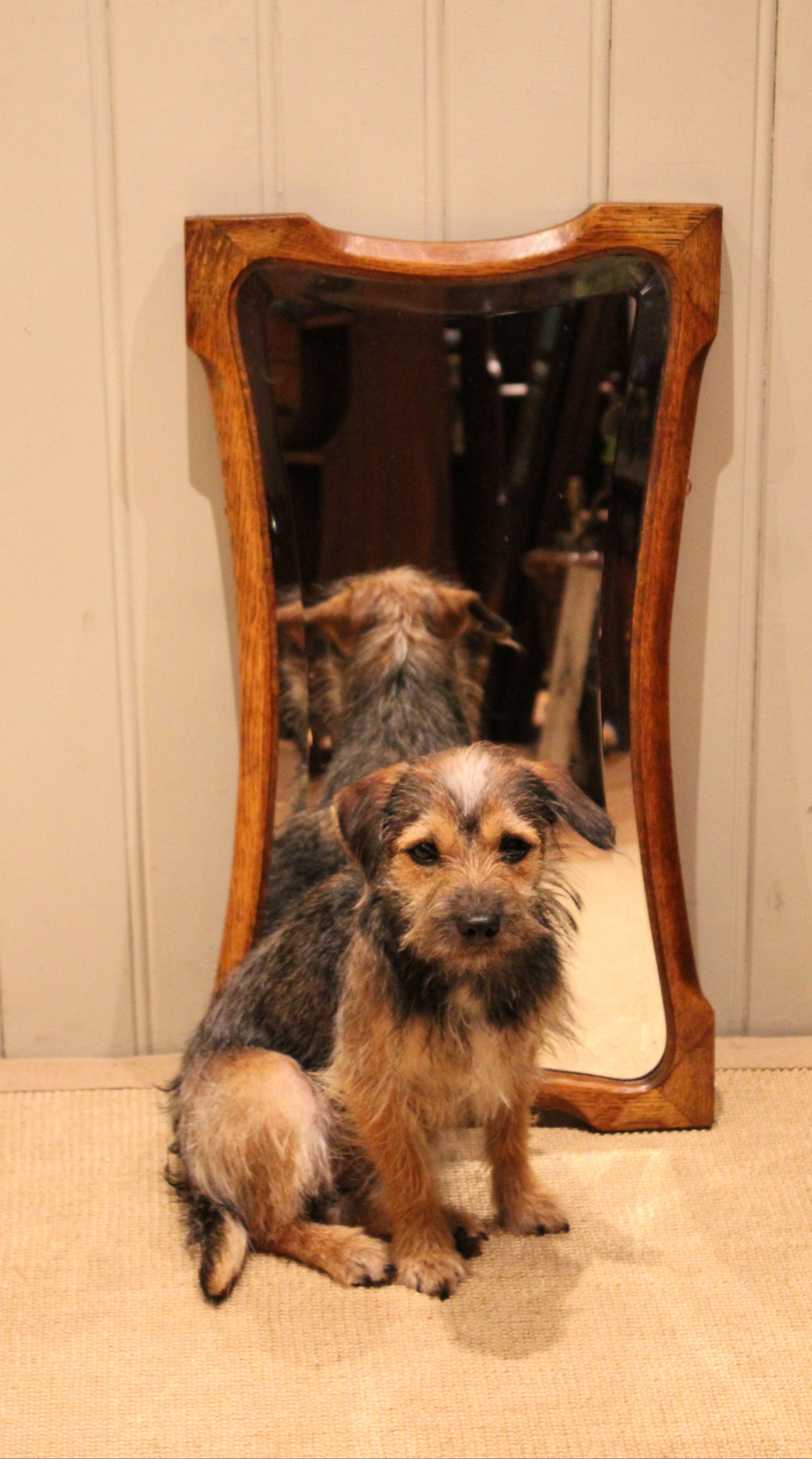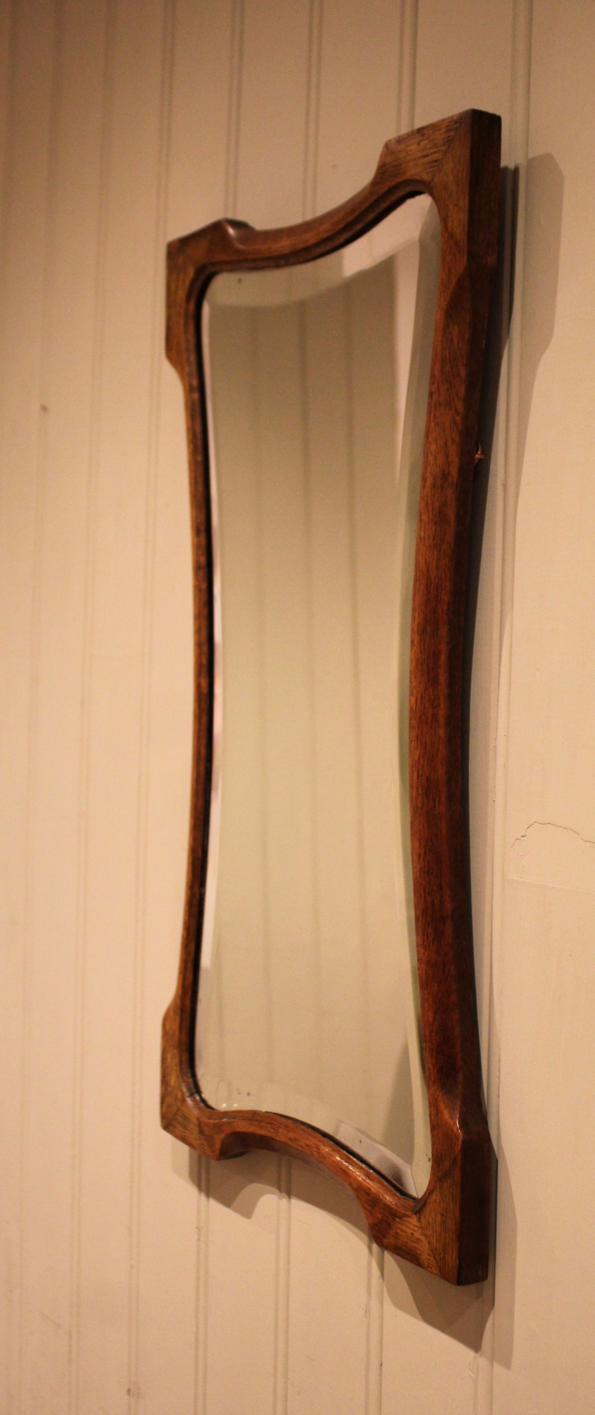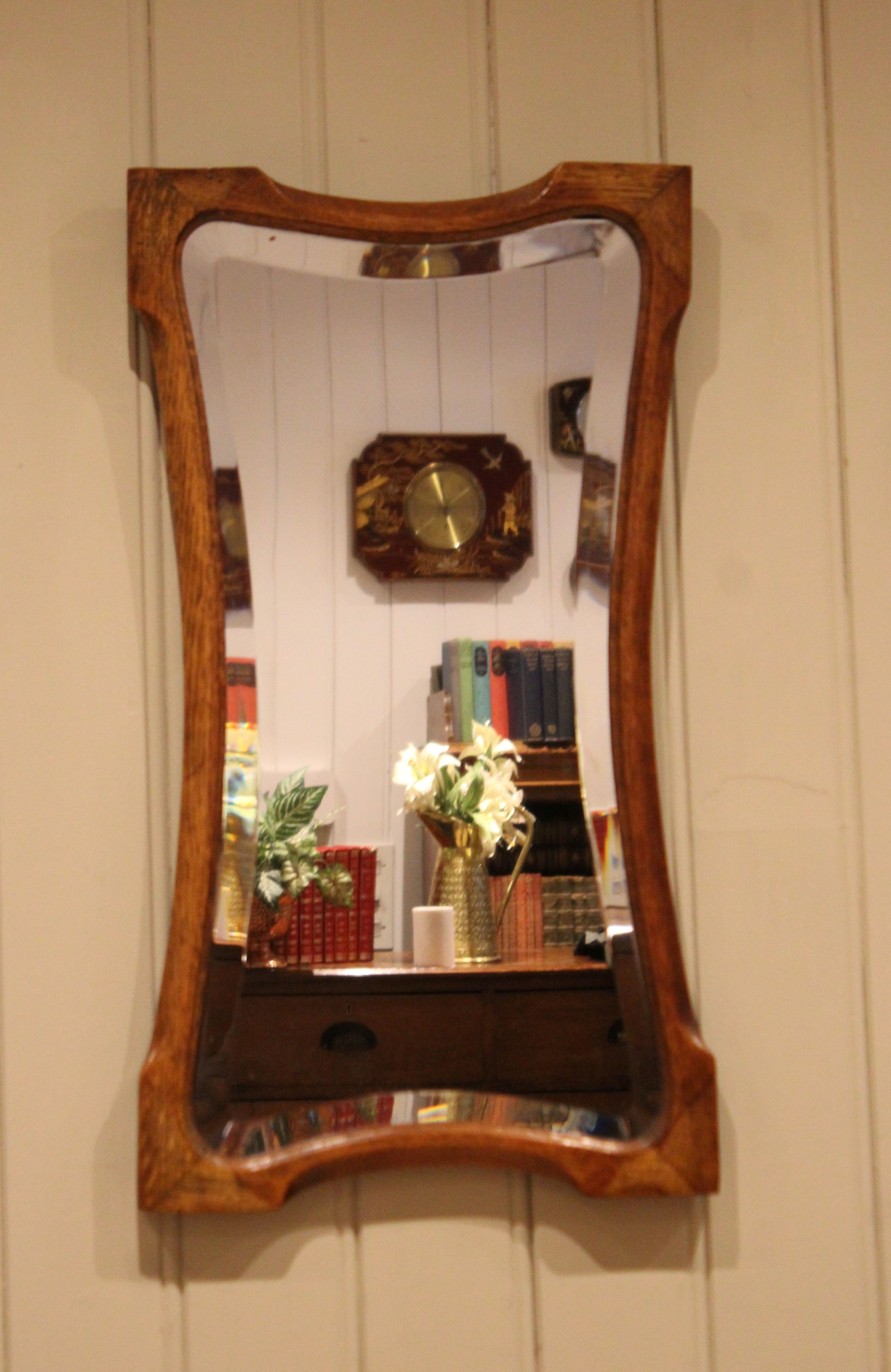 Oak Arts & Crafts style wall mirror having a shaped oak frame with an inset bevel edge mirror.