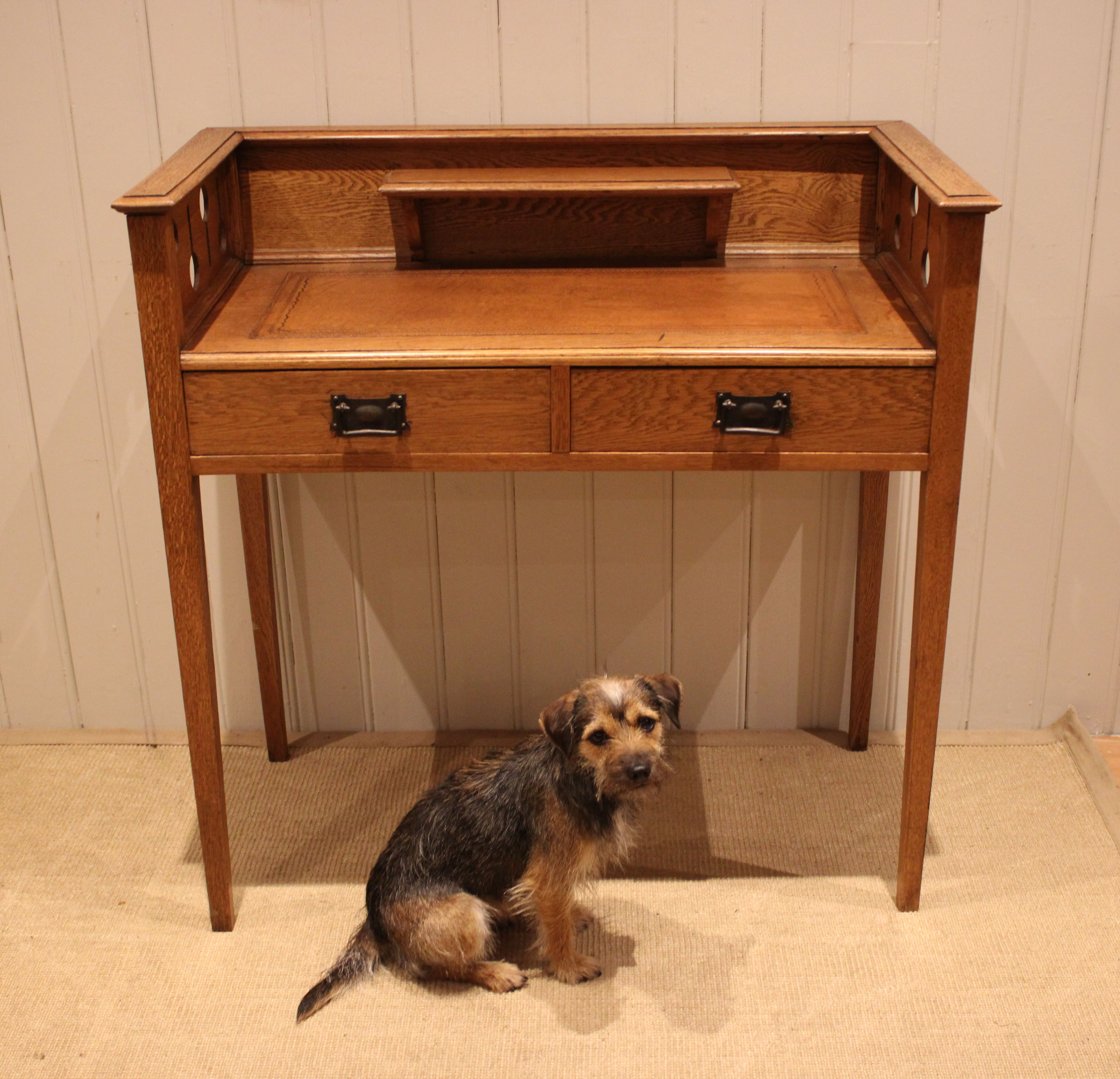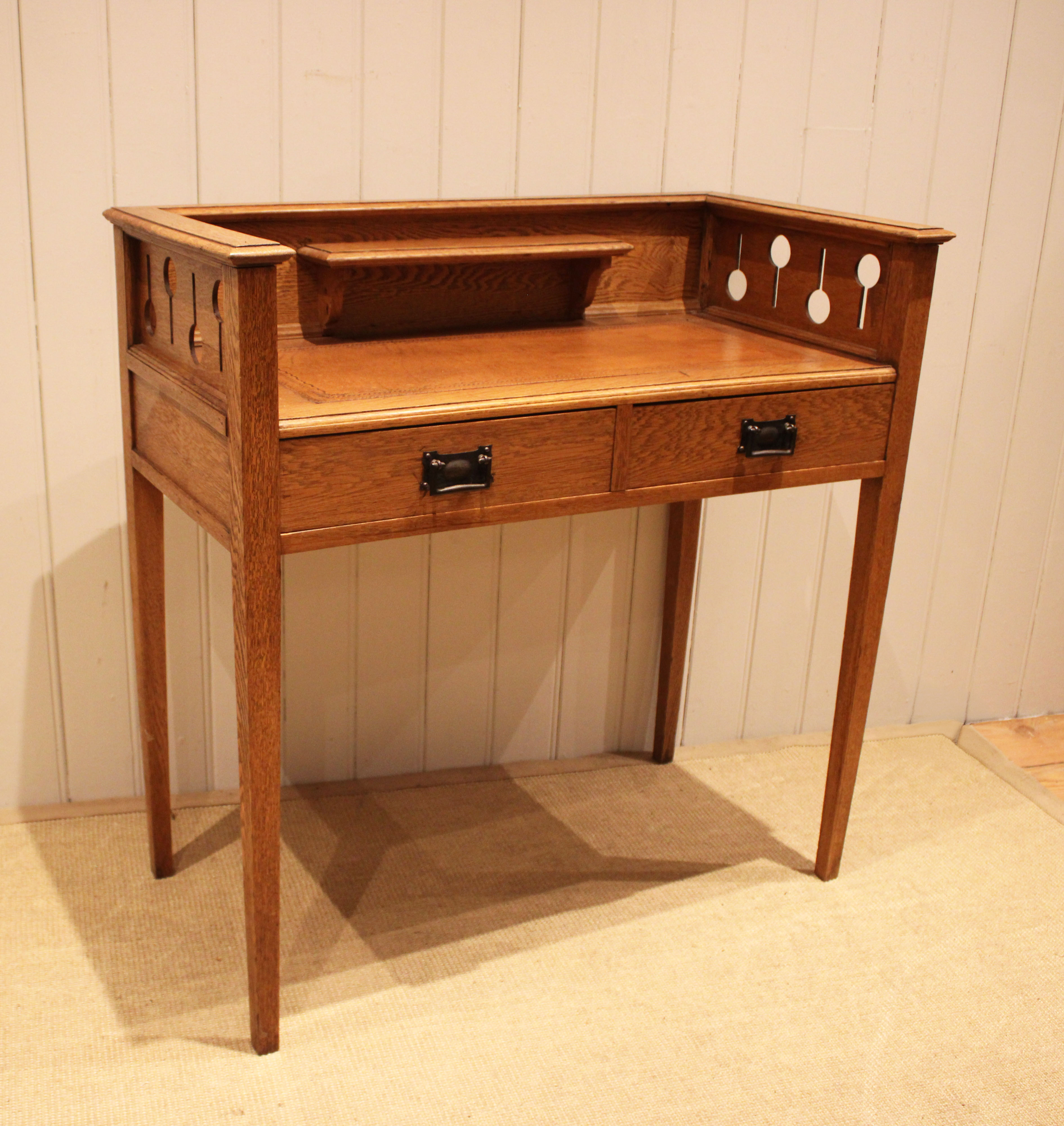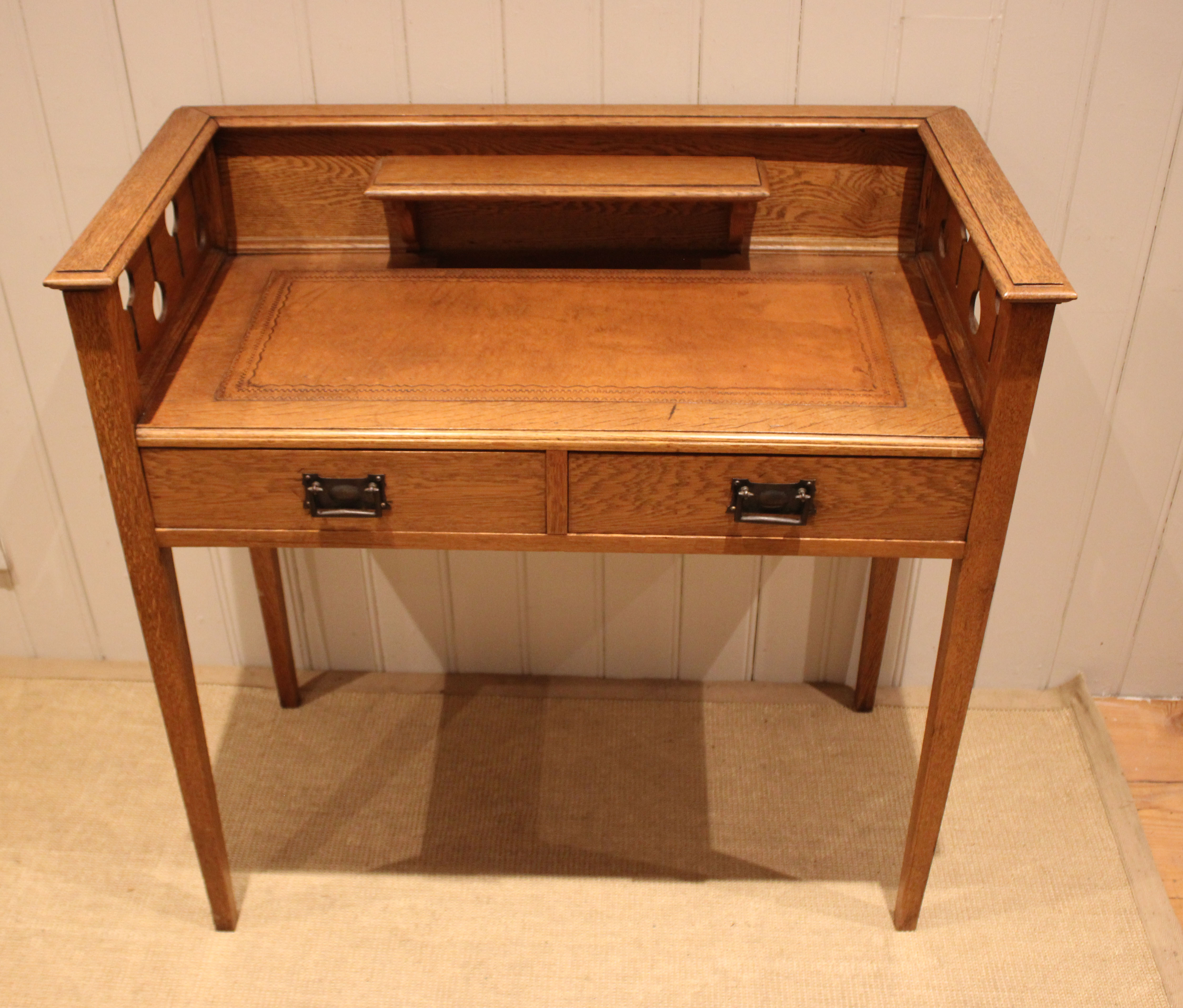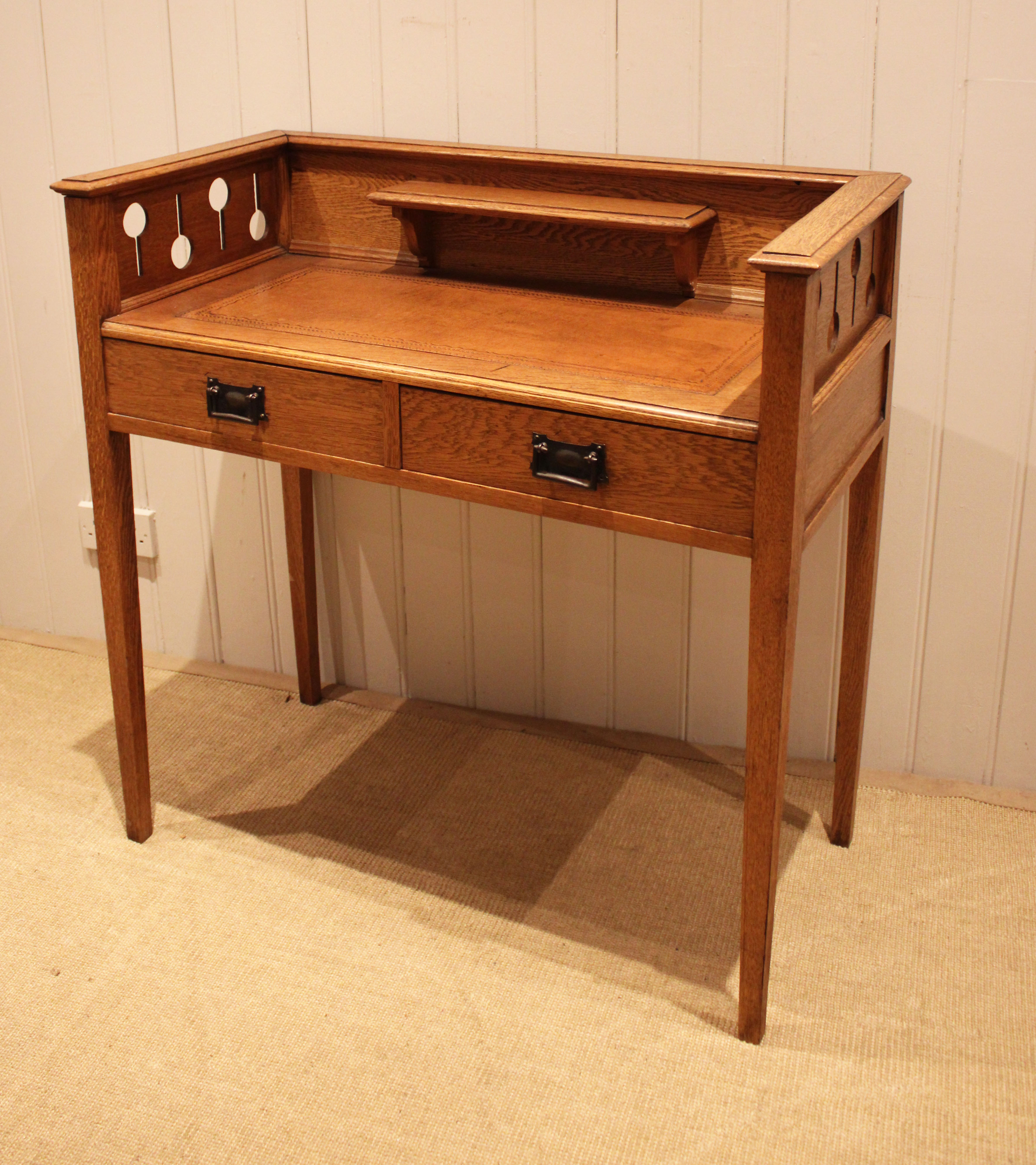 Oak Arts & Crafts writing desk having an inset leather top , with a shelf to the back and a pierced gallery ,above two drawers with decorative handles , raised on straight tapering legs . The height to the under tier is 61 cm .