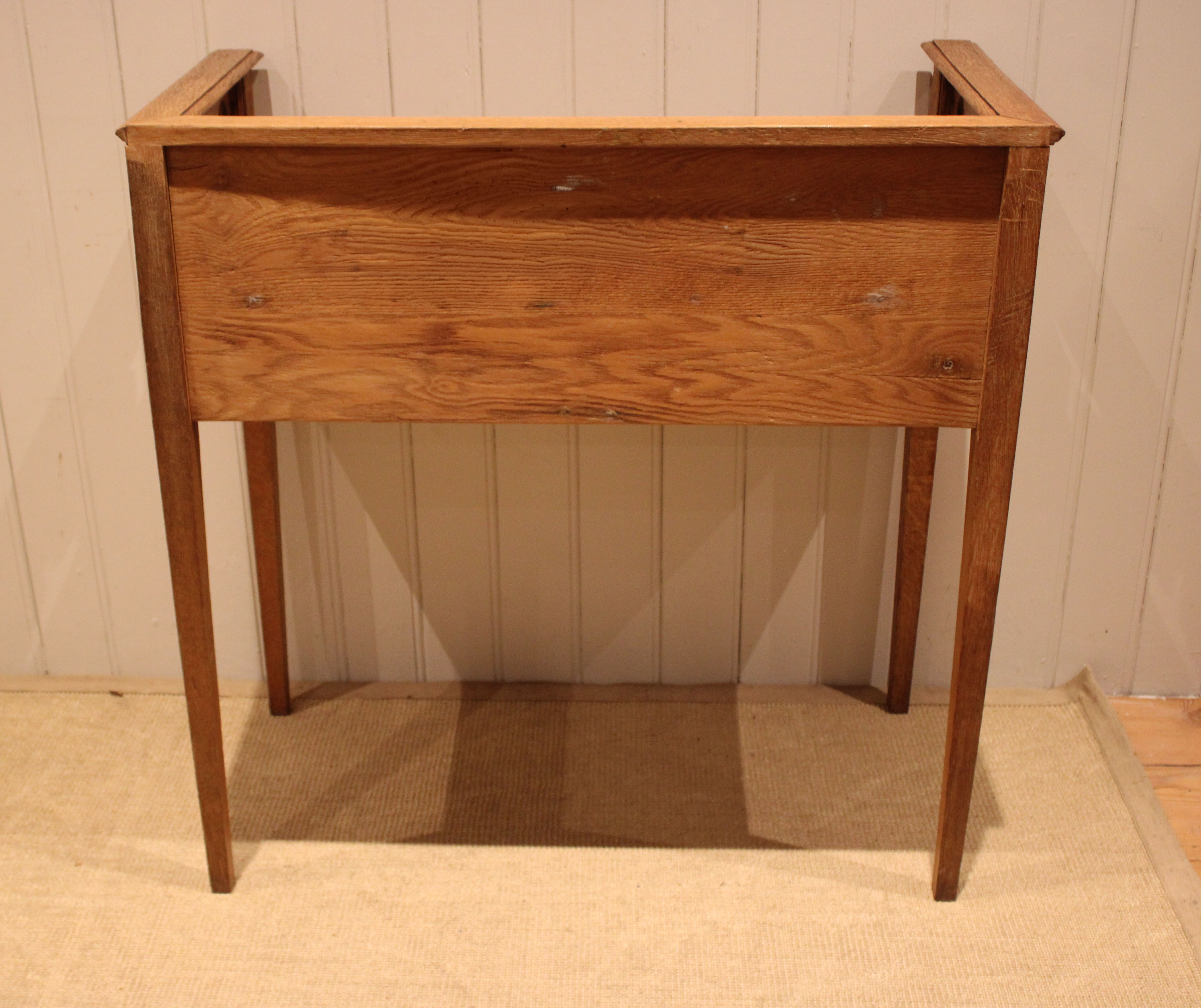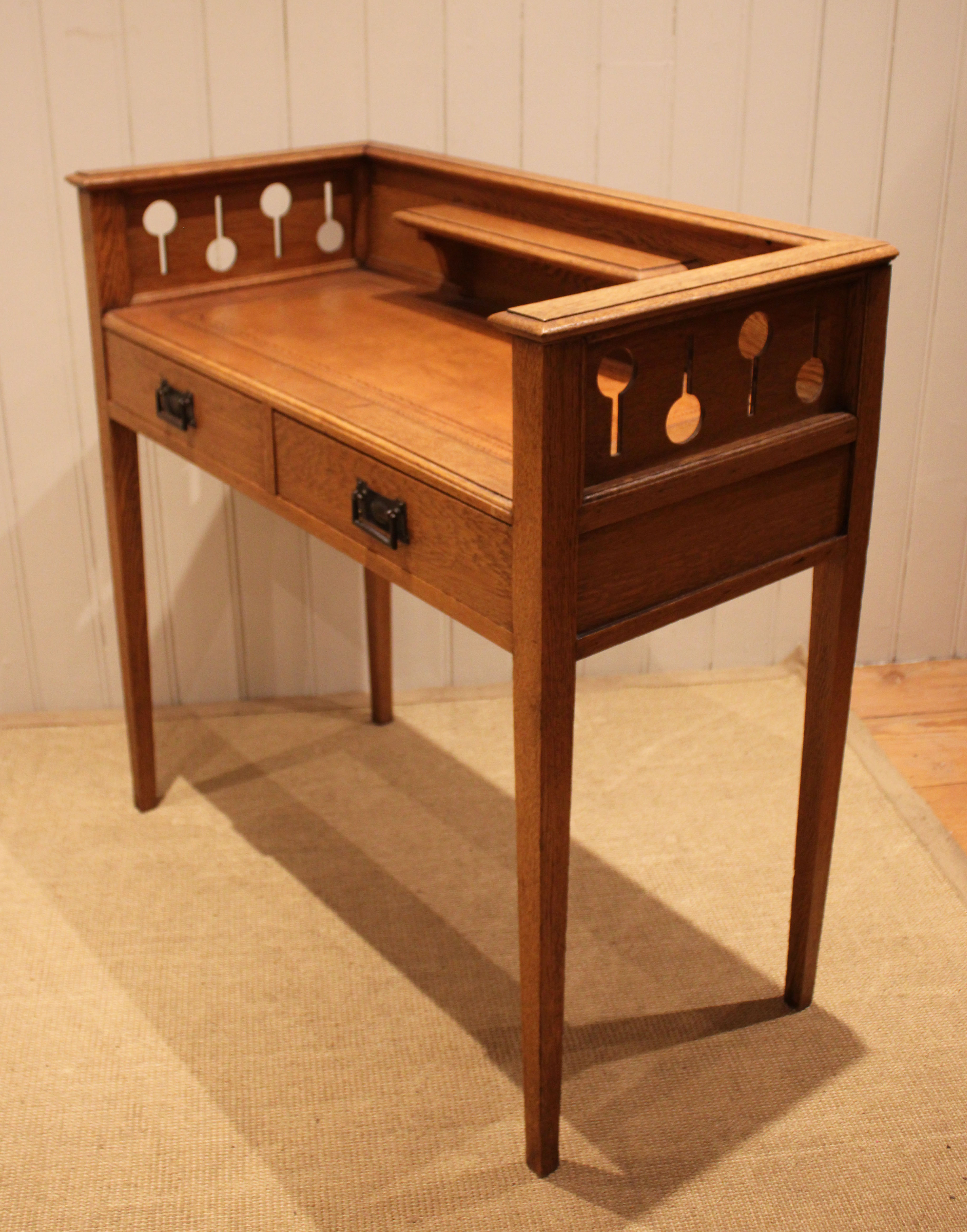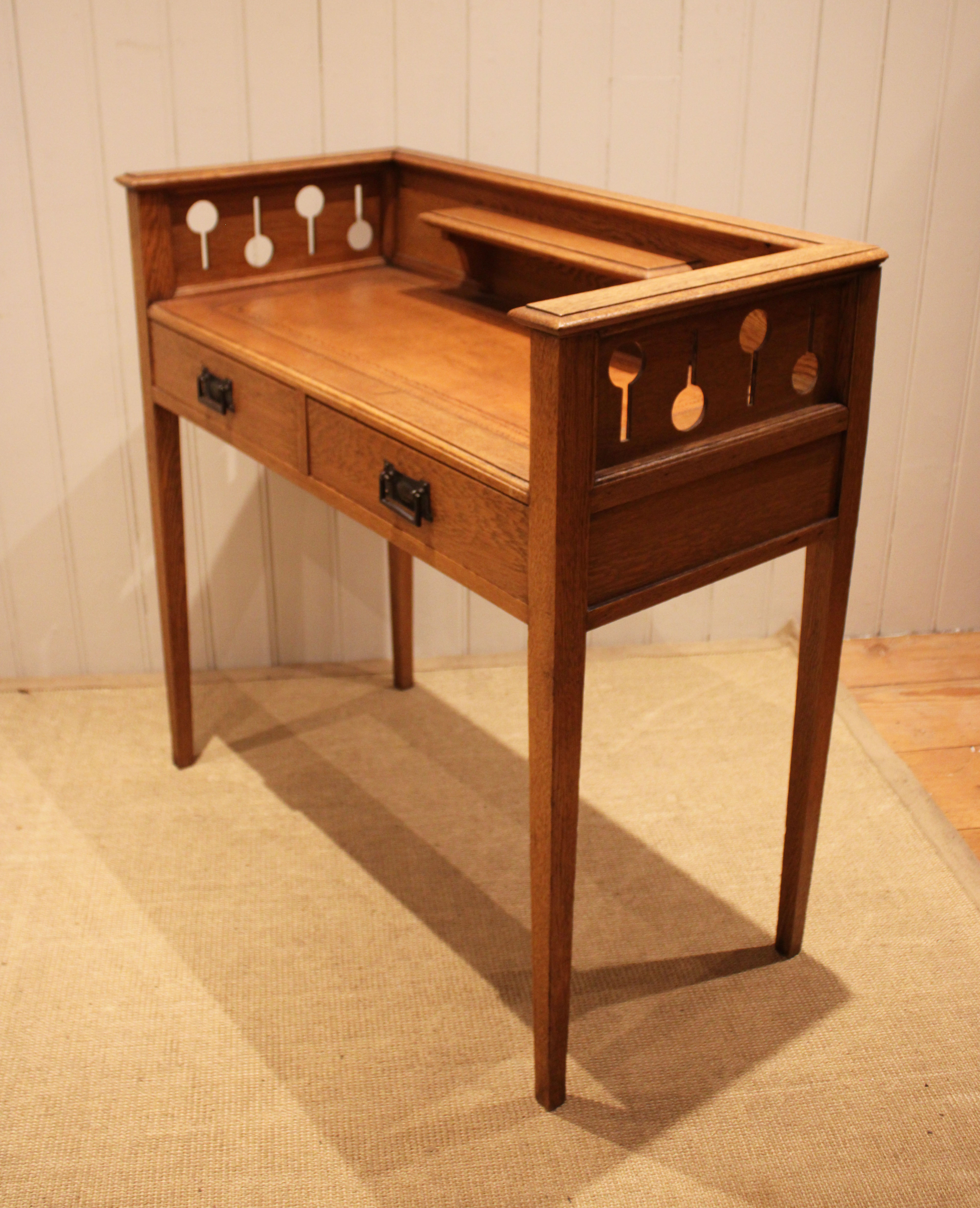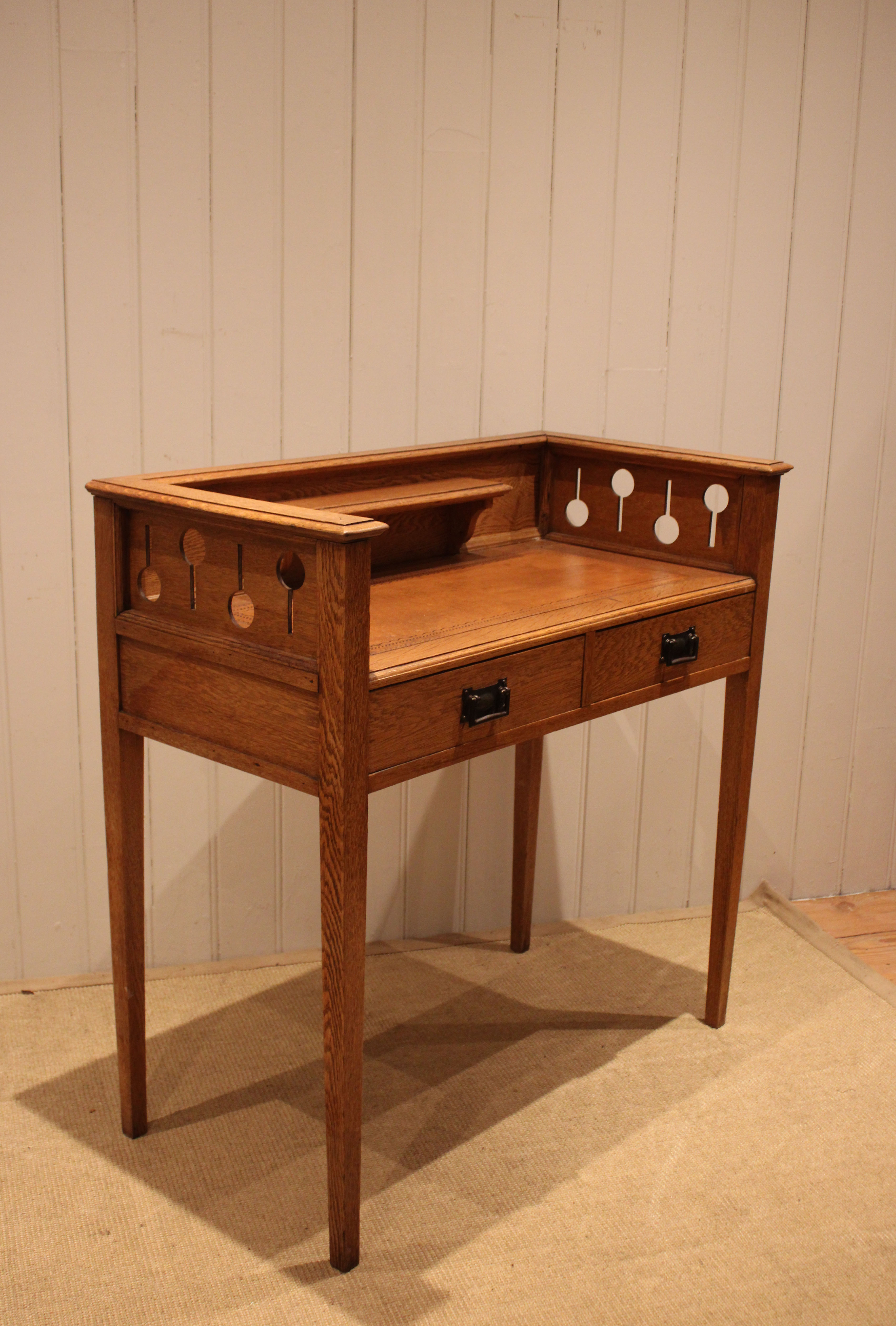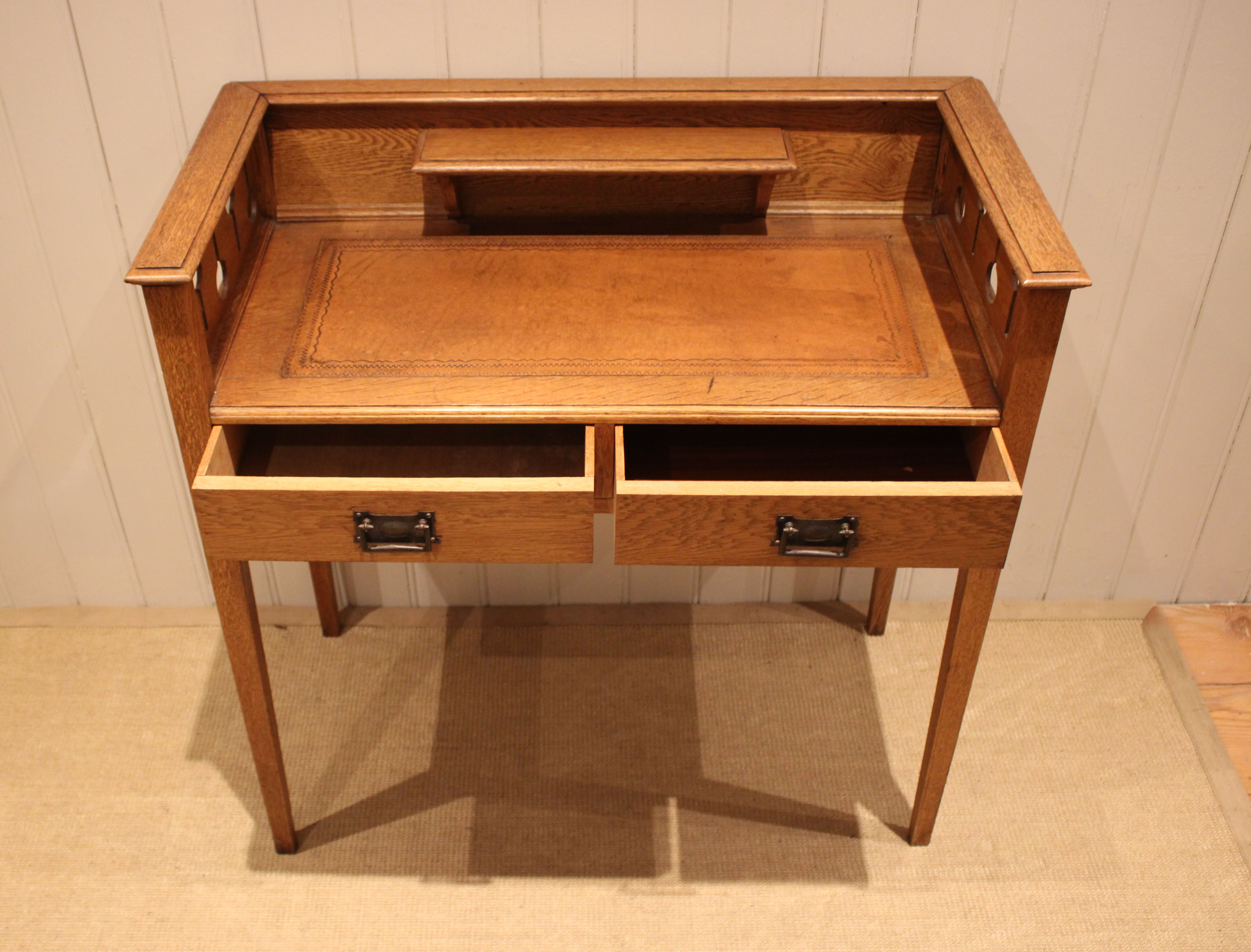 Oak Arts & Crafts writing desk having an inset leather top , with a shelf to the back and a pierced gallery ,above two drawers with decorative handles , raised on straight tapering legs . The height to the under tier is 61 cm .
