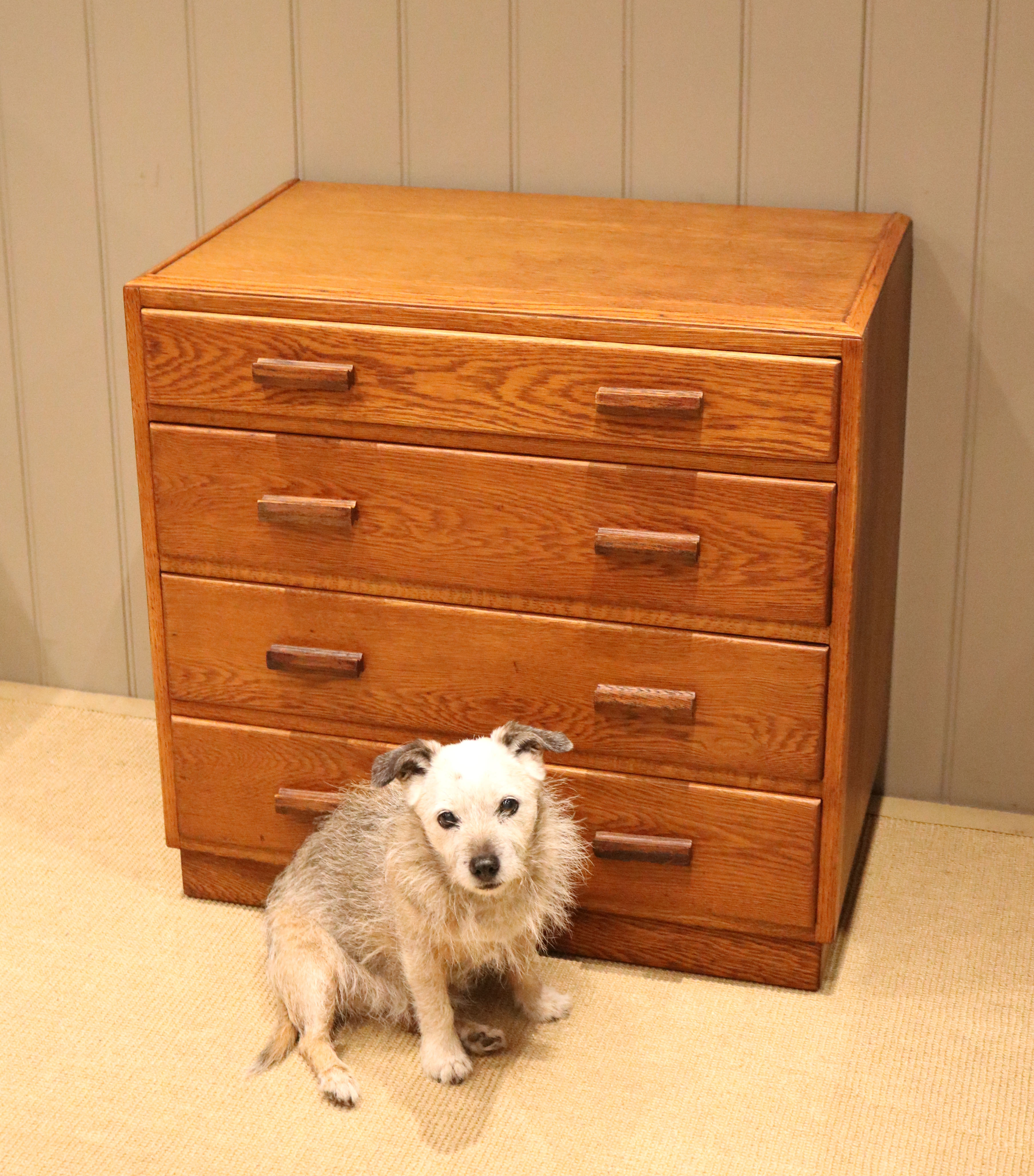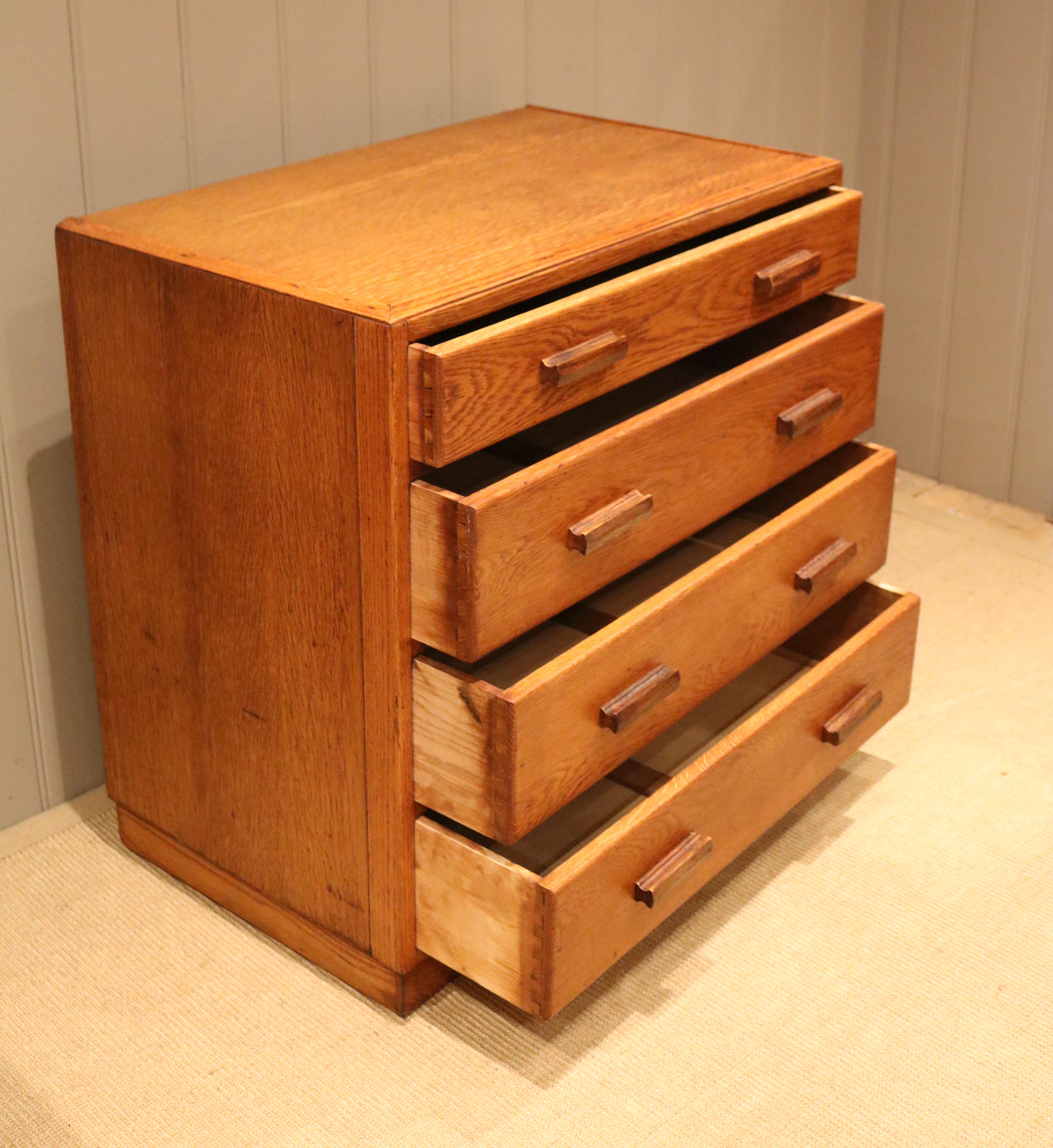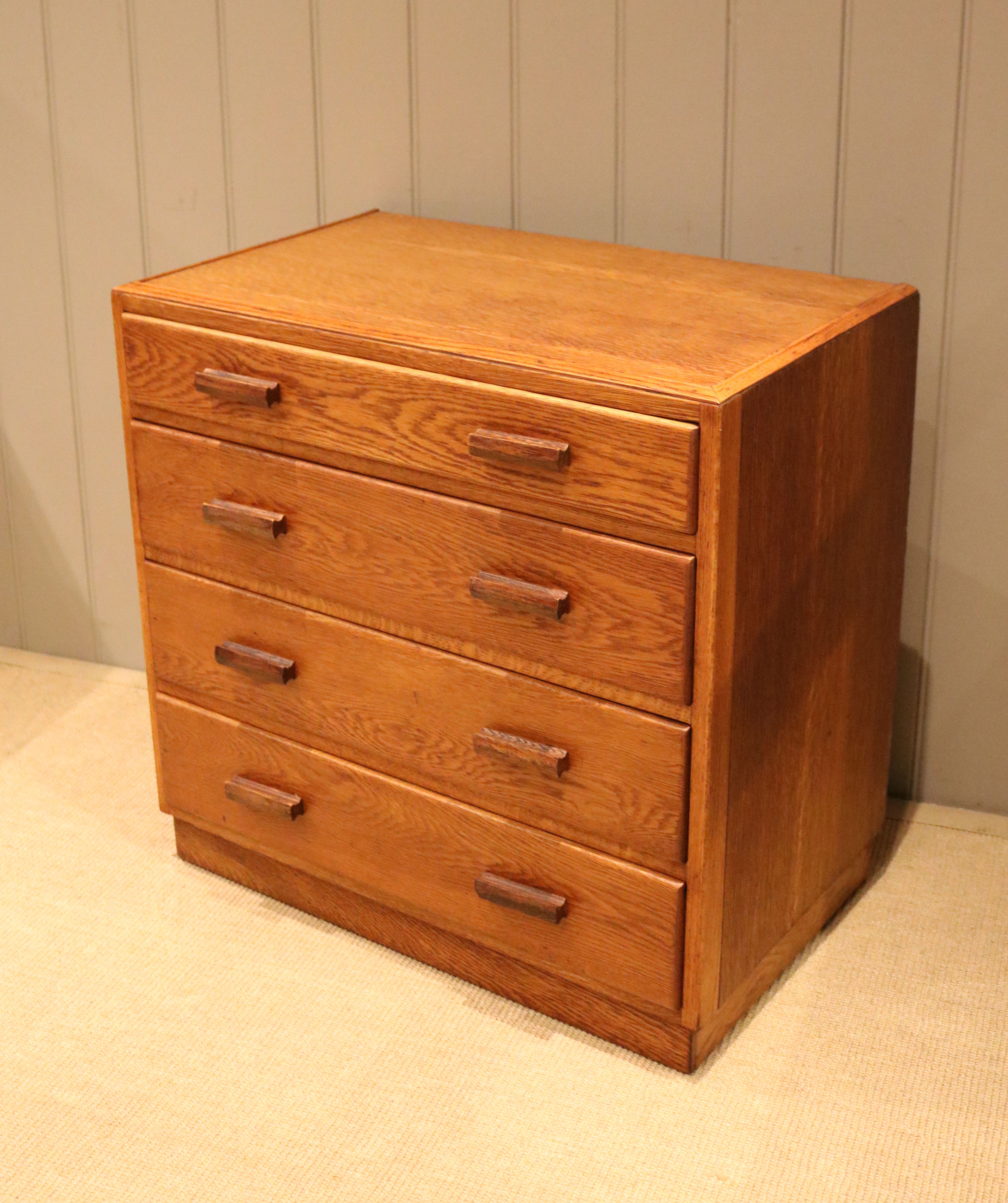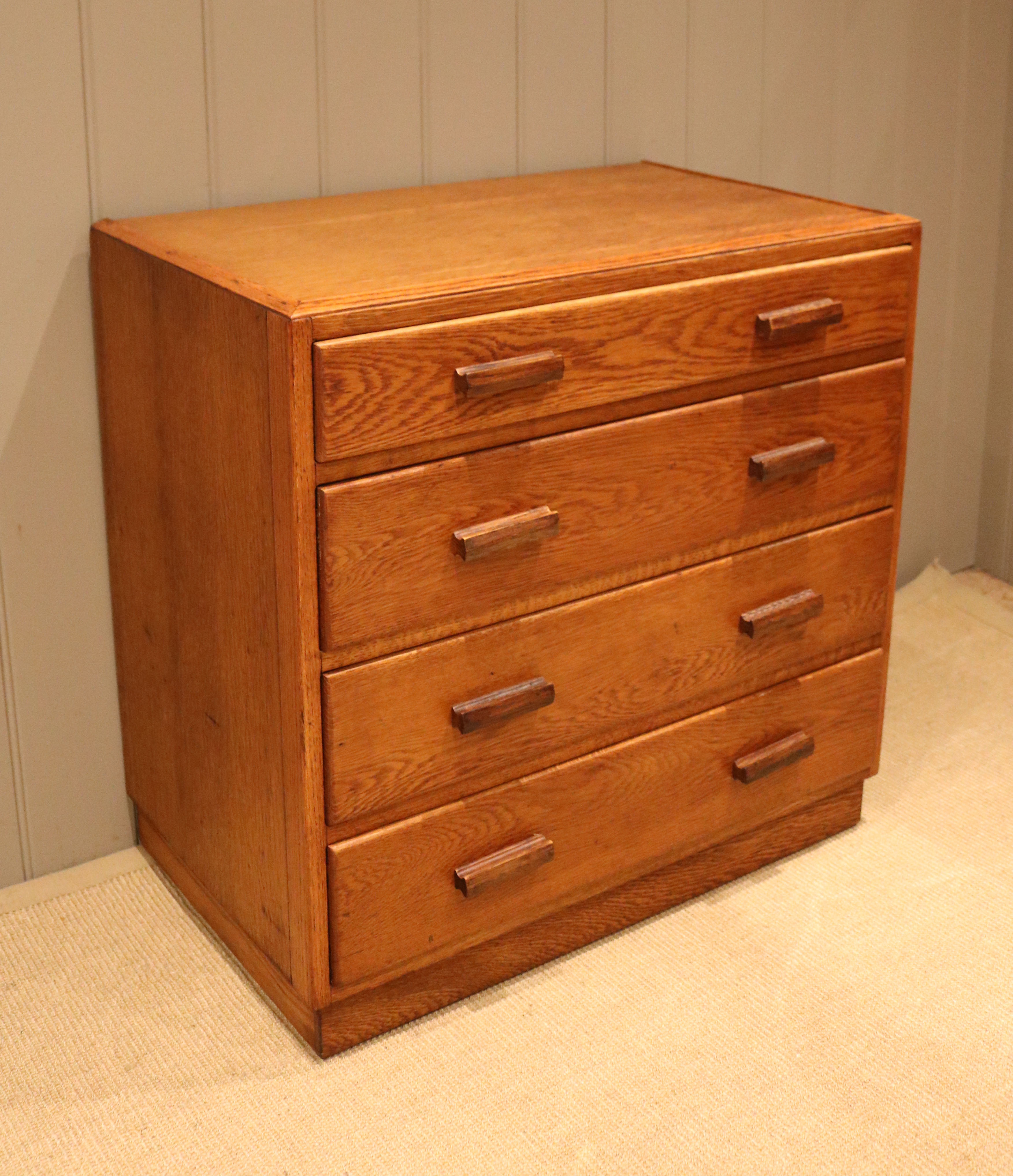 Oak chest of four graduated drawers with wooden handles , raised on a plinth base . Bears the manufacturers mark for Nicolls & Janes High Wycombe