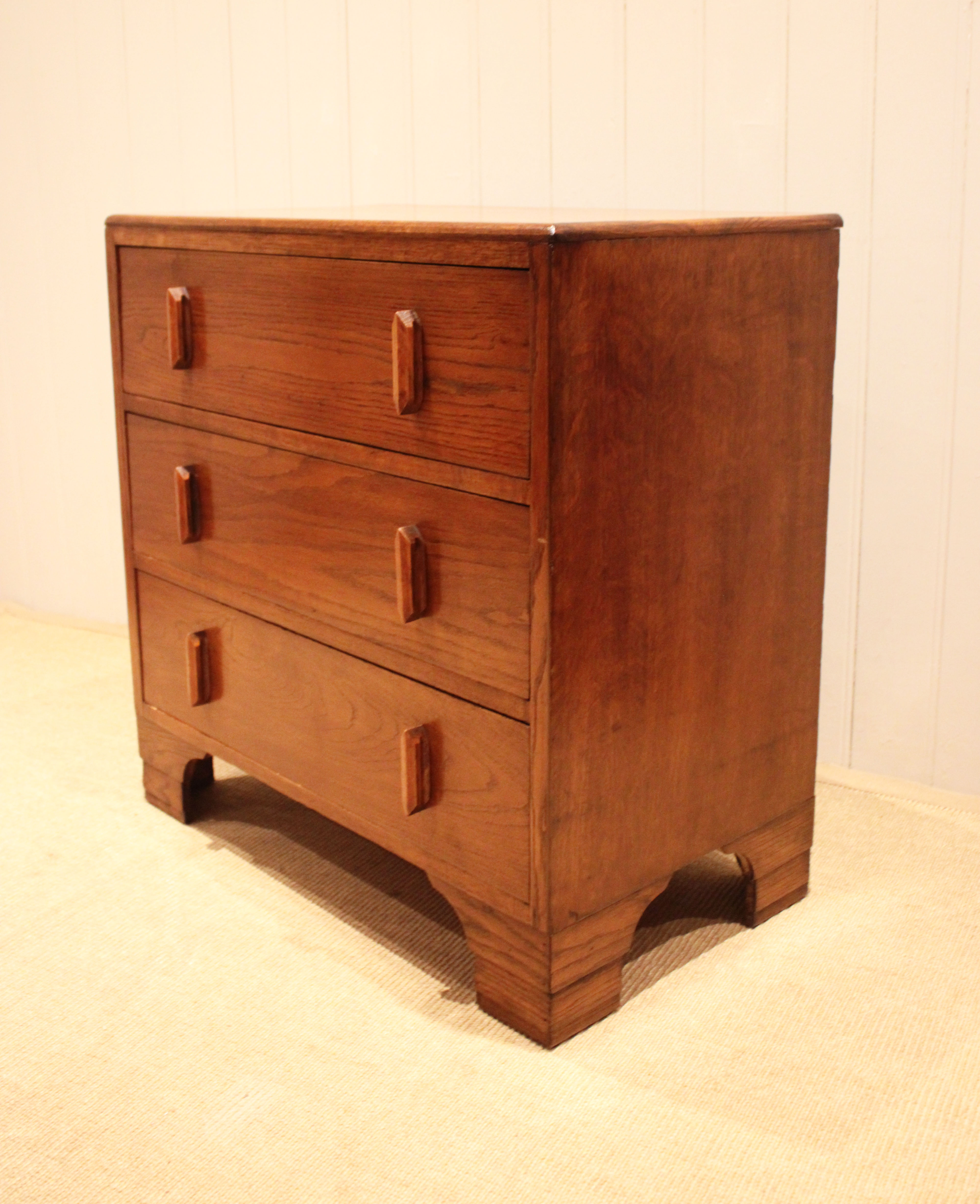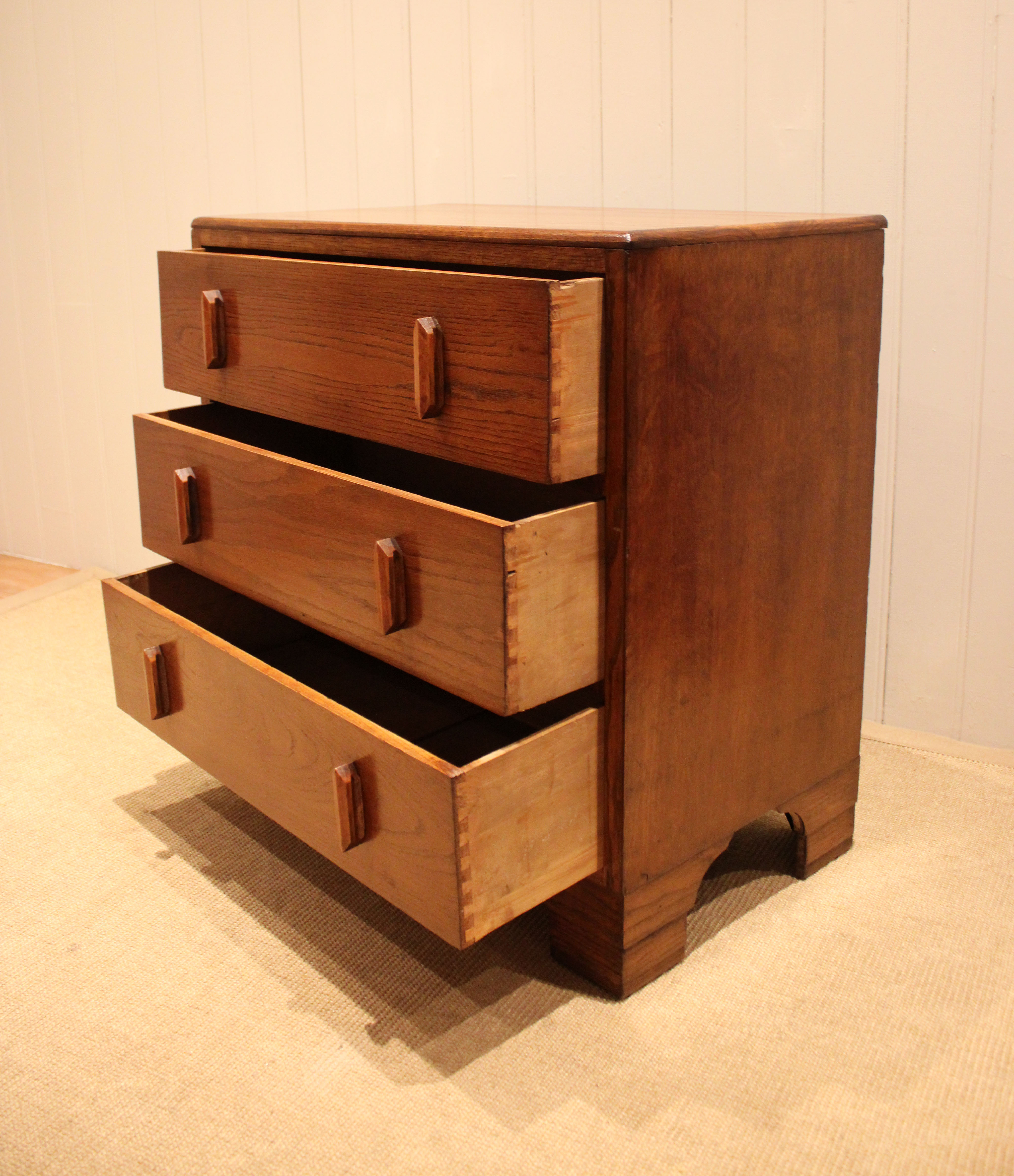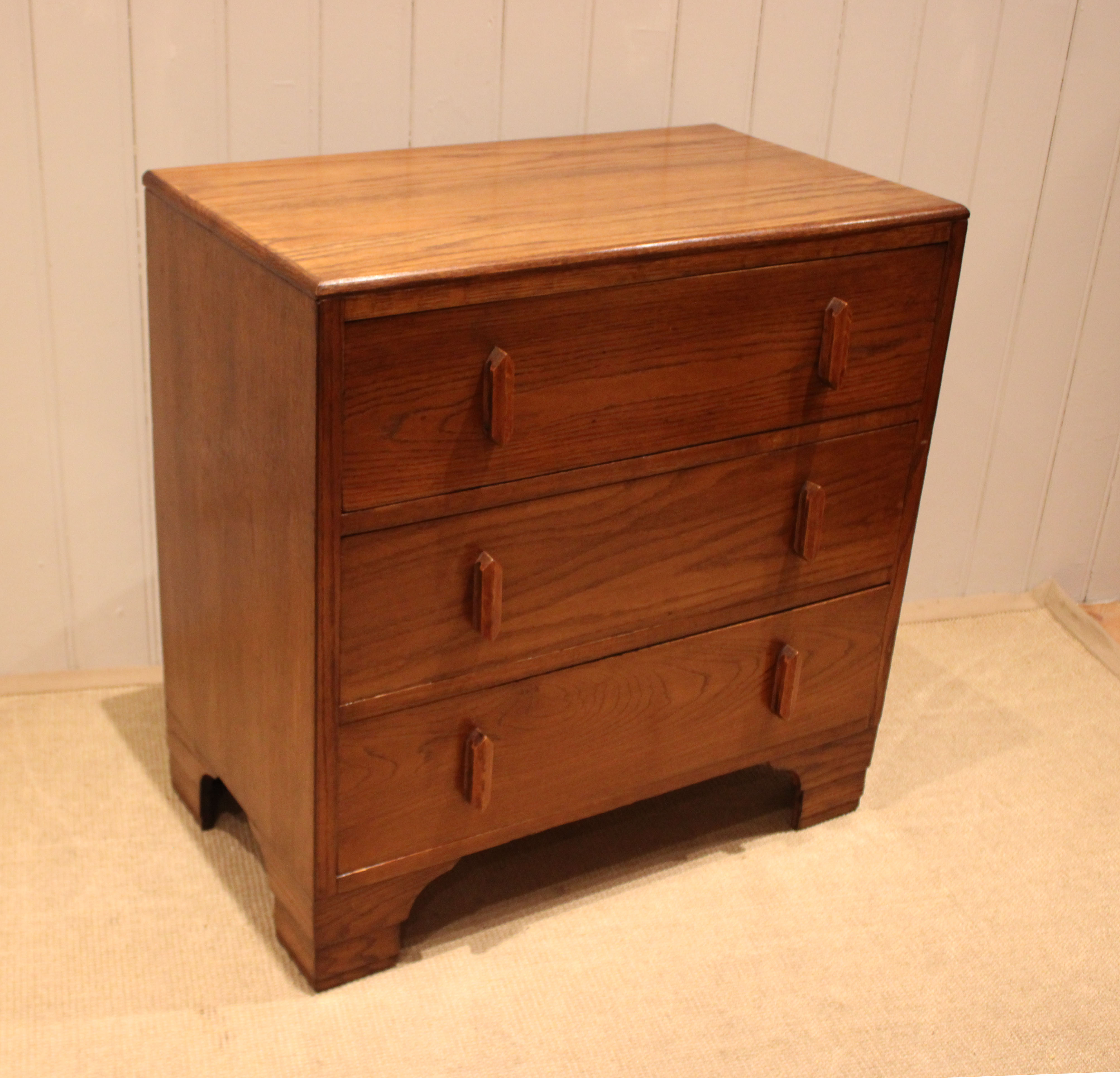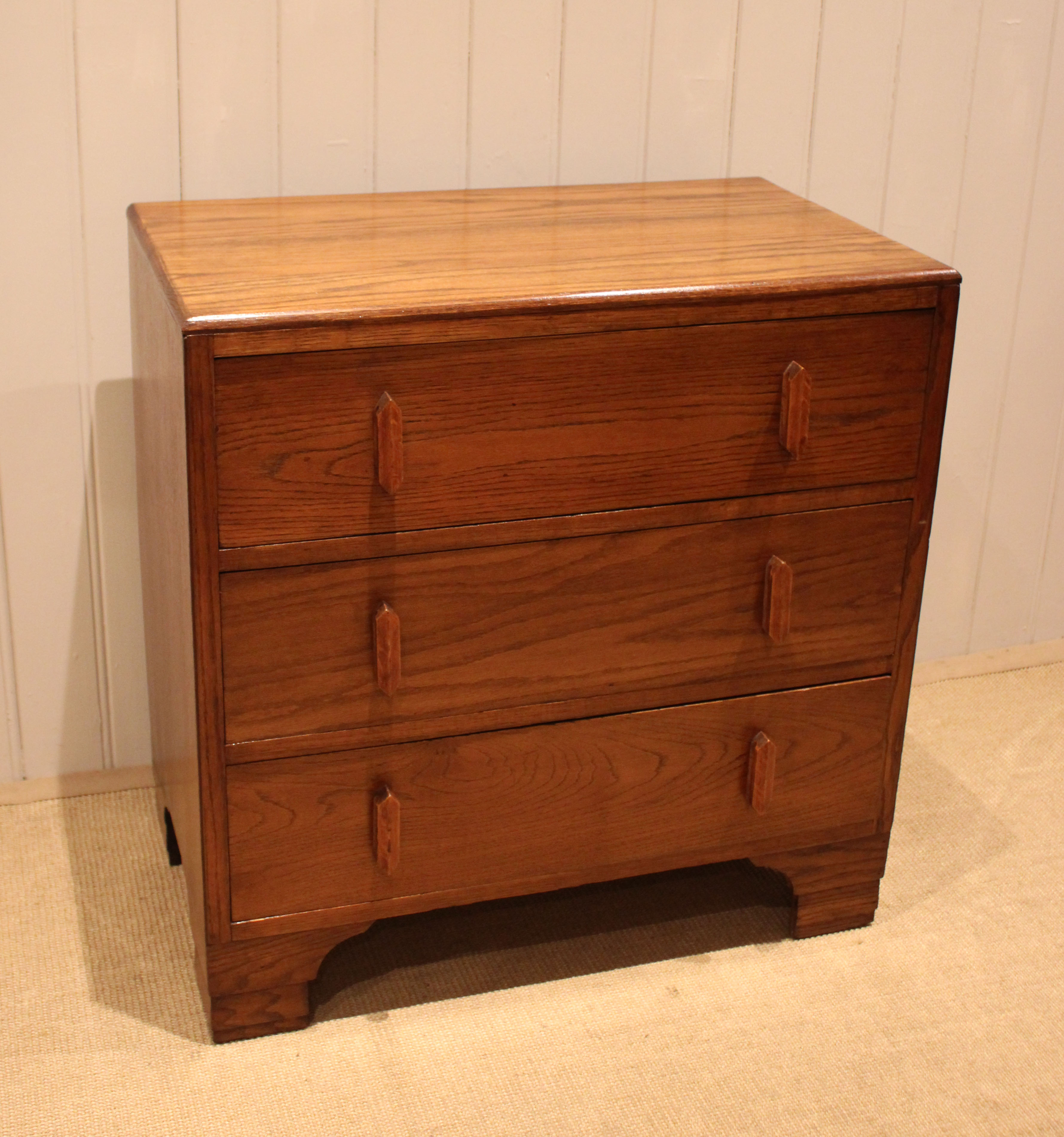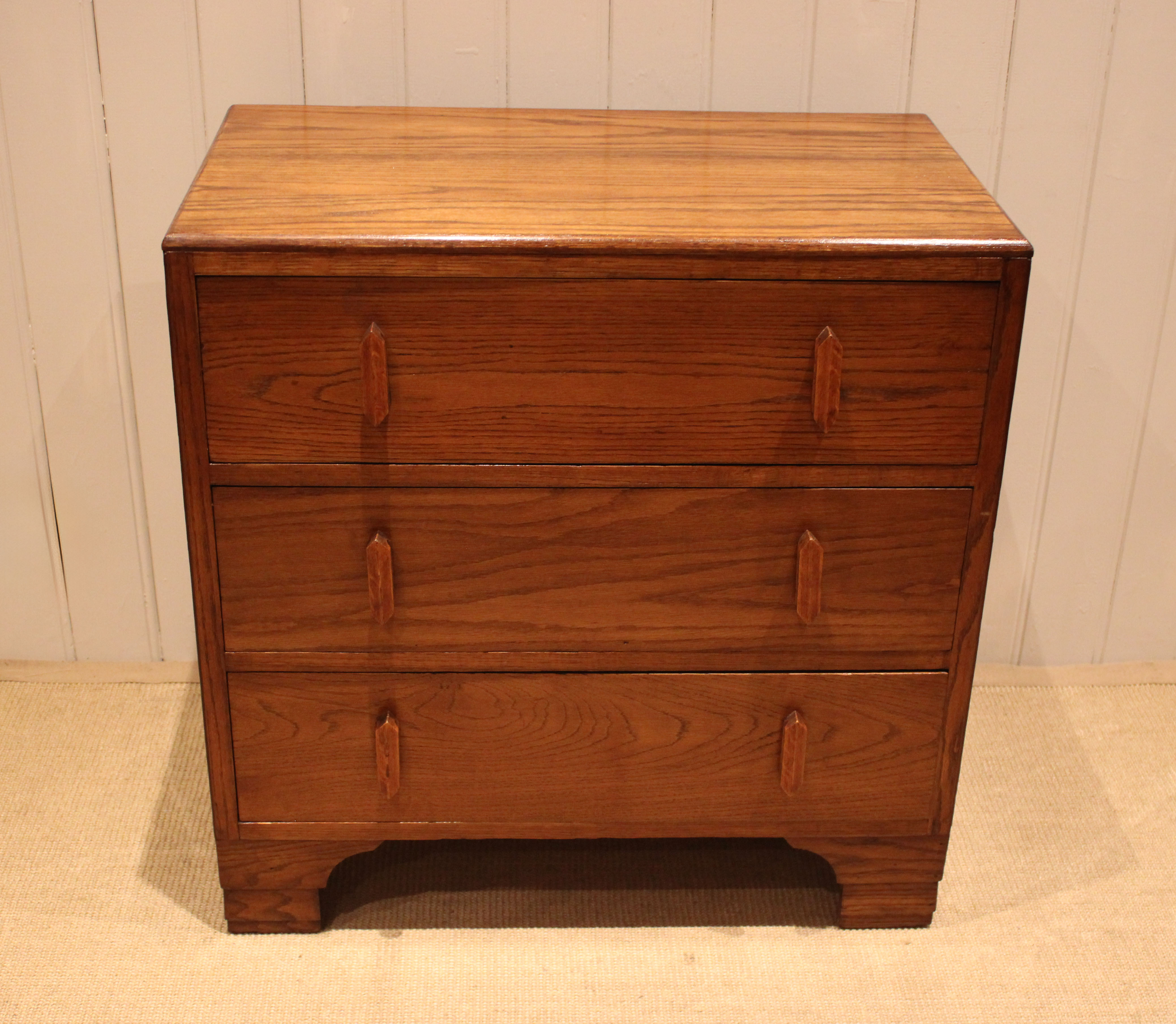 Oak chest of three drawers having shaped wooden handles , raised on bracket feet . The drawer depths are 16.5 cm .