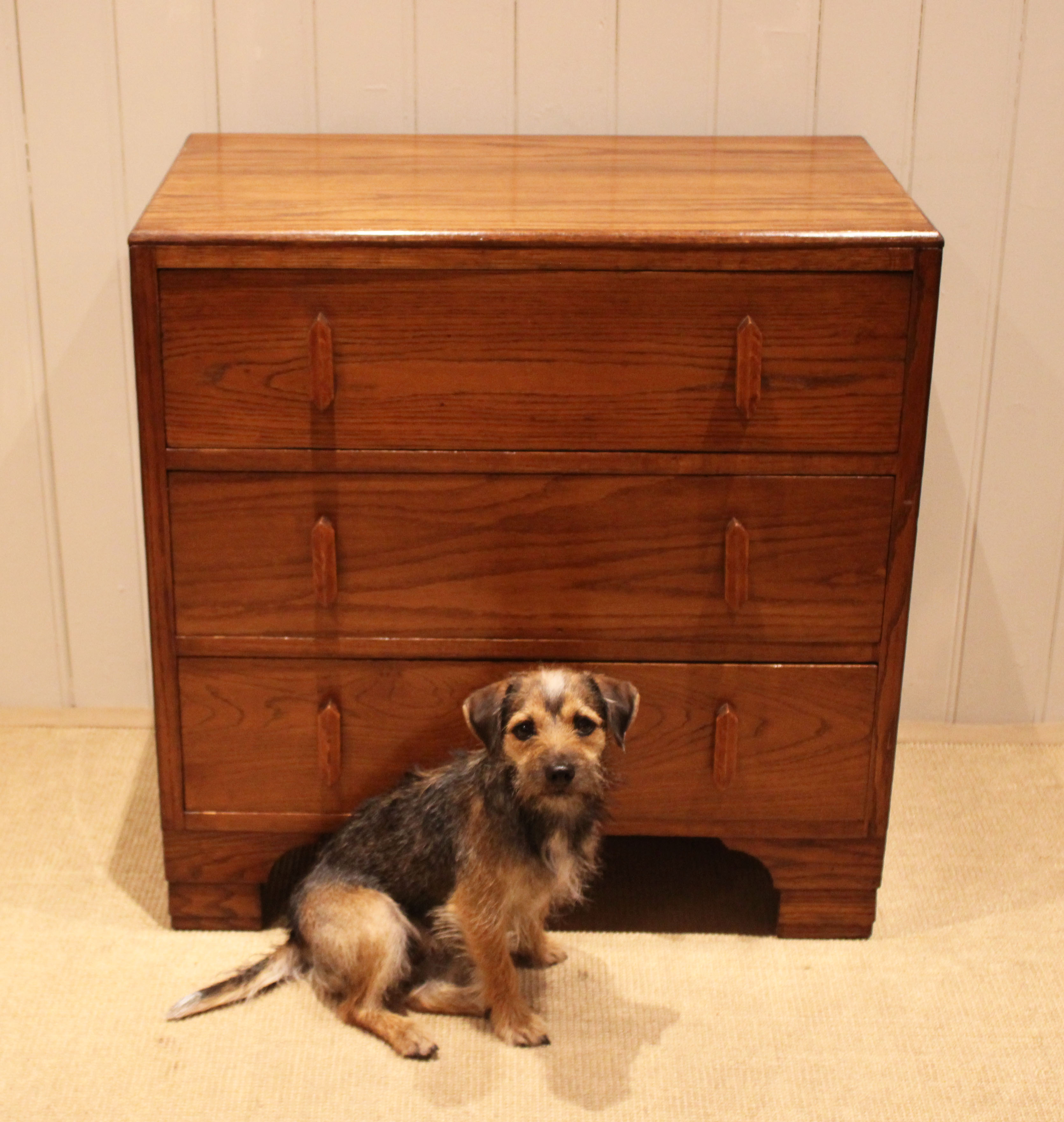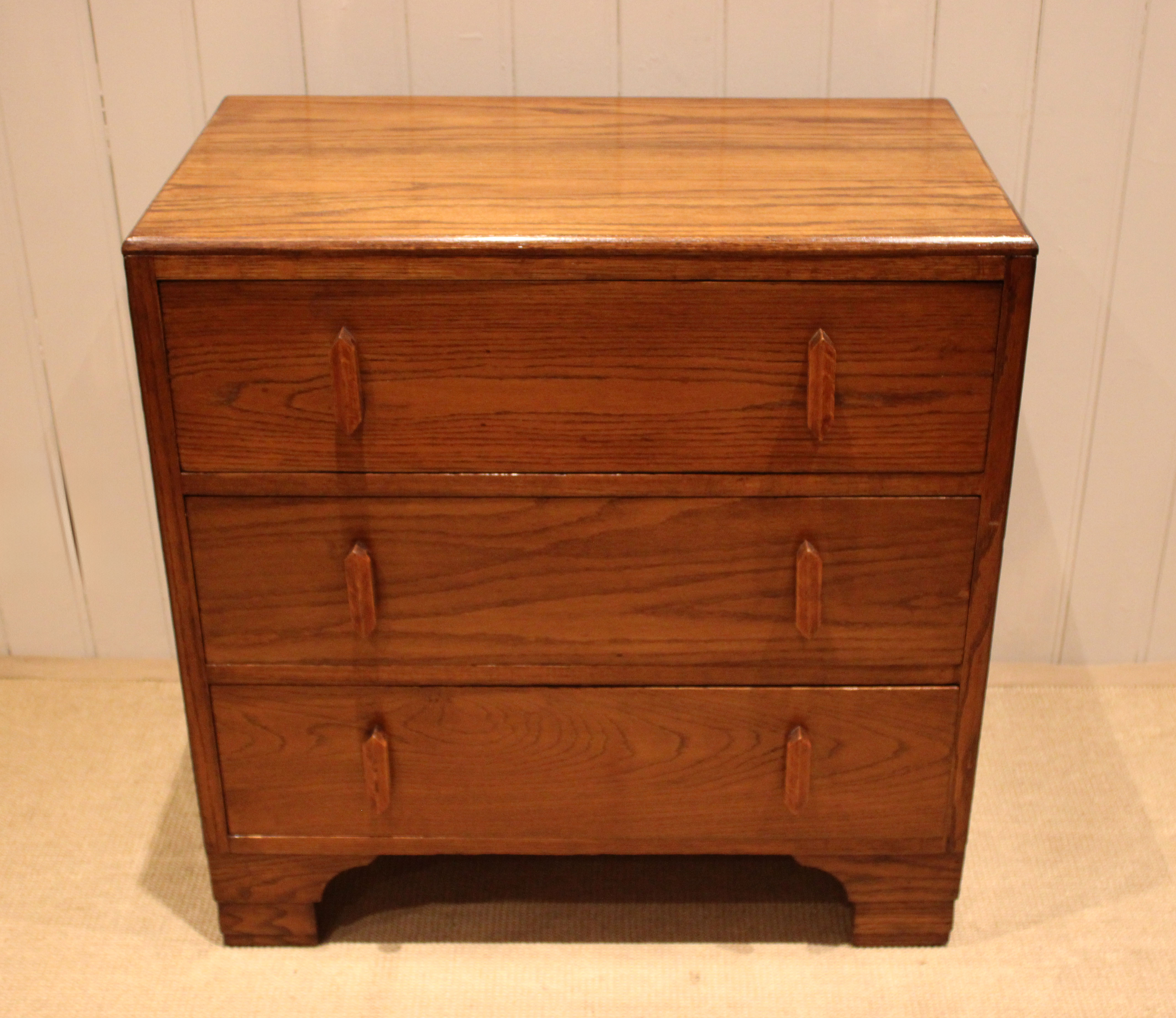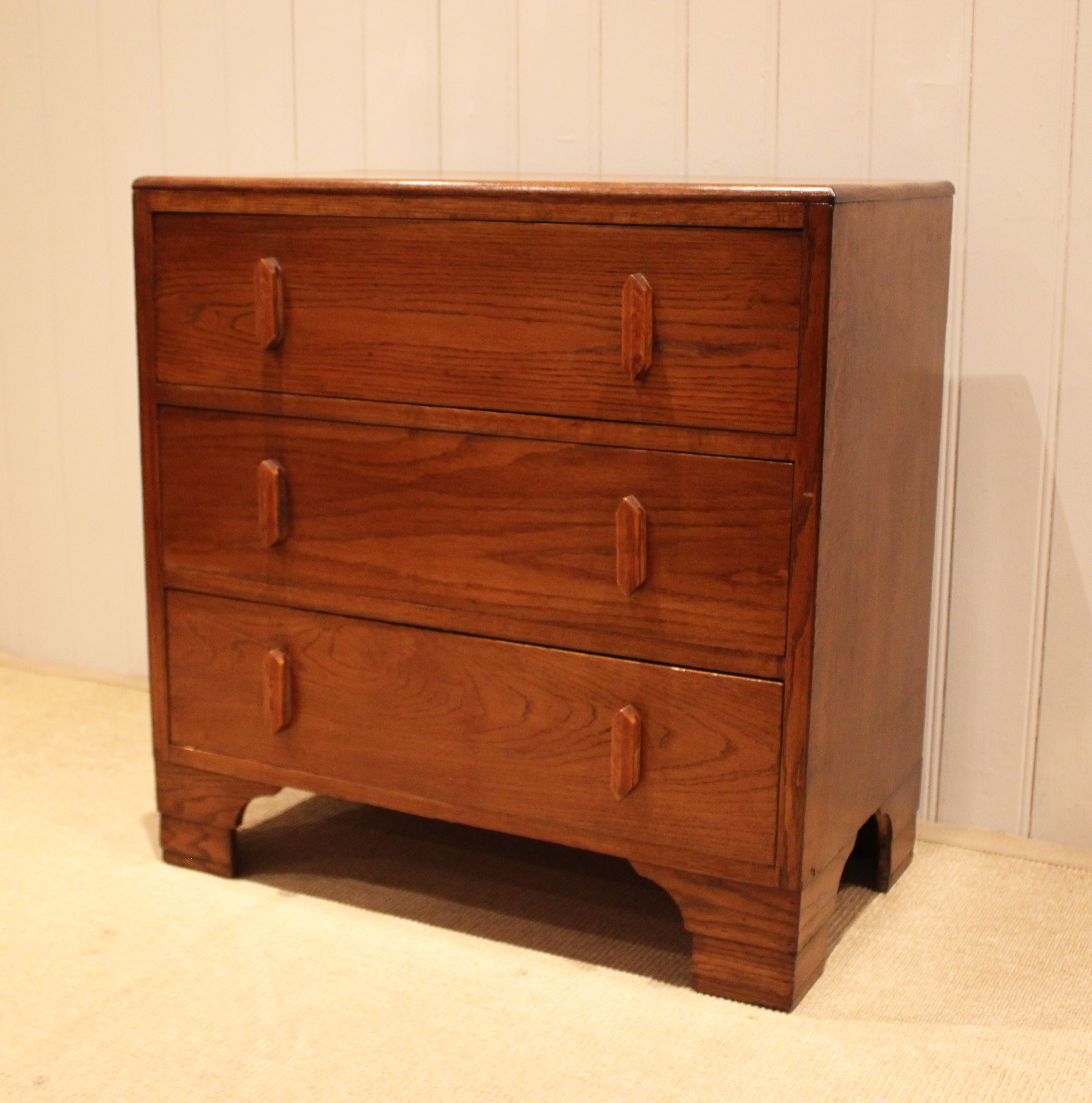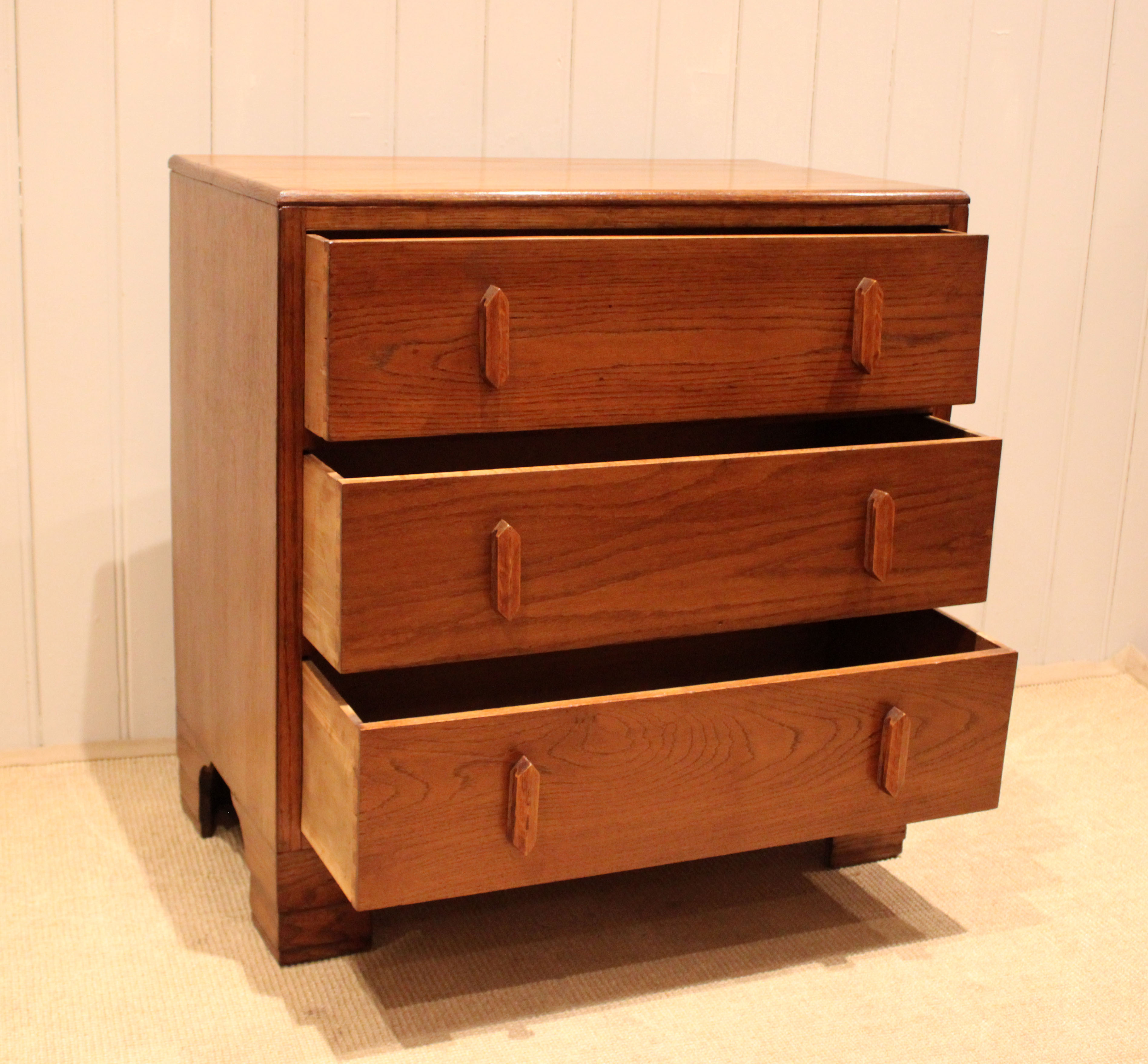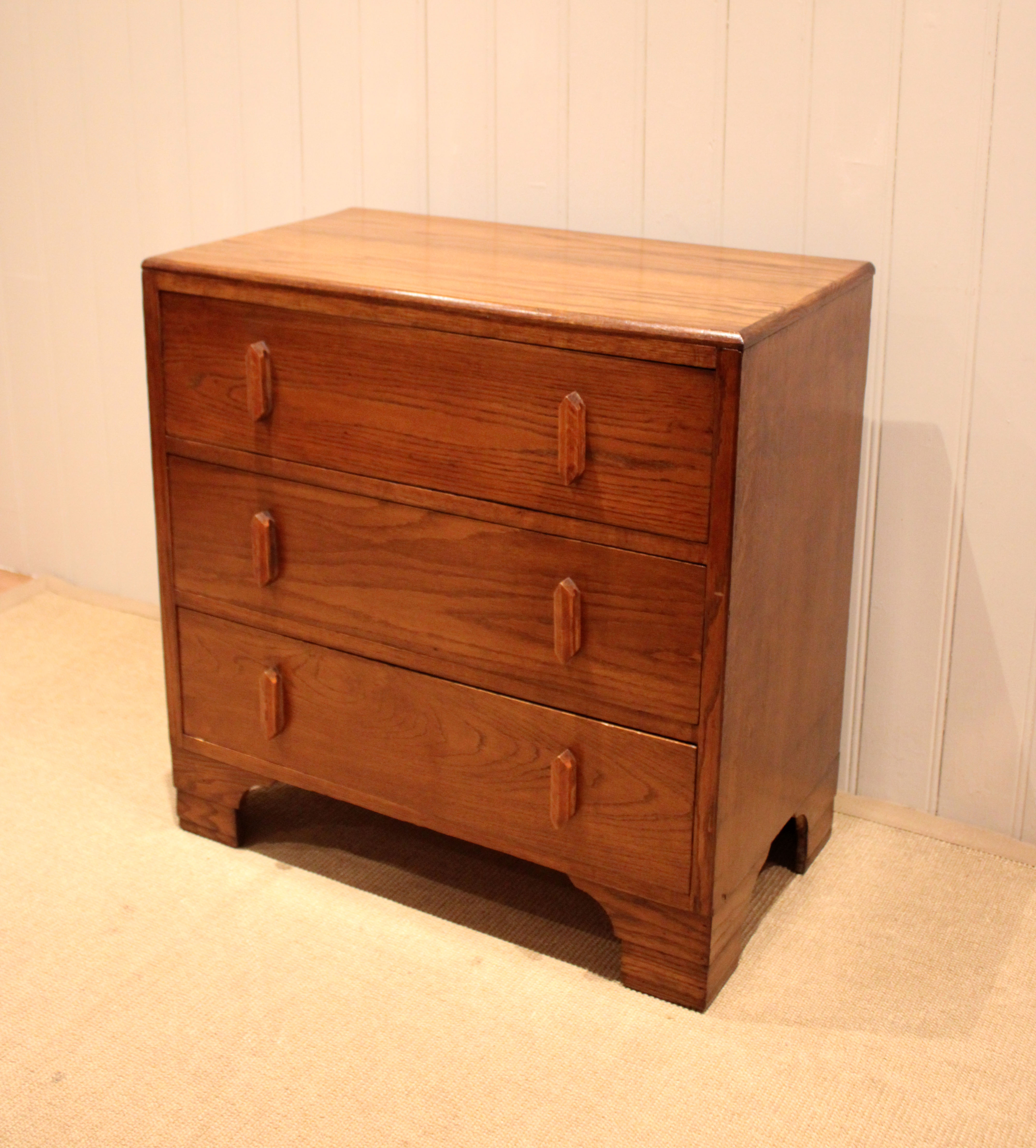 Oak chest of three drawers having shaped wooden handles , raised on bracket feet . The drawer depths are 16.5 cm .