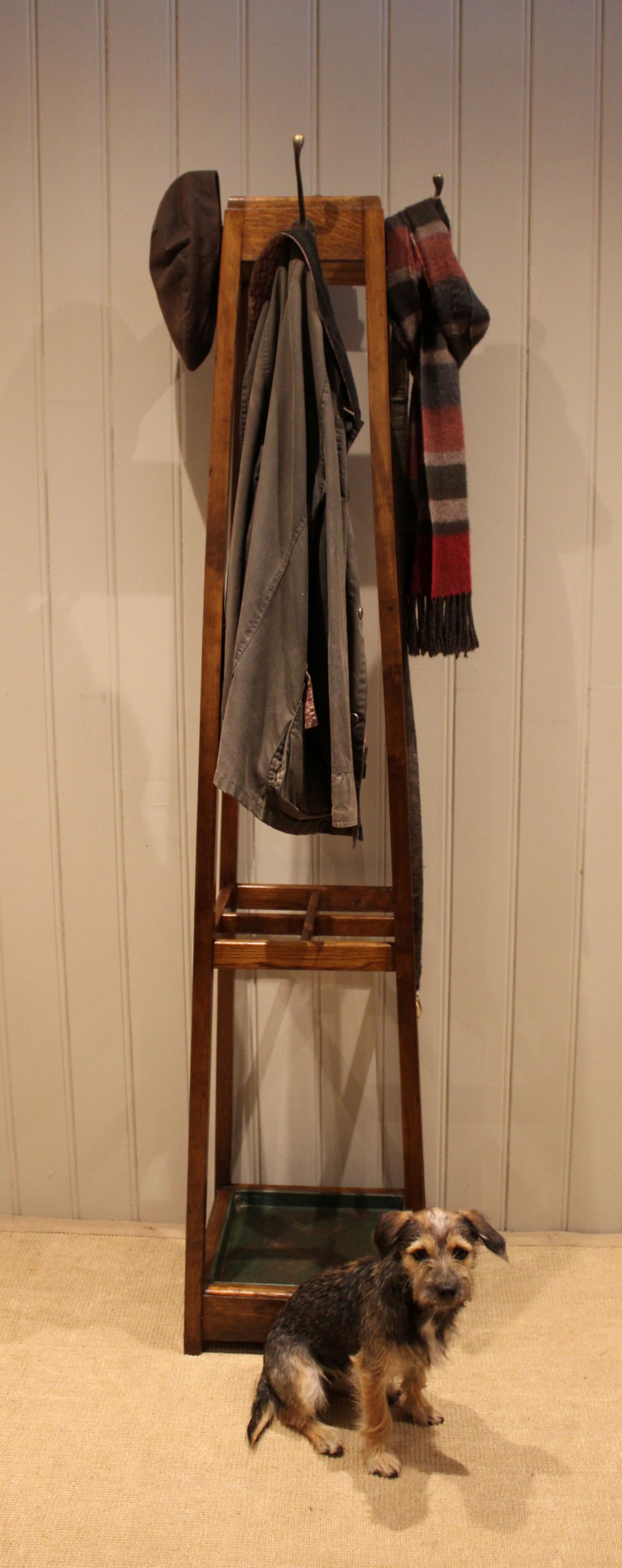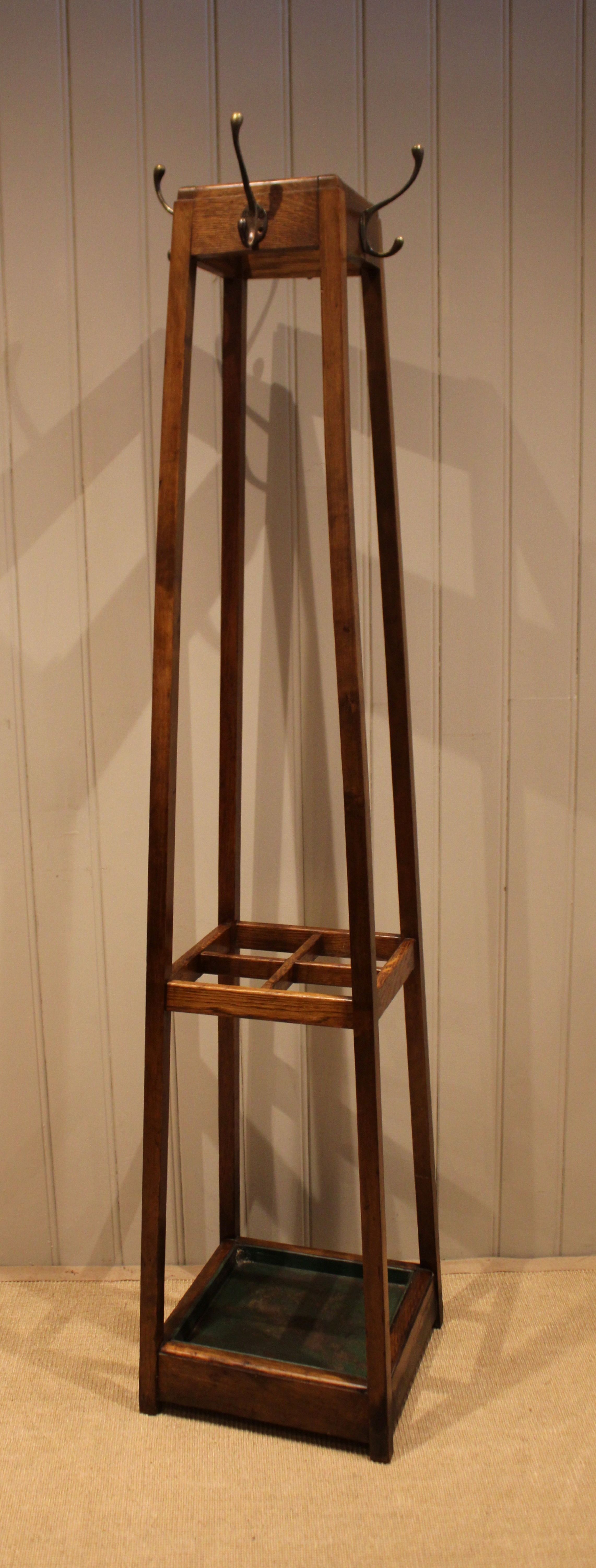 Oak hat and coat stand having a tapering square form with four original matching hat & coat hooks and a section for sticks and umbrellas with the original metal drip tray