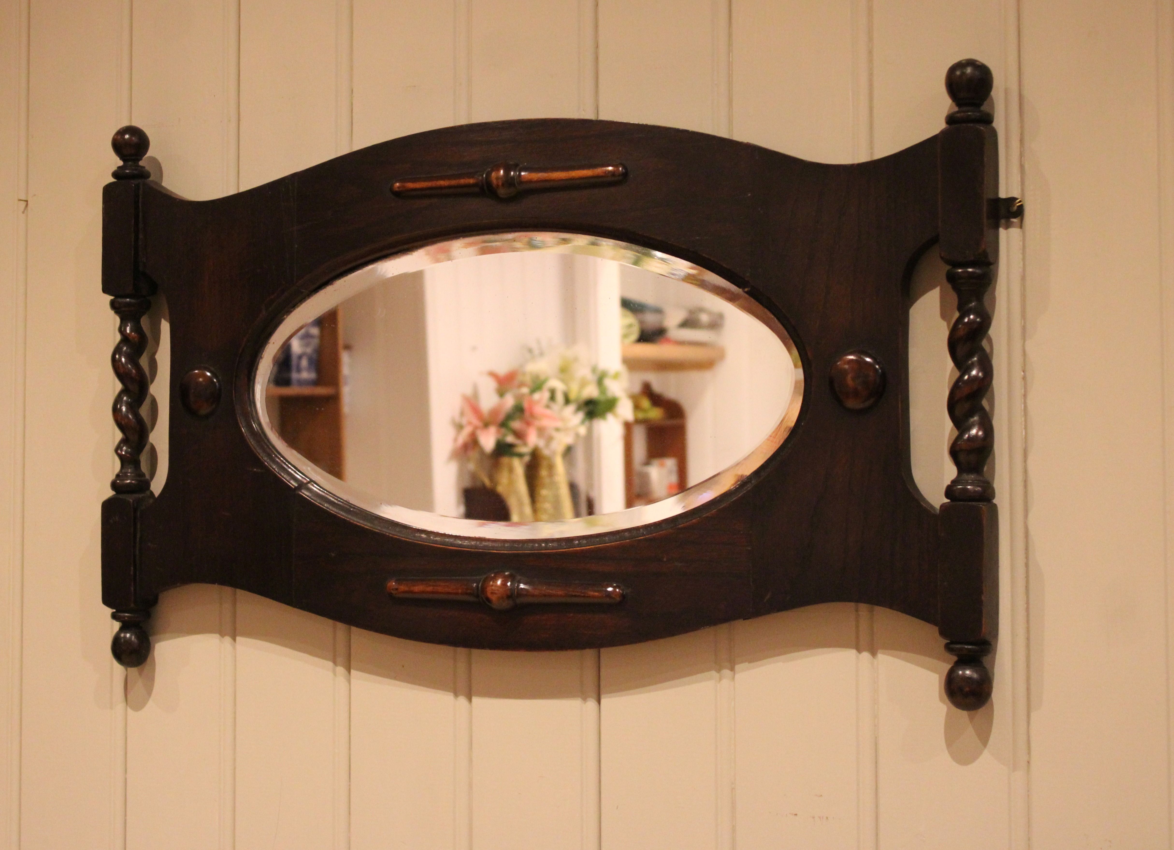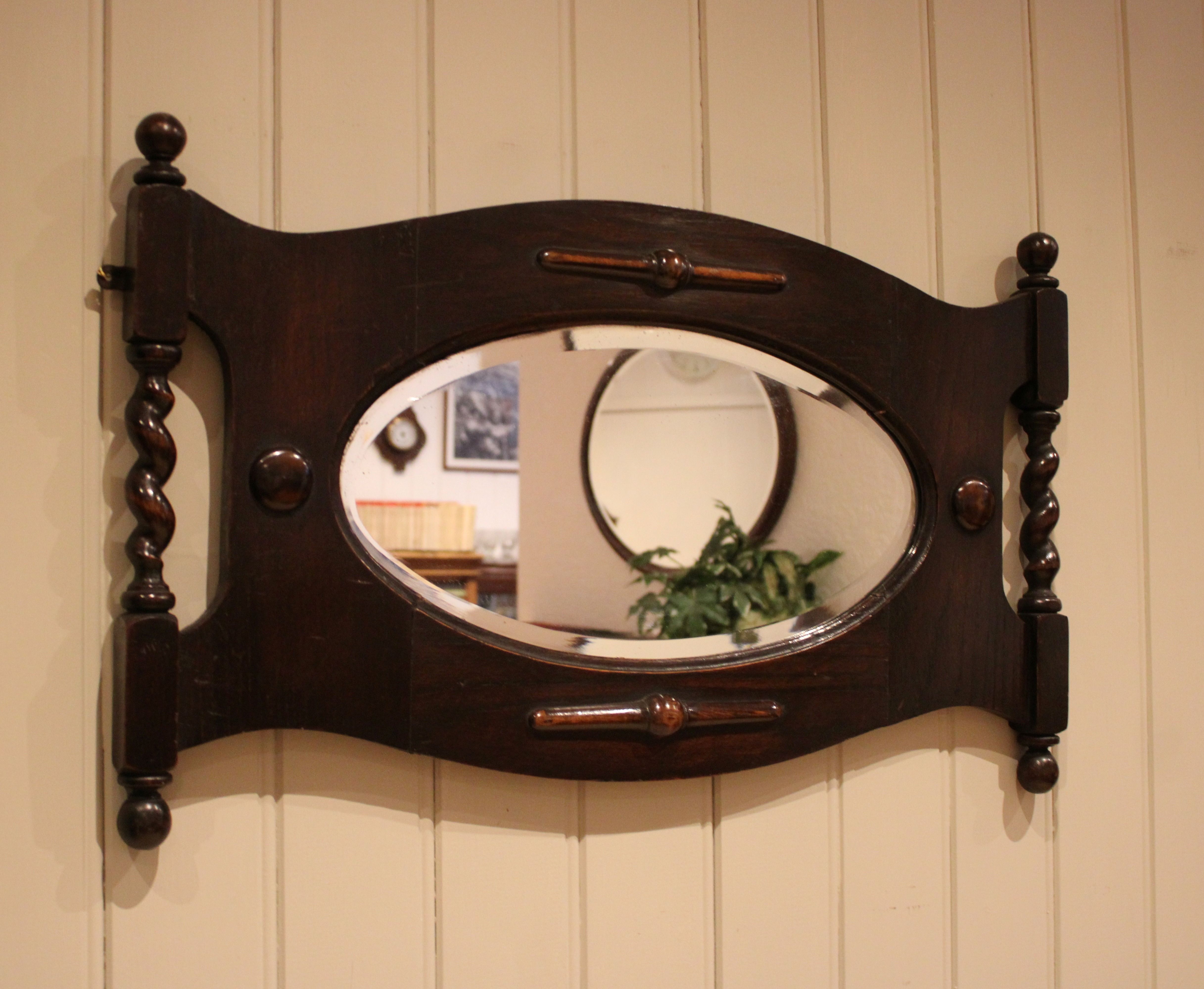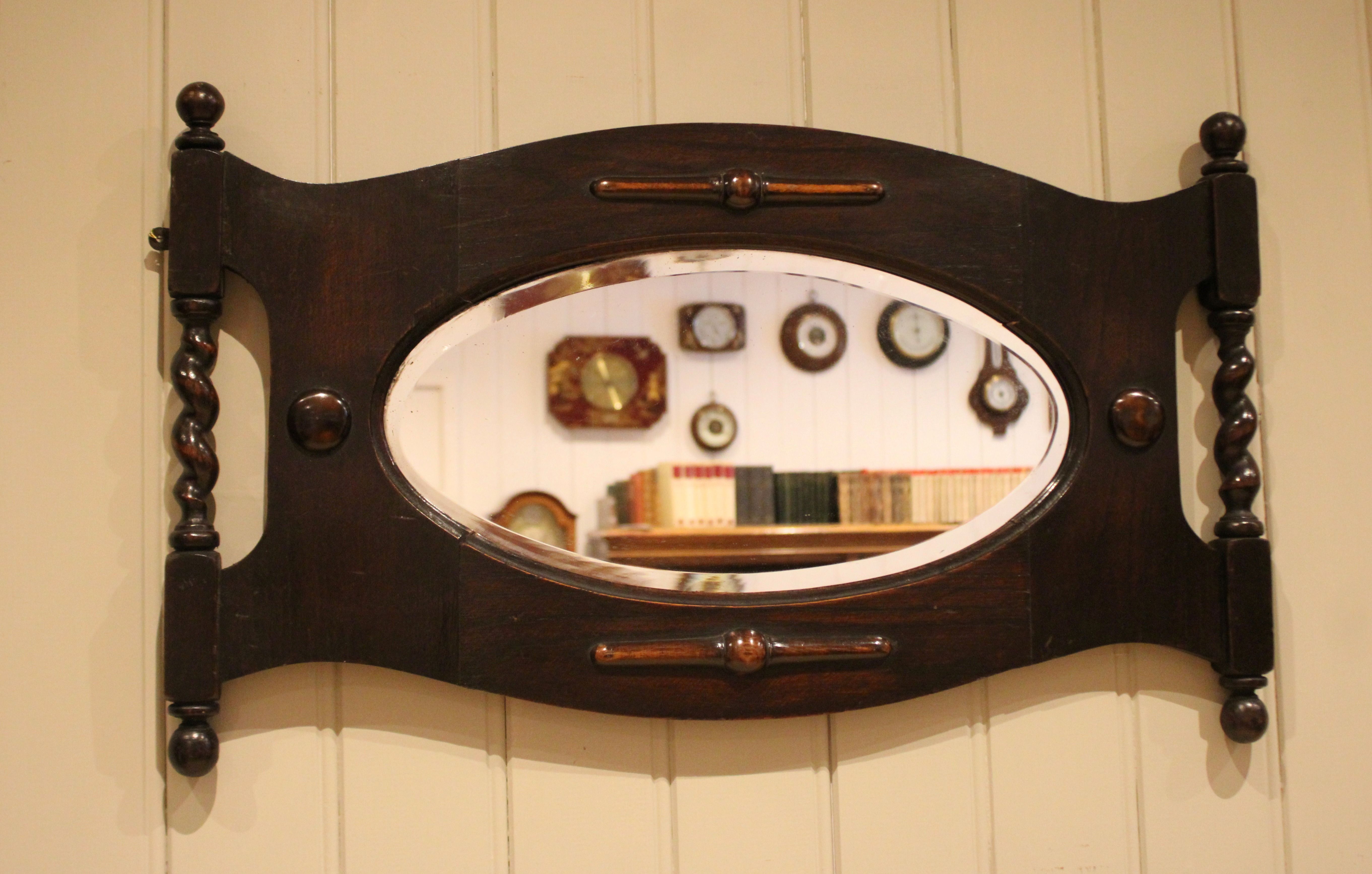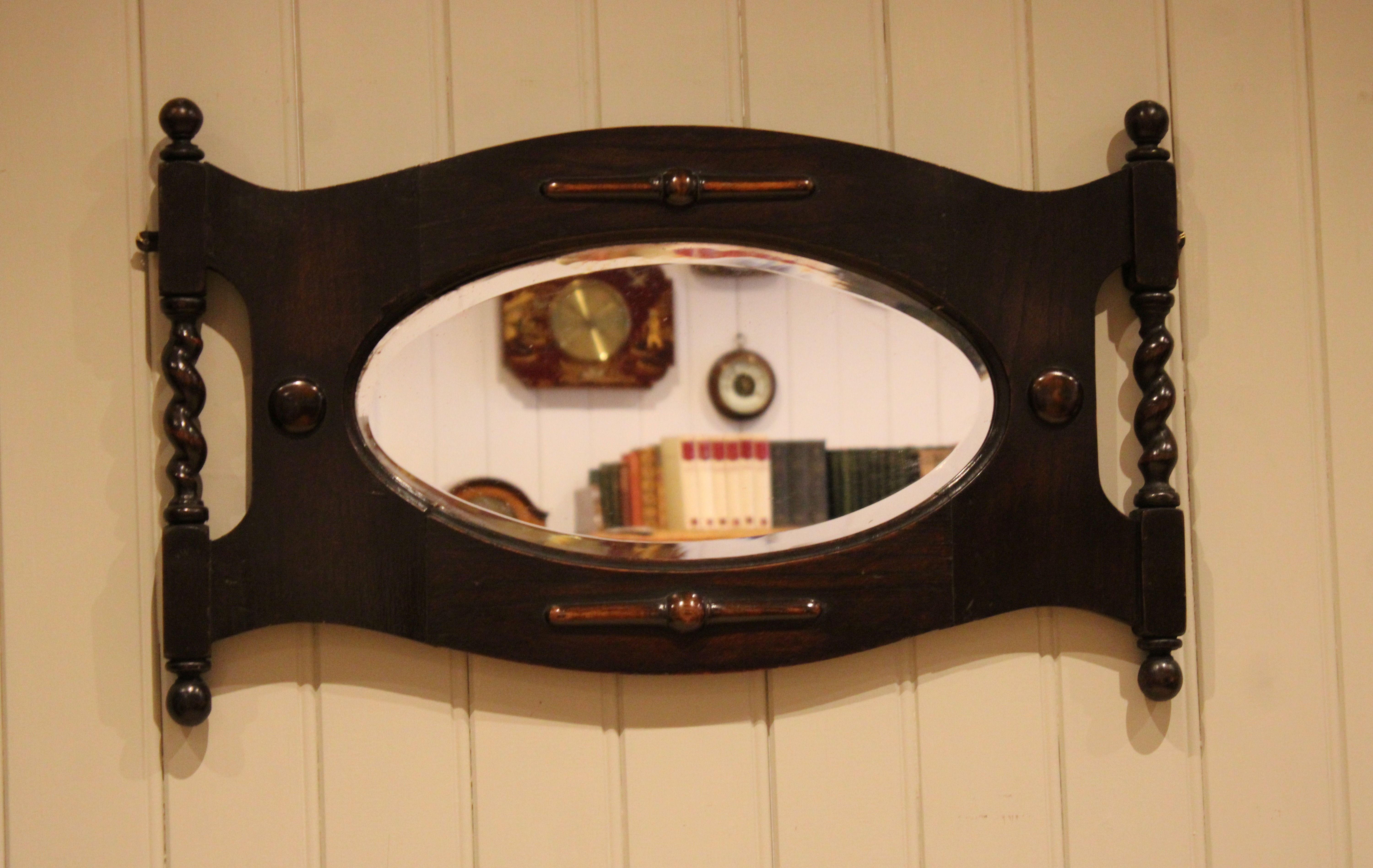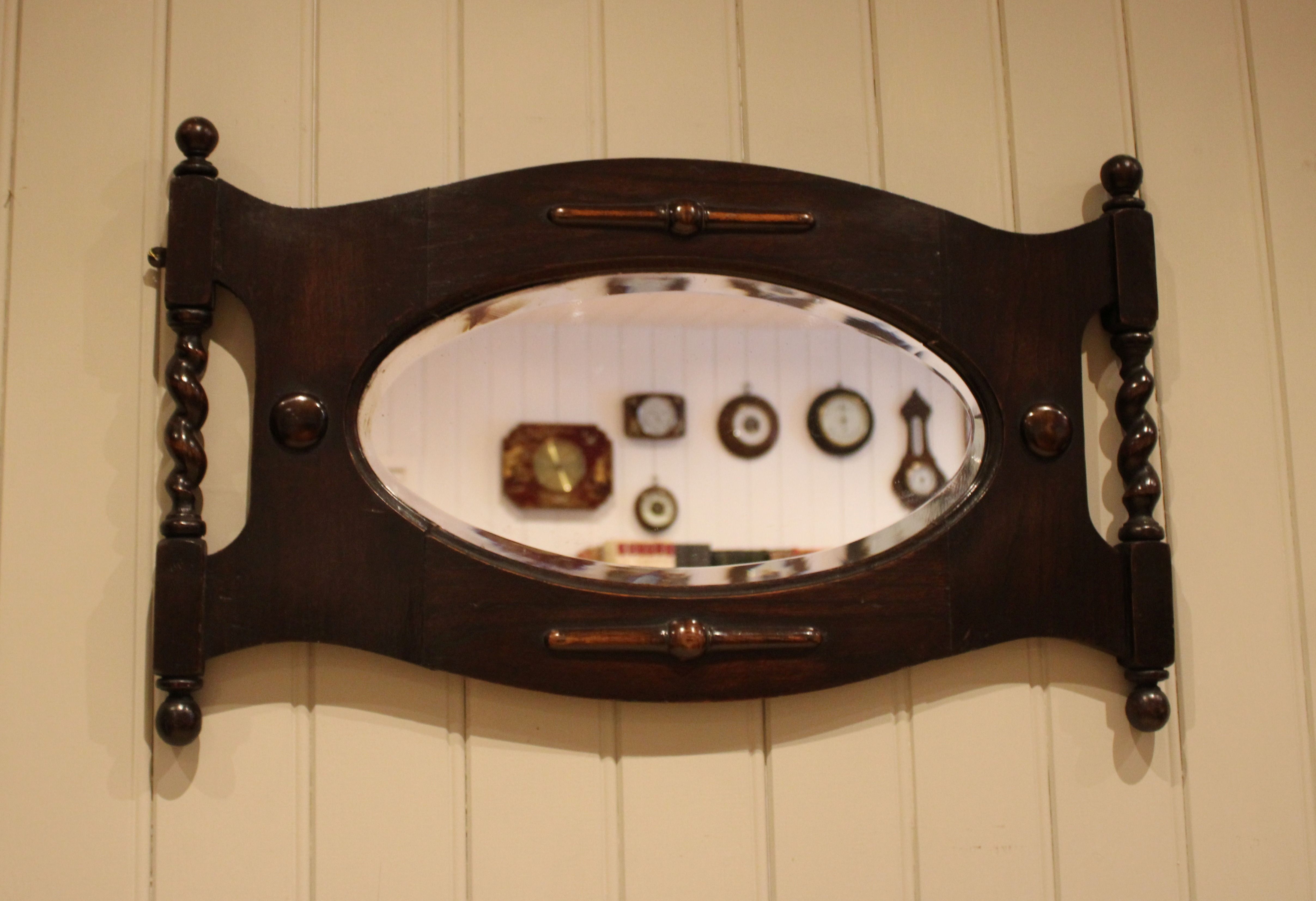 Oak framed oval bevel edge wall mirror having barley twist columns and carved decoration .