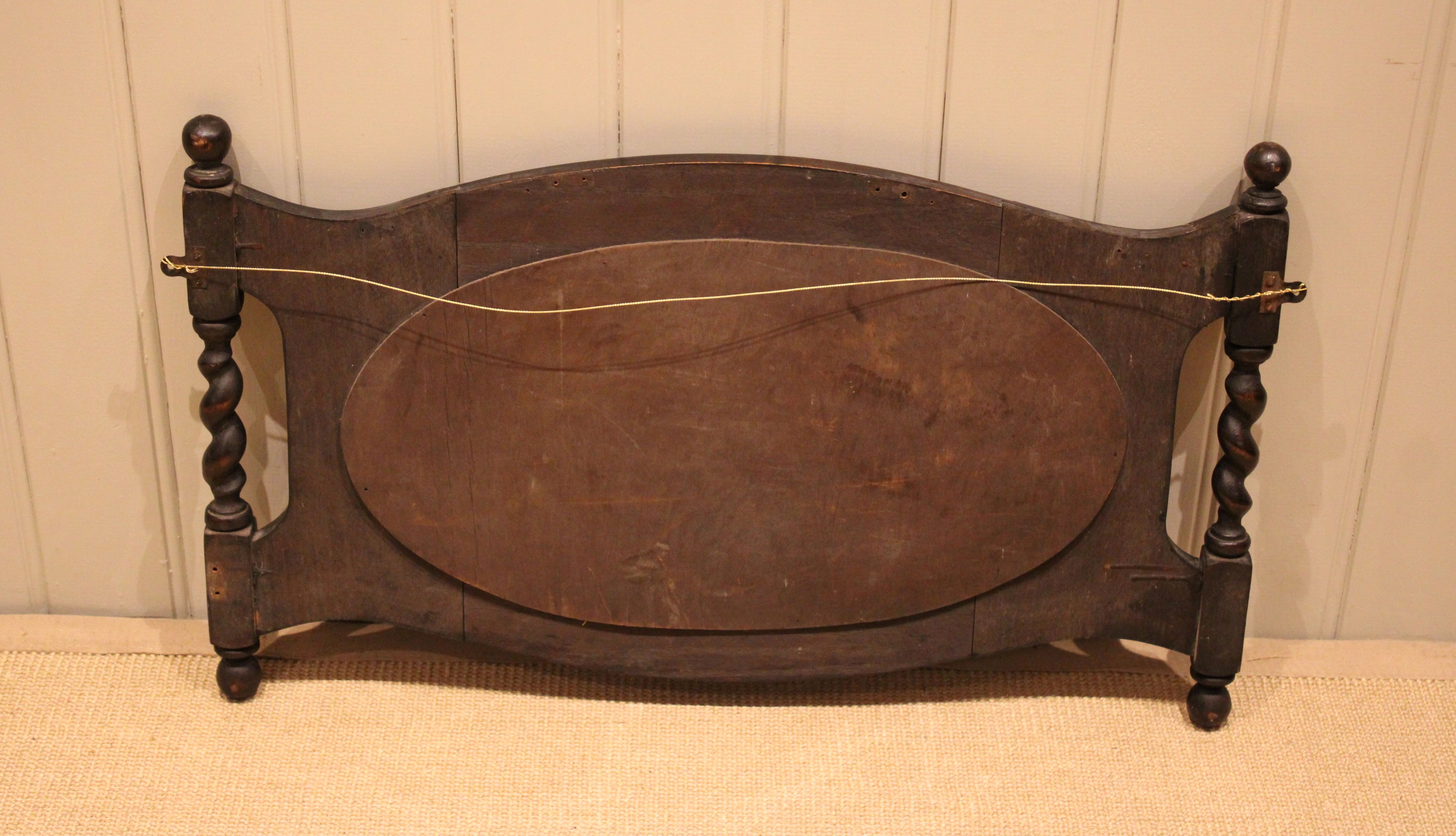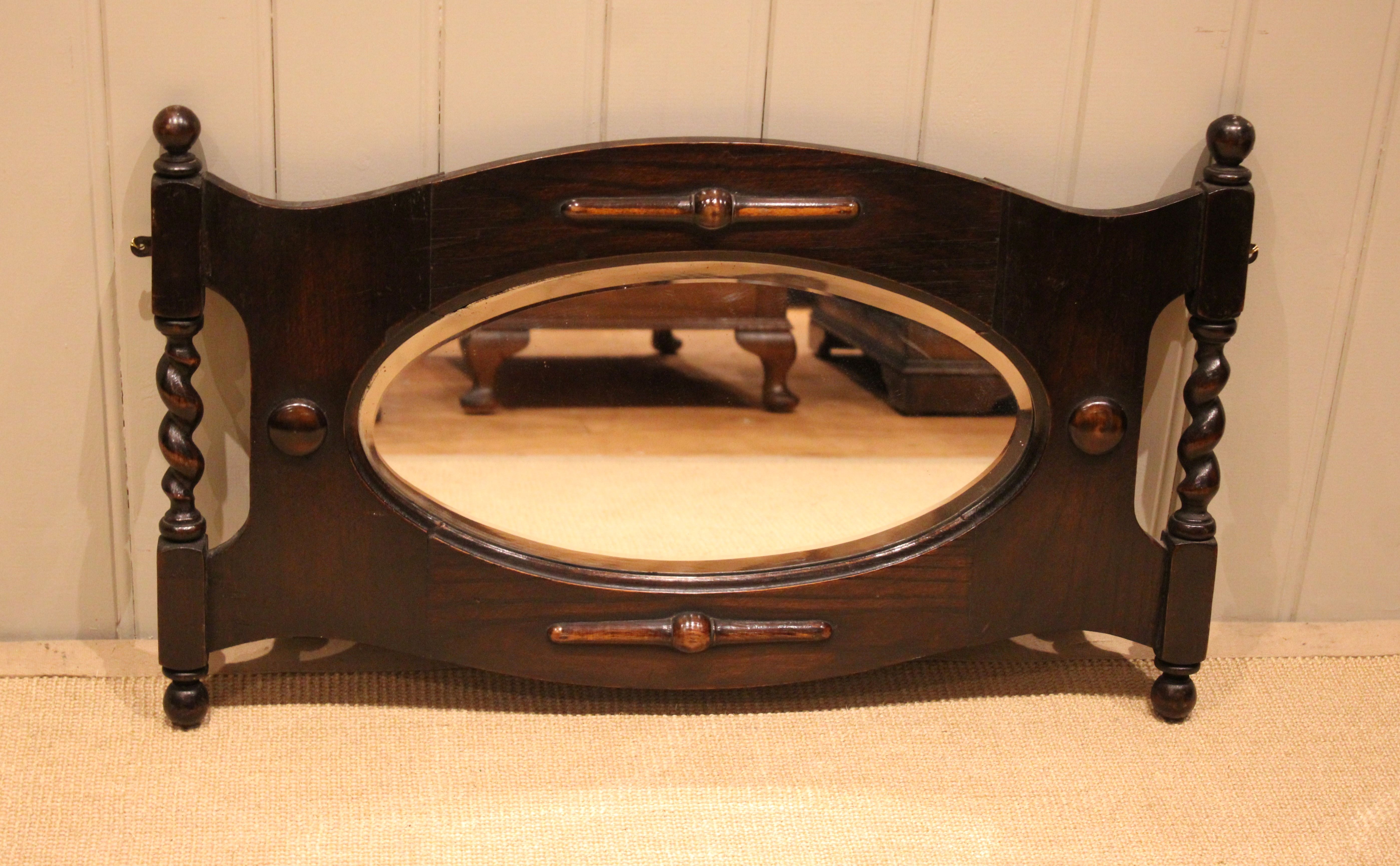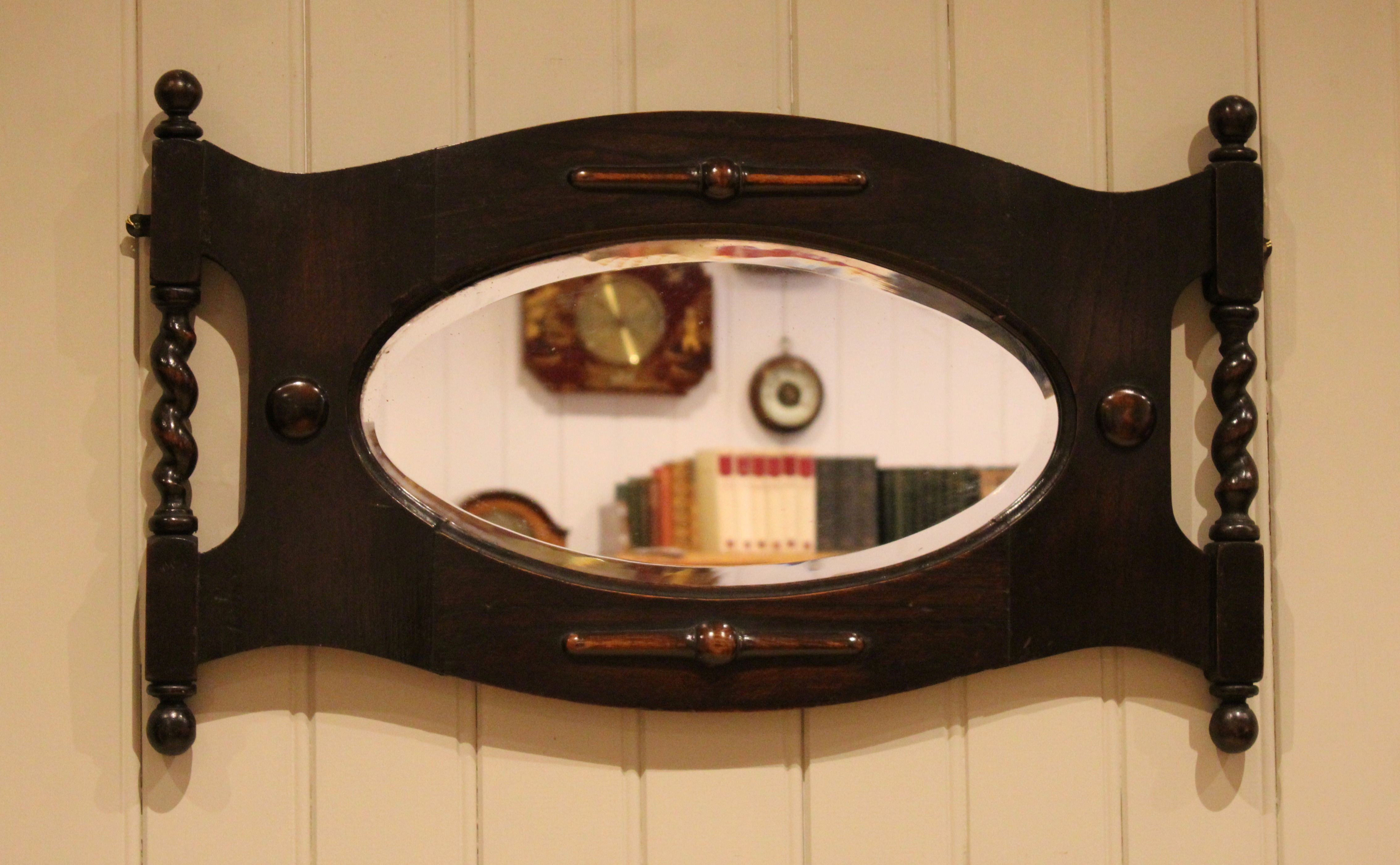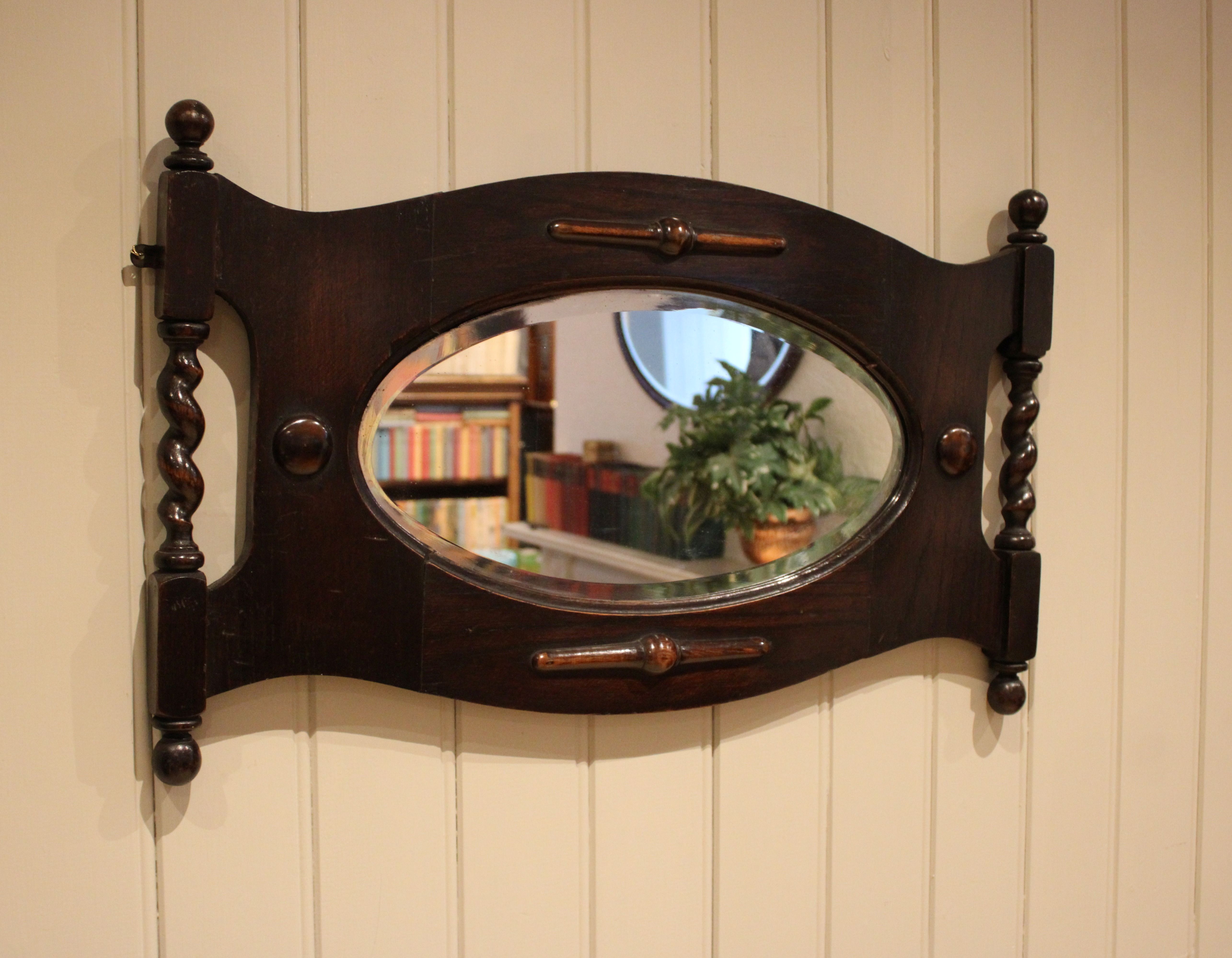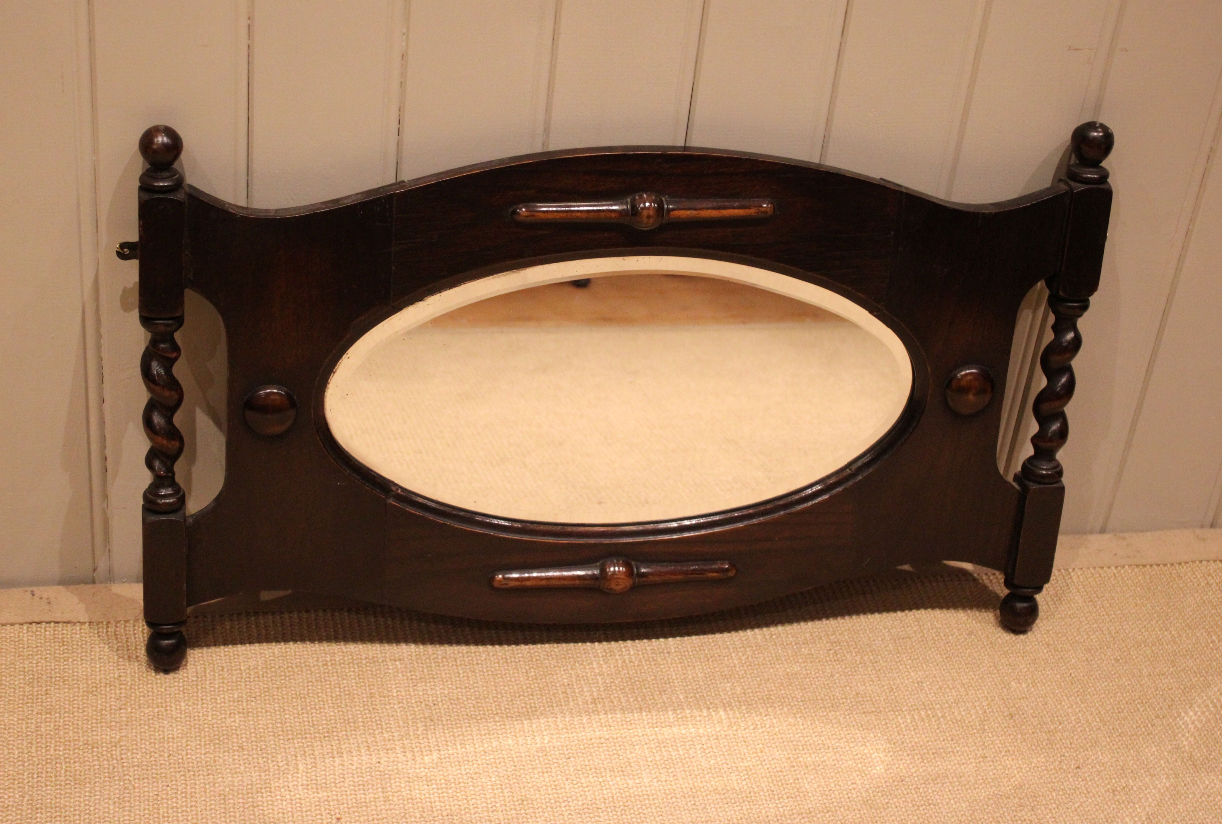 Oak framed oval bevel edge wall mirror having barley twist columns and carved decoration .