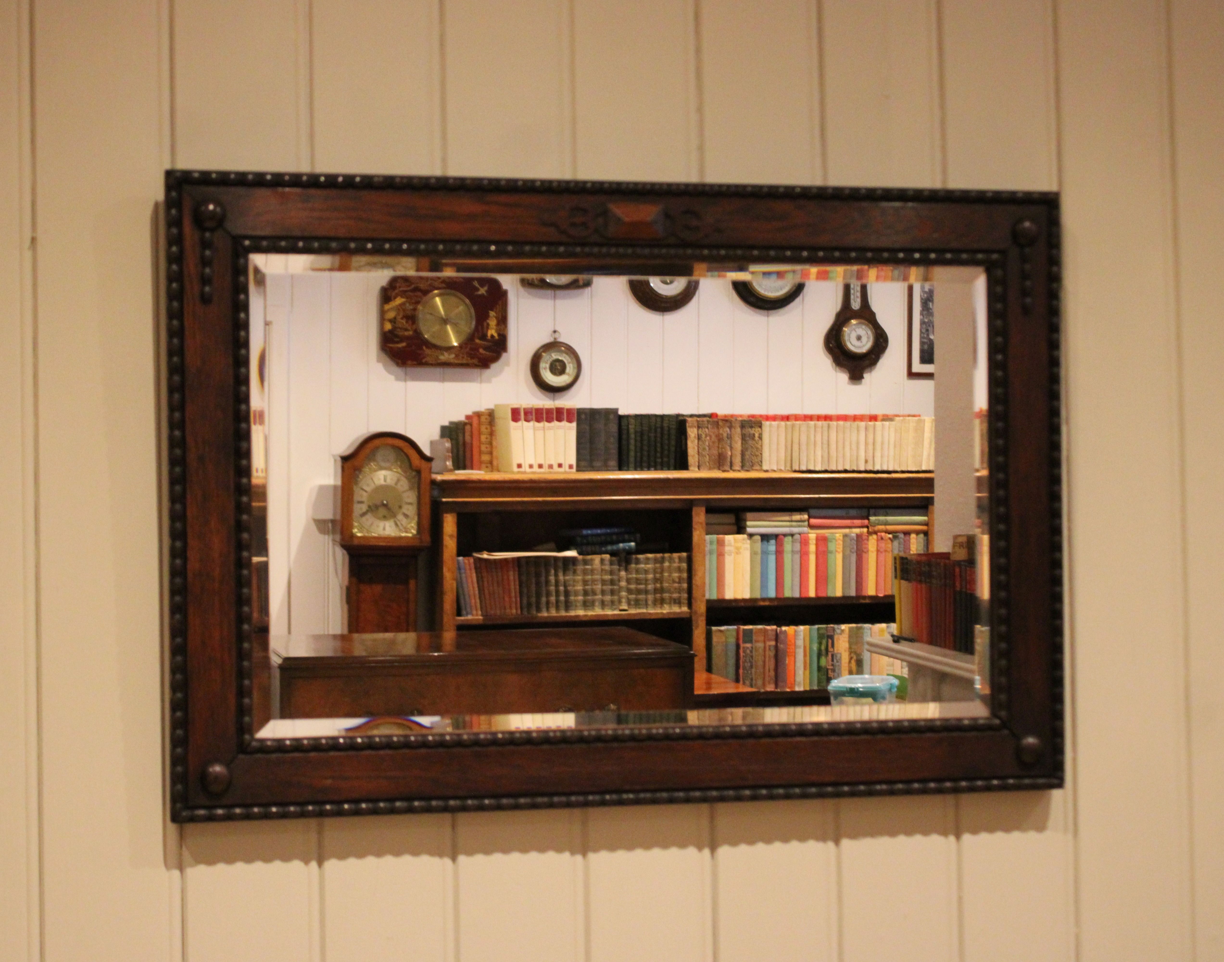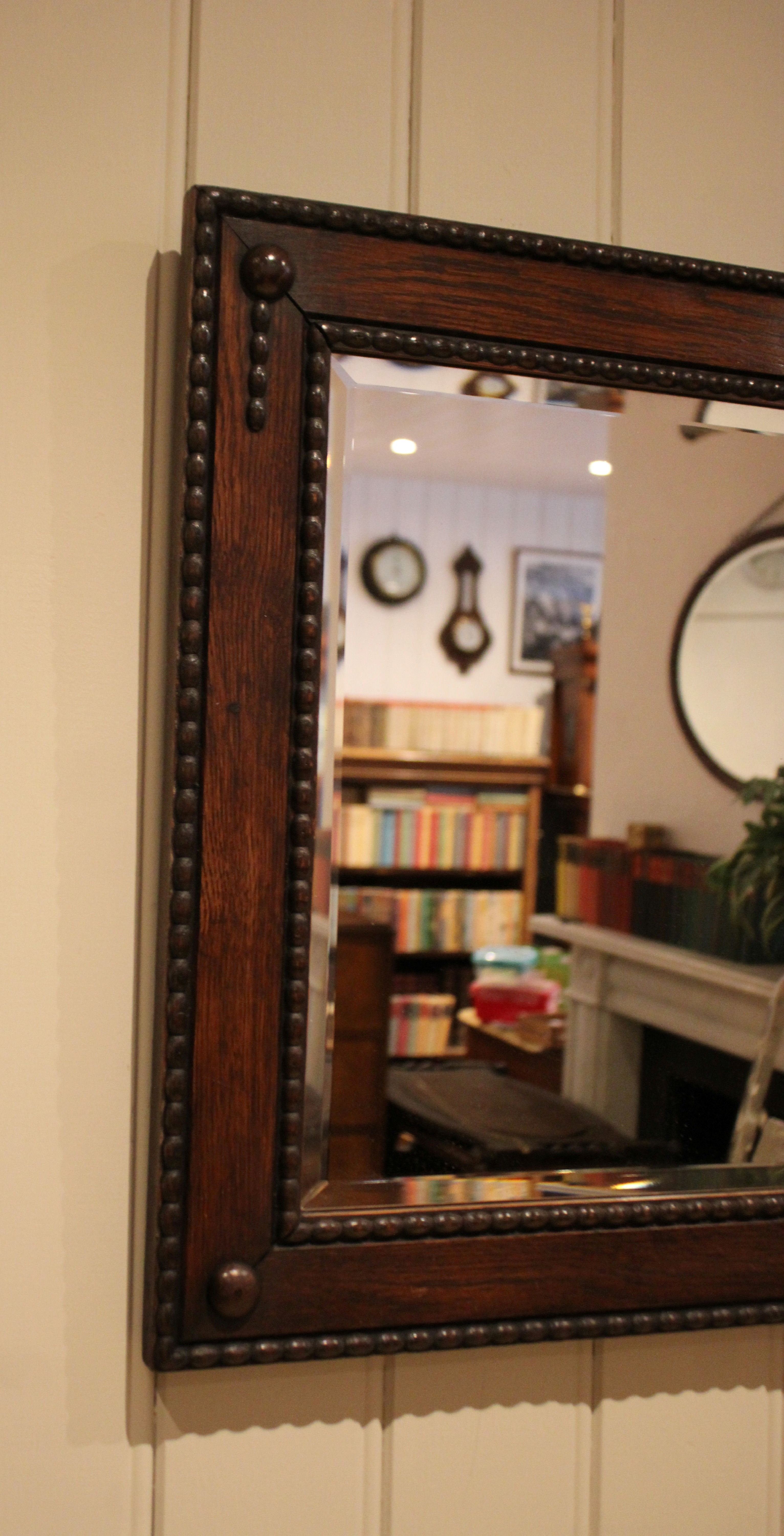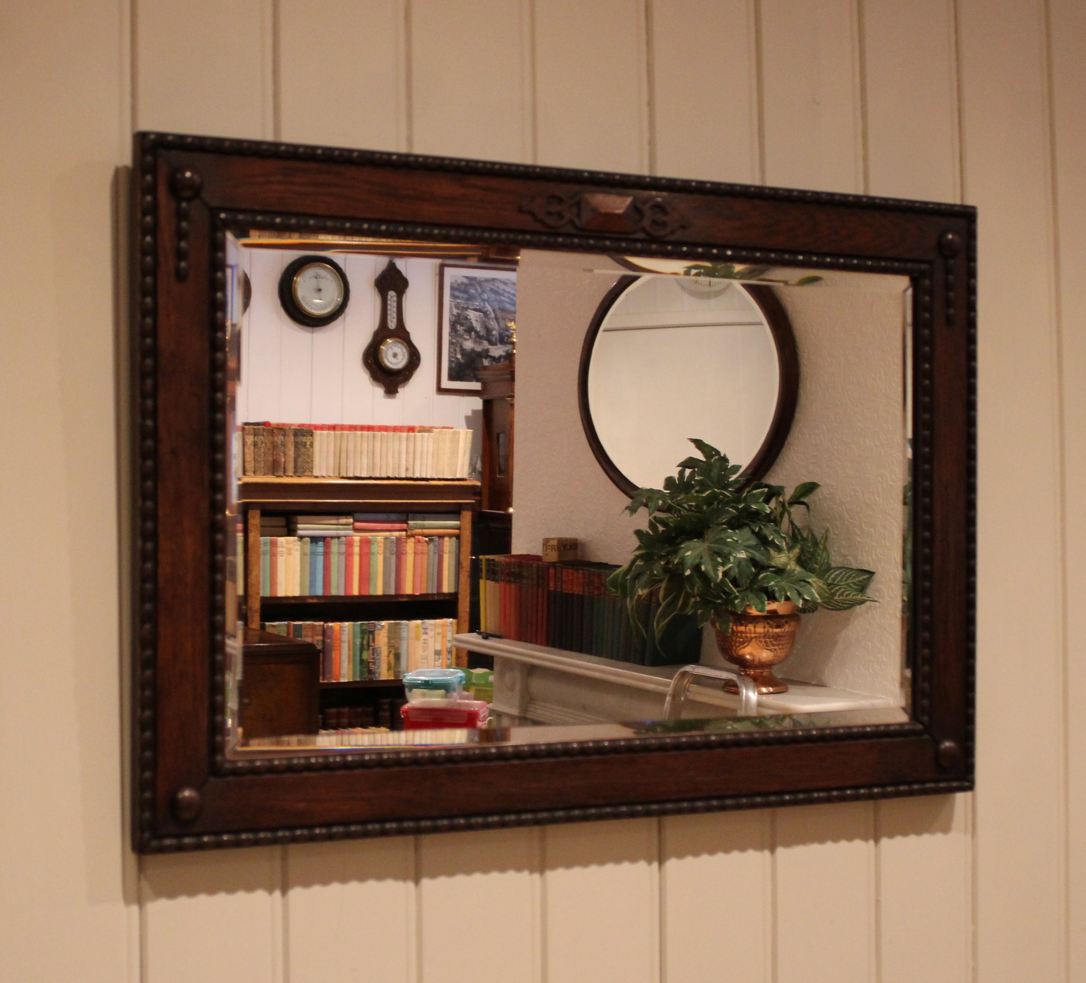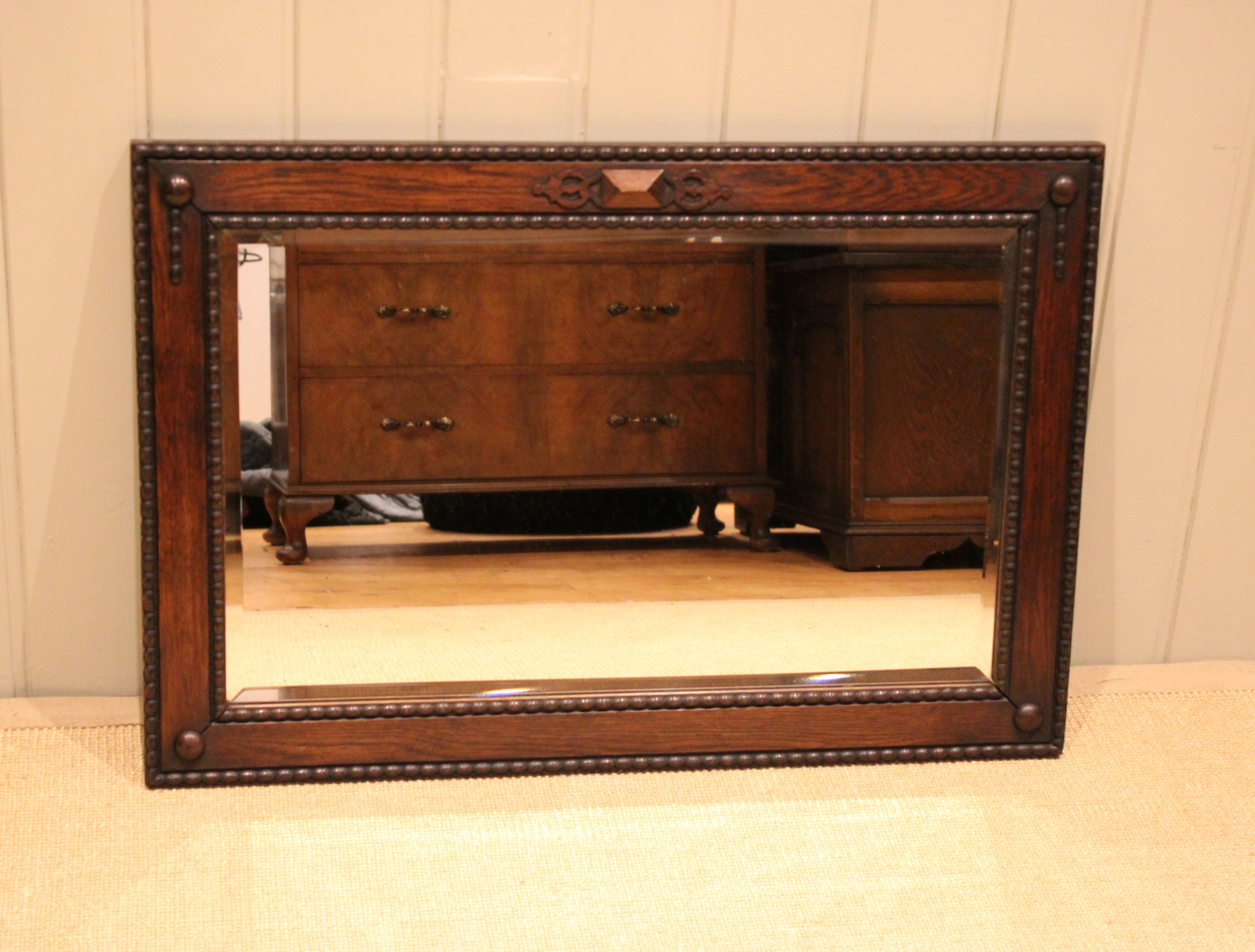Rectangular oak framed wall mirror , having an inset bevel edge mirror with a solid oak frame with applied carved decoration .