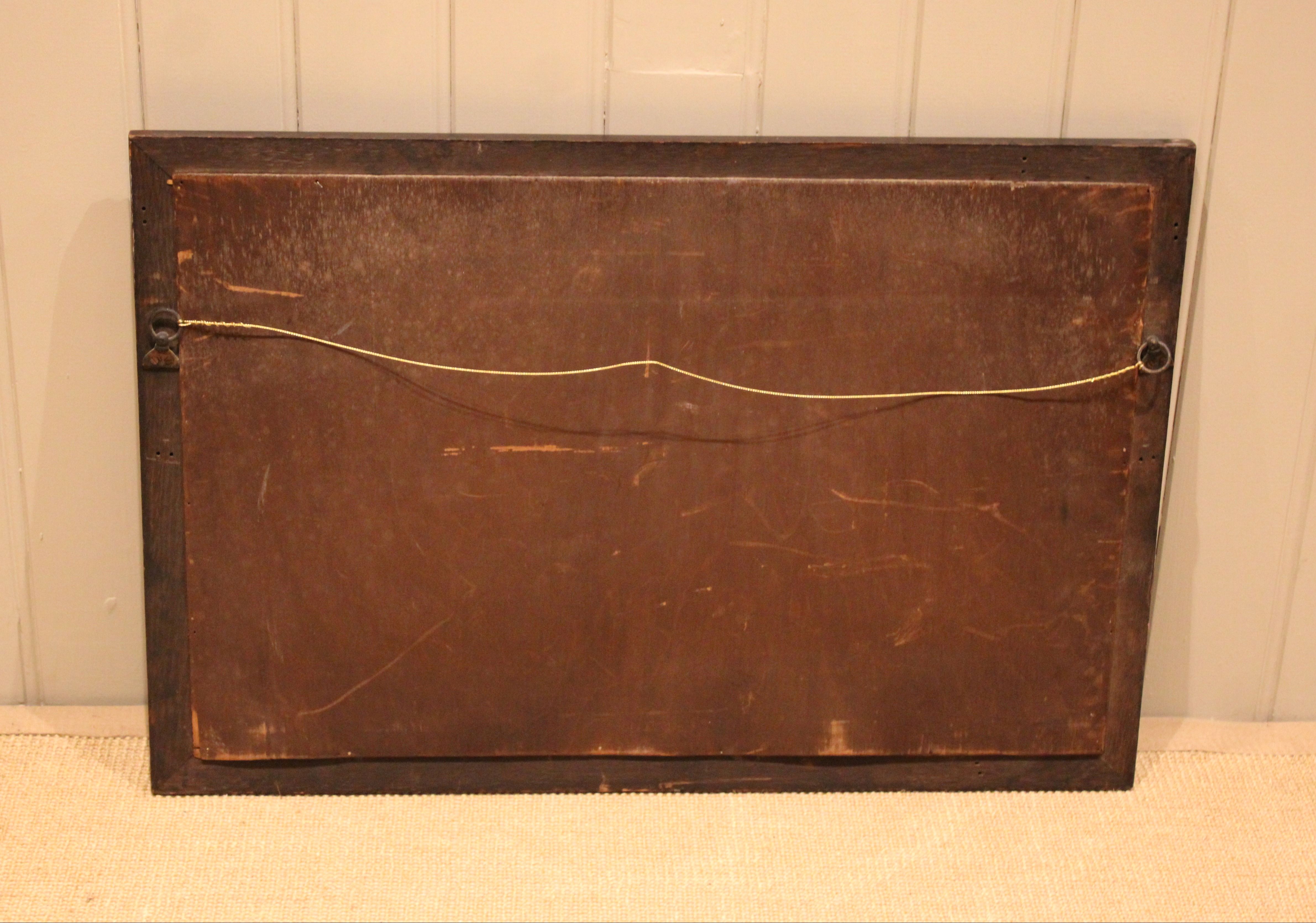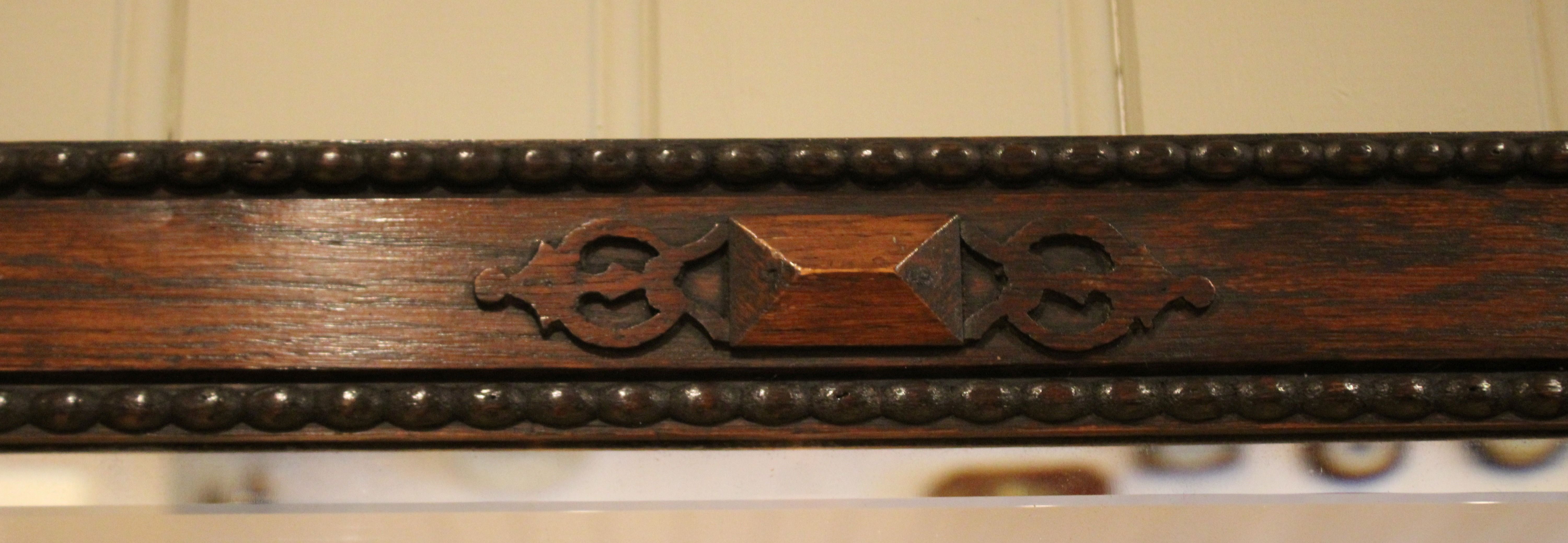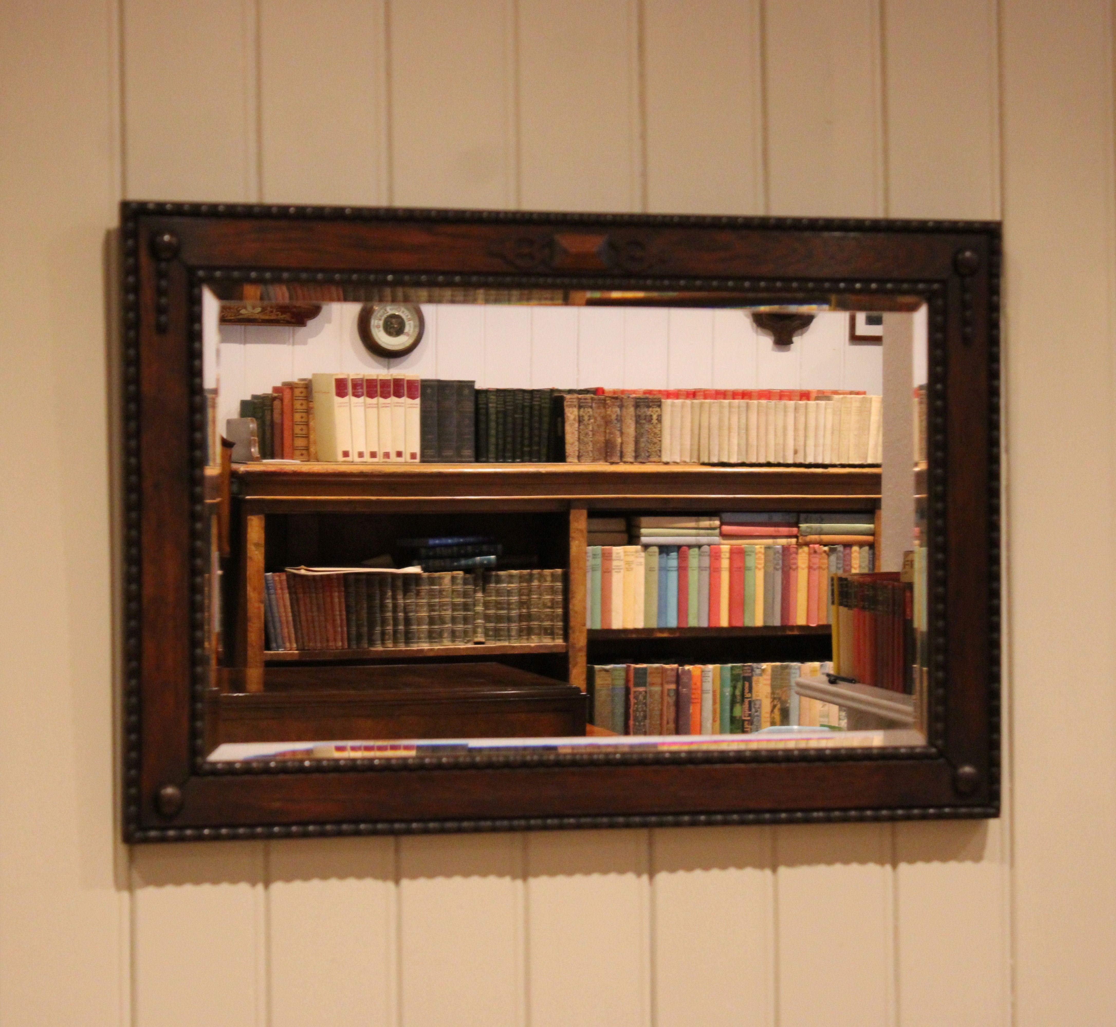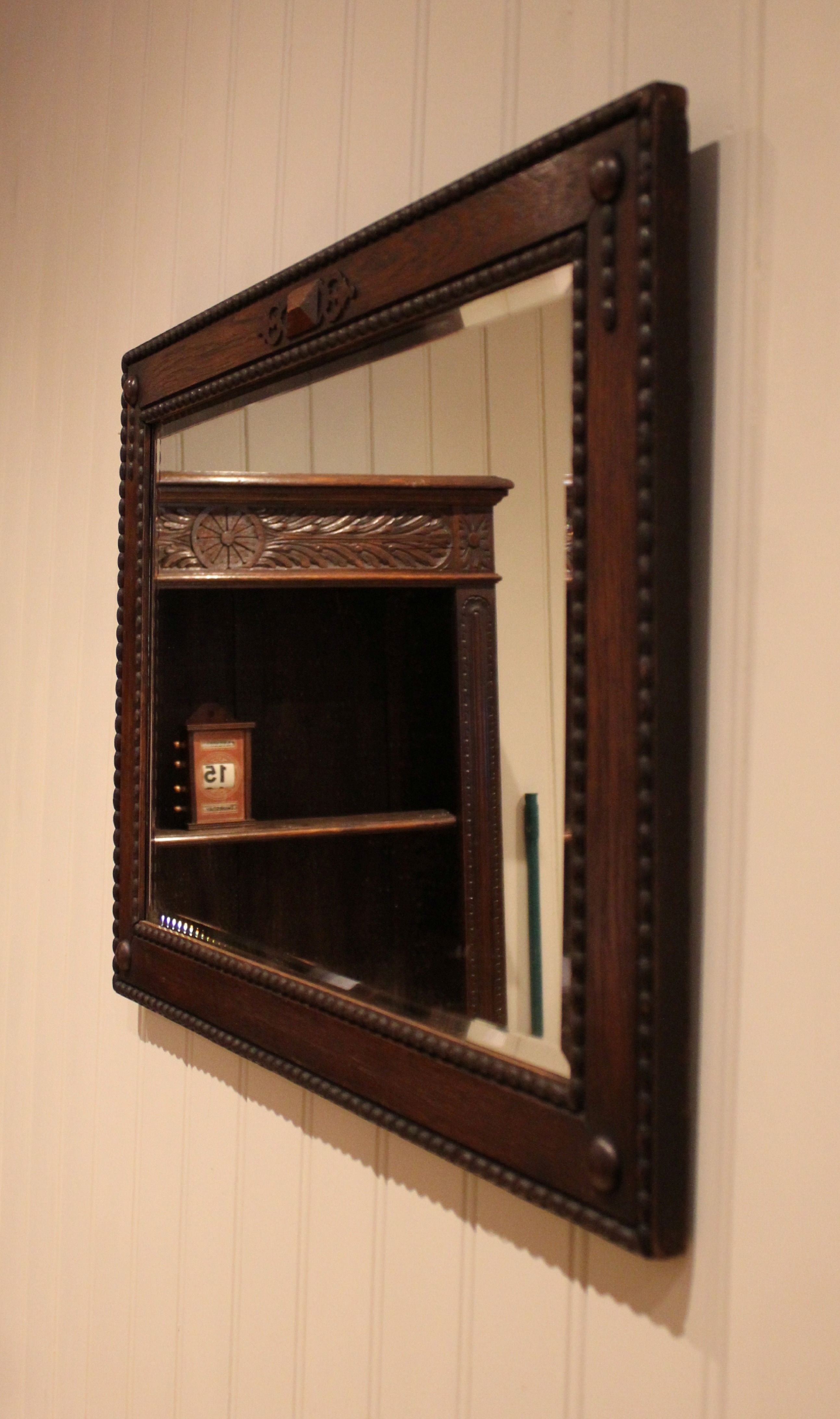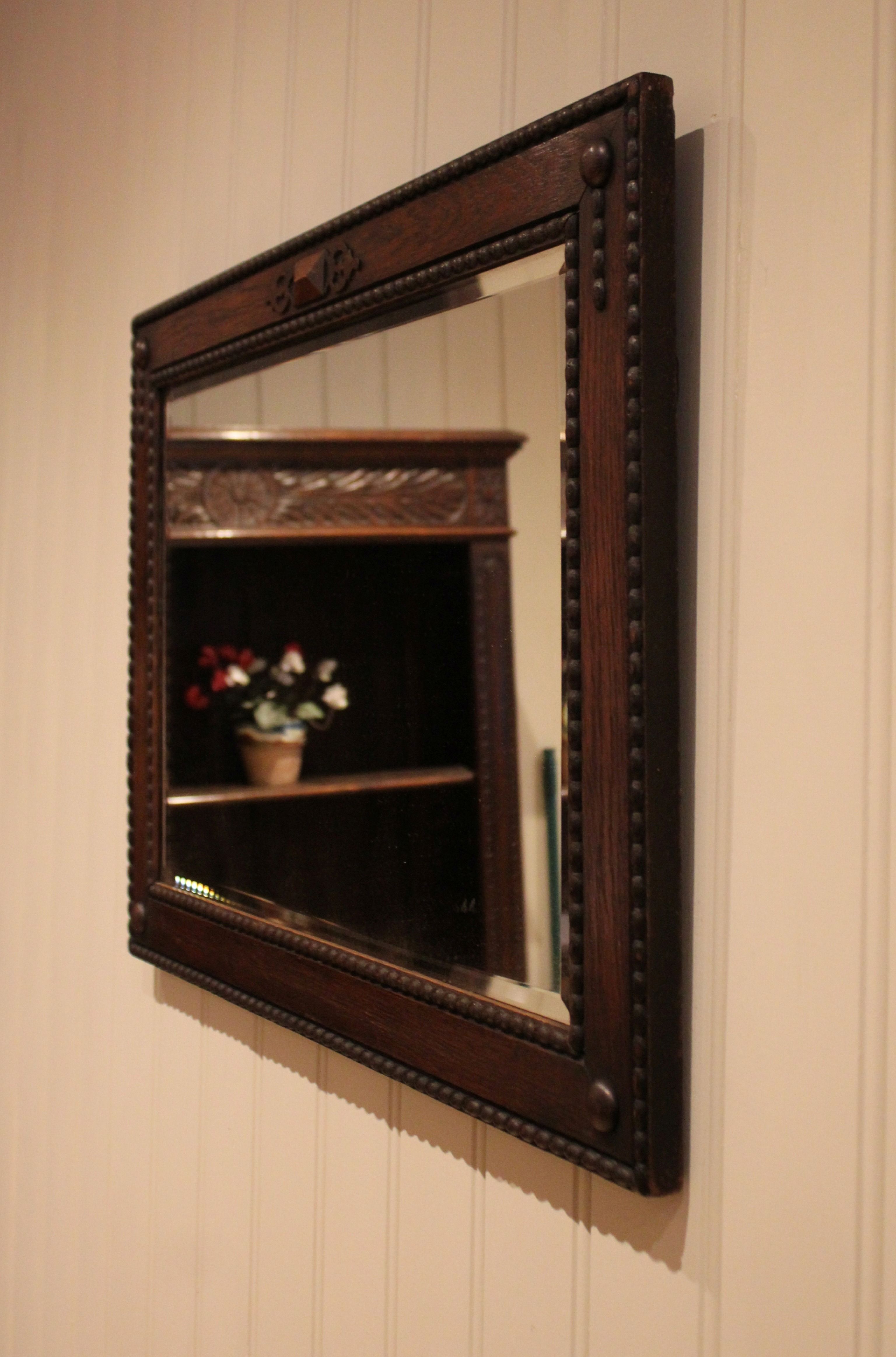 Rectangular oak framed wall mirror , having an inset bevel edge mirror with a solid oak frame with applied carved decoration .