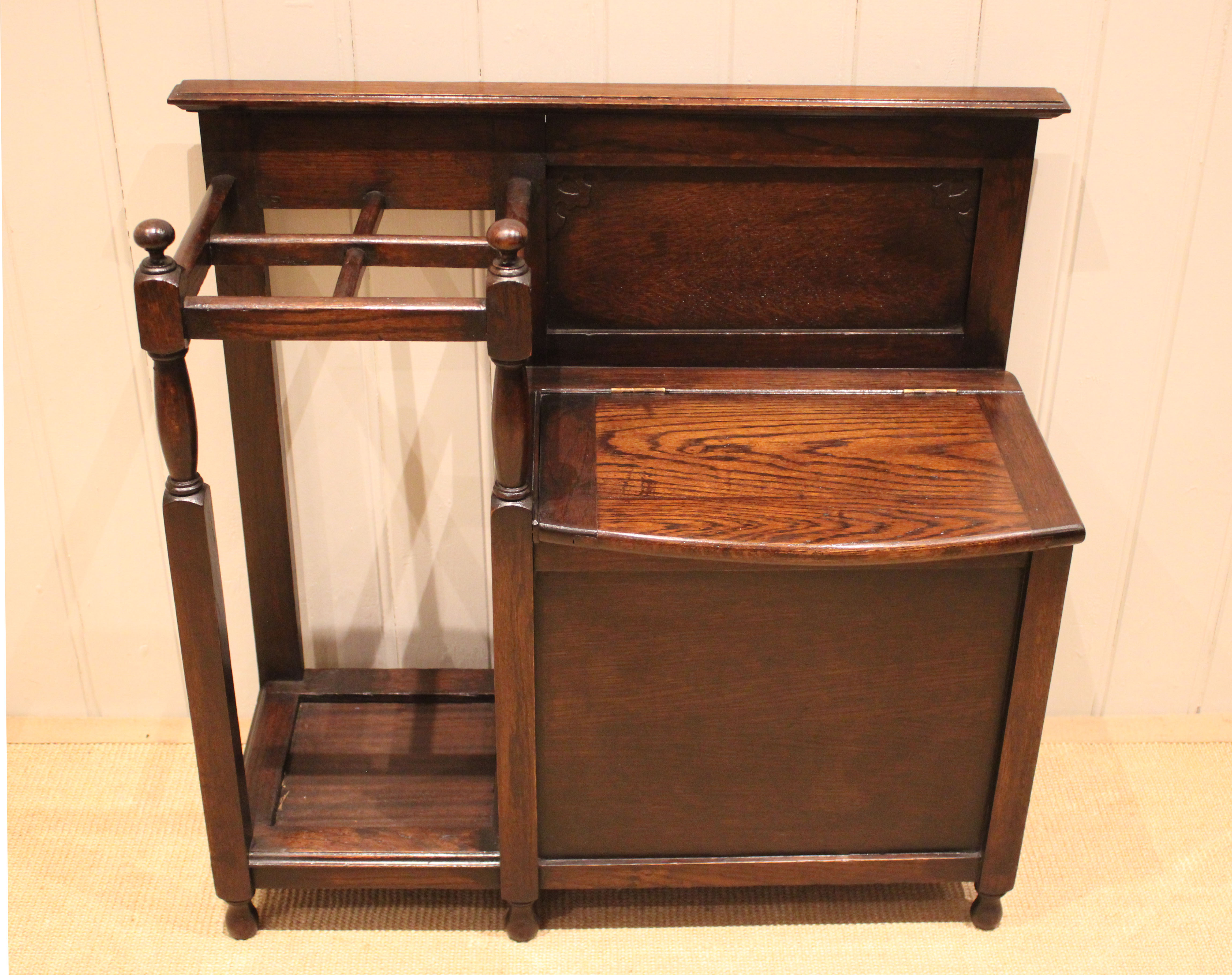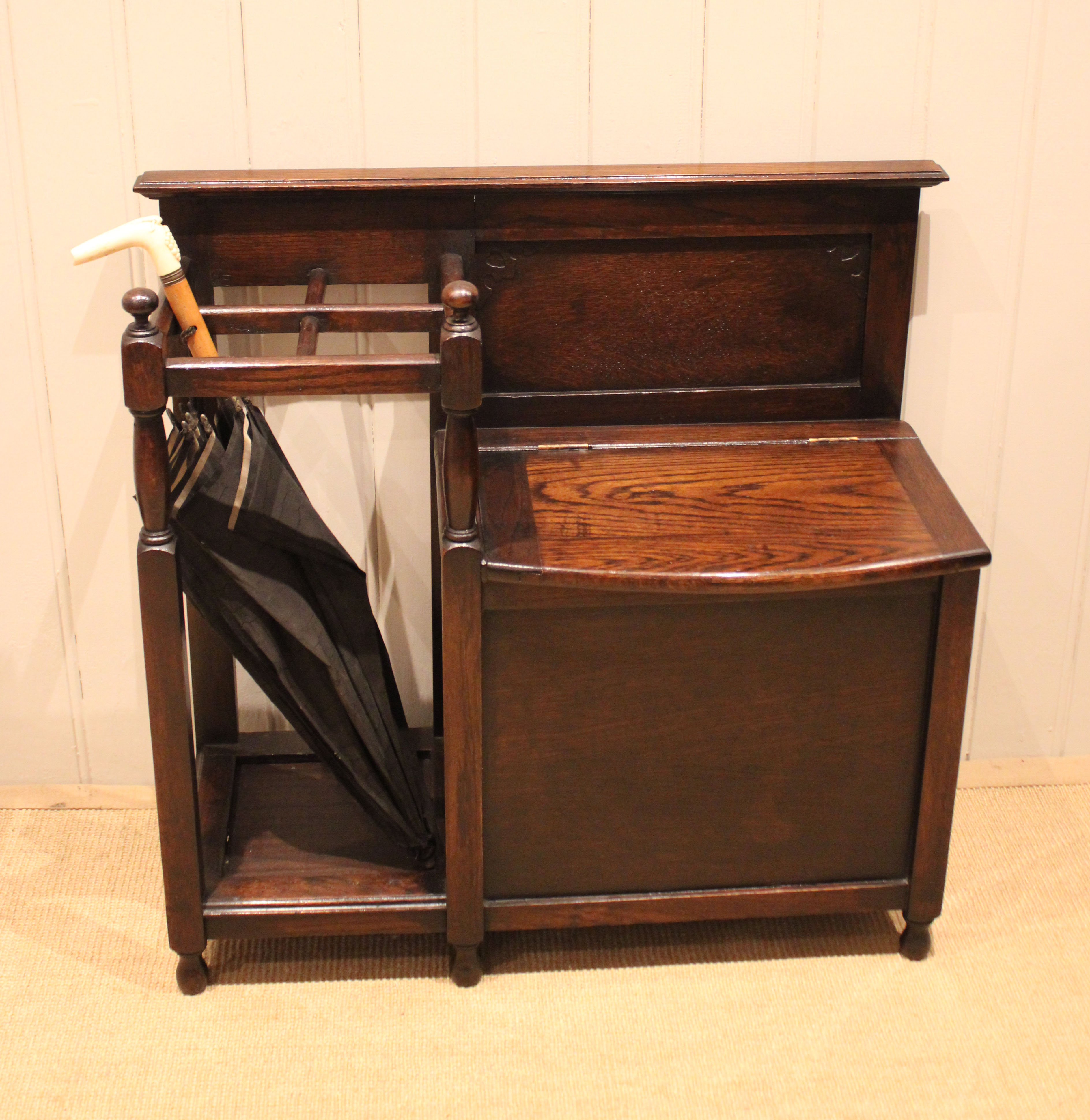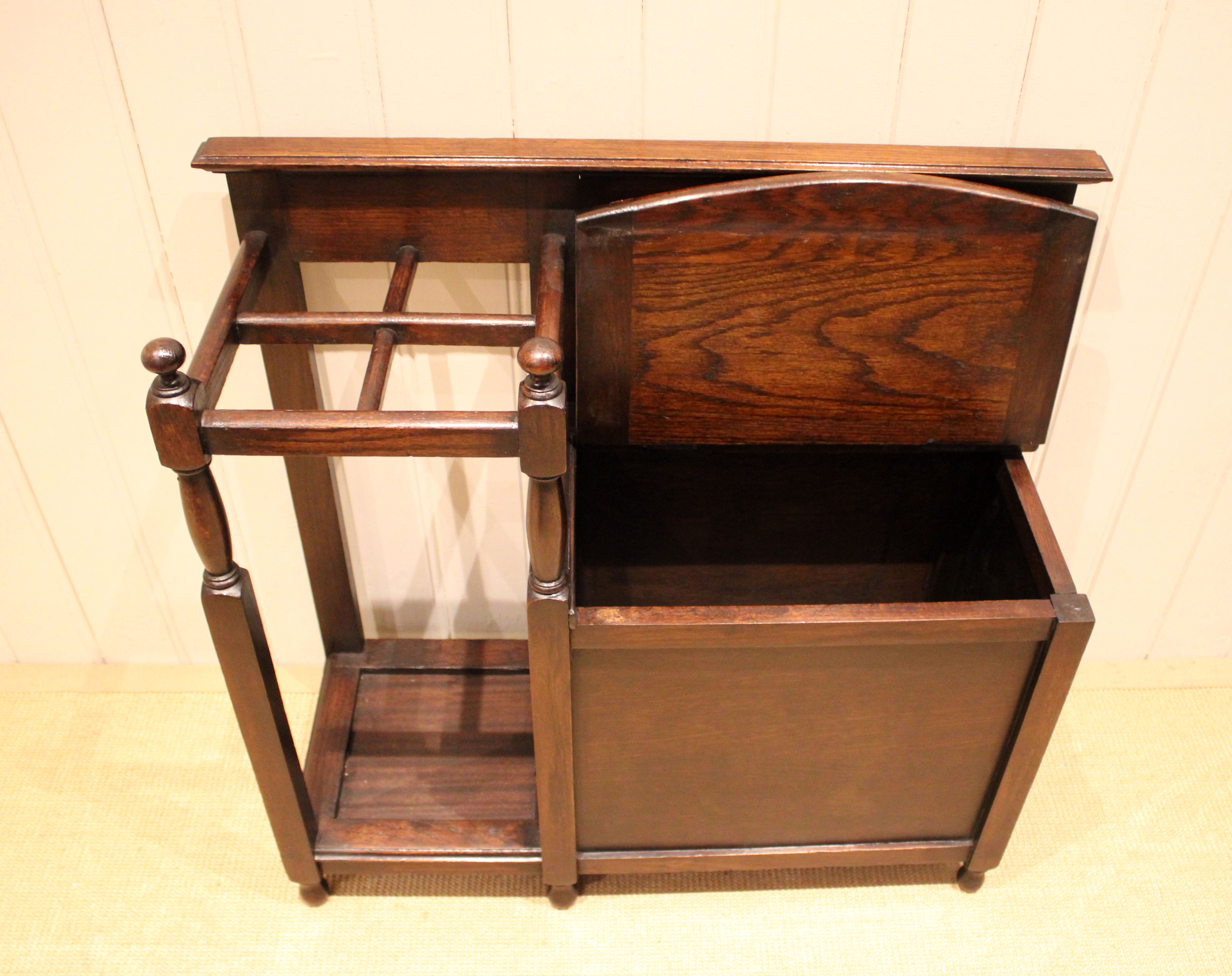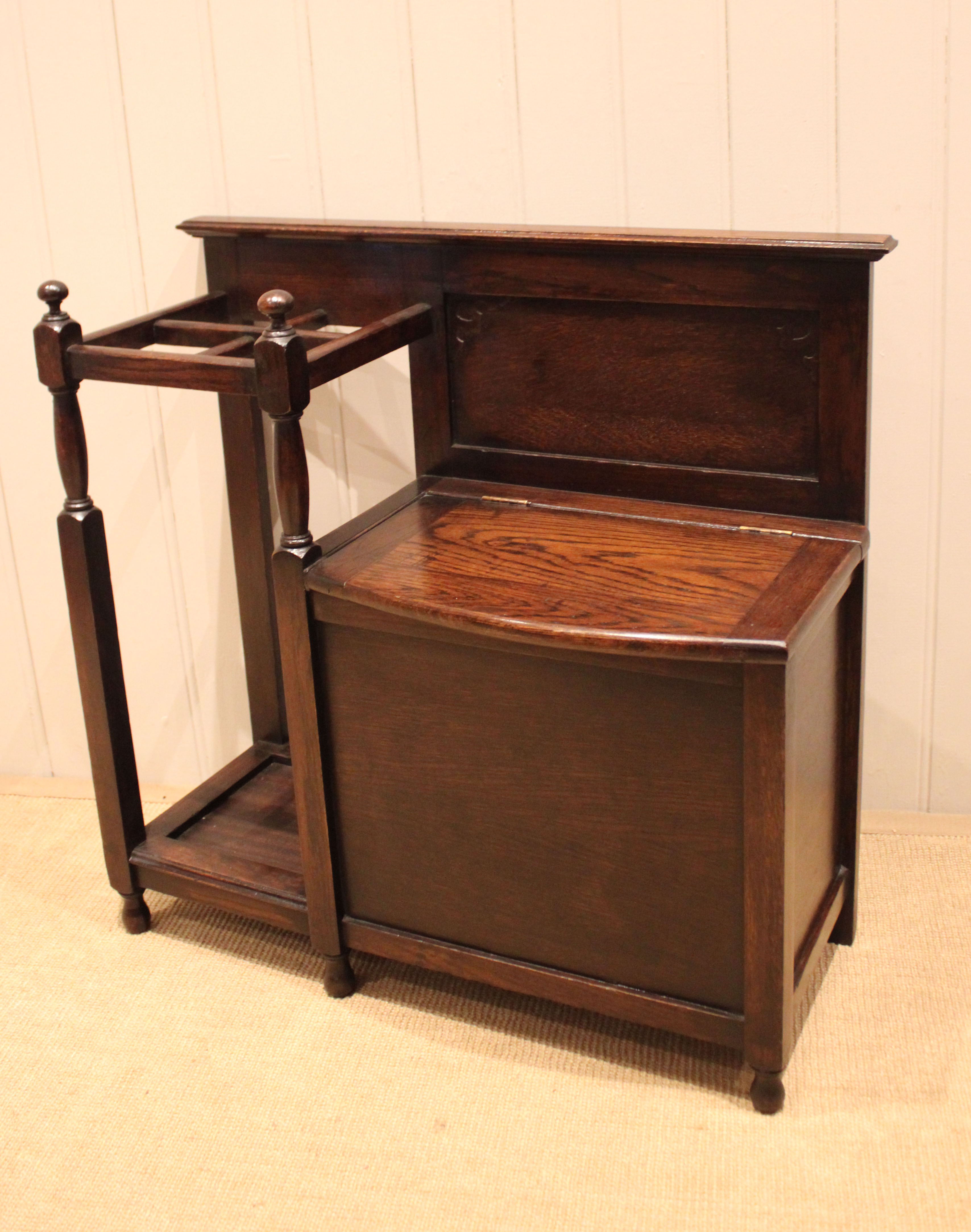 Oak hall bench having a lift up seat for storage , beside a sectioned stand for sticks and umbrellas . The storage section is 36 cm deep .