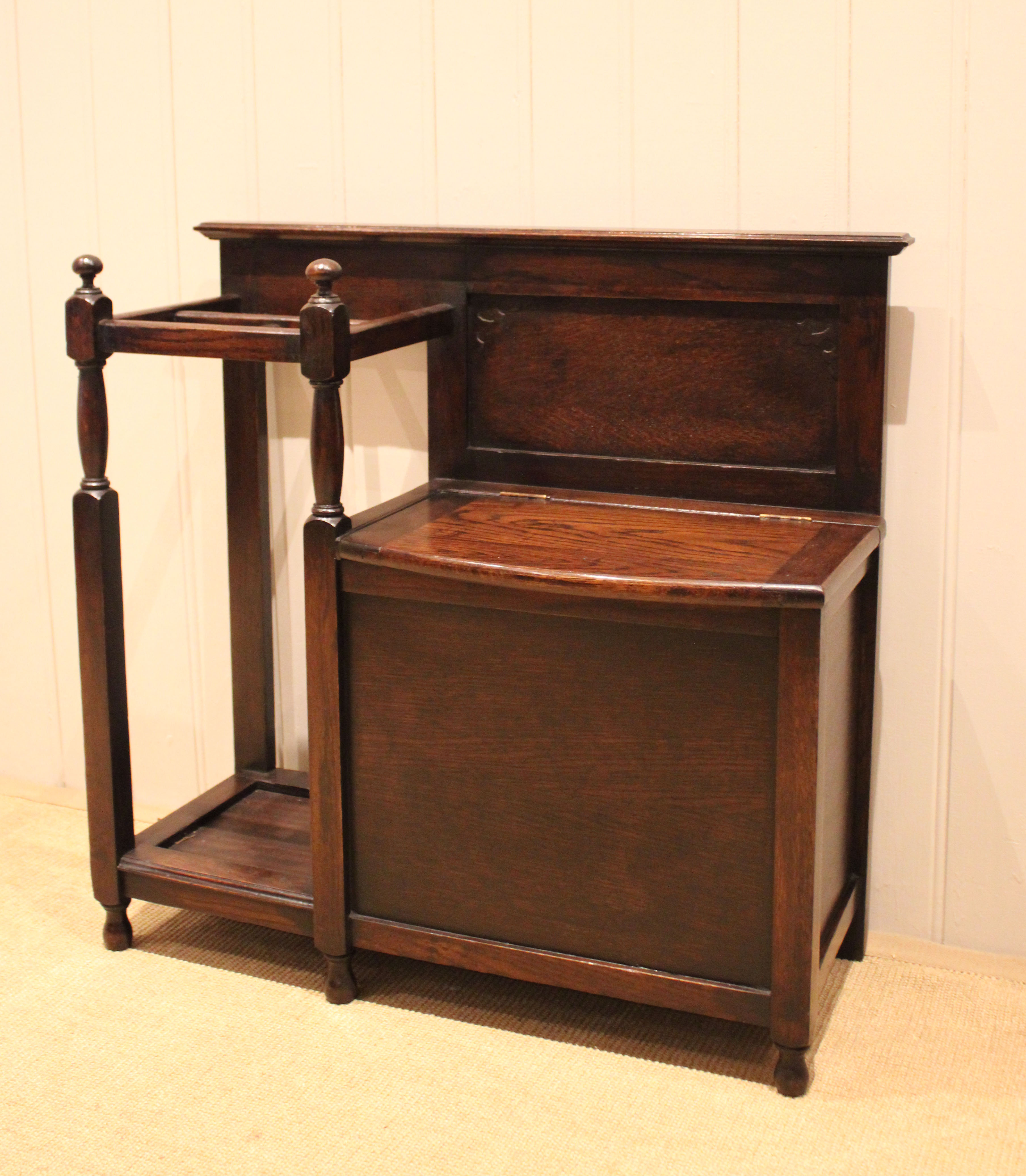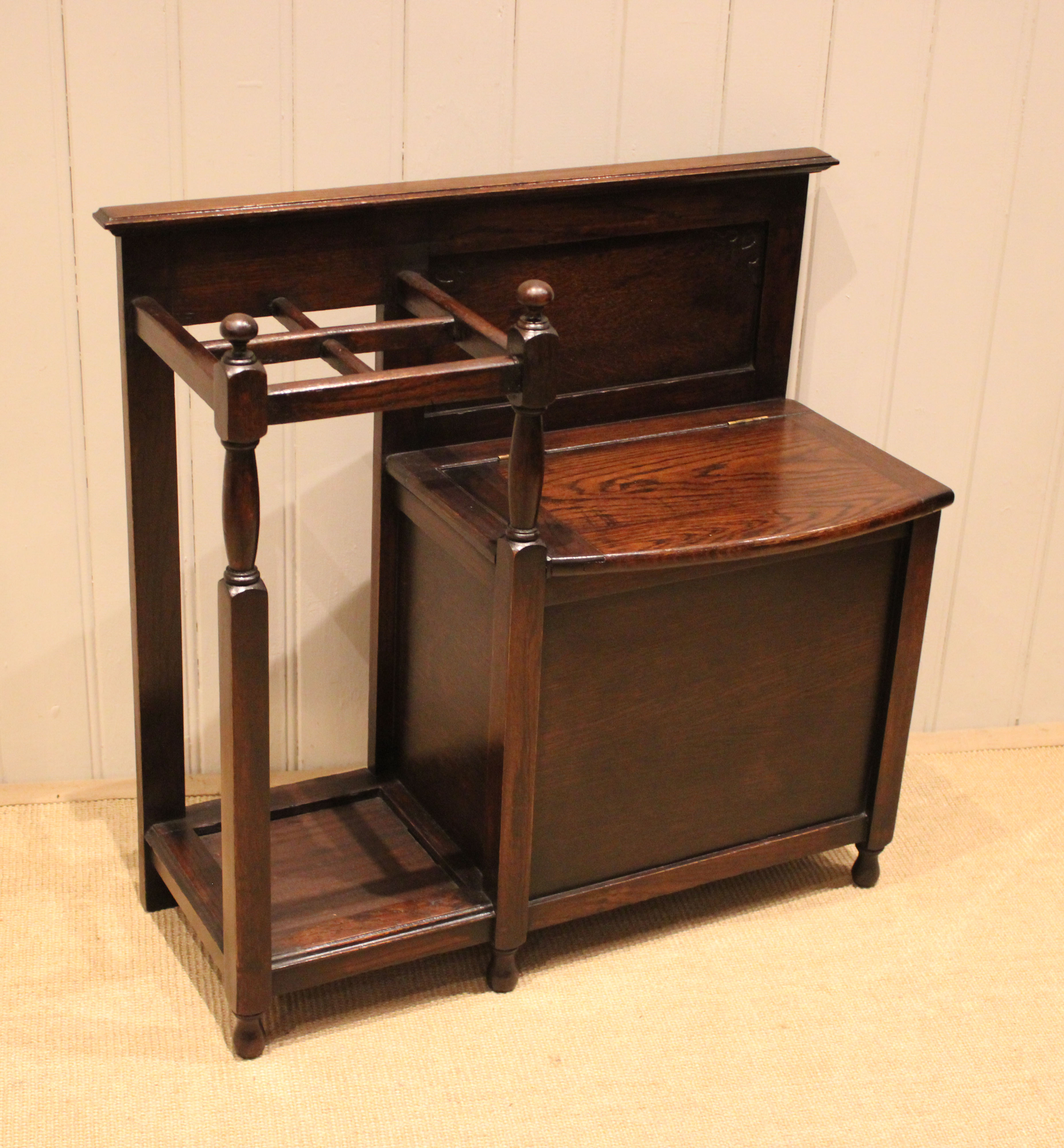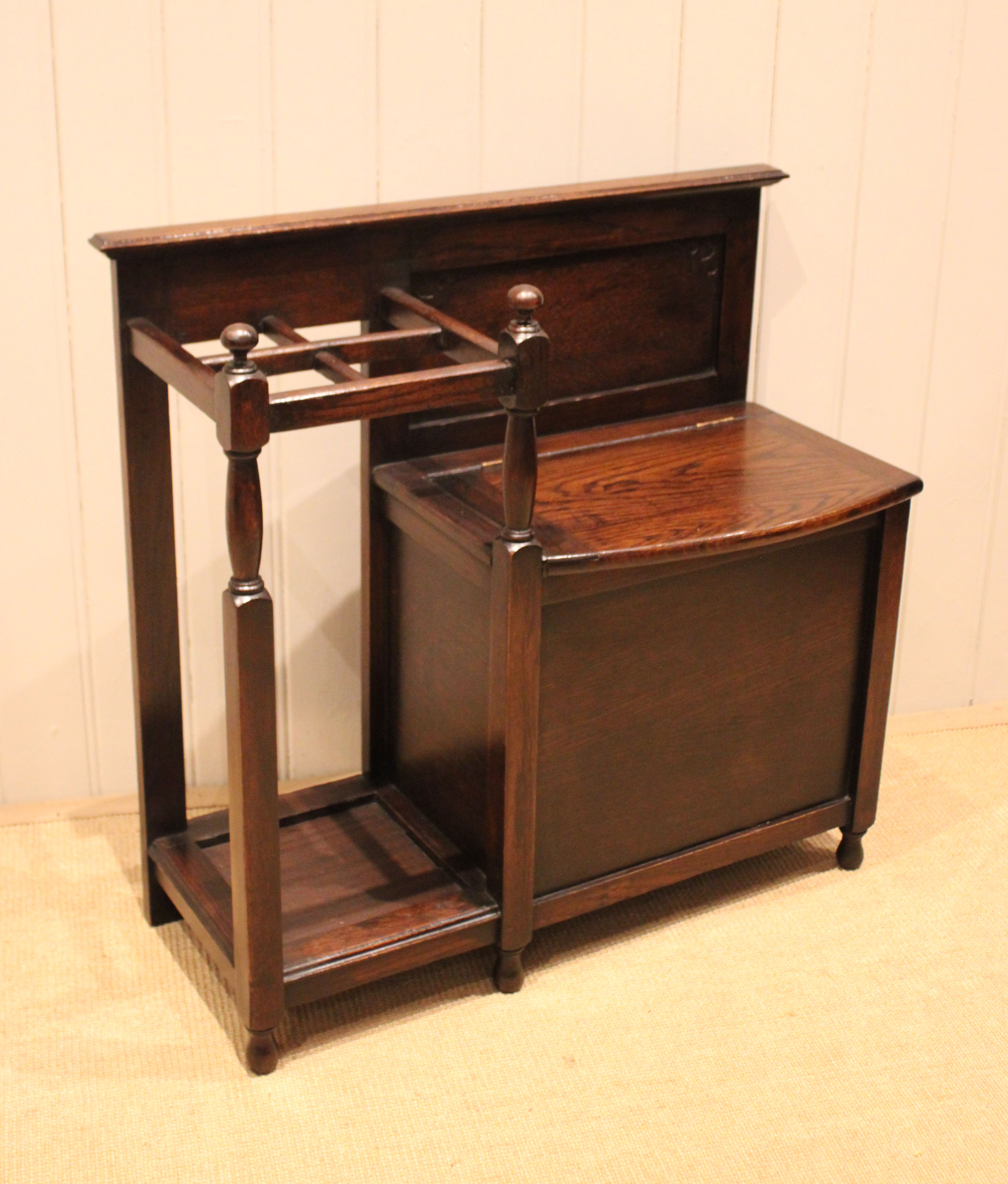 Oak hall bench having a lift up seat for storage , beside a sectioned stand for sticks and umbrellas . The storage section is 36 cm deep .