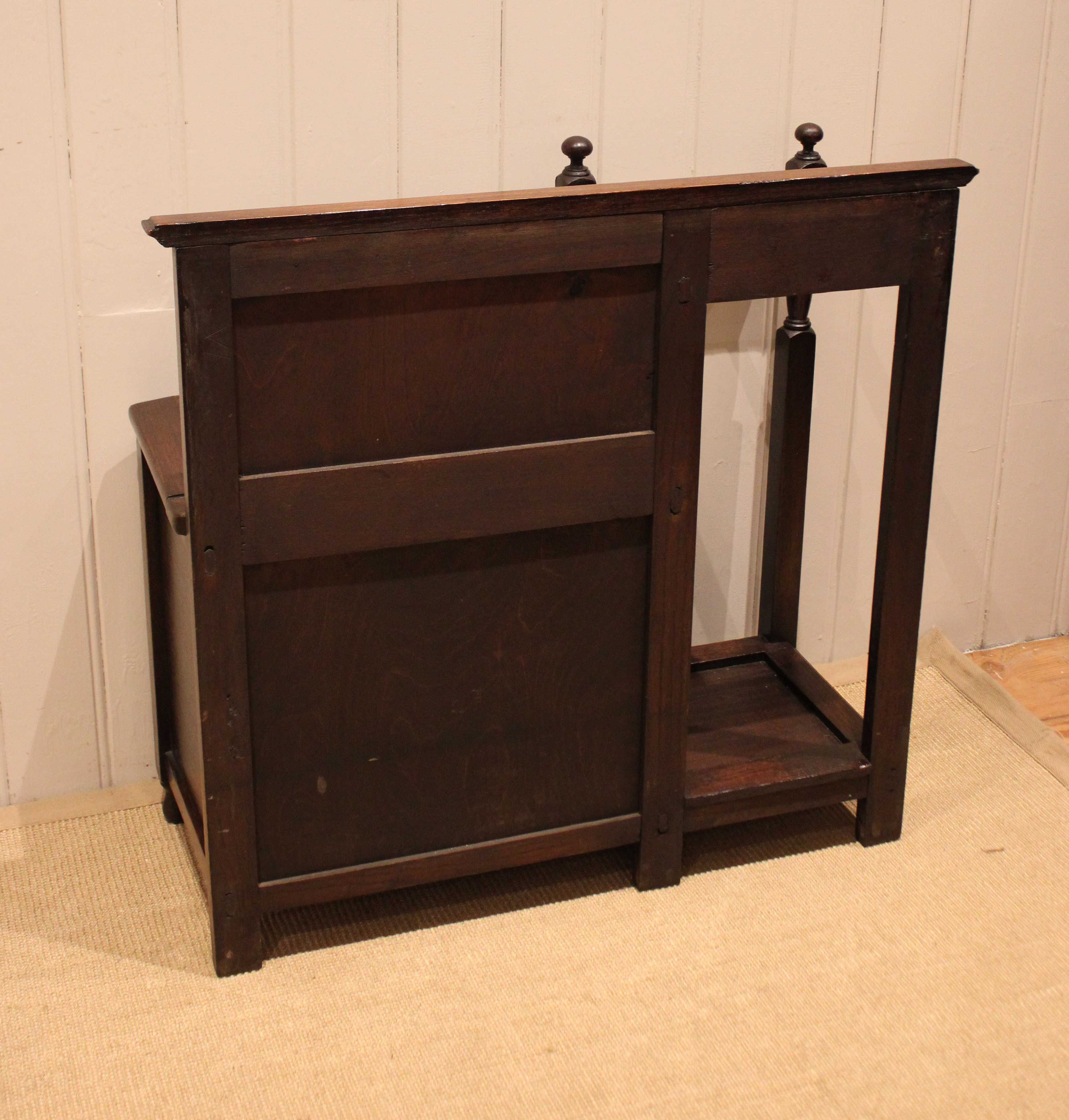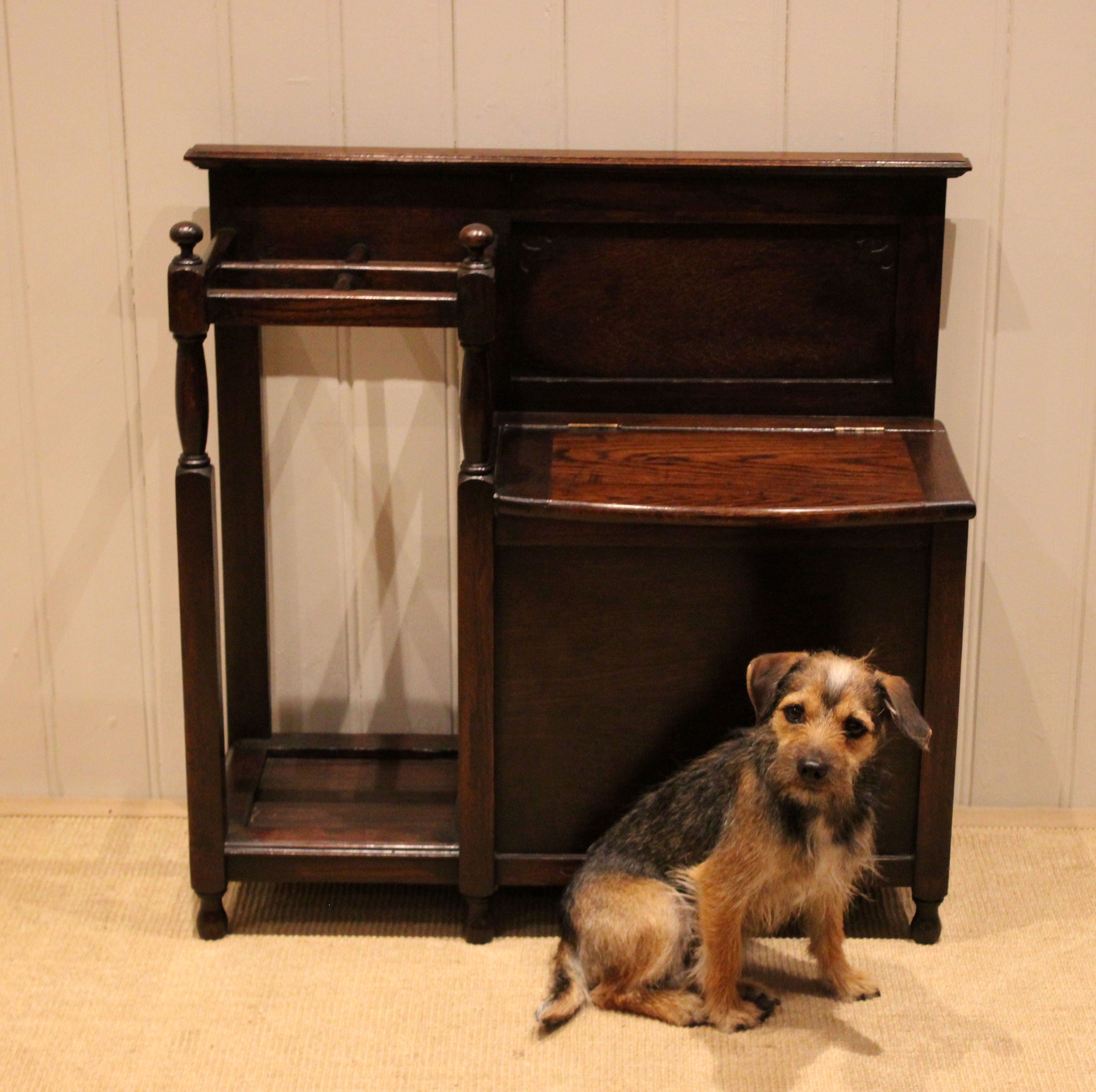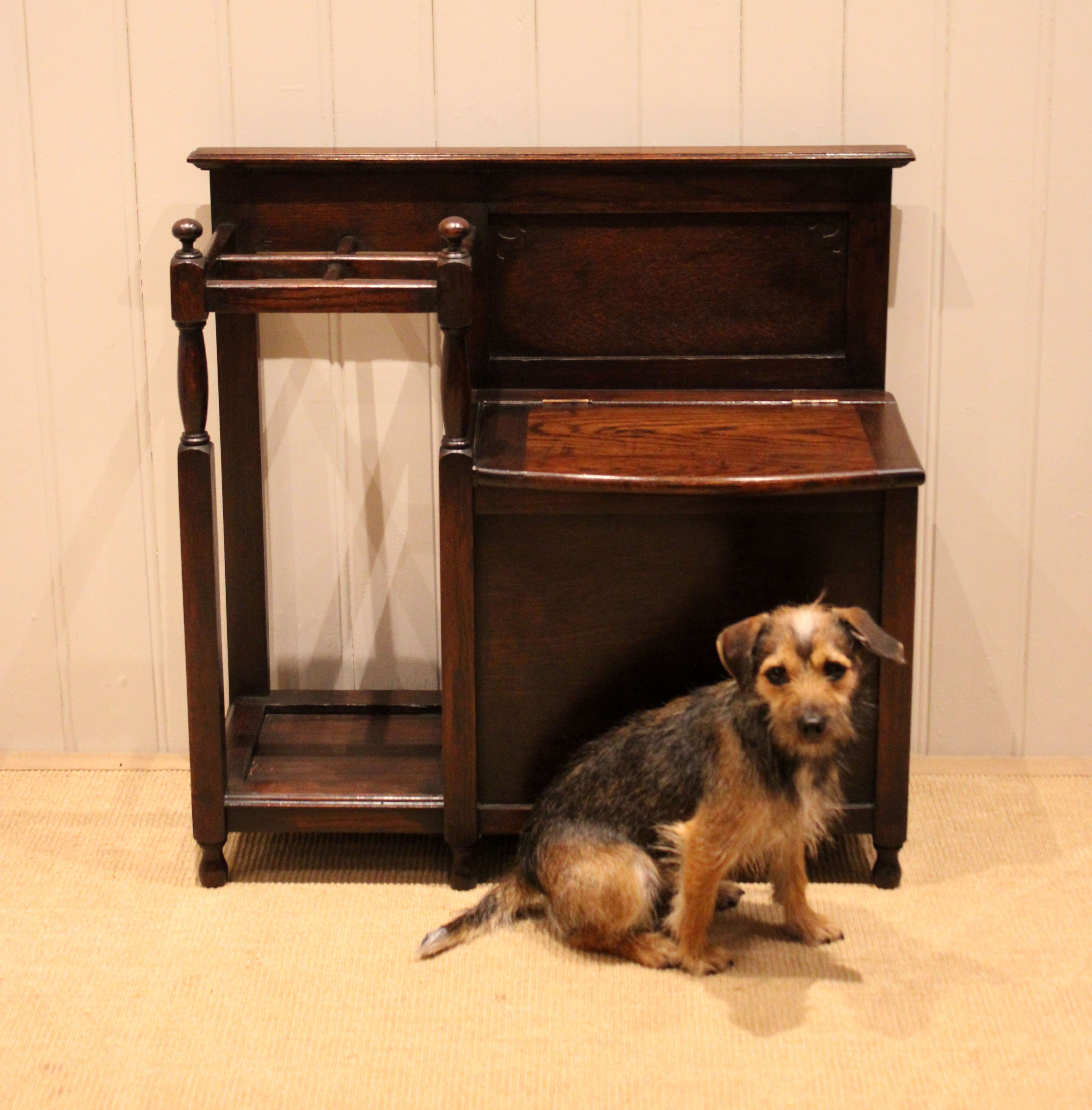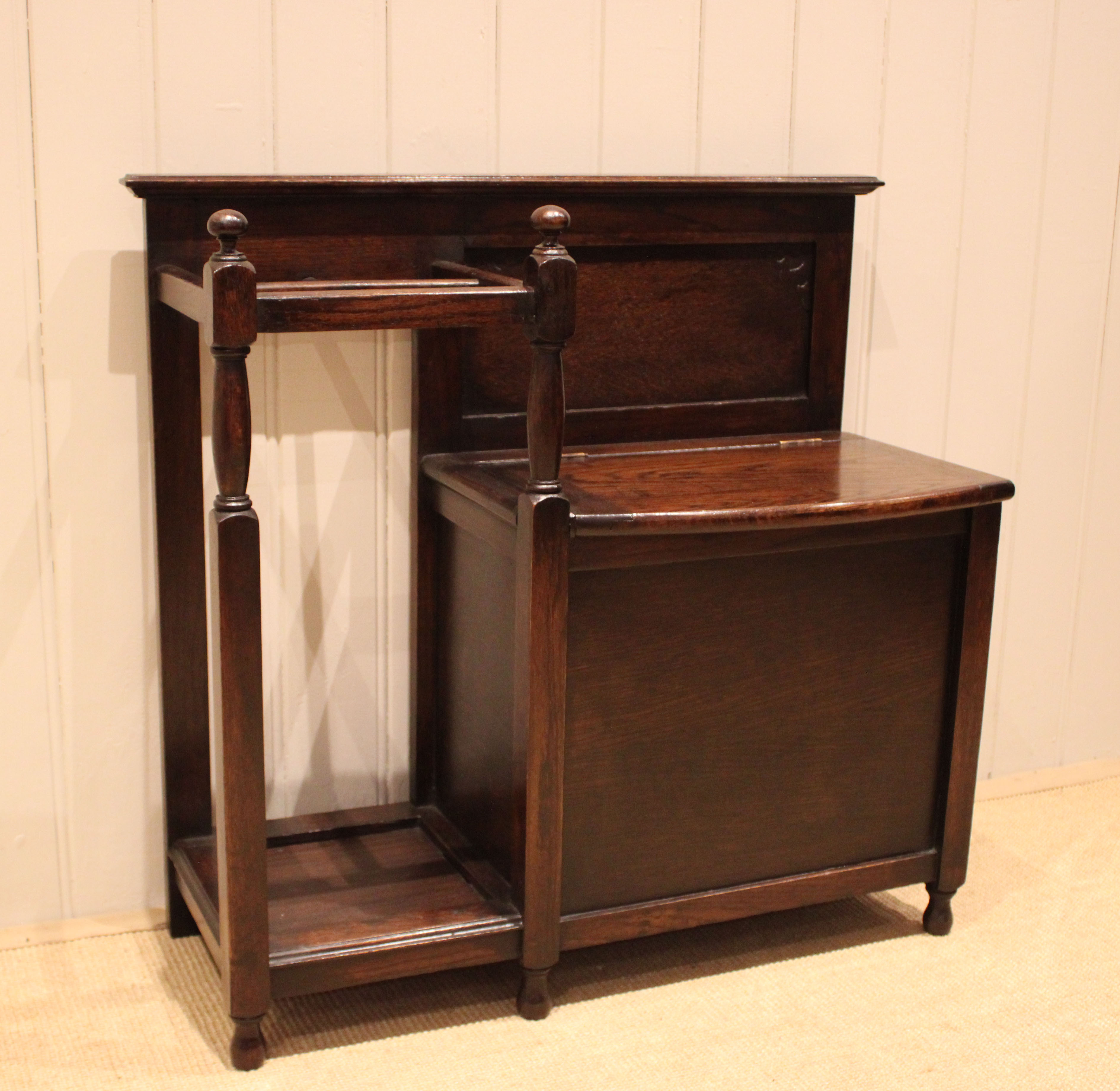 Oak hall bench having a lift up seat for storage , beside a sectioned stand for sticks and umbrellas . The storage section is 36 cm deep .