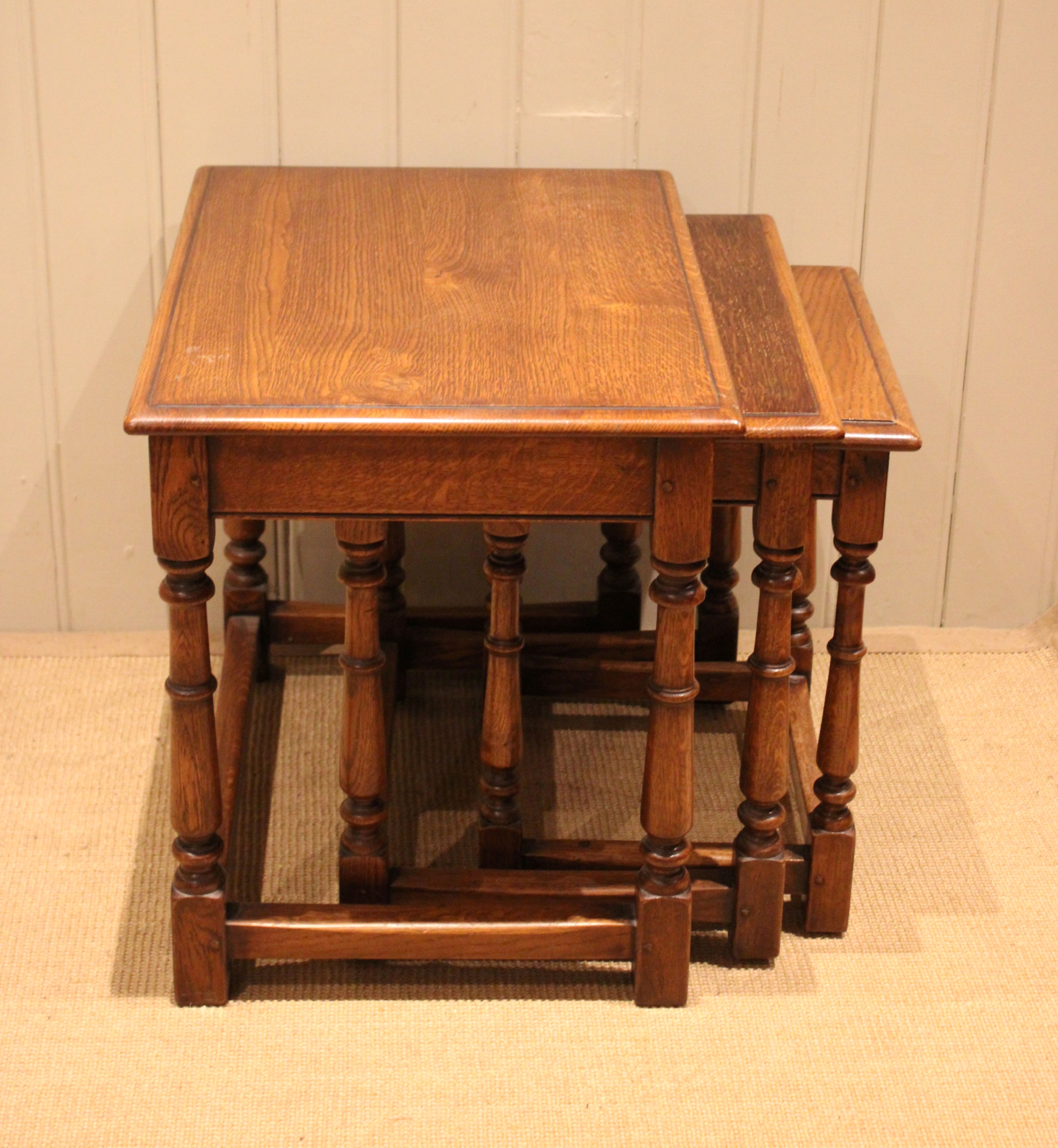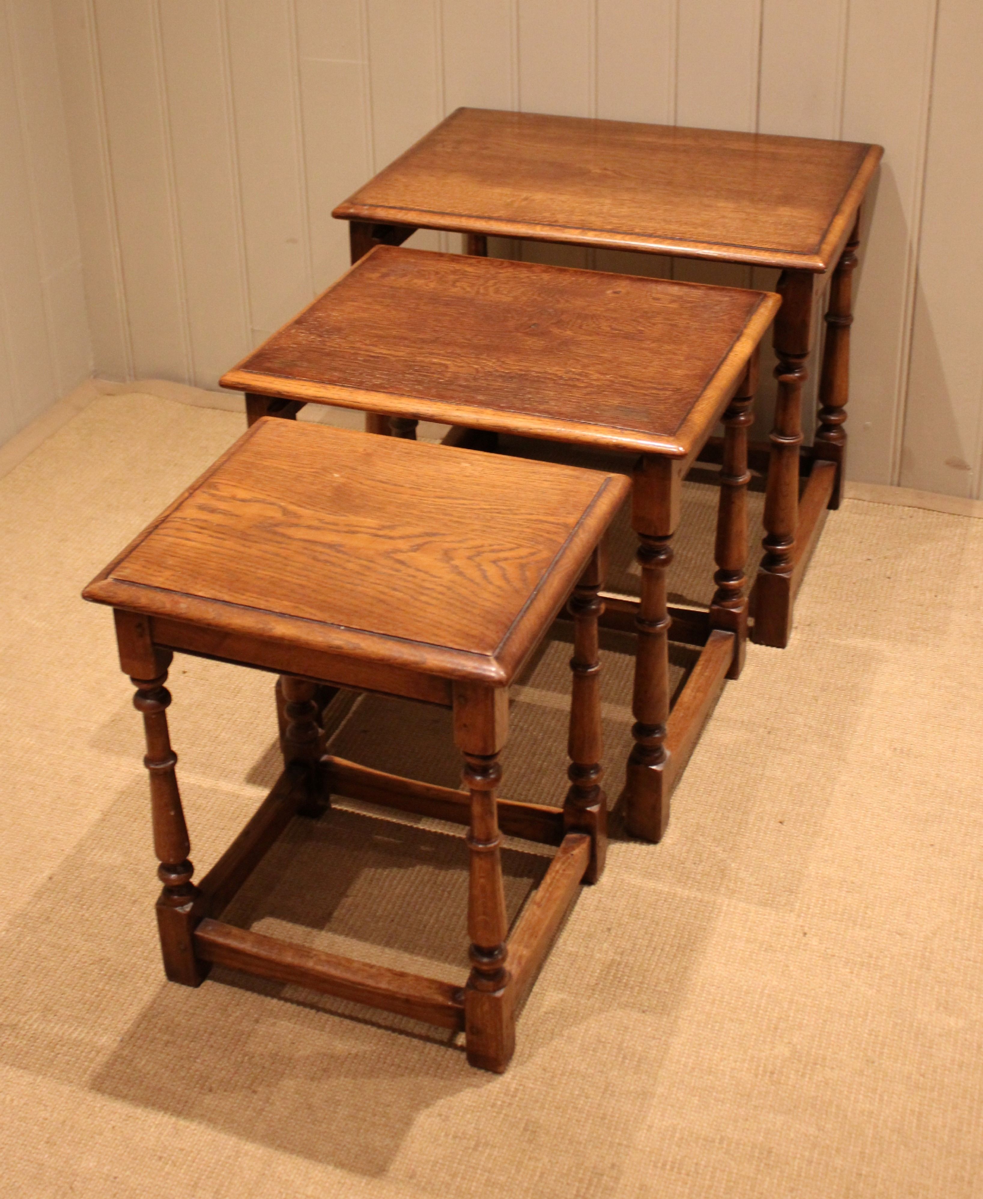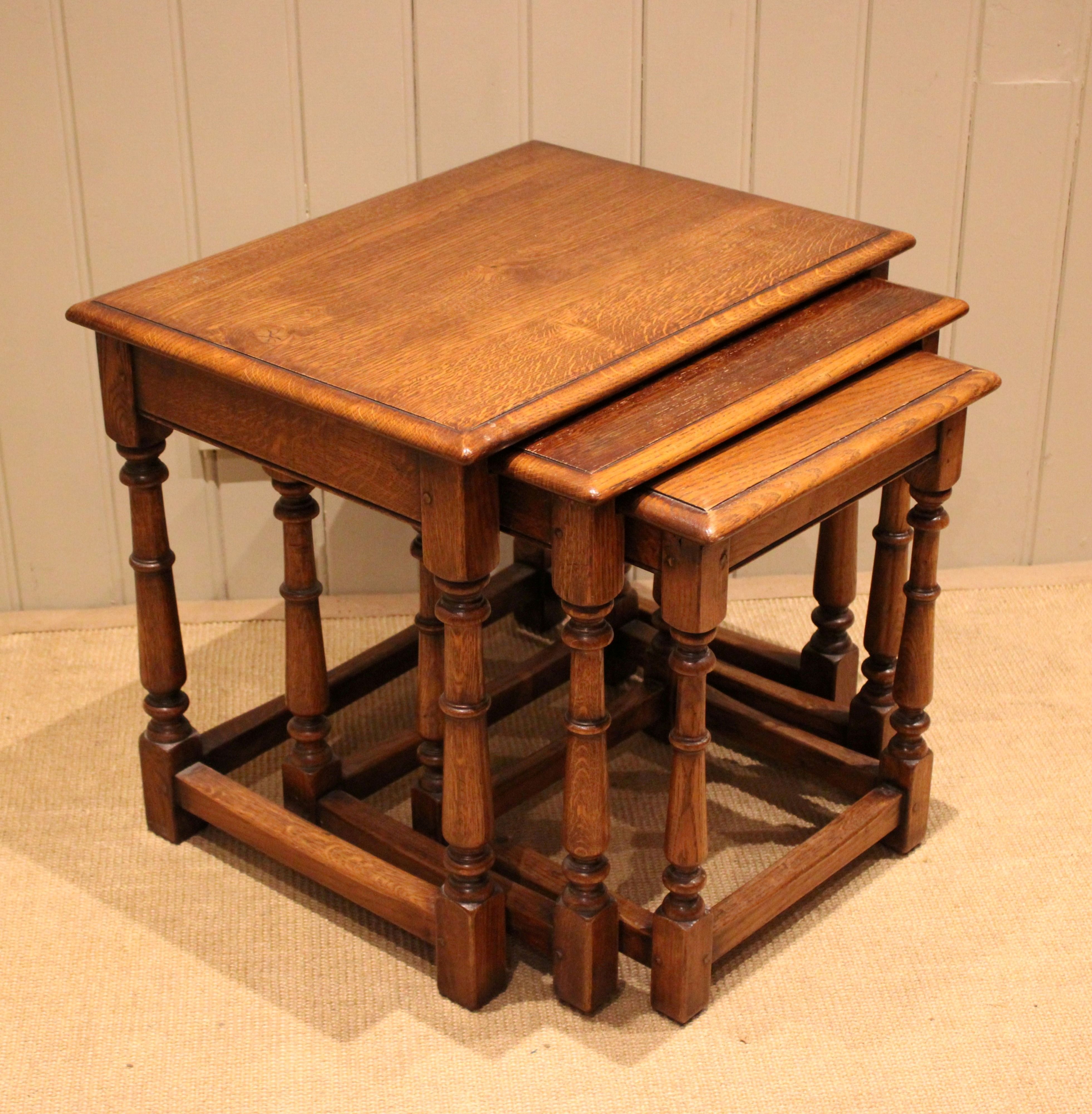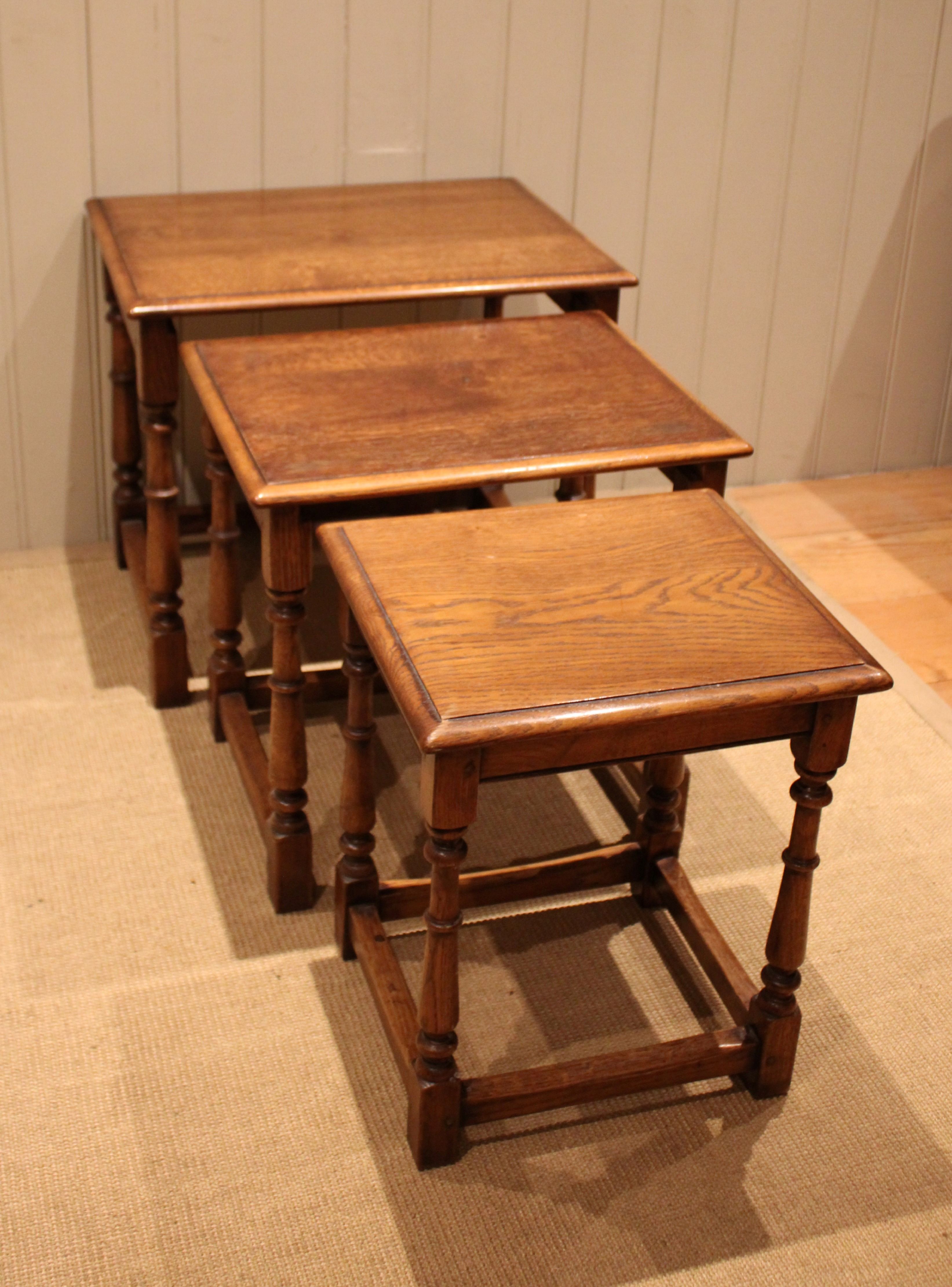 Heavy solid oak nest of three tables having substantial turned legs united by stretchers . The middle table is 50 cm high 51 cm wide and 40.5 cm deep , the small table is 47 cm high 40 cm wide and 36 cm deep
