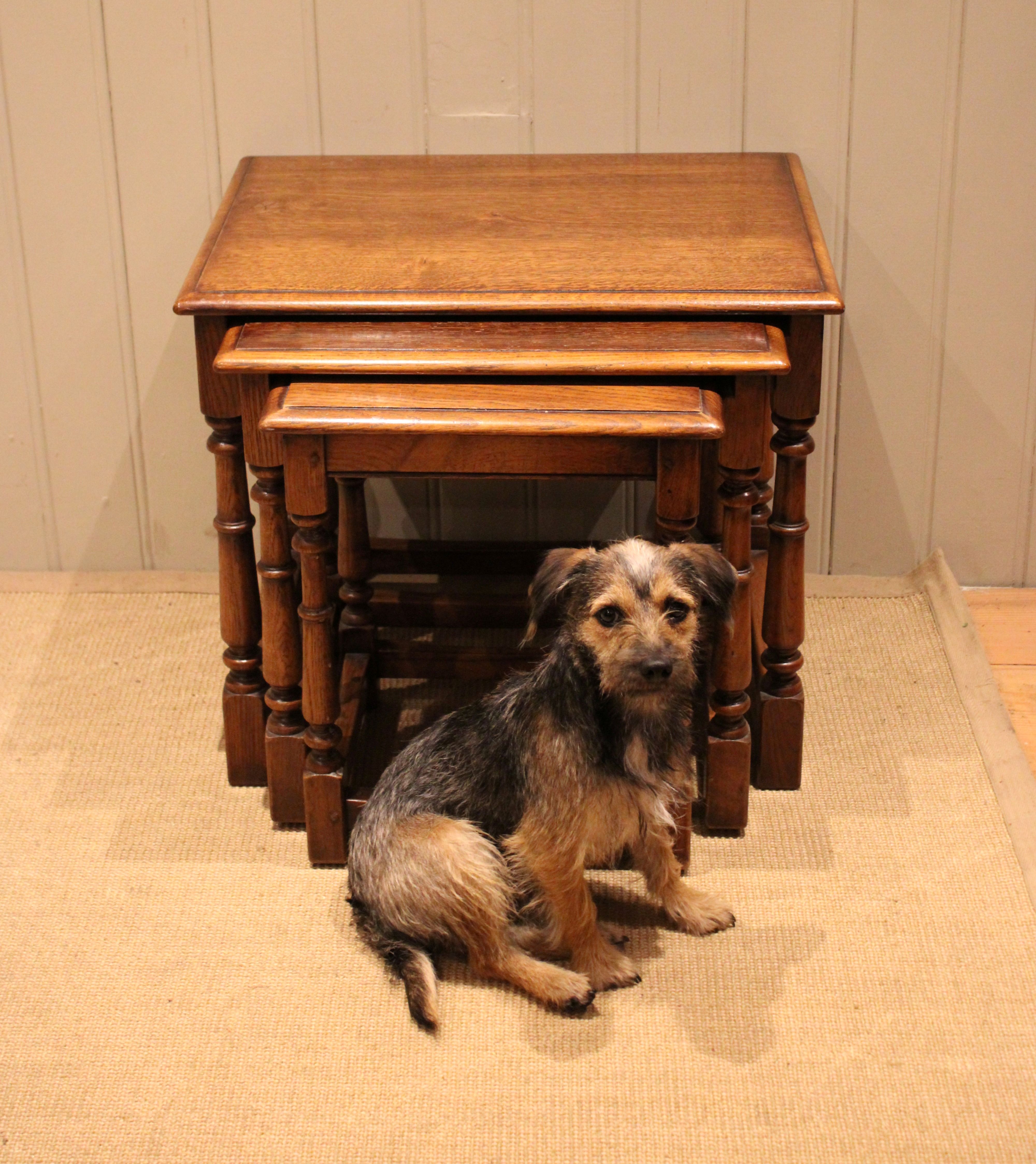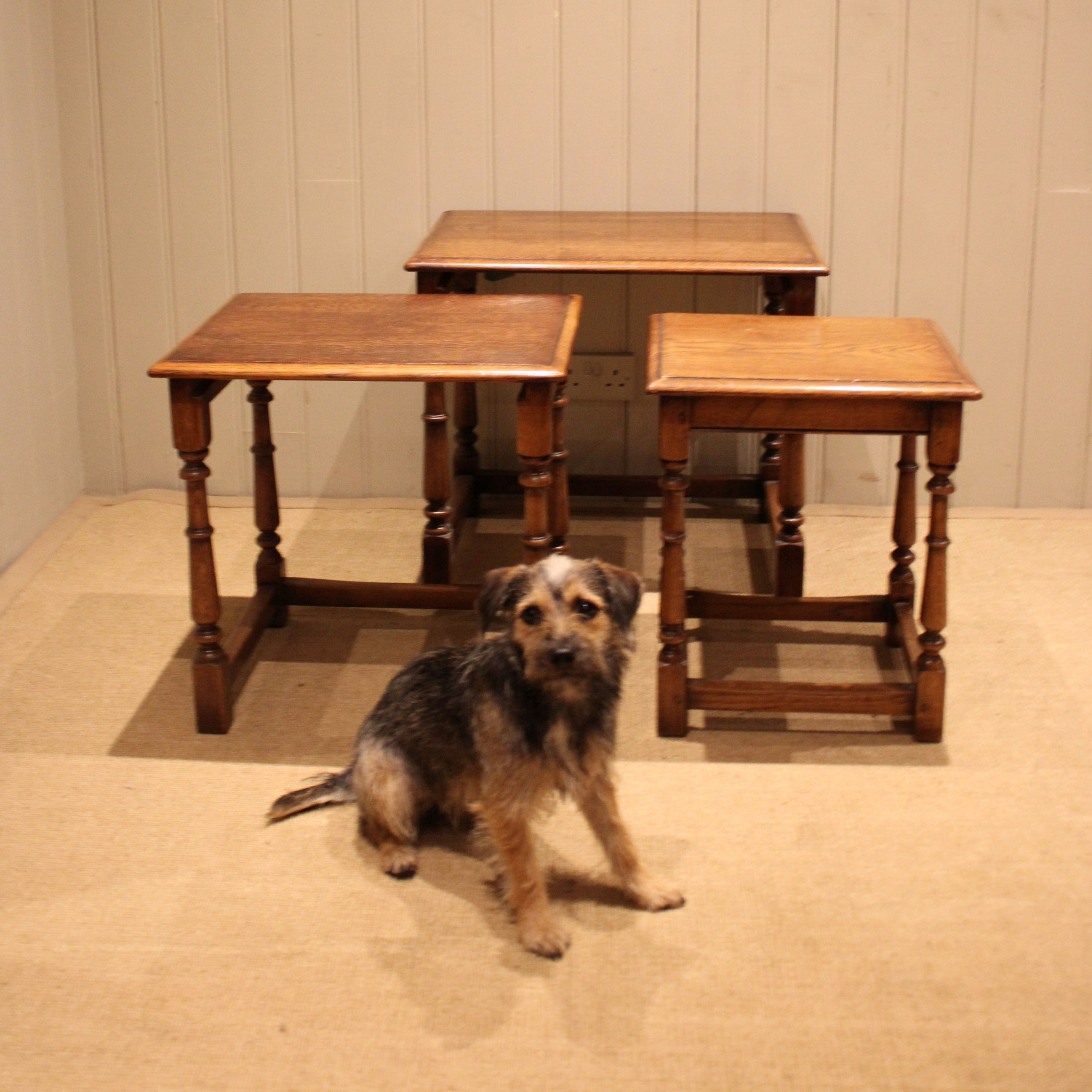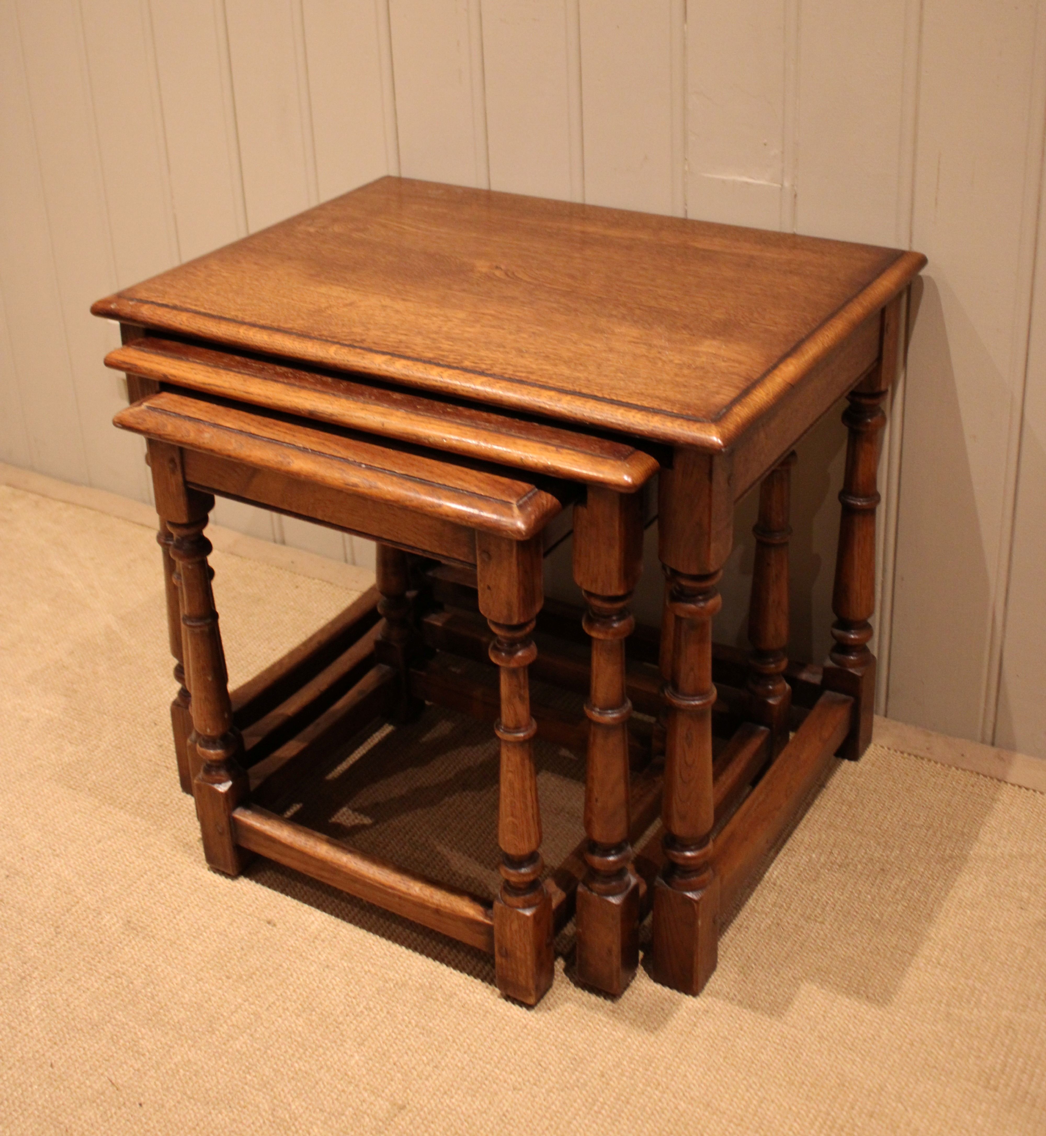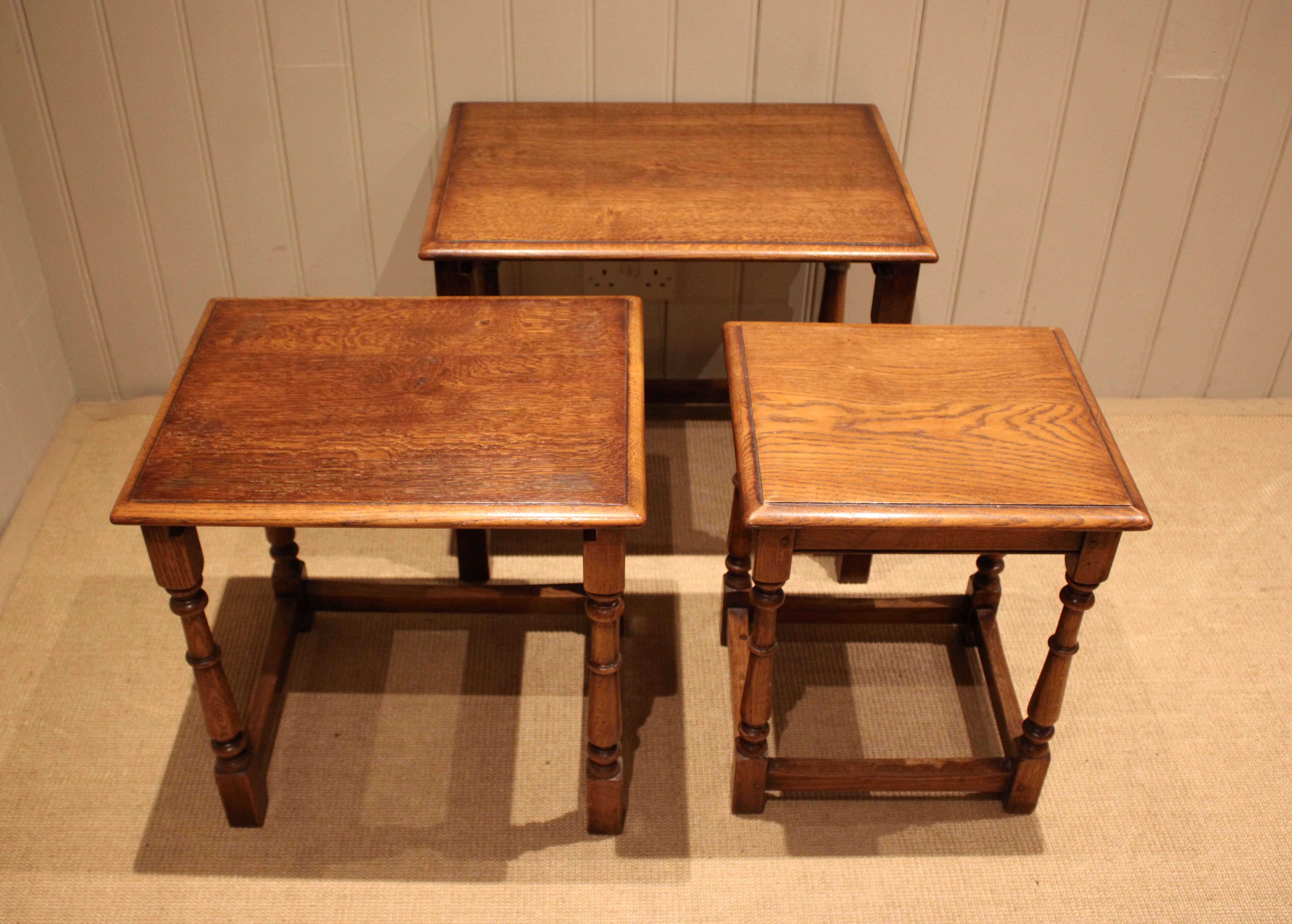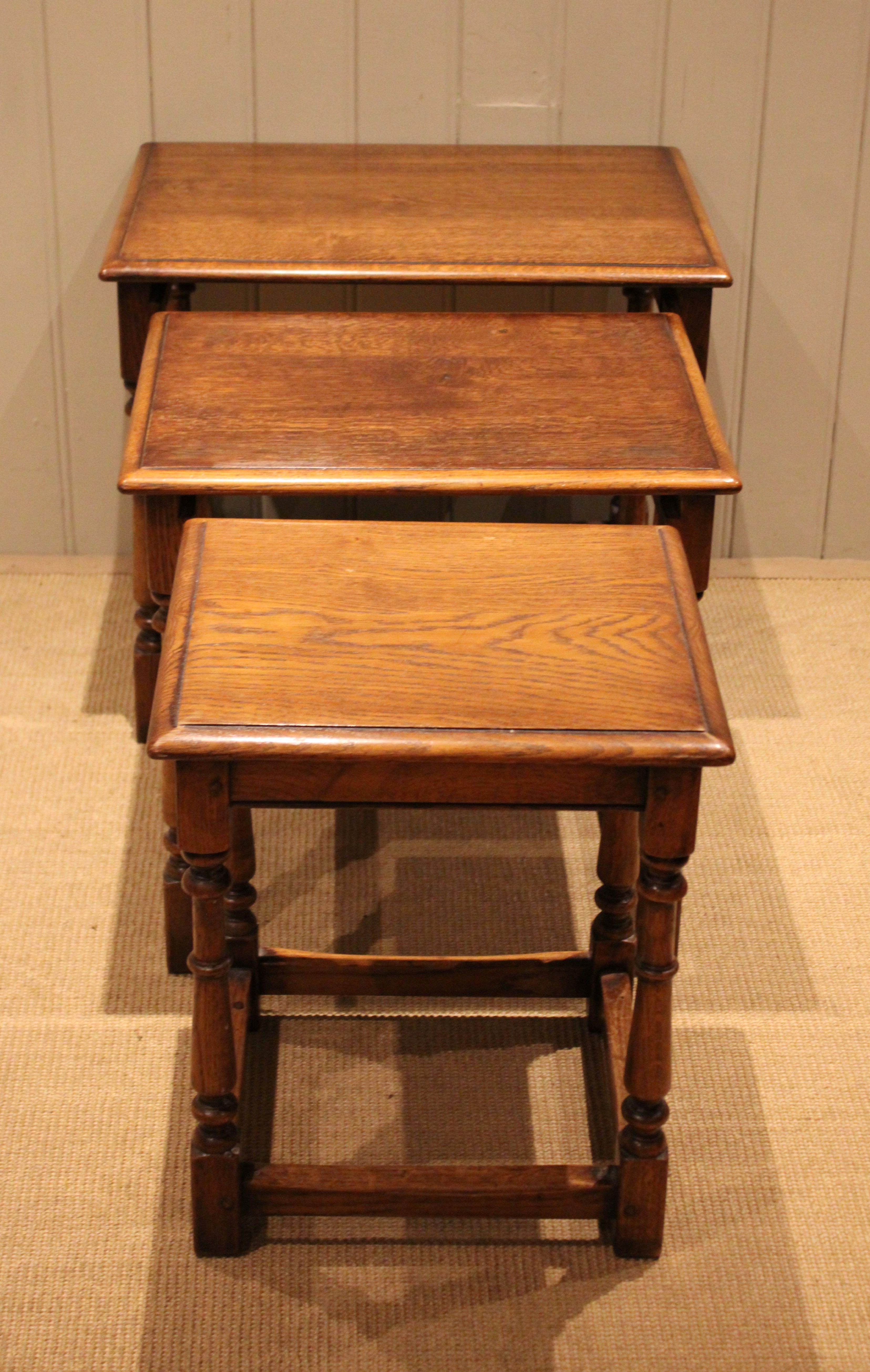Heavy solid oak nest of three tables having substantial turned legs united by stretchers . The middle table is 50 cm high 51 cm wide and 40.5 cm deep , the small table is 47 cm high 40 cm wide and 36 cm deep