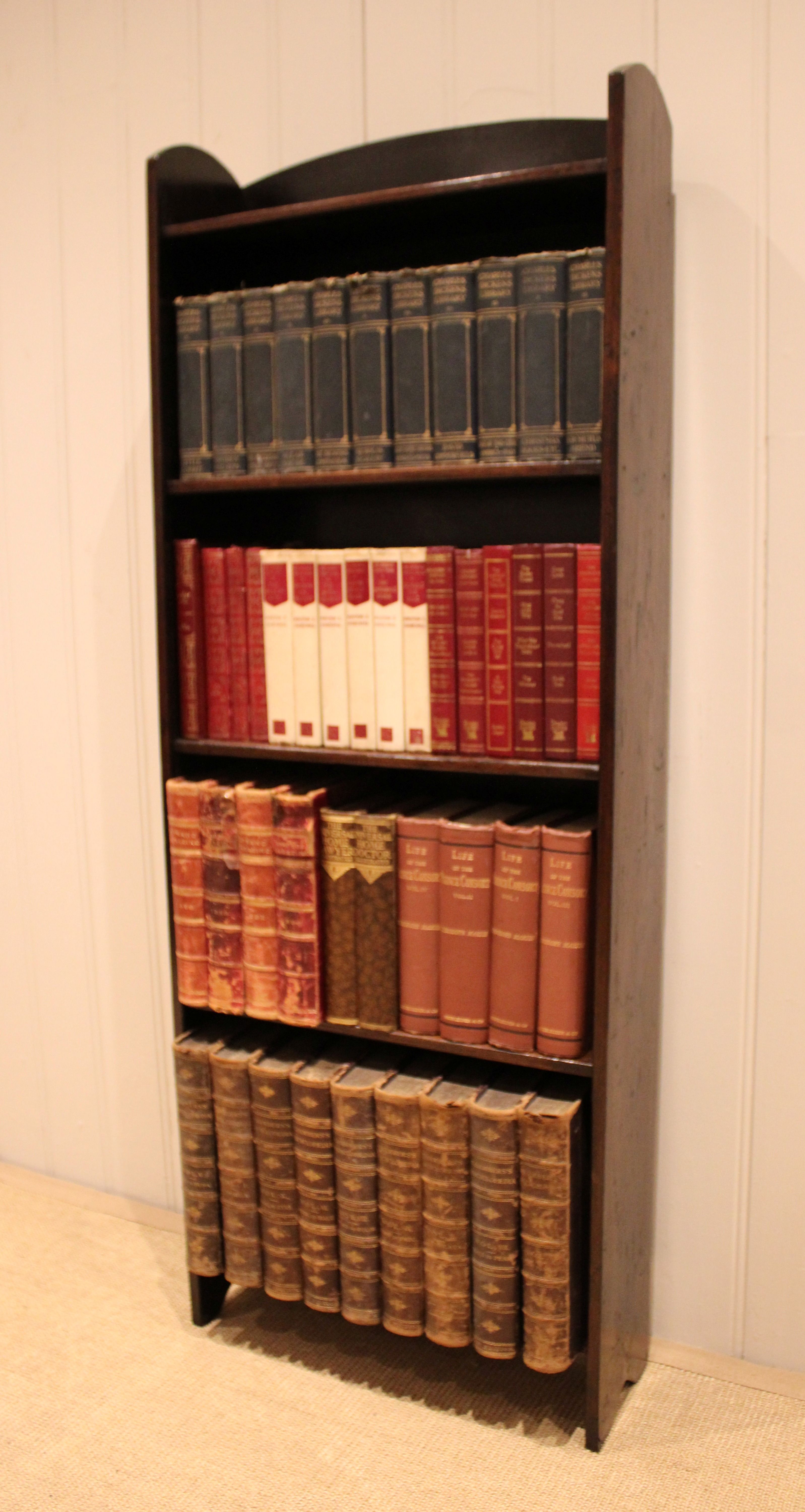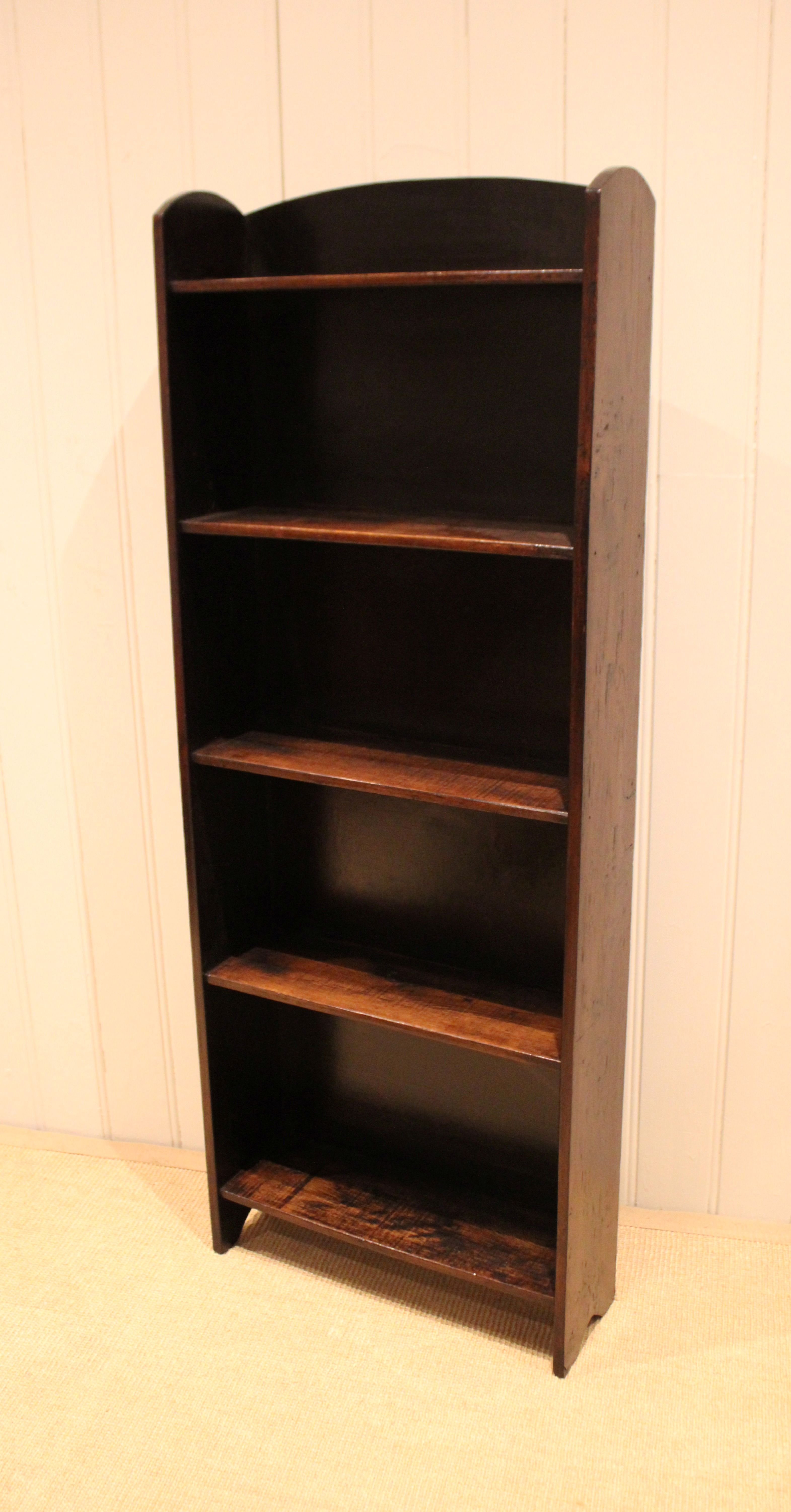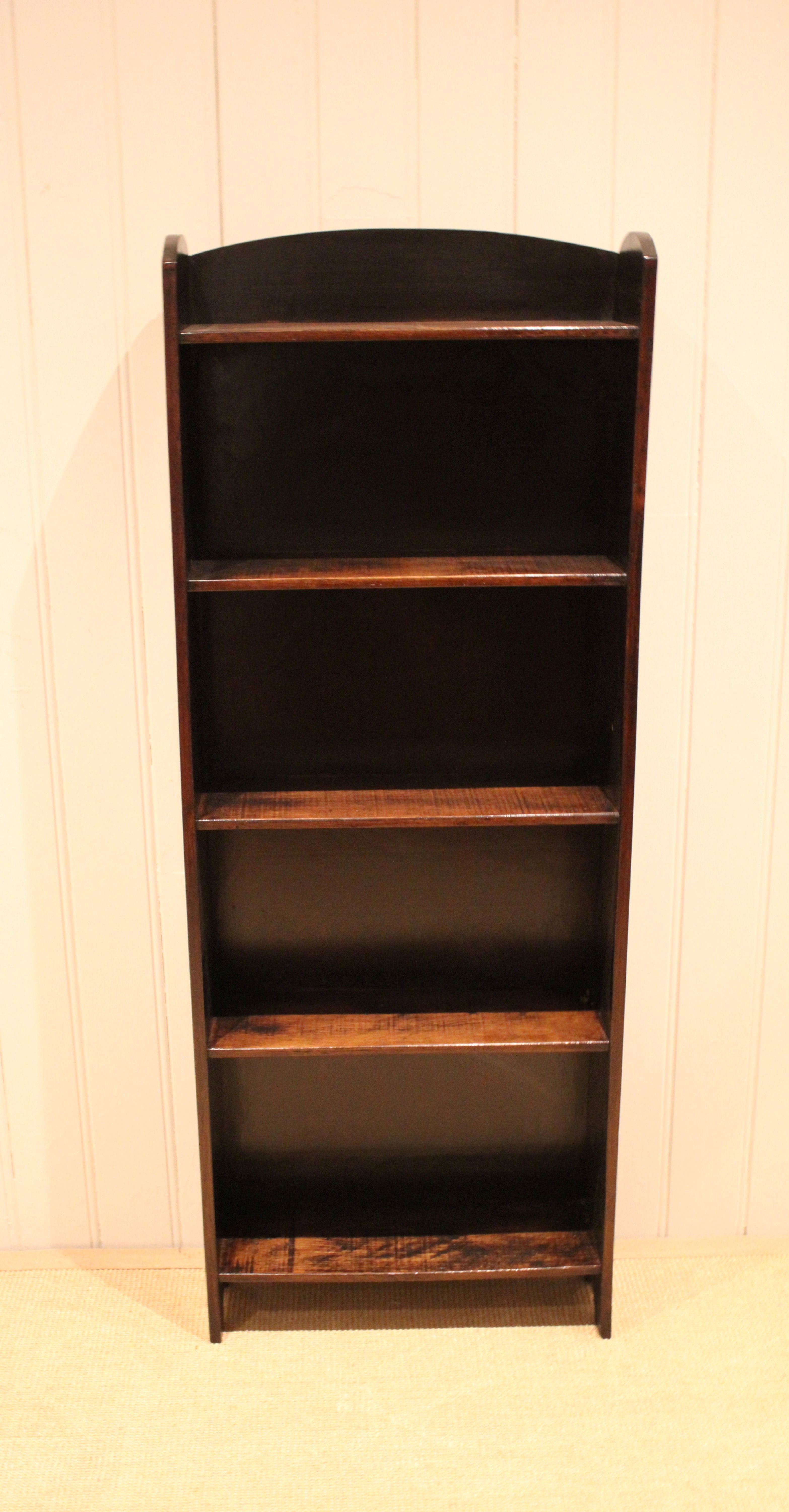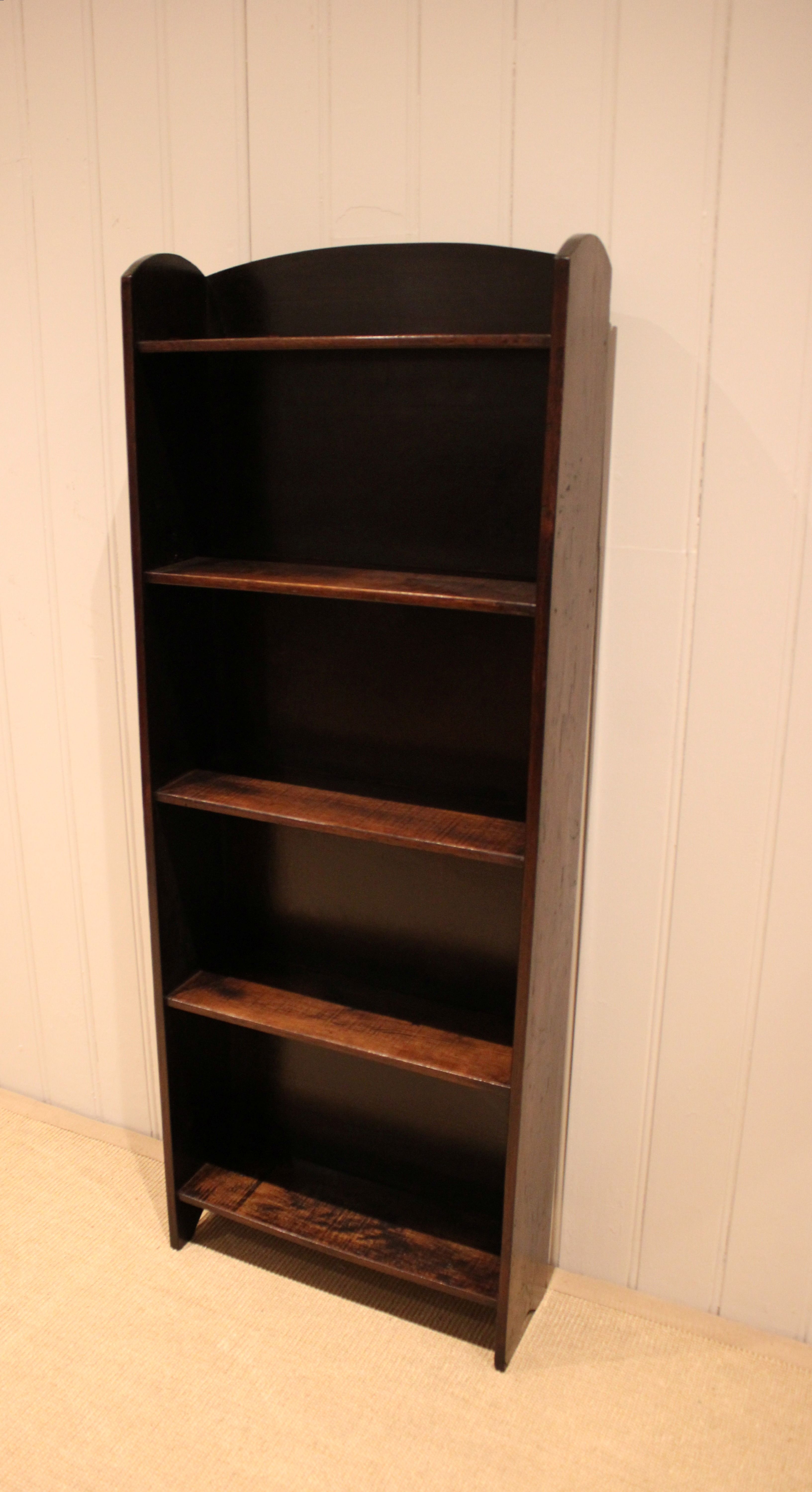 Oak open bookcase having three fixed shelves , raised on side brackets , with an arched top . The shelf dimensions from the bottom up are 49 cm wide , 15 cm deep and 30.5 cm high , 27.5 cm high , 26.5 cm high , and at the top 25.5 cm high .