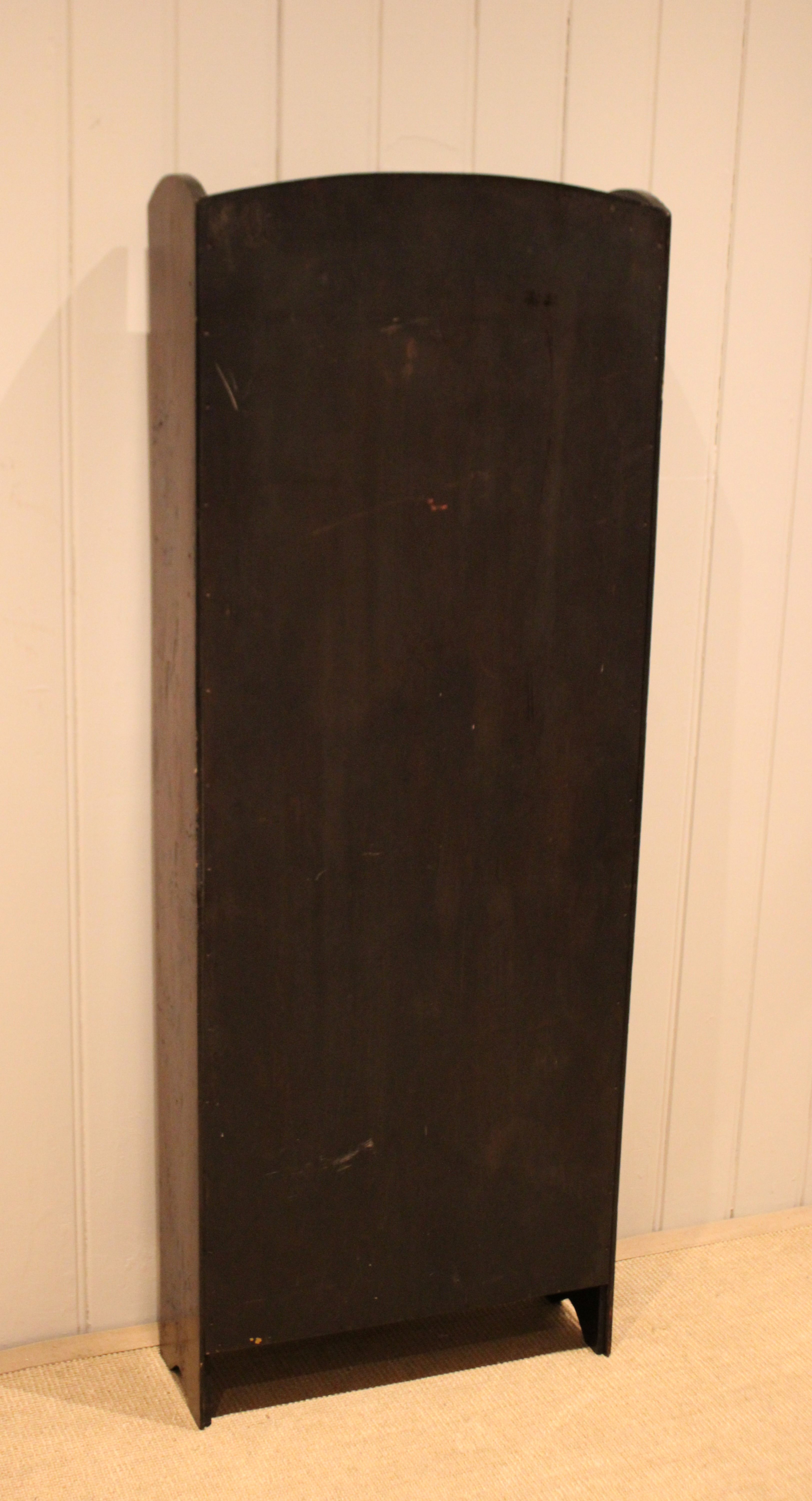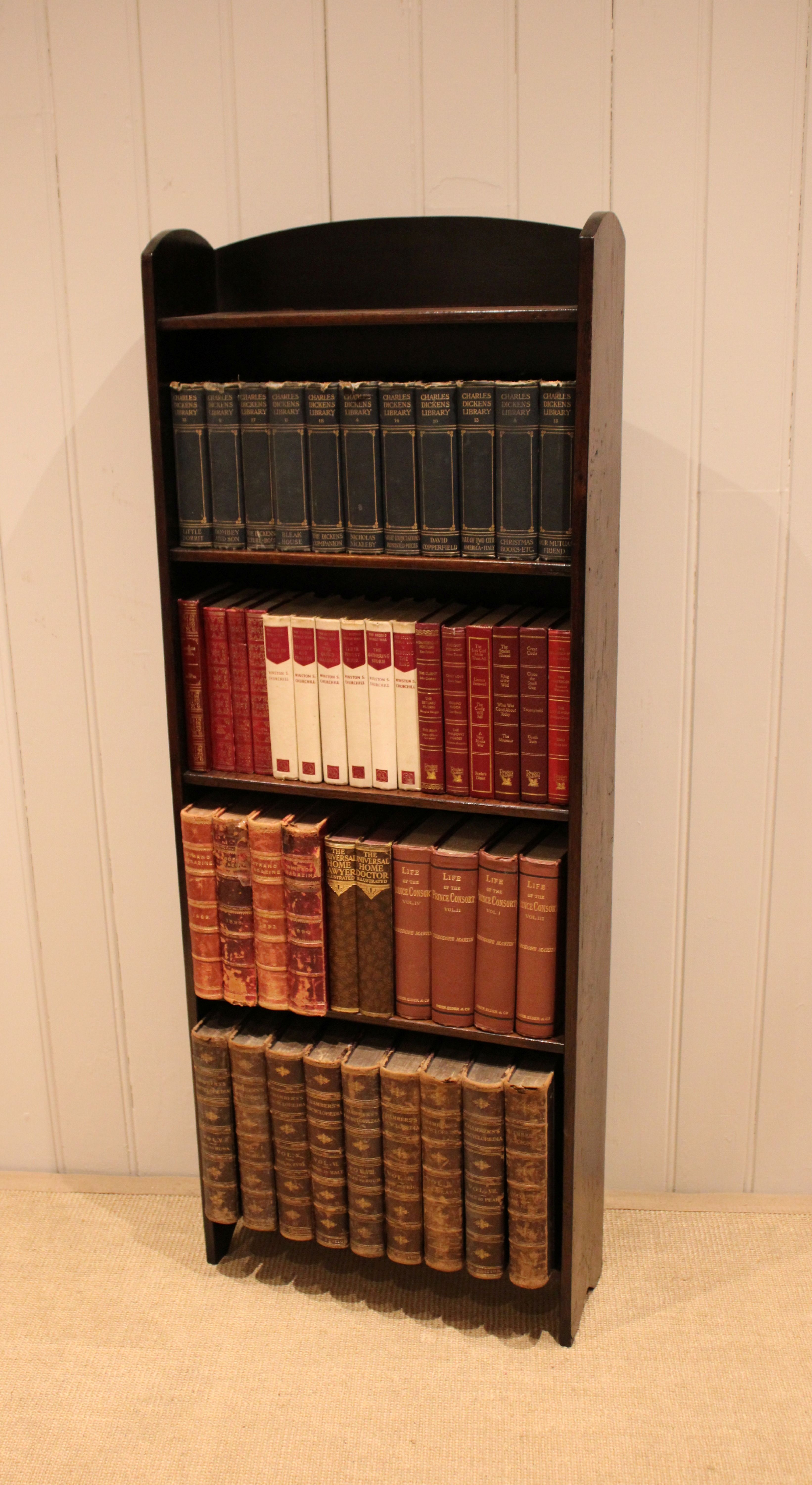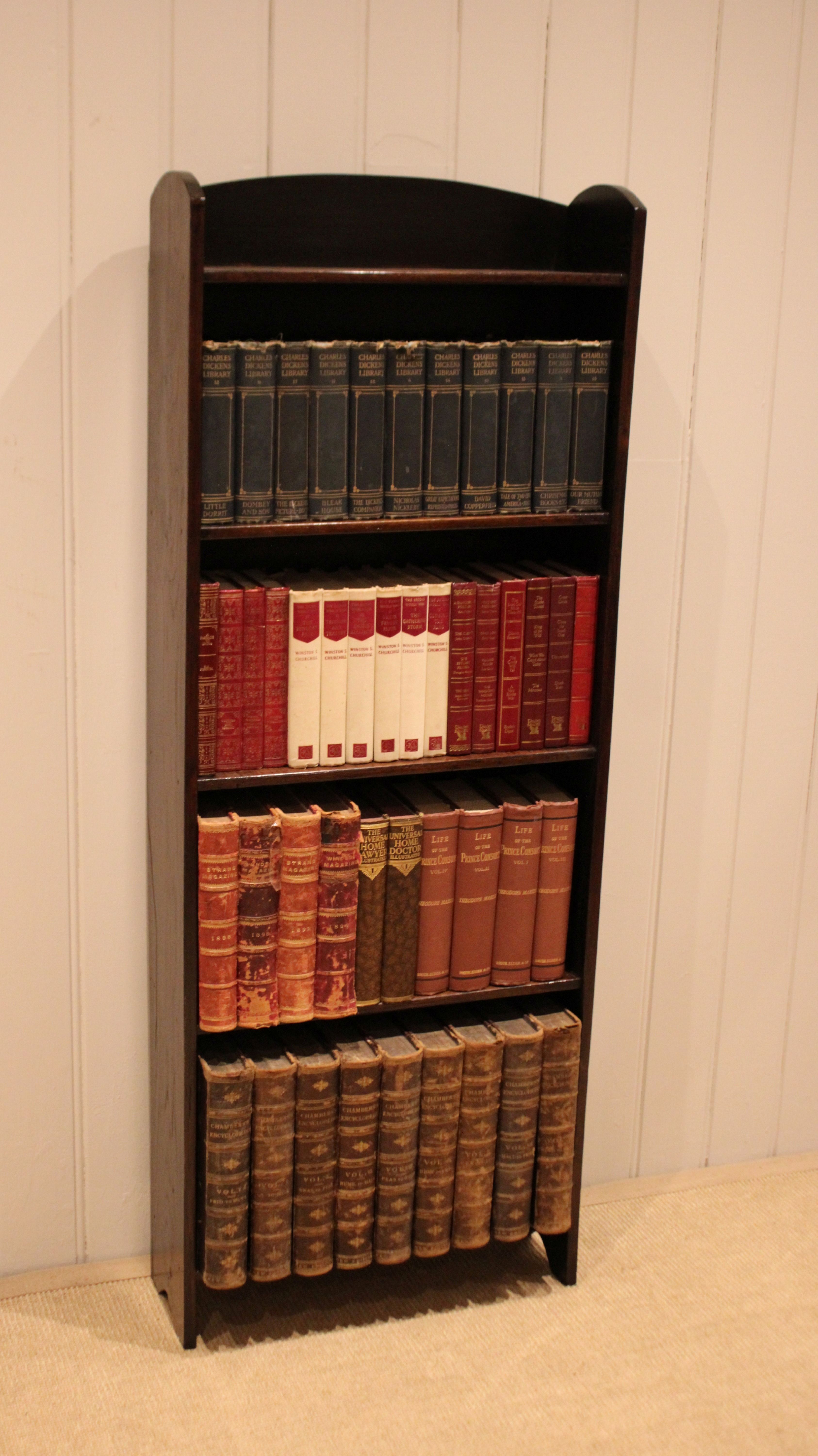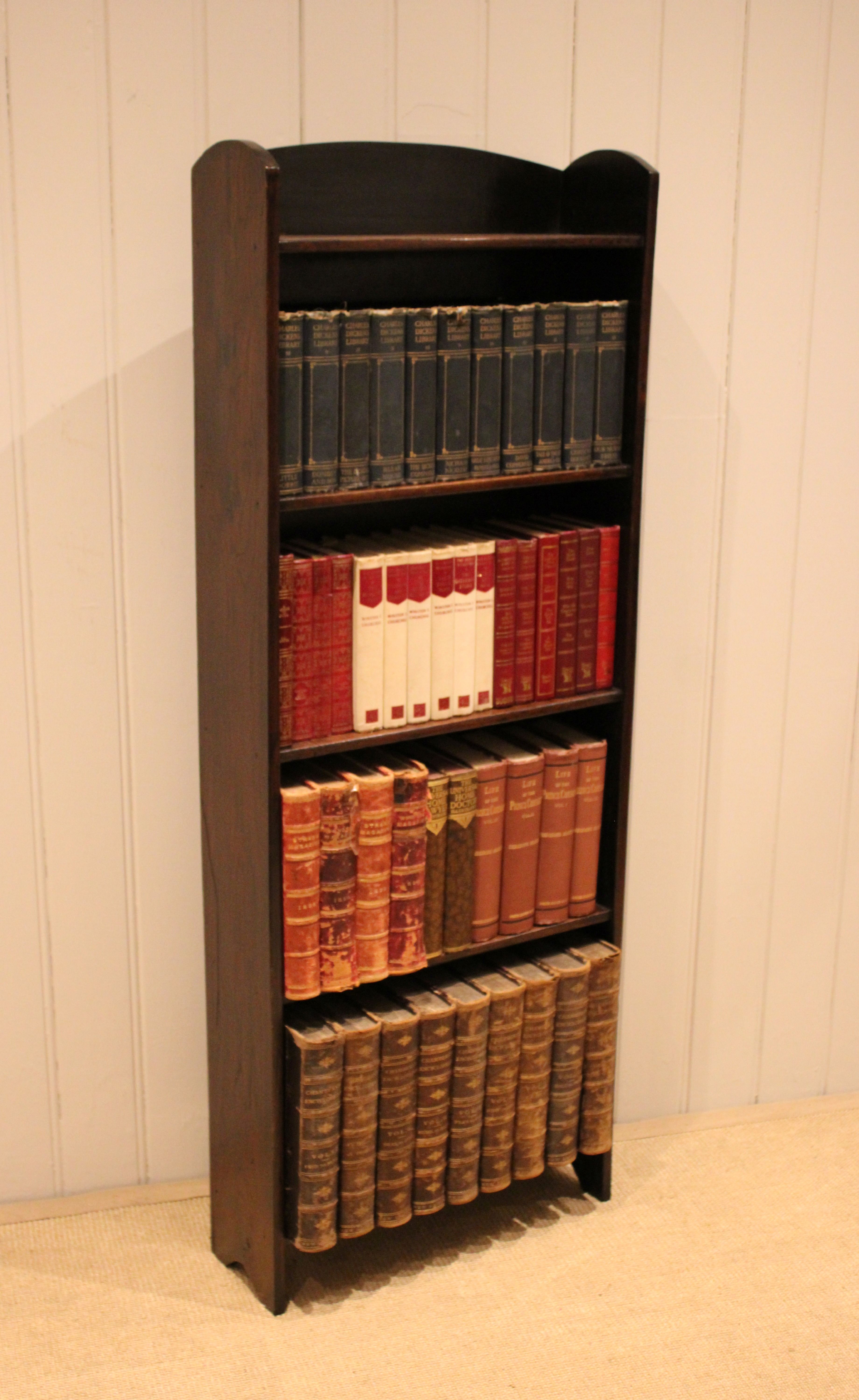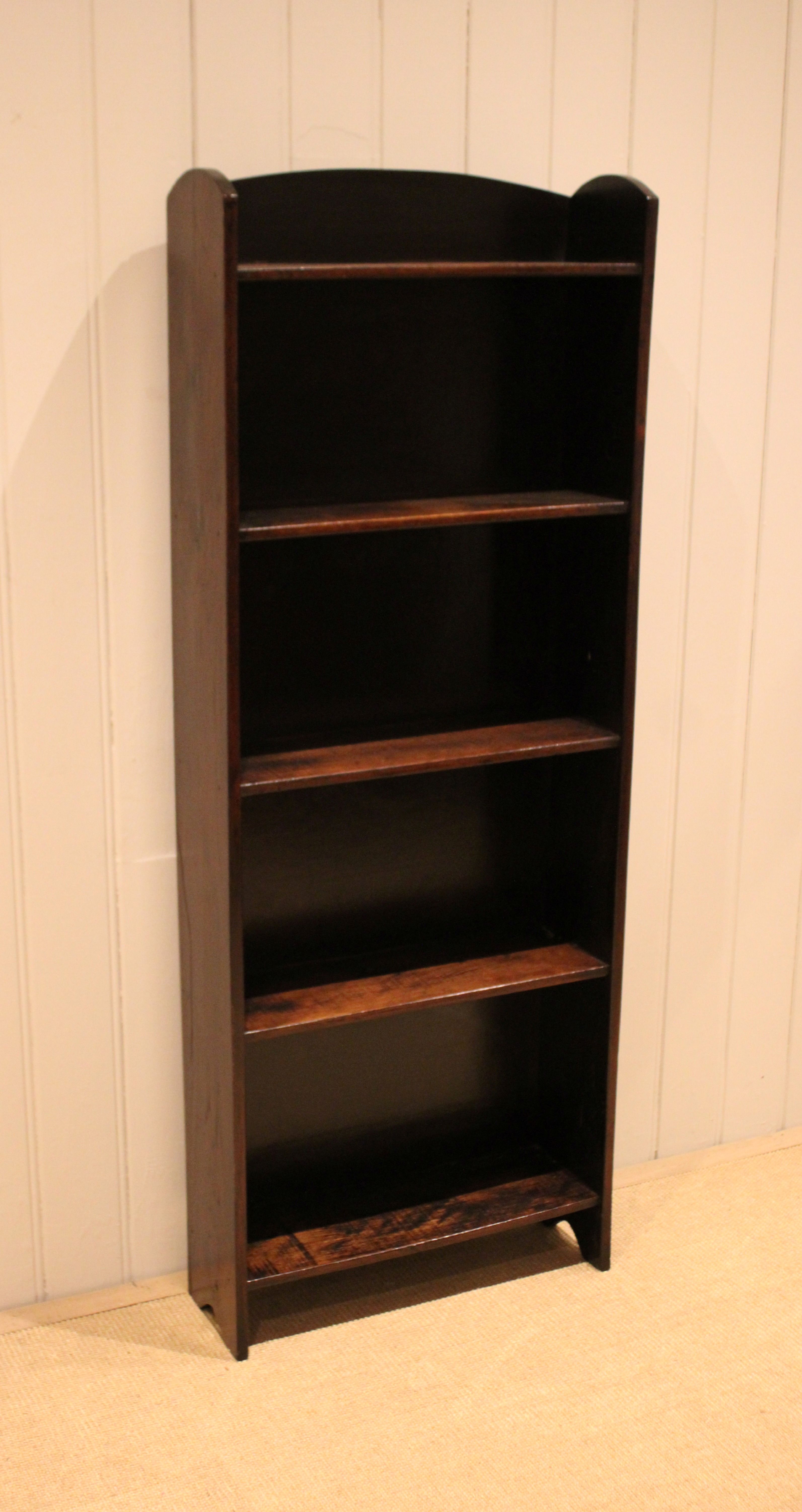 Oak open bookcase having three fixed shelves , raised on side brackets , with an arched top . The shelf dimensions from the bottom up are 49 cm wide , 15 cm deep and 30.5 cm high , 27.5 cm high , 26.5 cm high , and at the top 25.5 cm high .