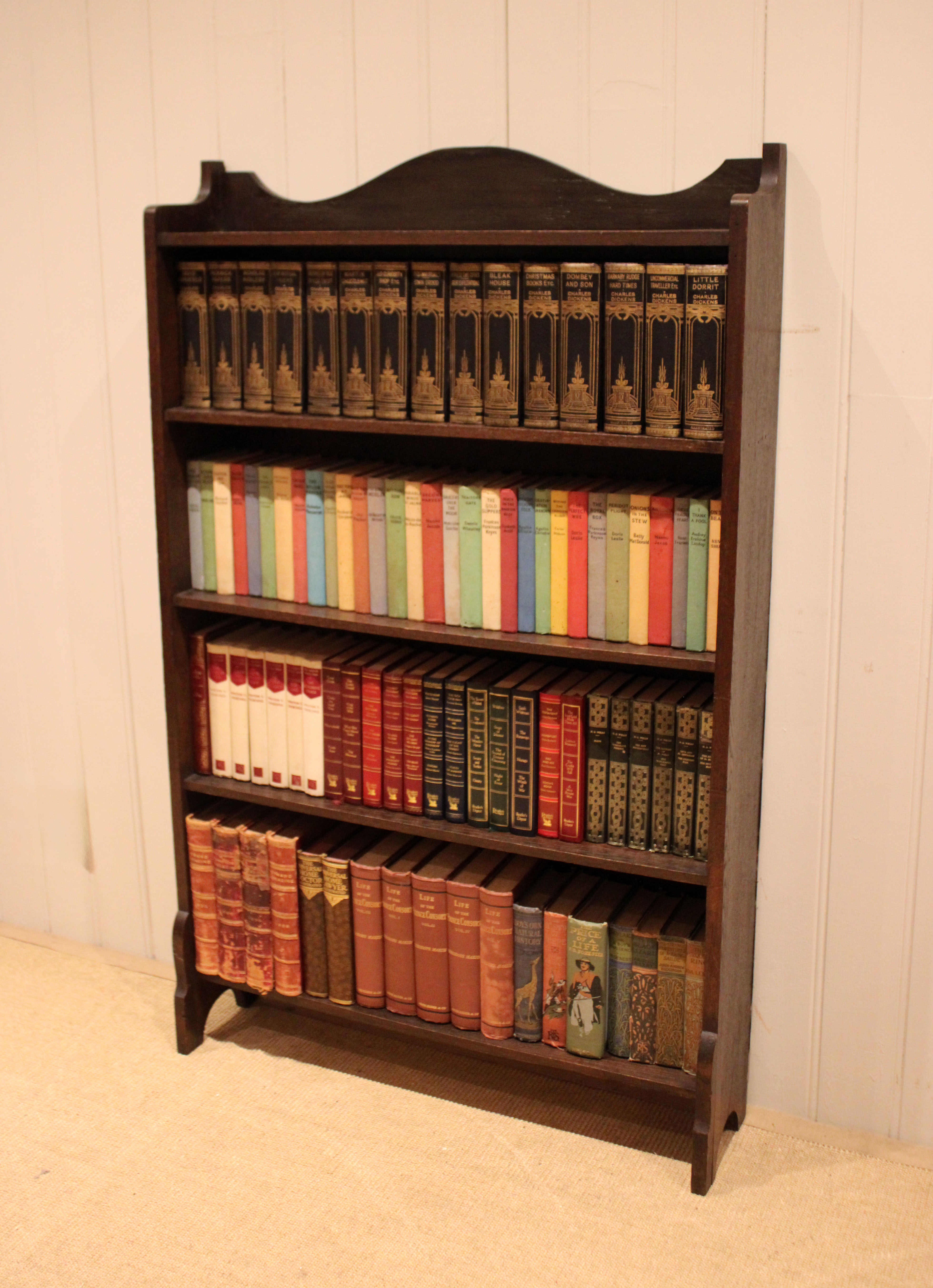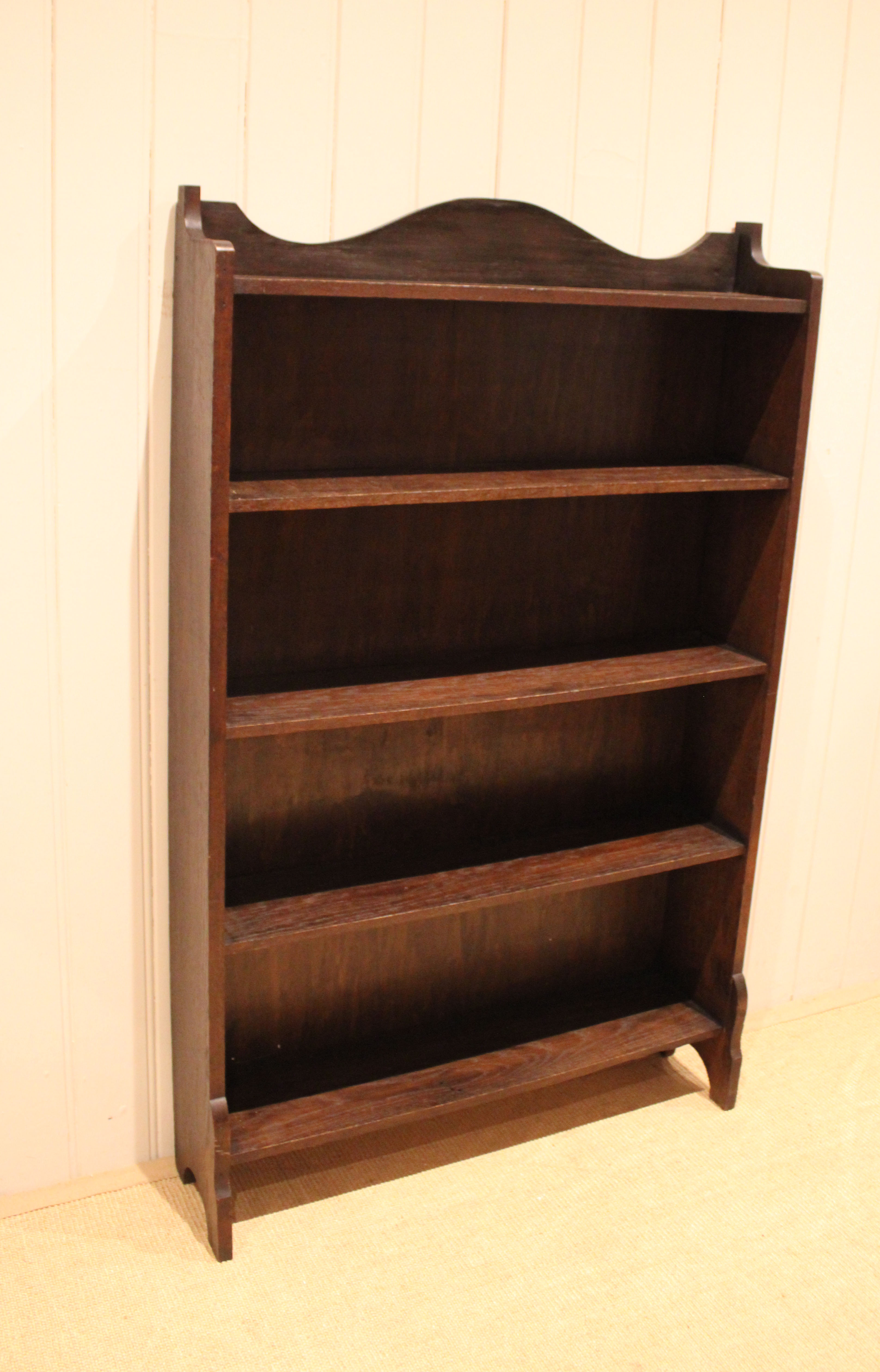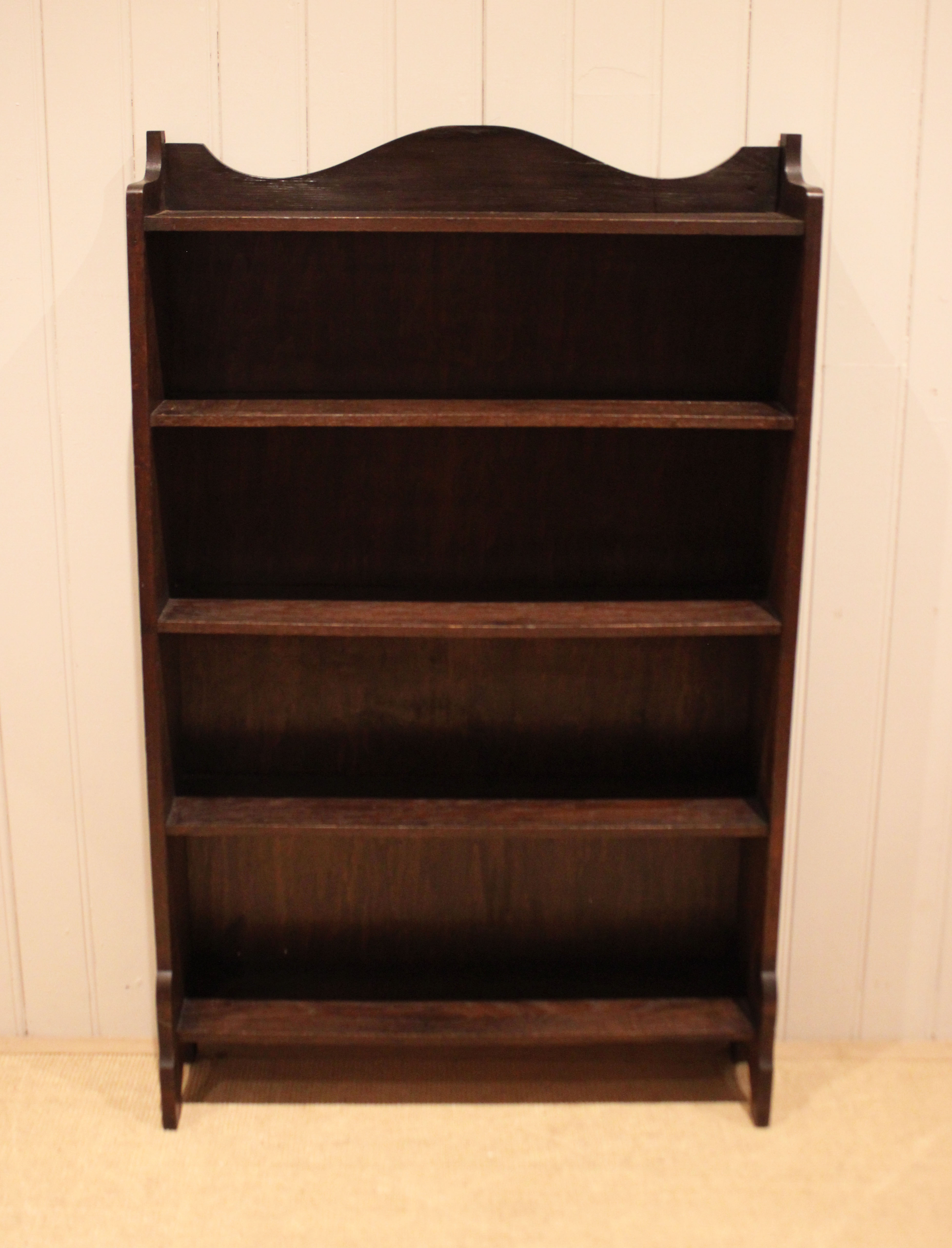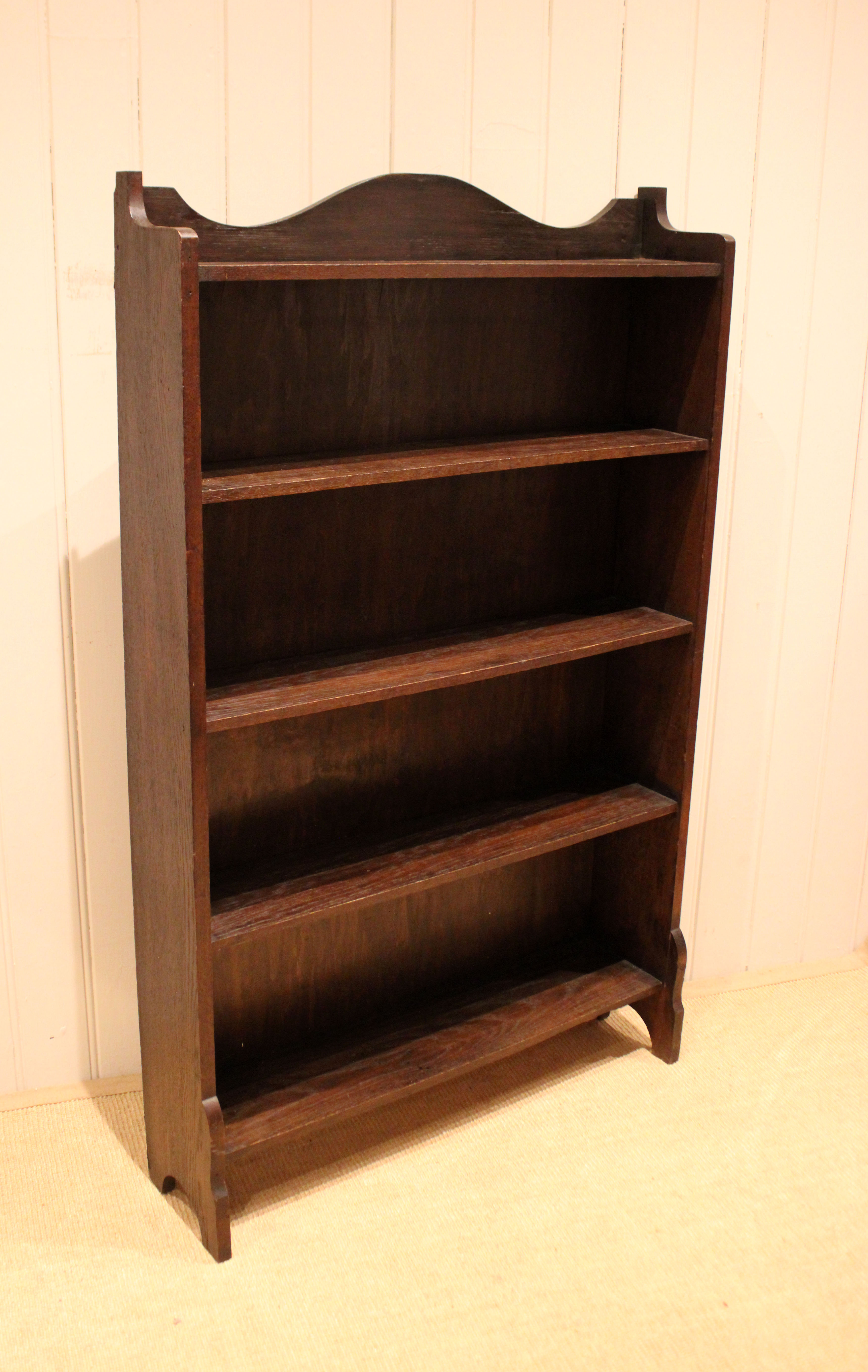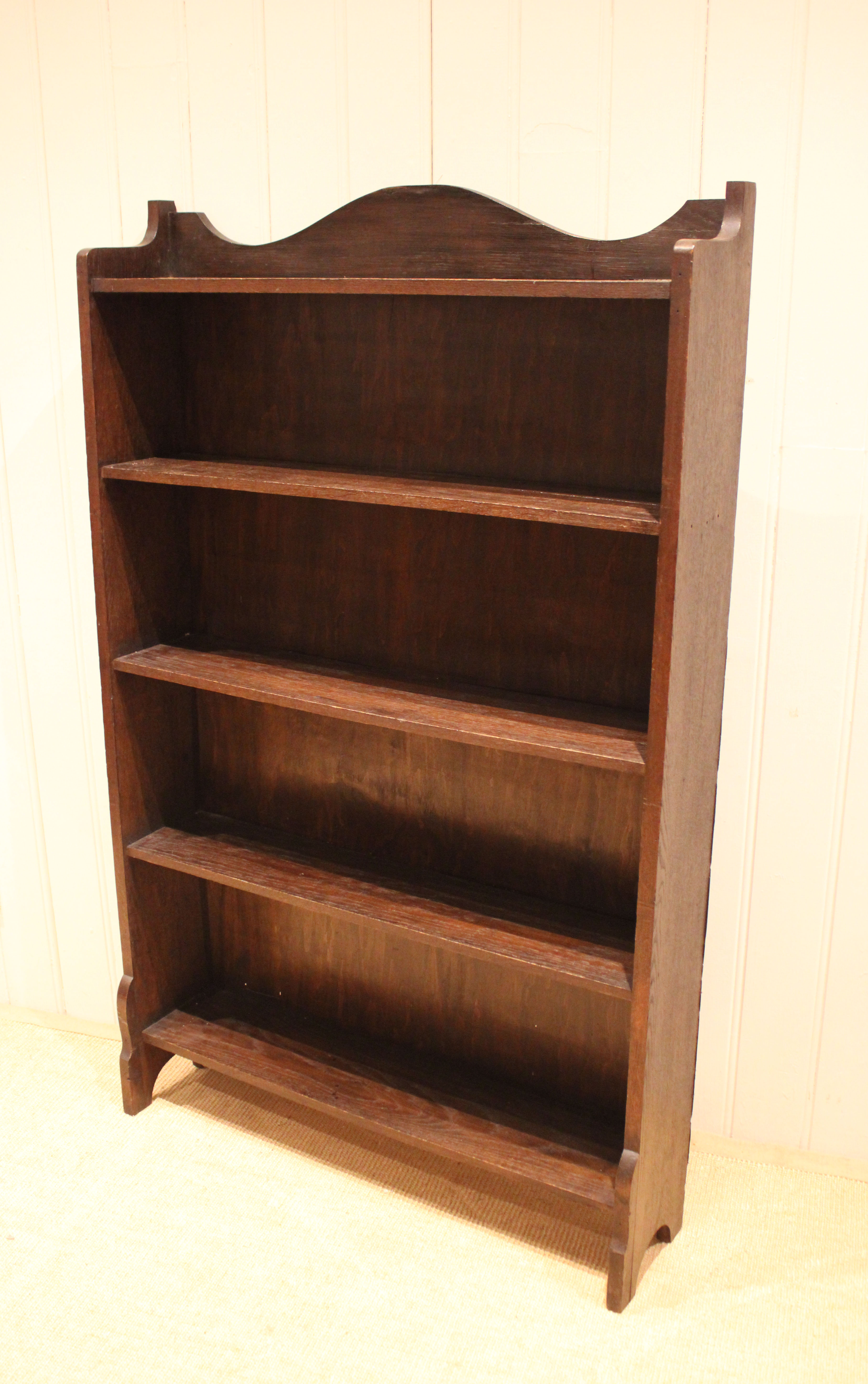 Oak open bookcase having a shaped top with four fixed shelves , raised on side brackets . The shelf dimensions are 79 cm wide and 17 cm deep and from the bottom up 29 cm high , 26 cm high , 25.5 cm high and at the top 22 cm high .