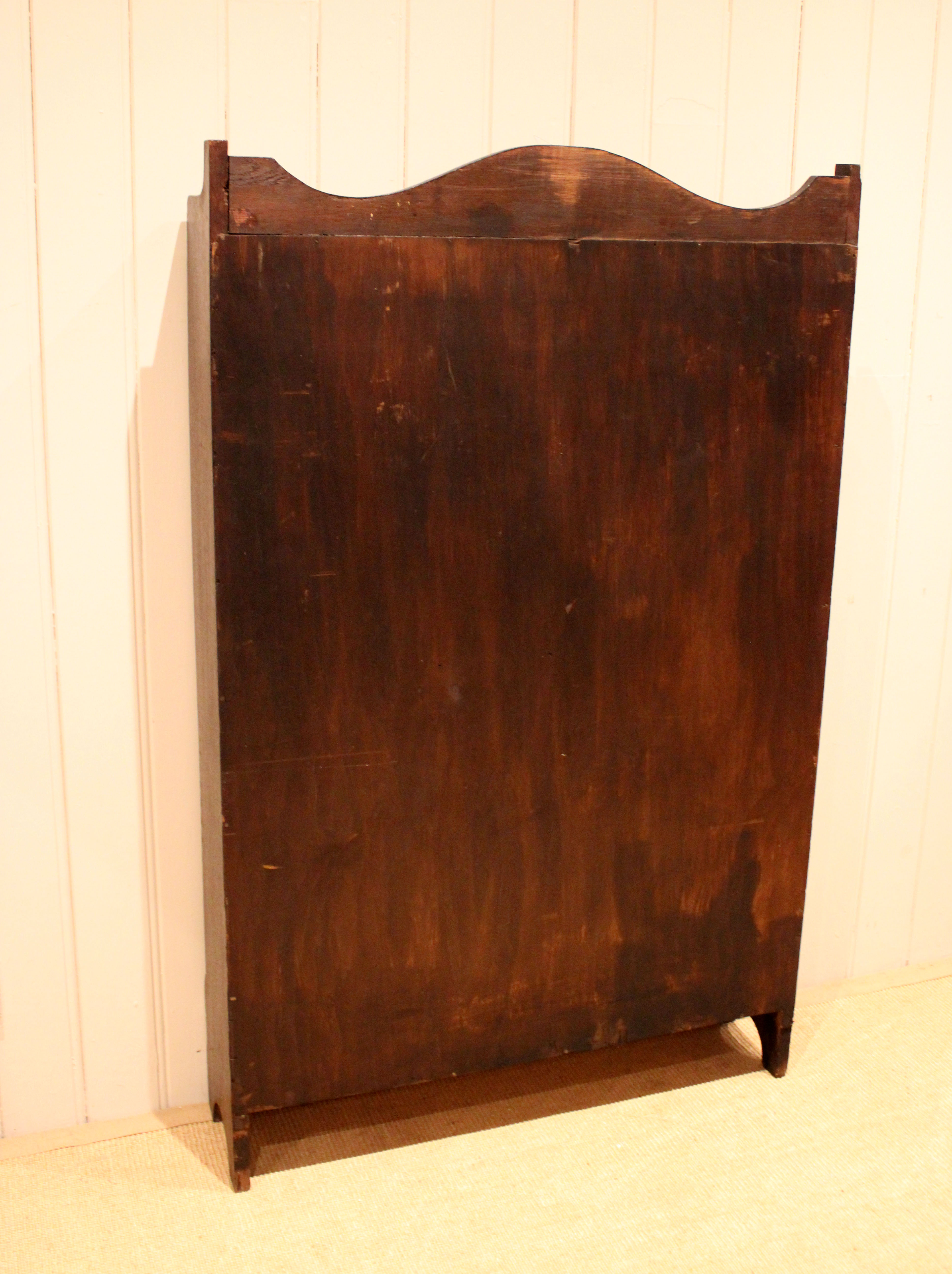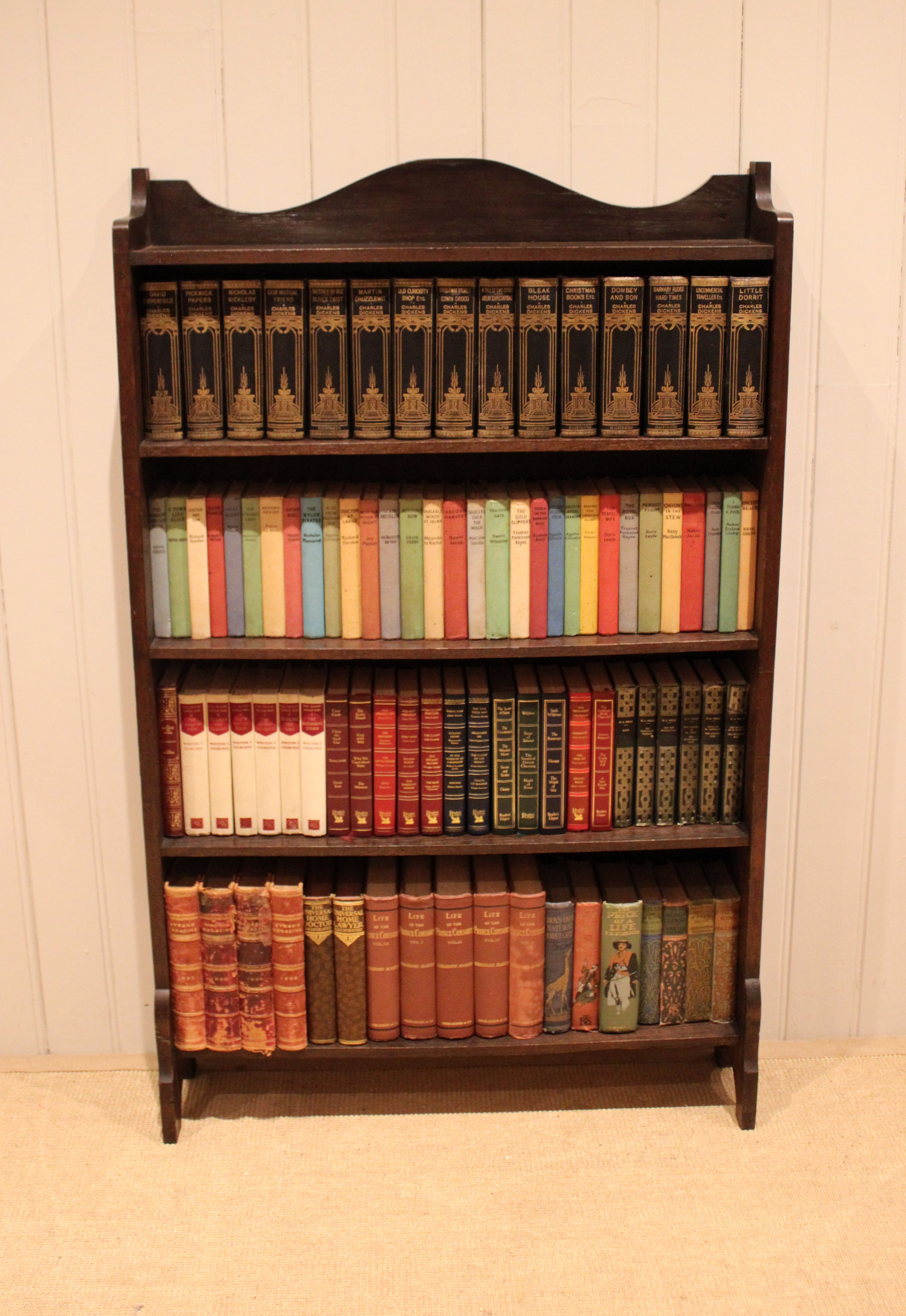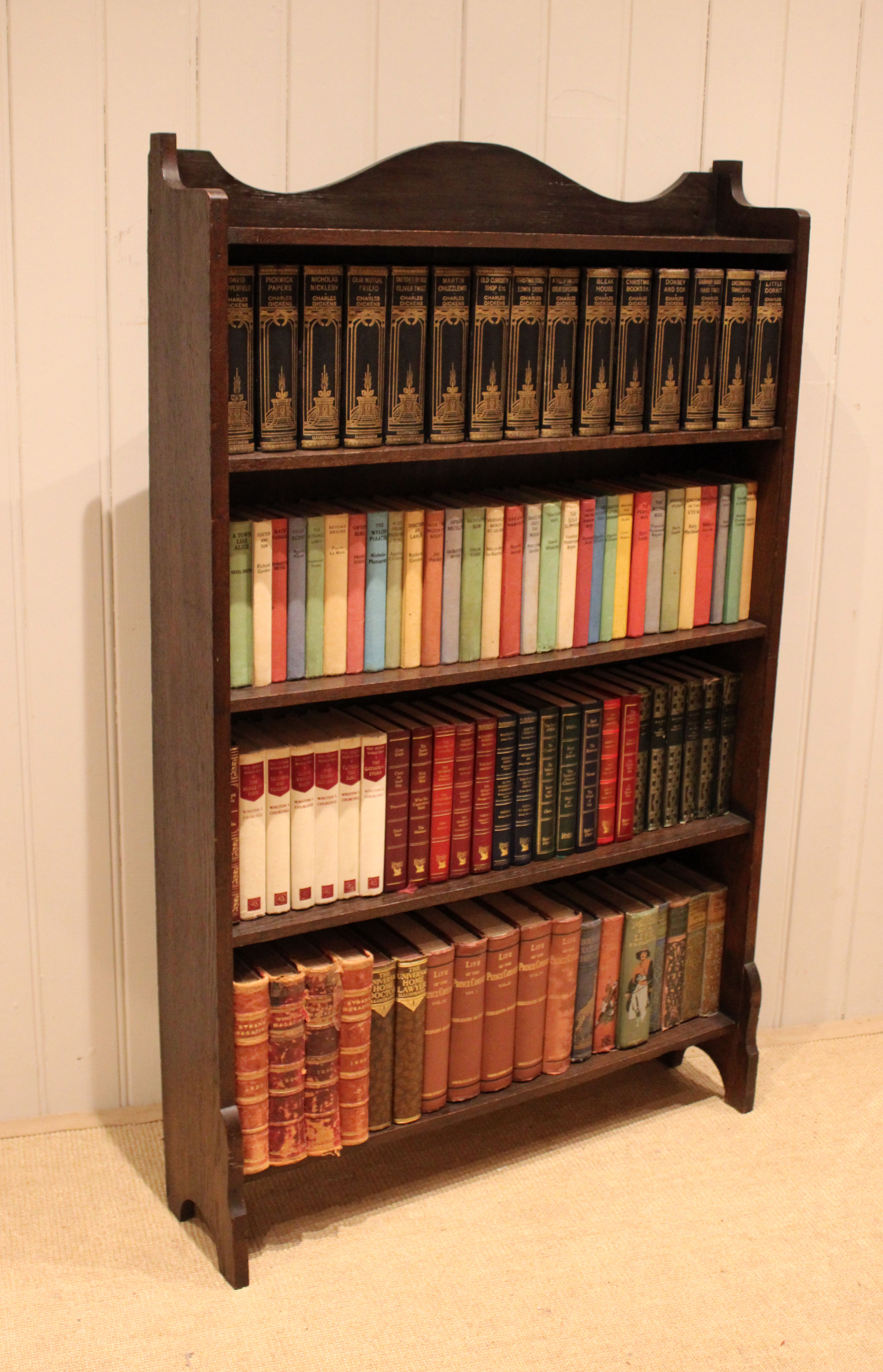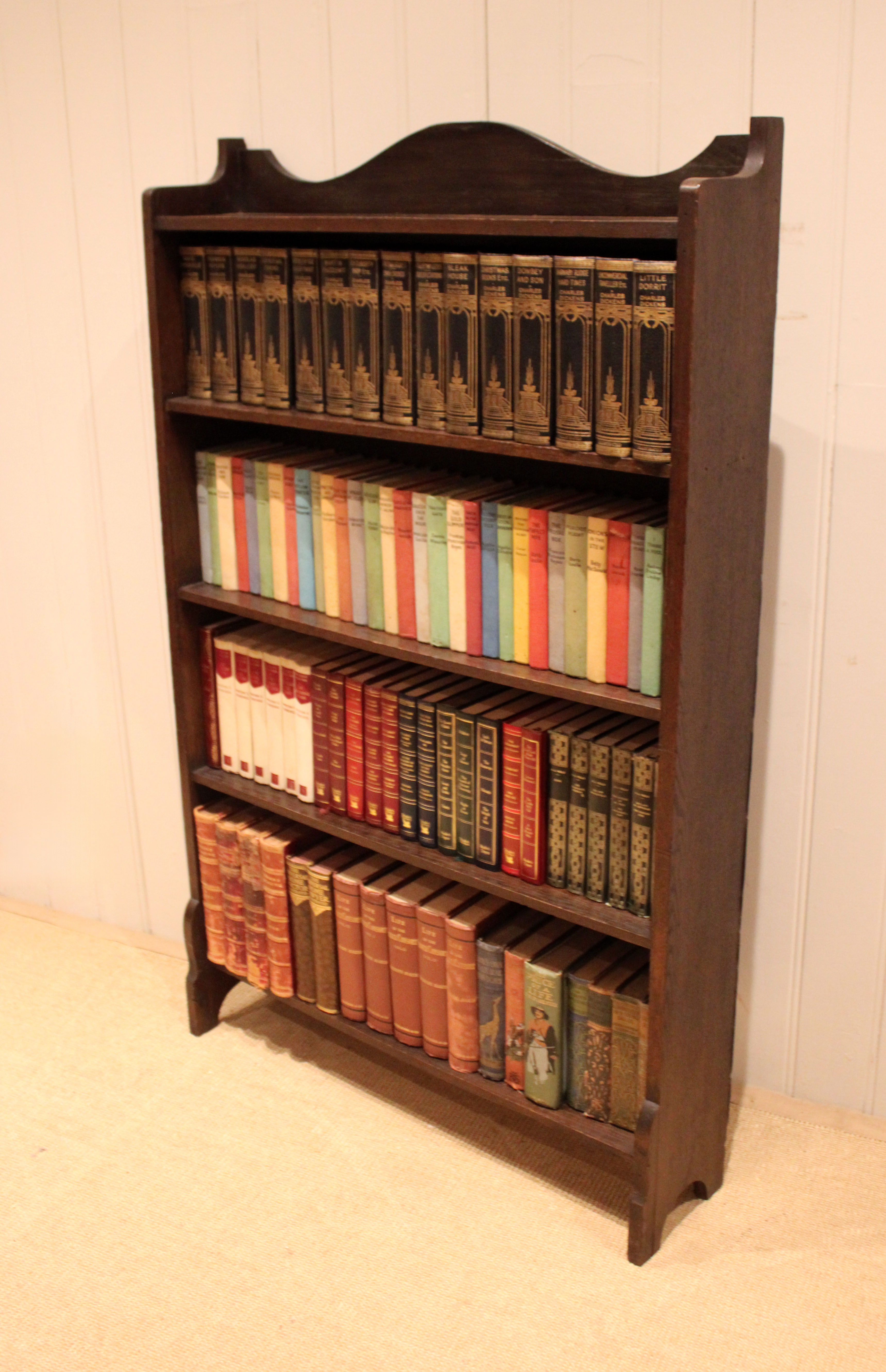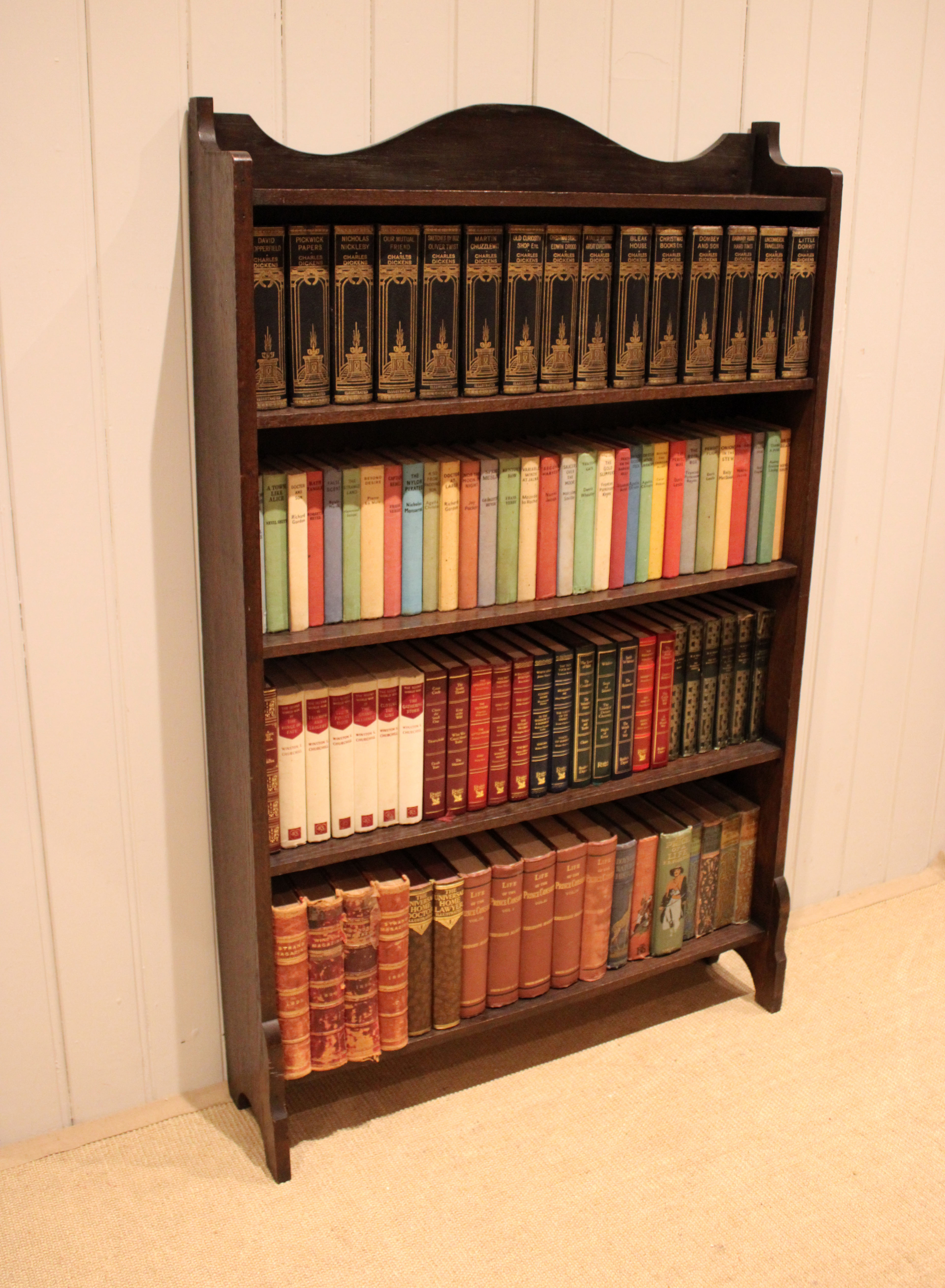 Oak open bookcase having a shaped top with four fixed shelves , raised on side brackets . The shelf dimensions are 79 cm wide and 17 cm deep and from the bottom up 29 cm high , 26 cm high , 25.5 cm high and at the top 22 cm high .