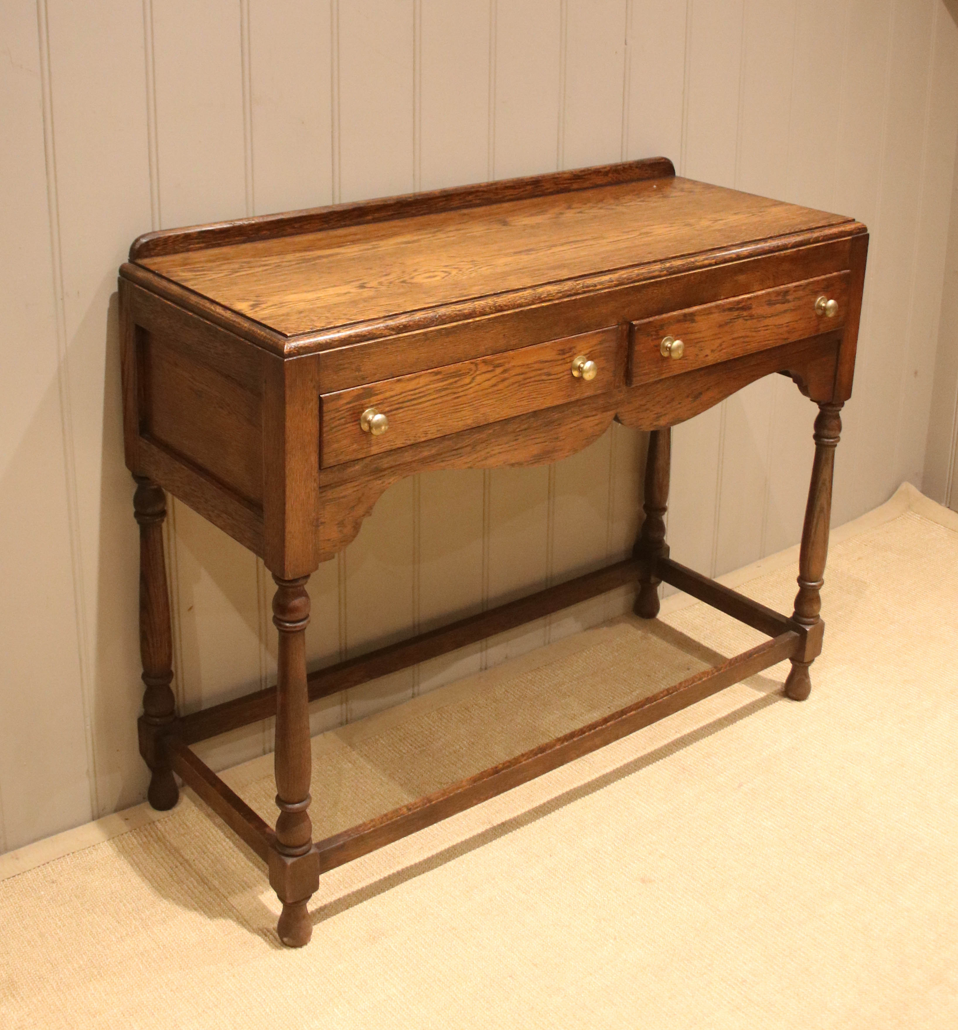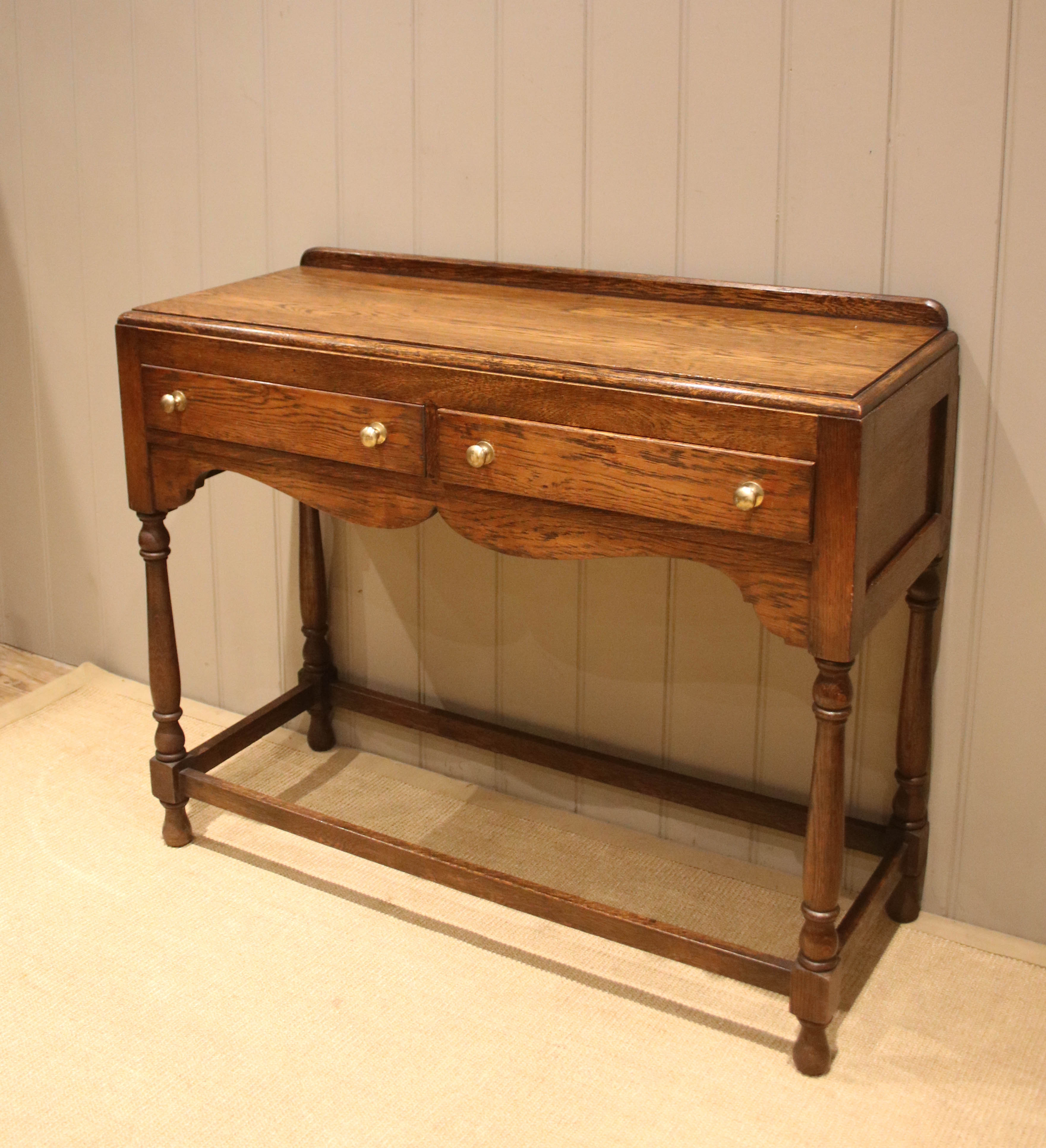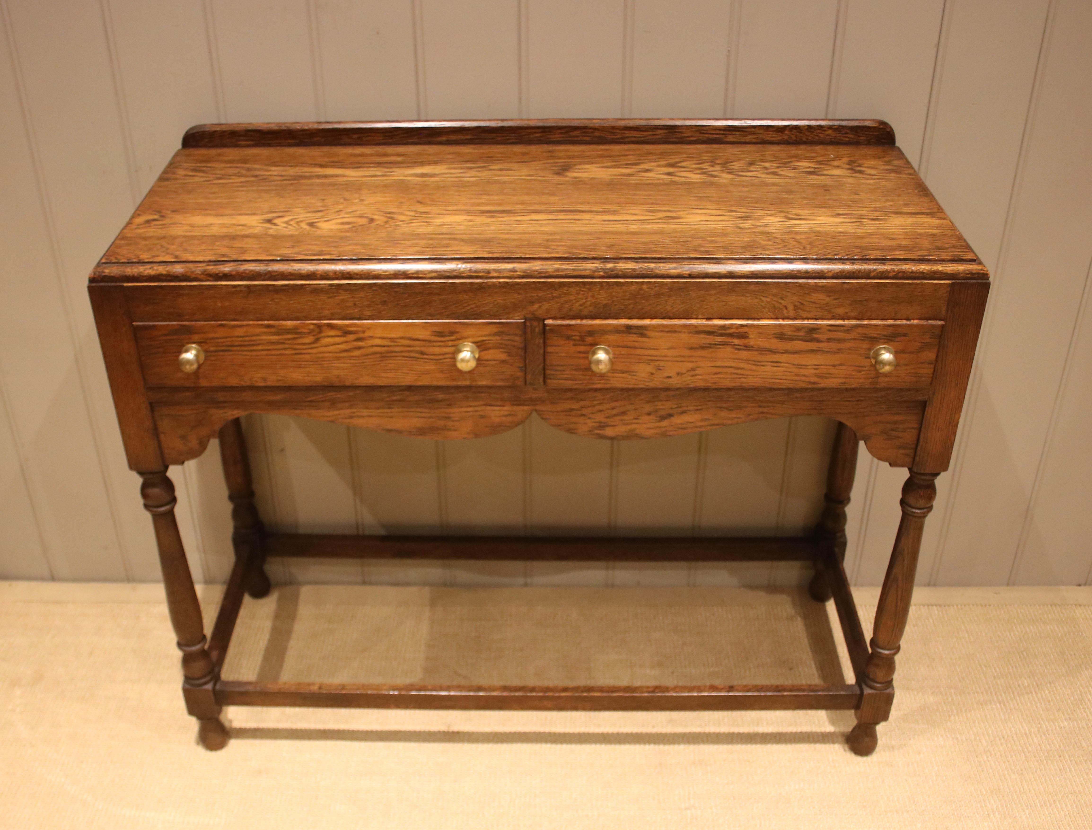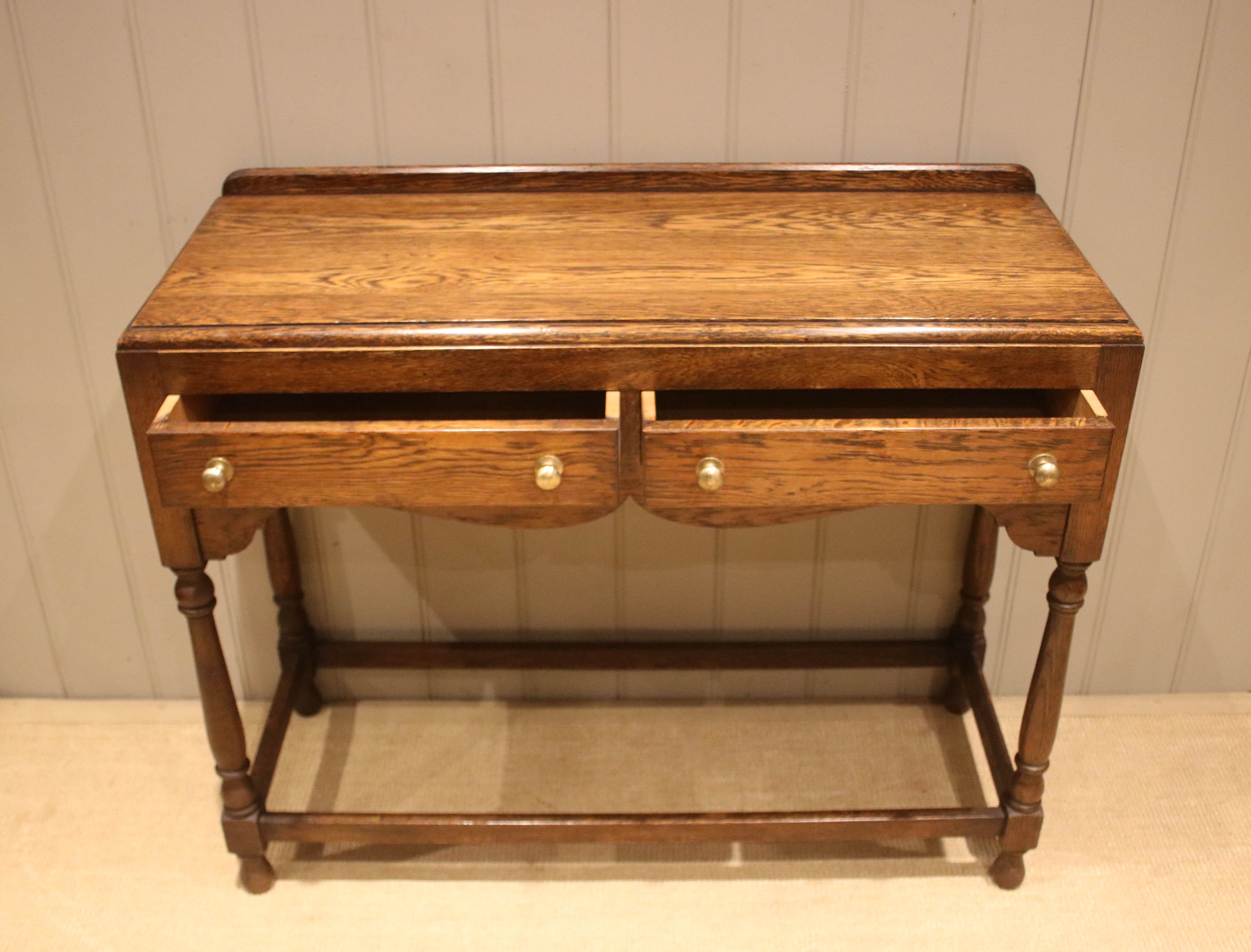 Oak side table having two drawers with brass handles, a shaped apron , panelled sides , raised on turned wooden supports united by a stretcher.