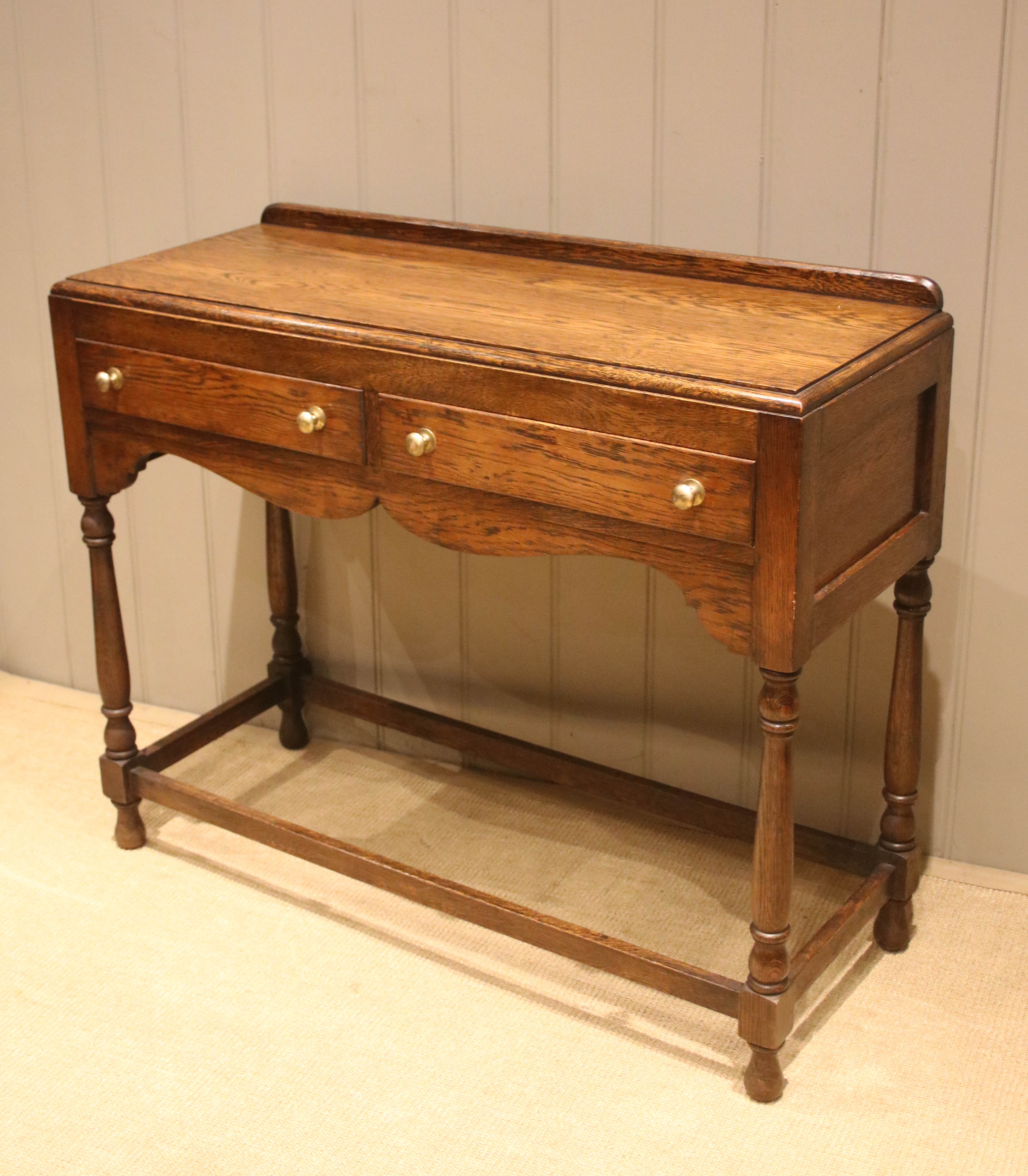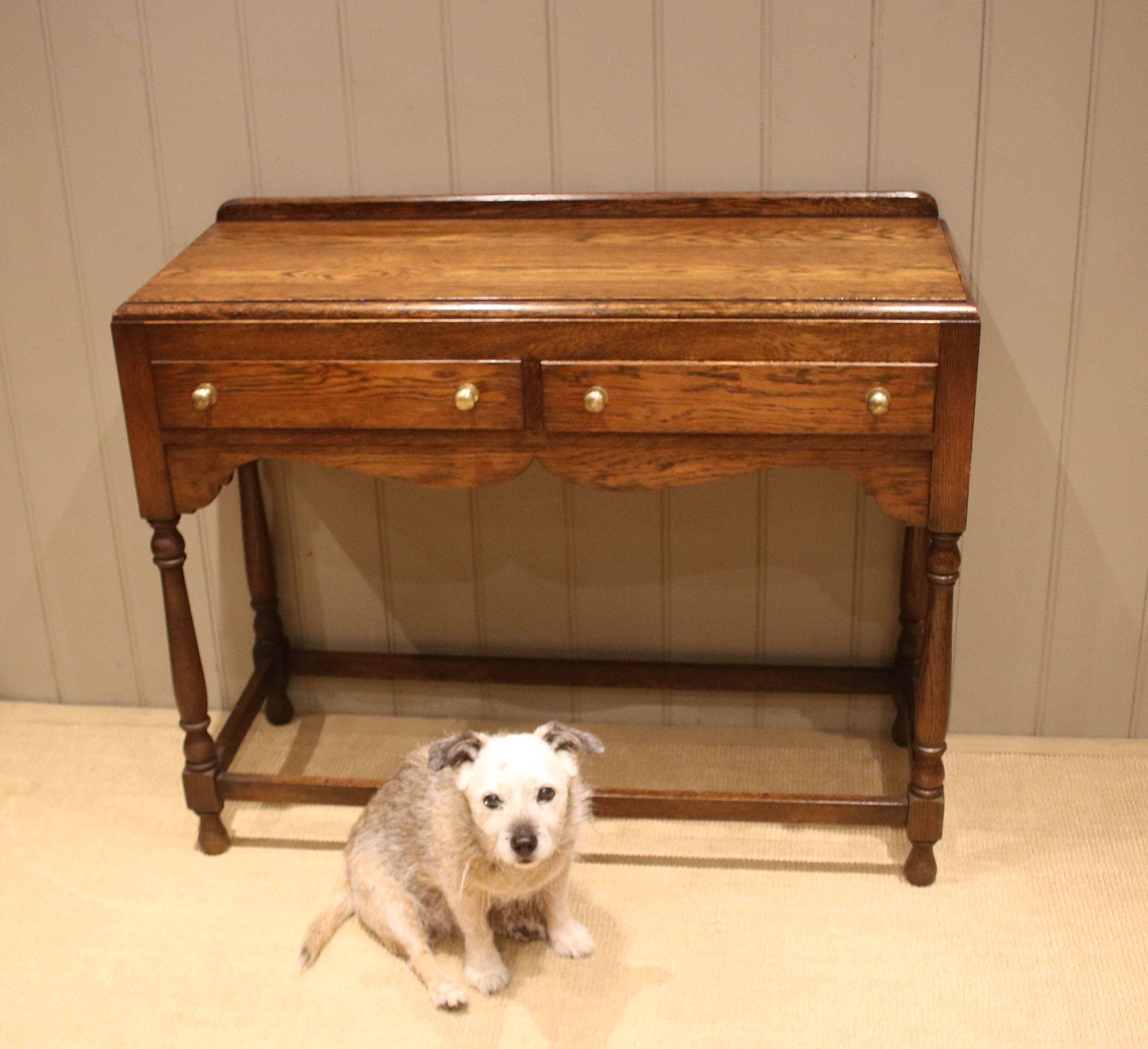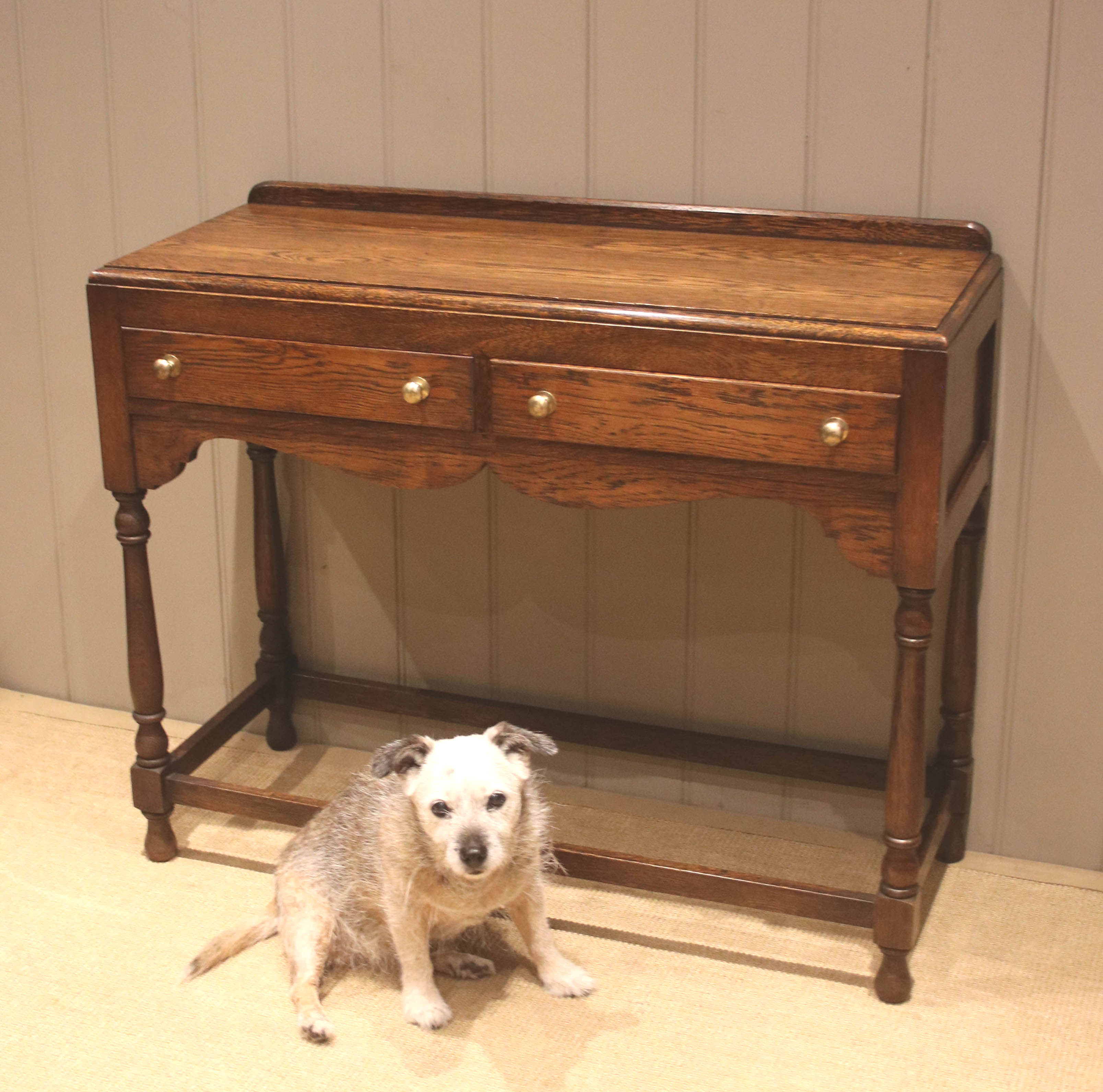 Oak side table having two drawers with brass handles, a shaped apron , panelled sides , raised on turned wooden supports united by a stretcher.