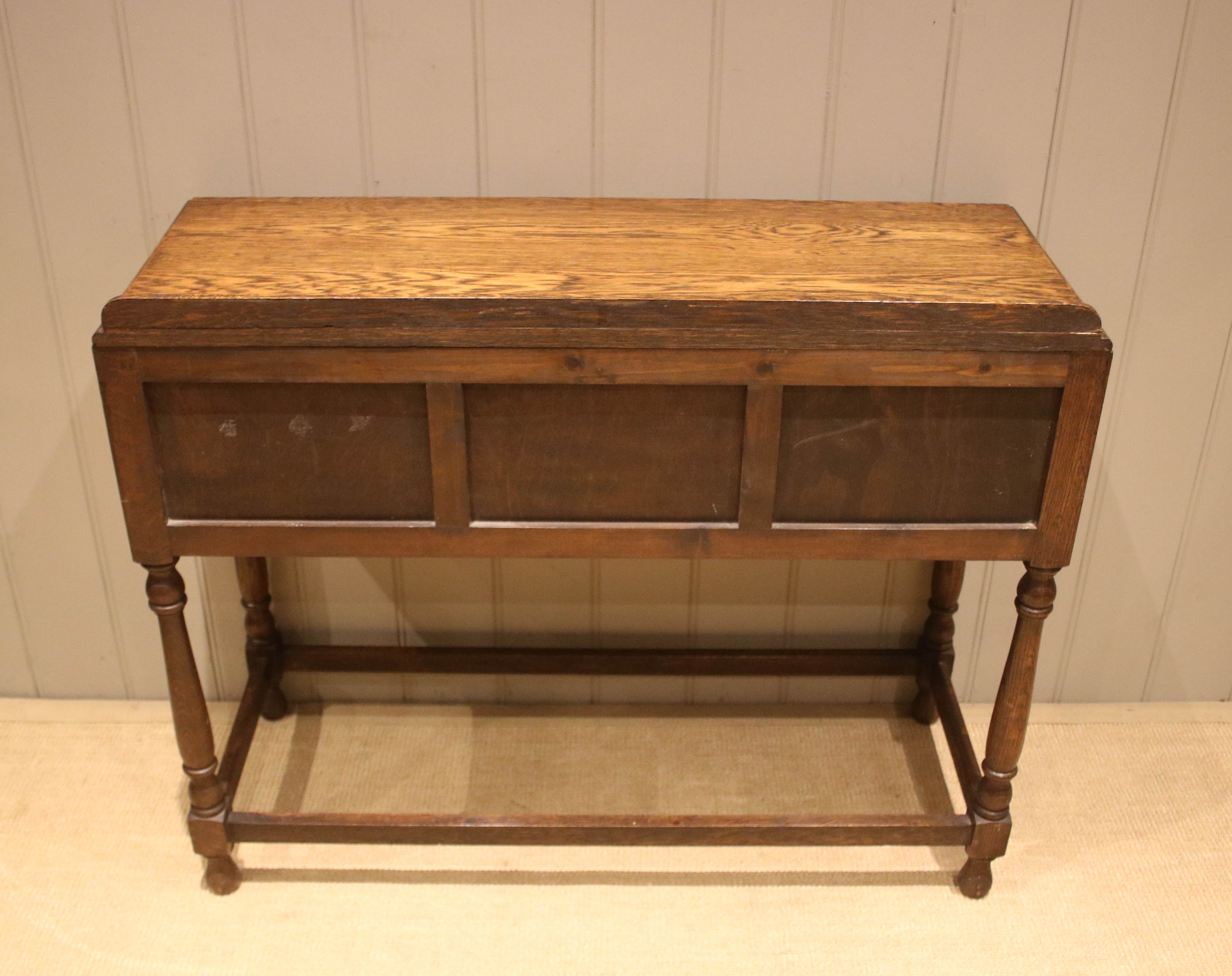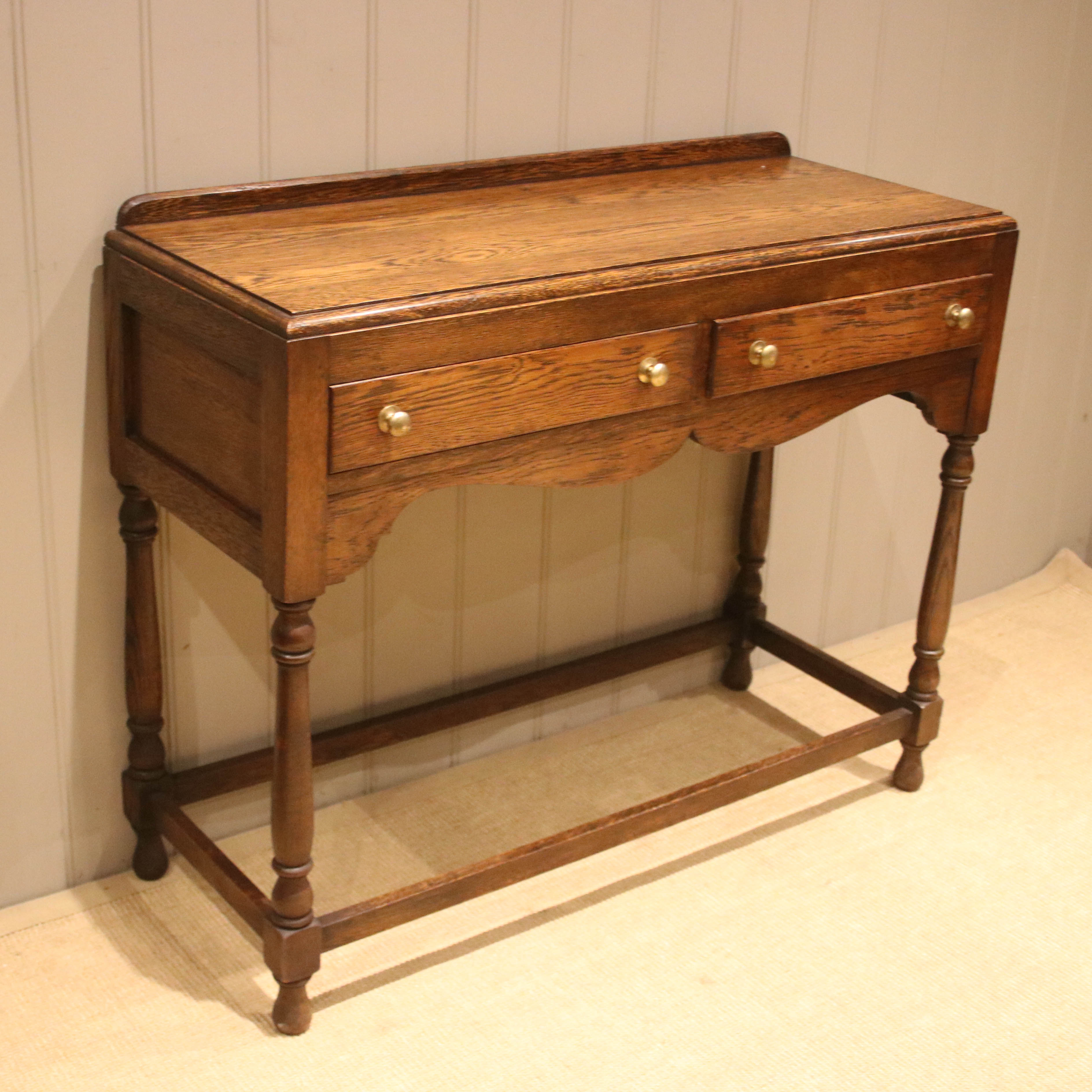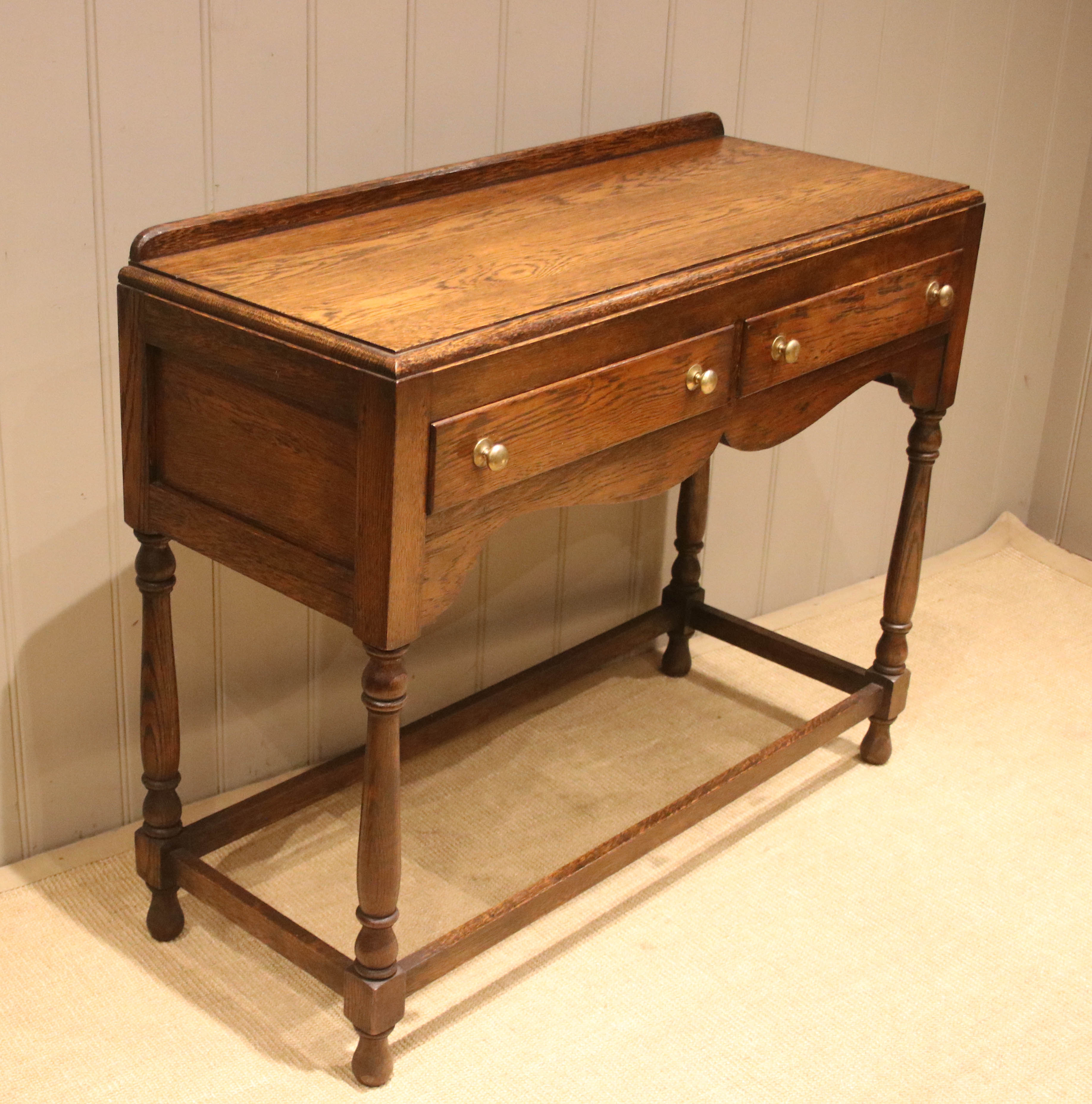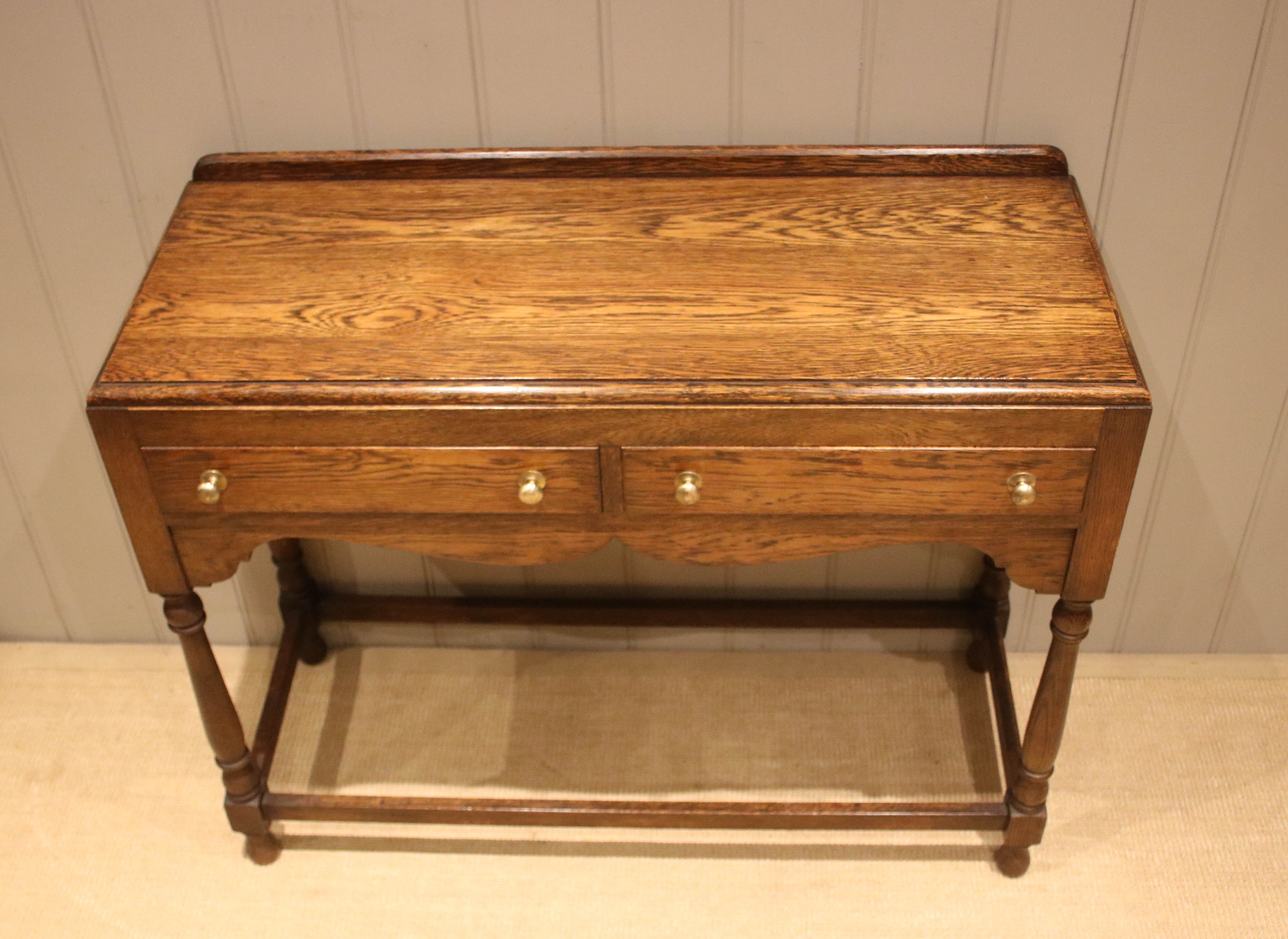Oak side table having two drawers with brass handles, a shaped apron , panelled sides , raised on turned wooden supports united by a stretcher.