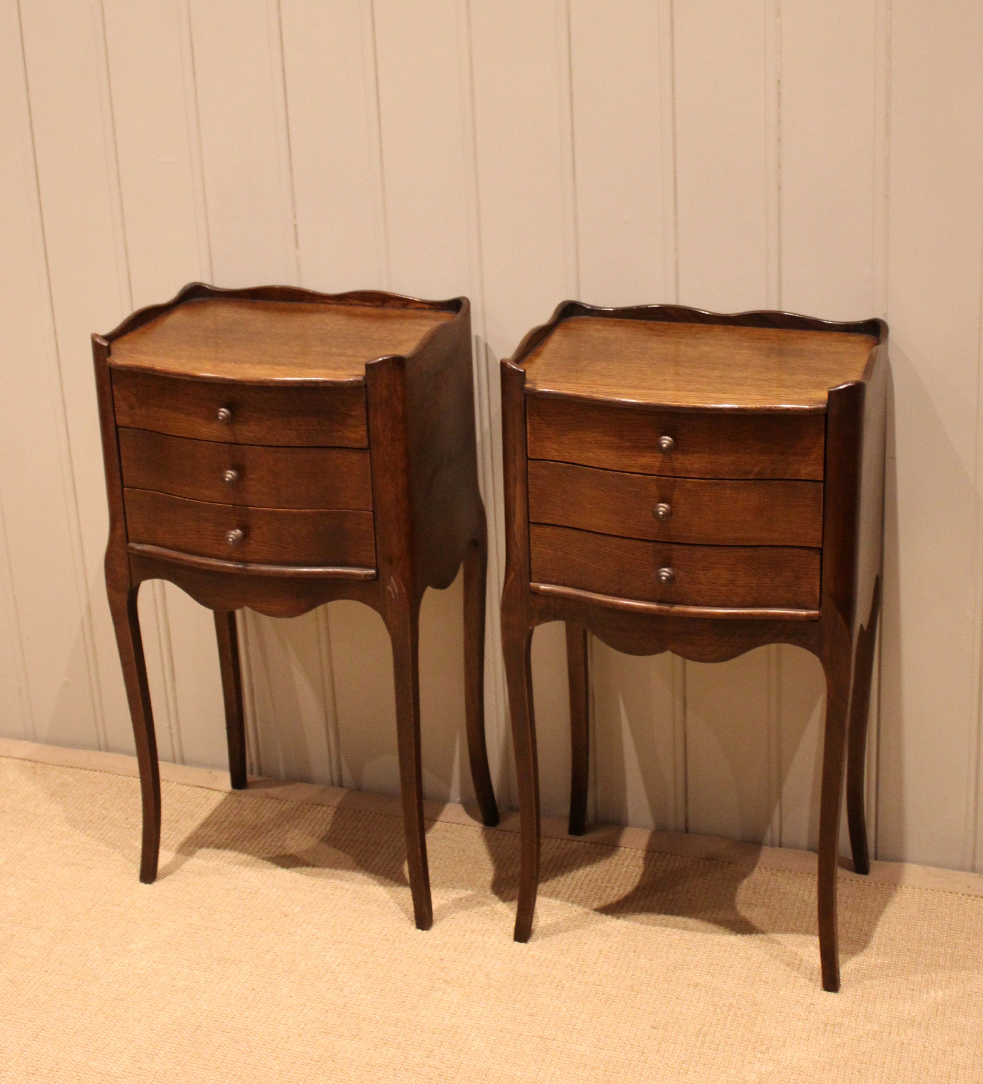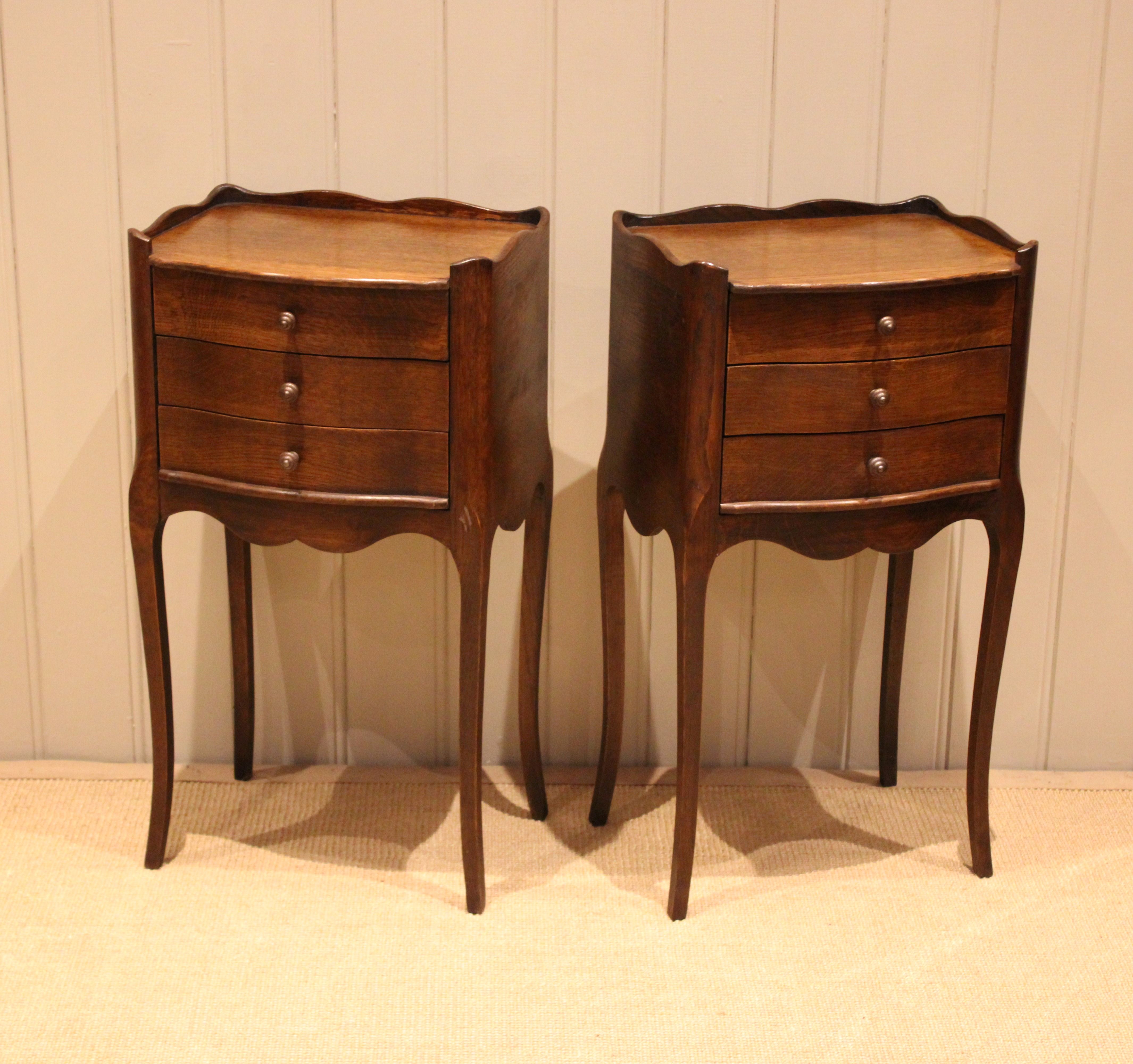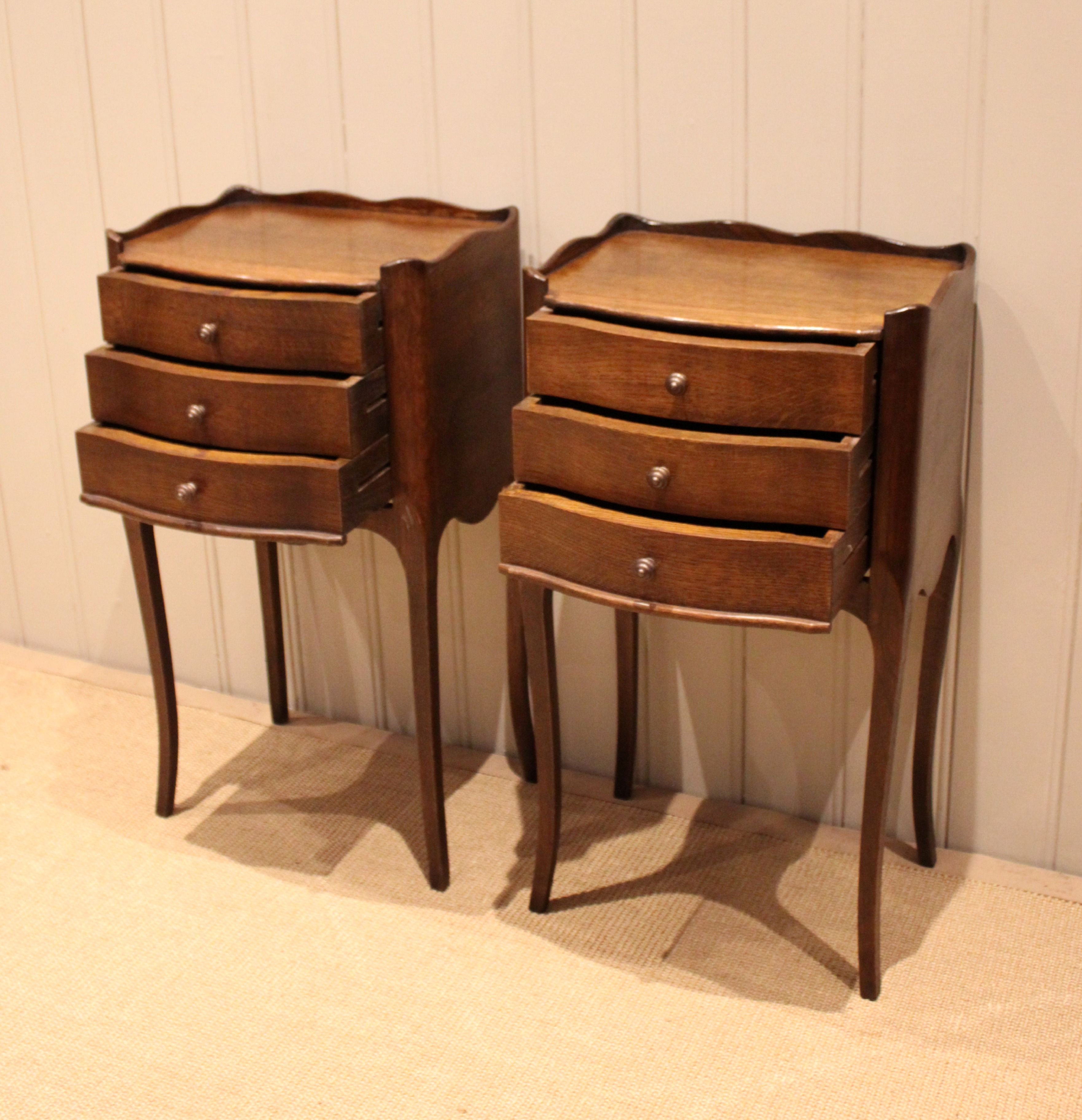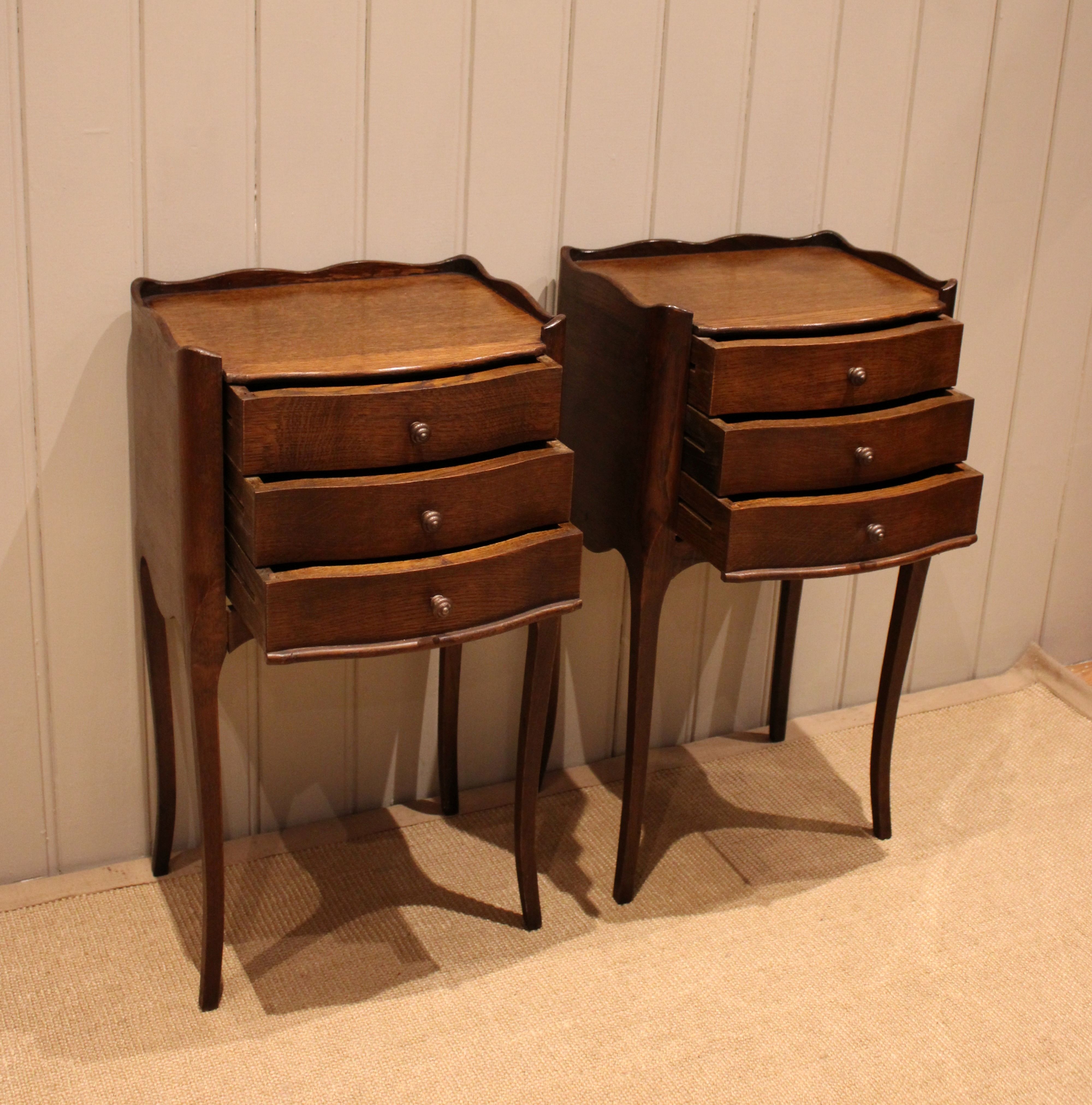 Pair of French oak bedside cabinets having three drawers , raised on cabriole legs .