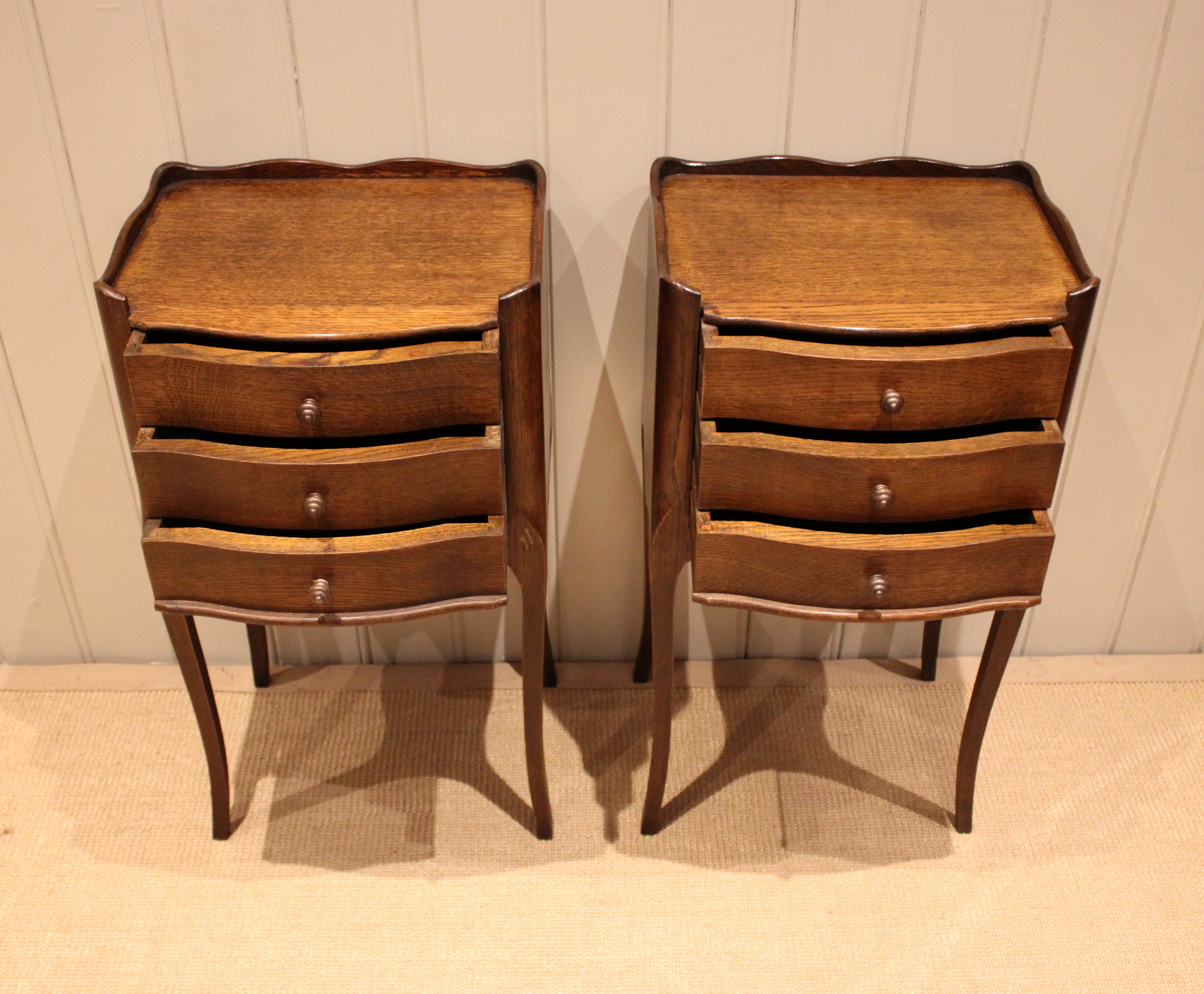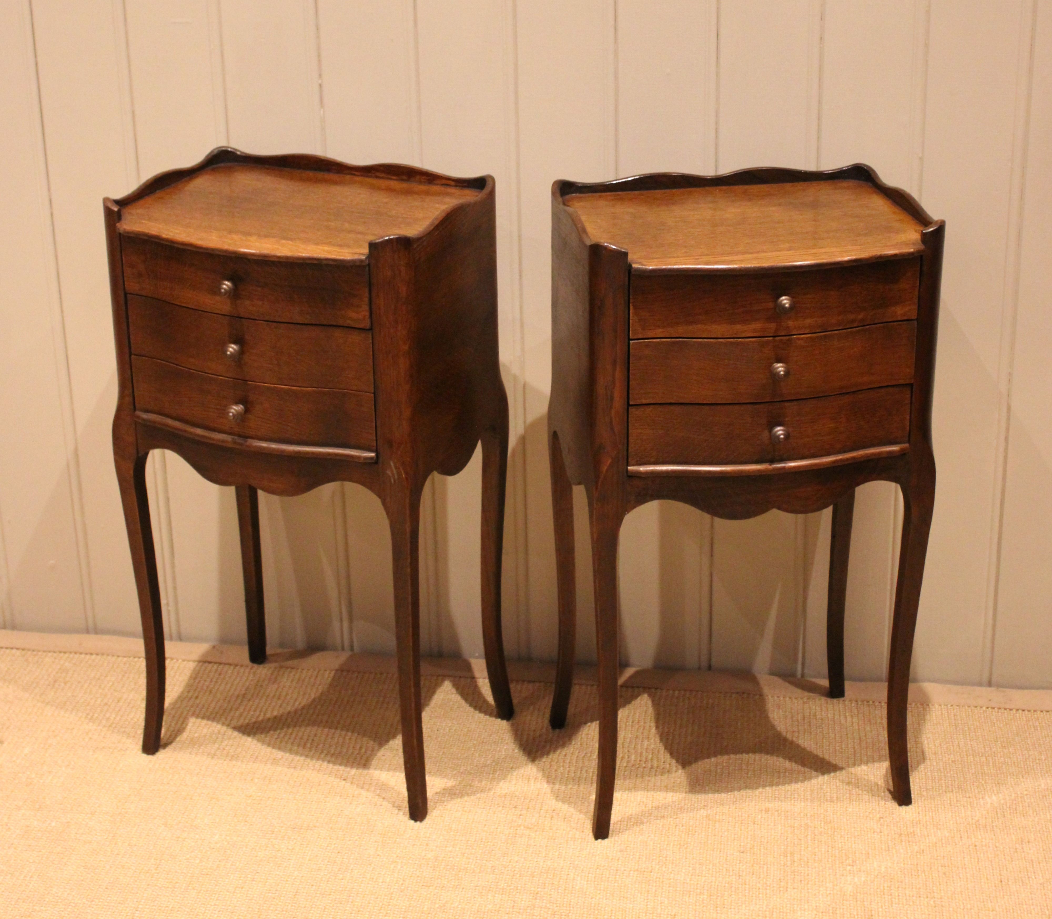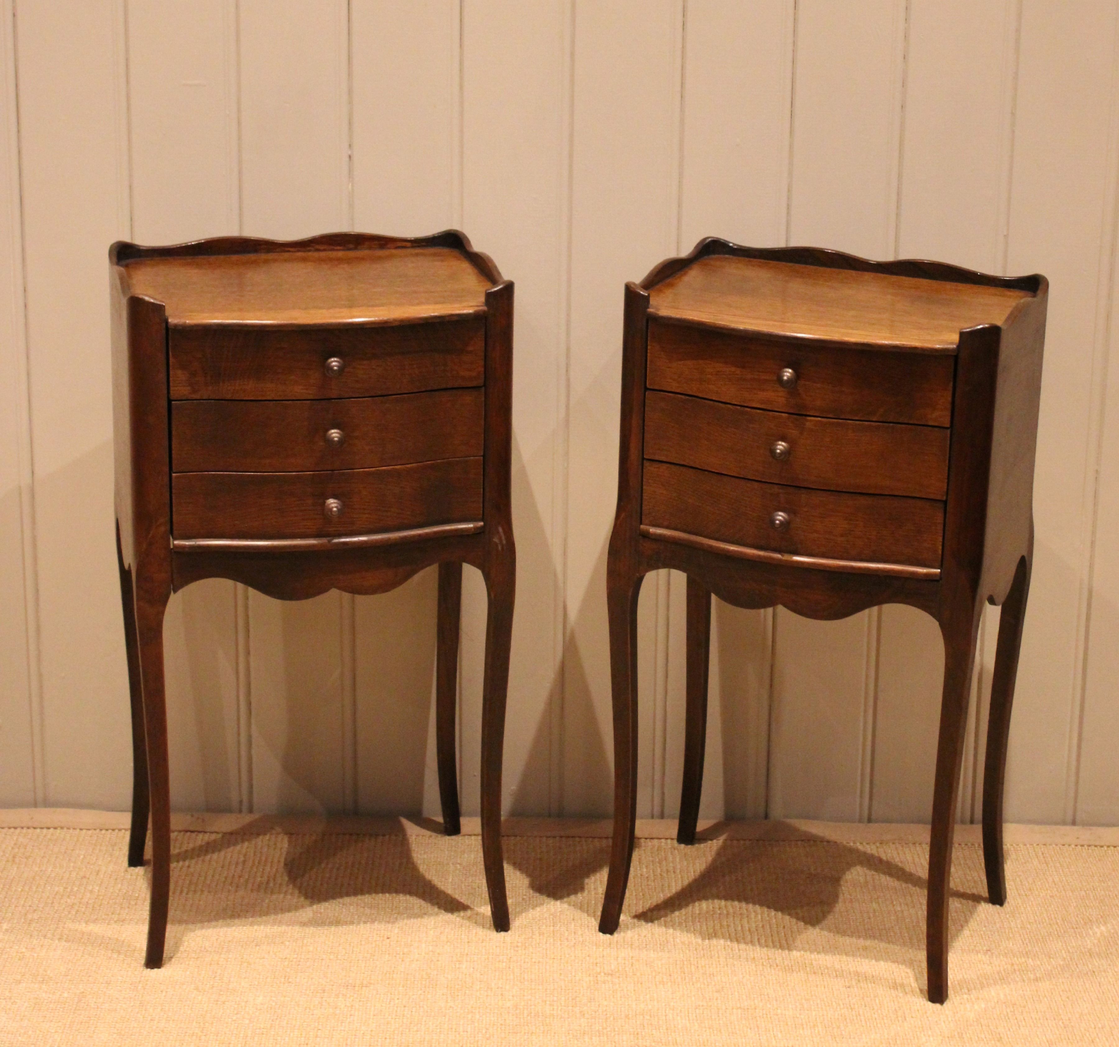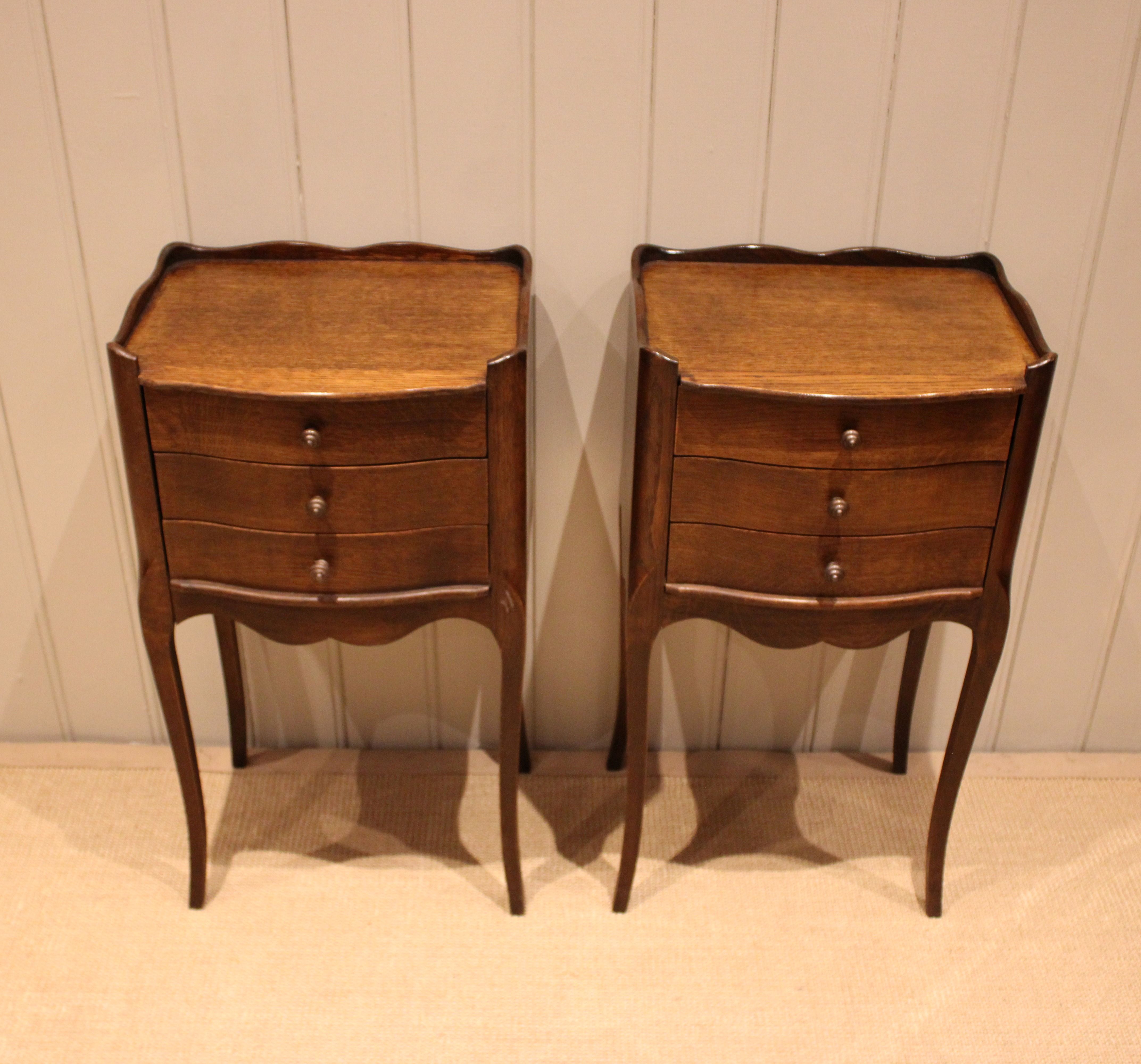 Pair of French oak bedside cabinets having three drawers , raised on cabriole legs .