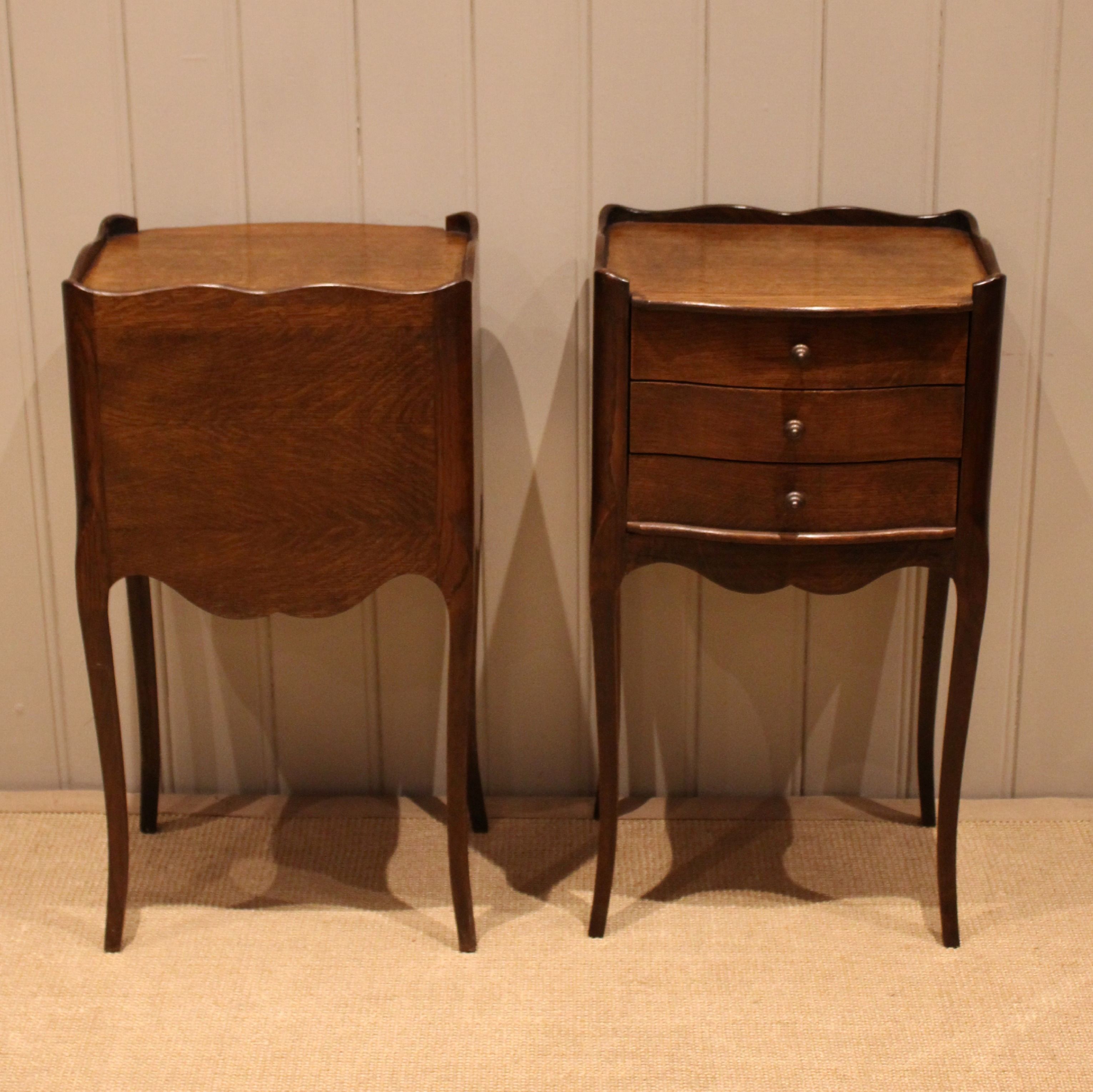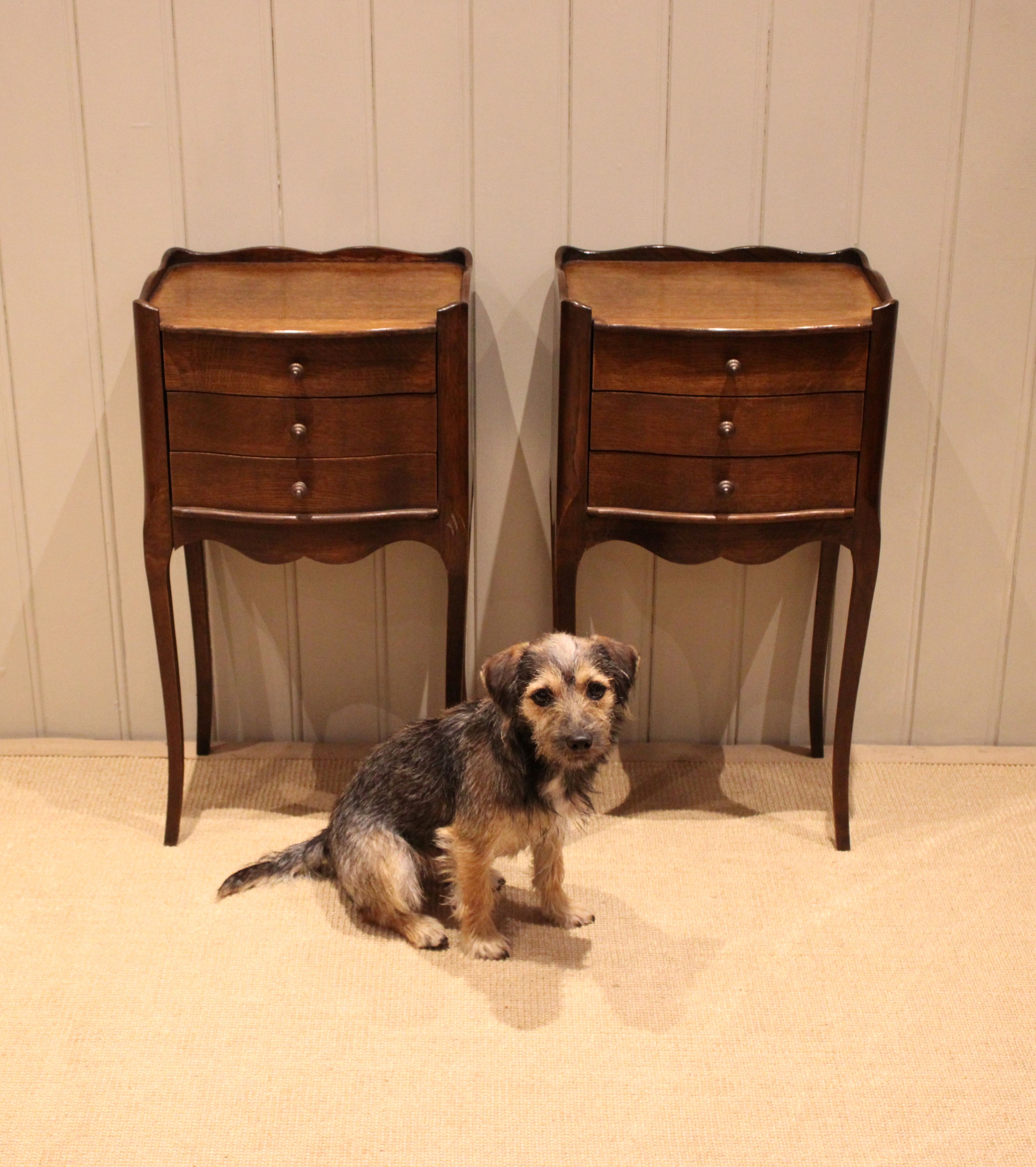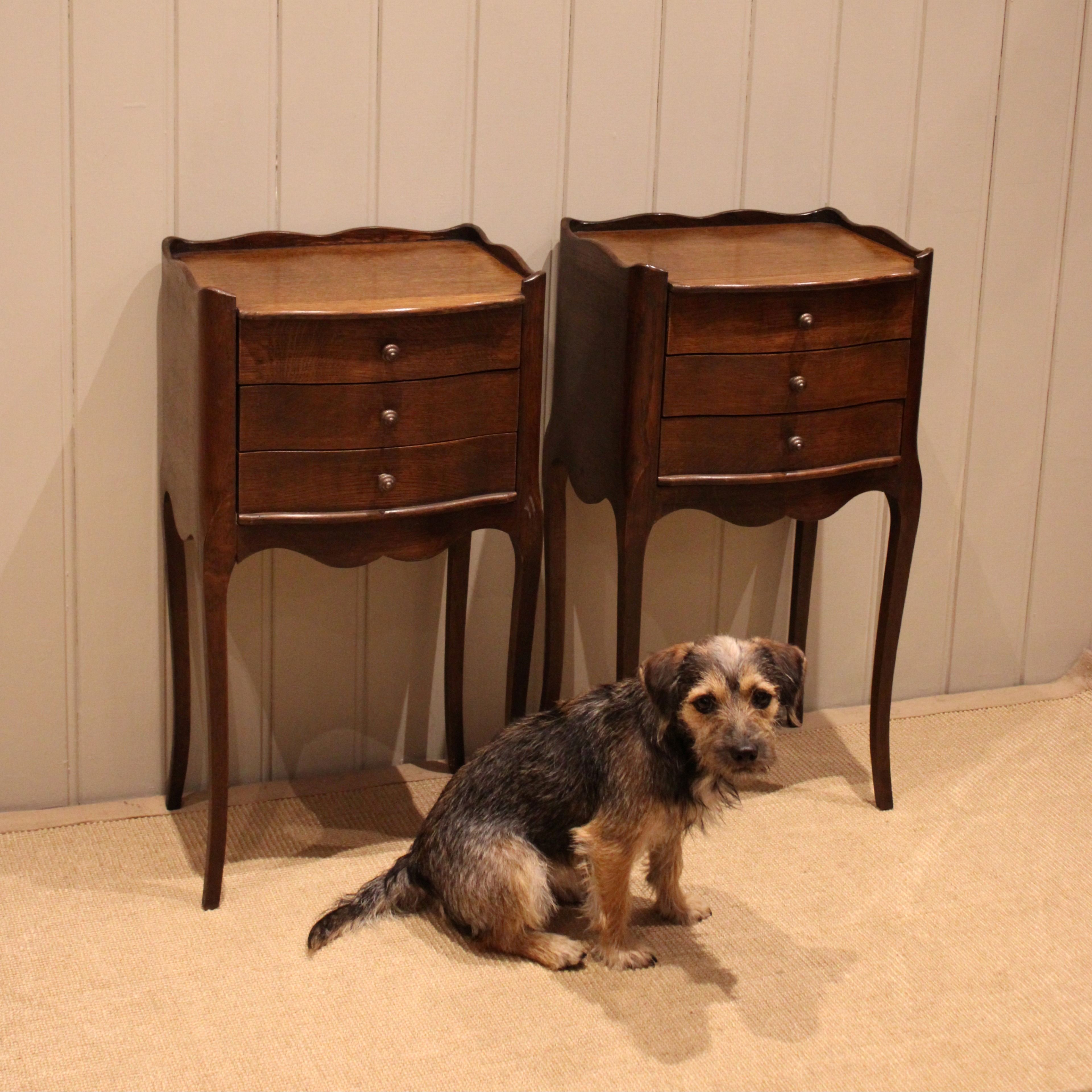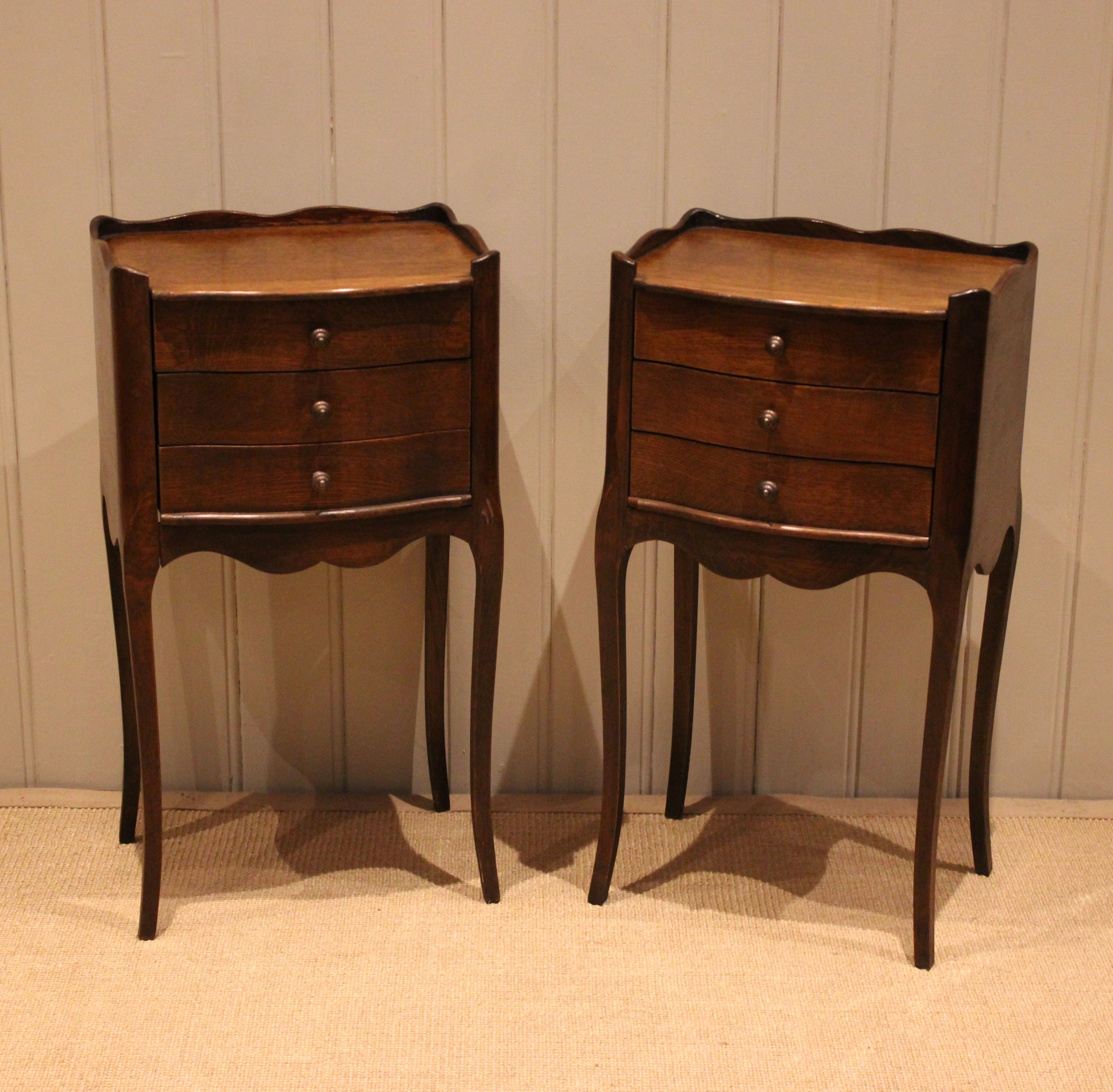 Pair of French oak bedside cabinets having three drawers , raised on cabriole legs .