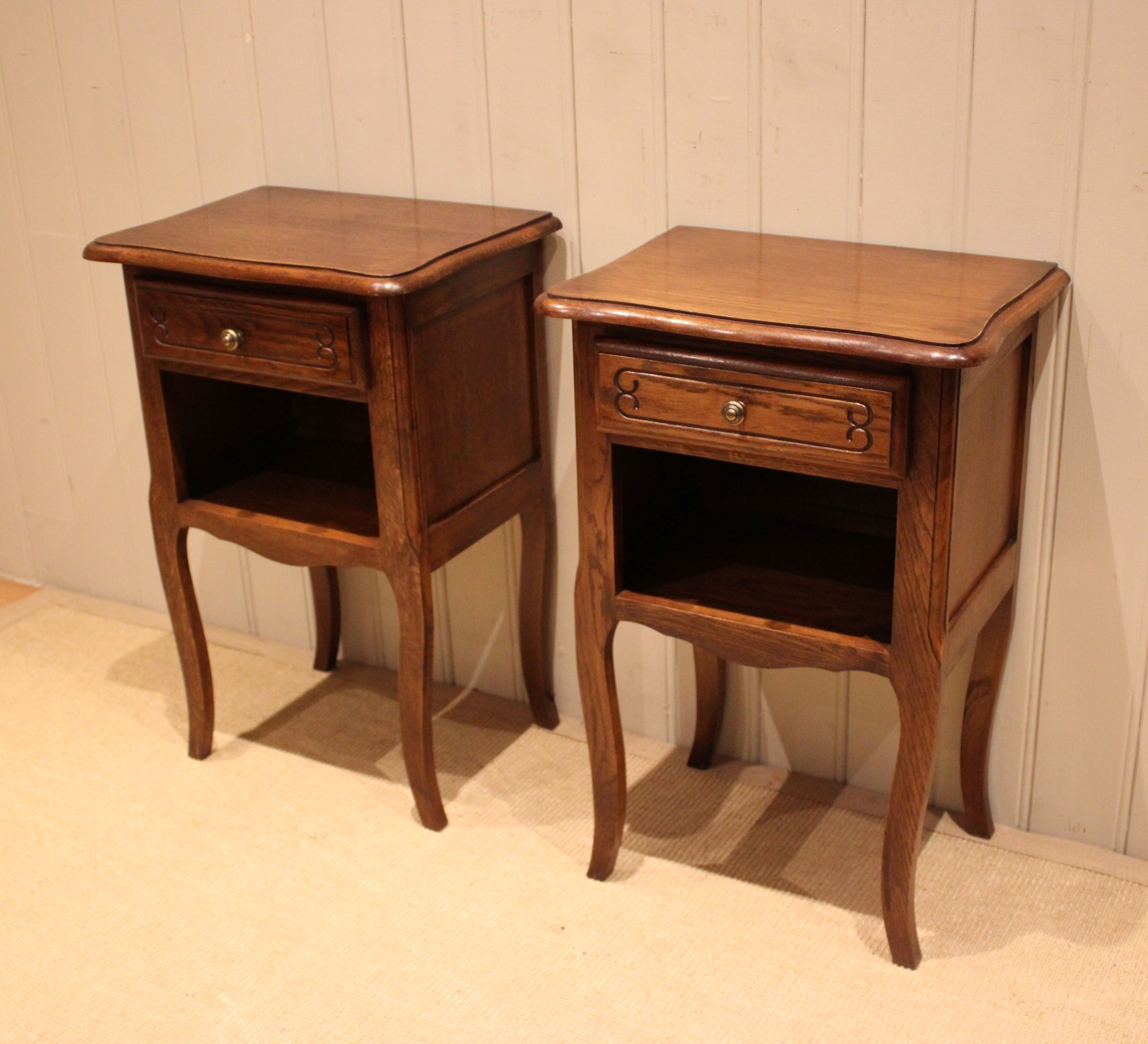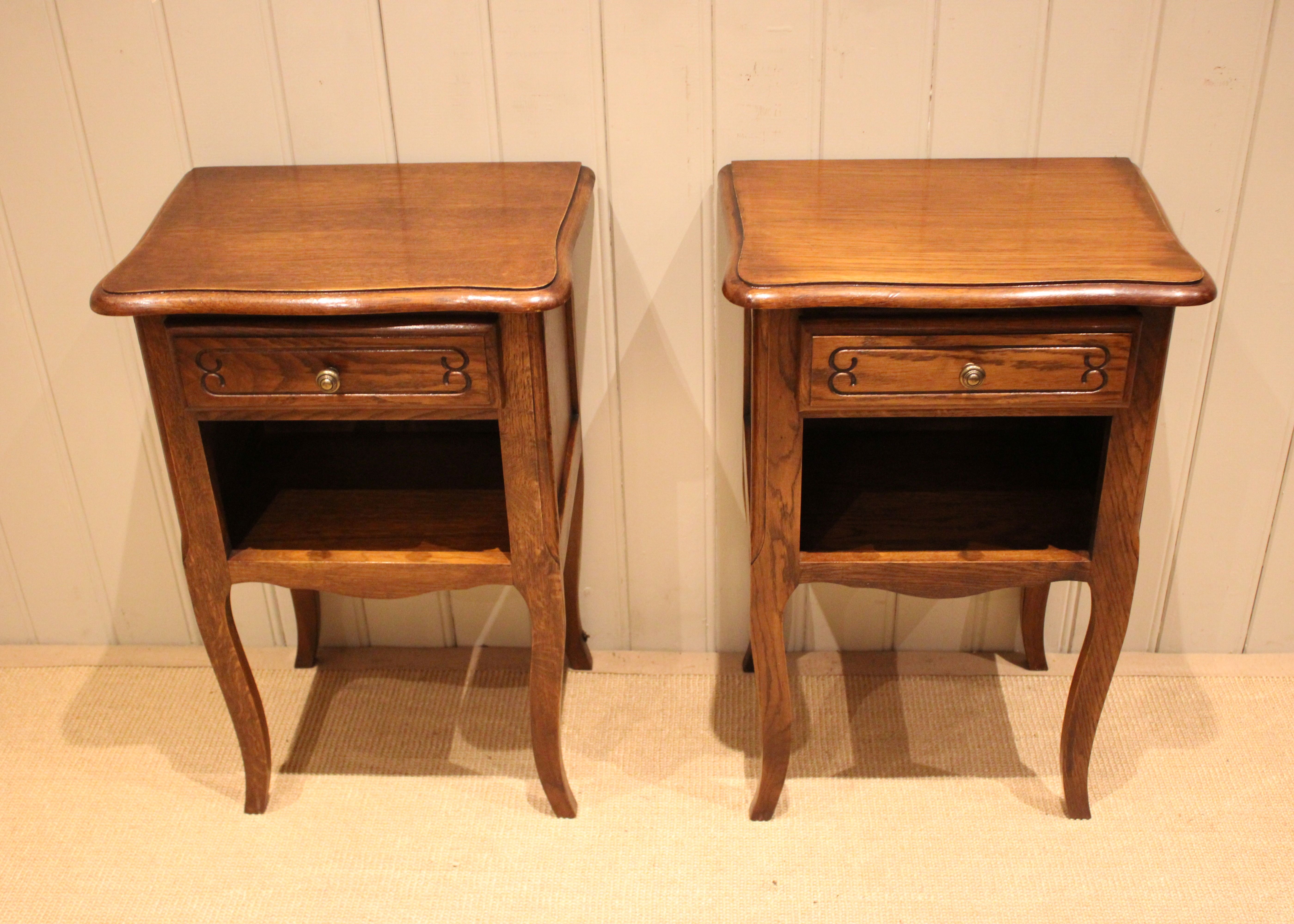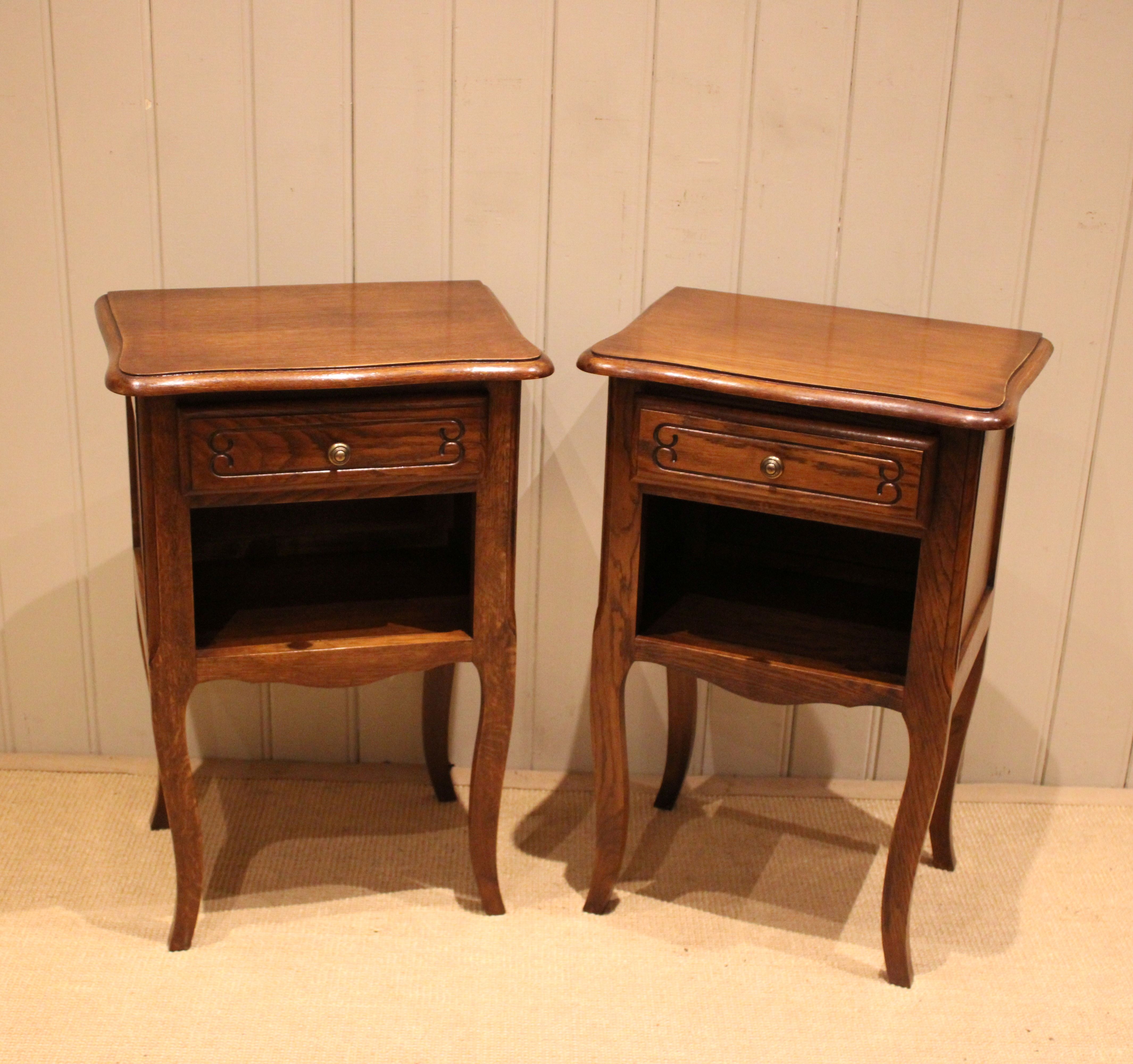 Pair of French oak bedside cabinets having shaped tops with a single drawer above an open cupboard to the base , raised on cabriole legs .