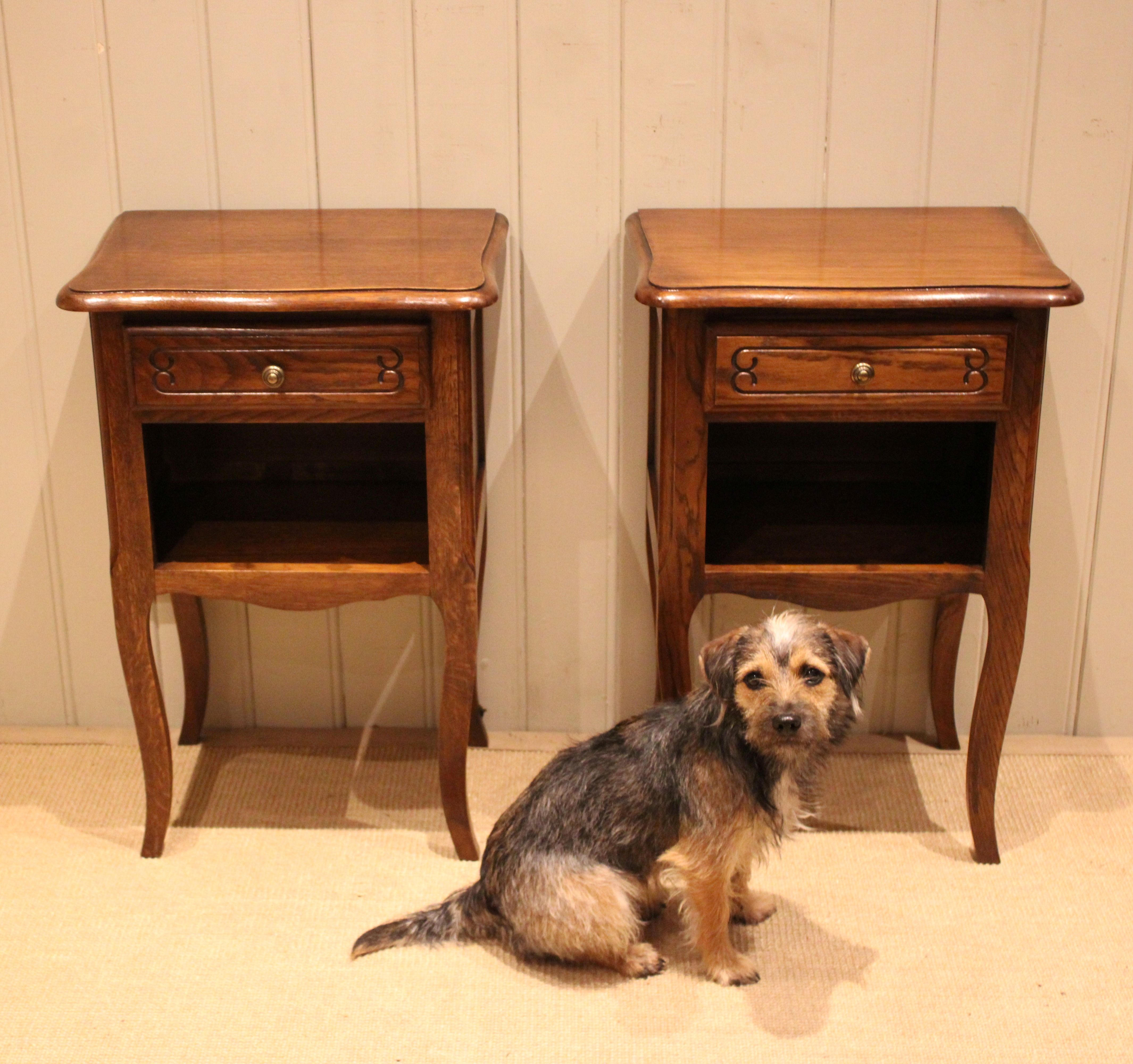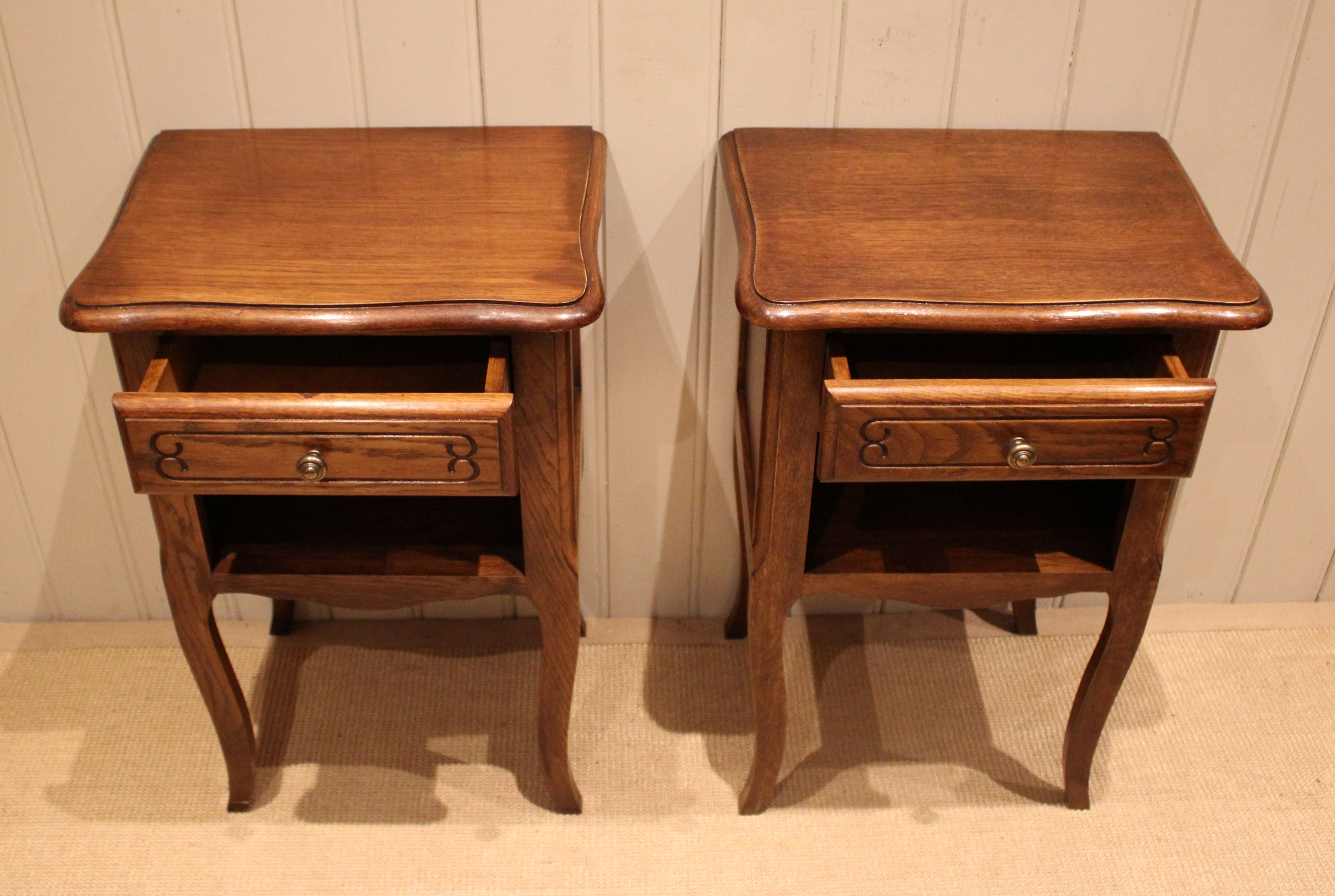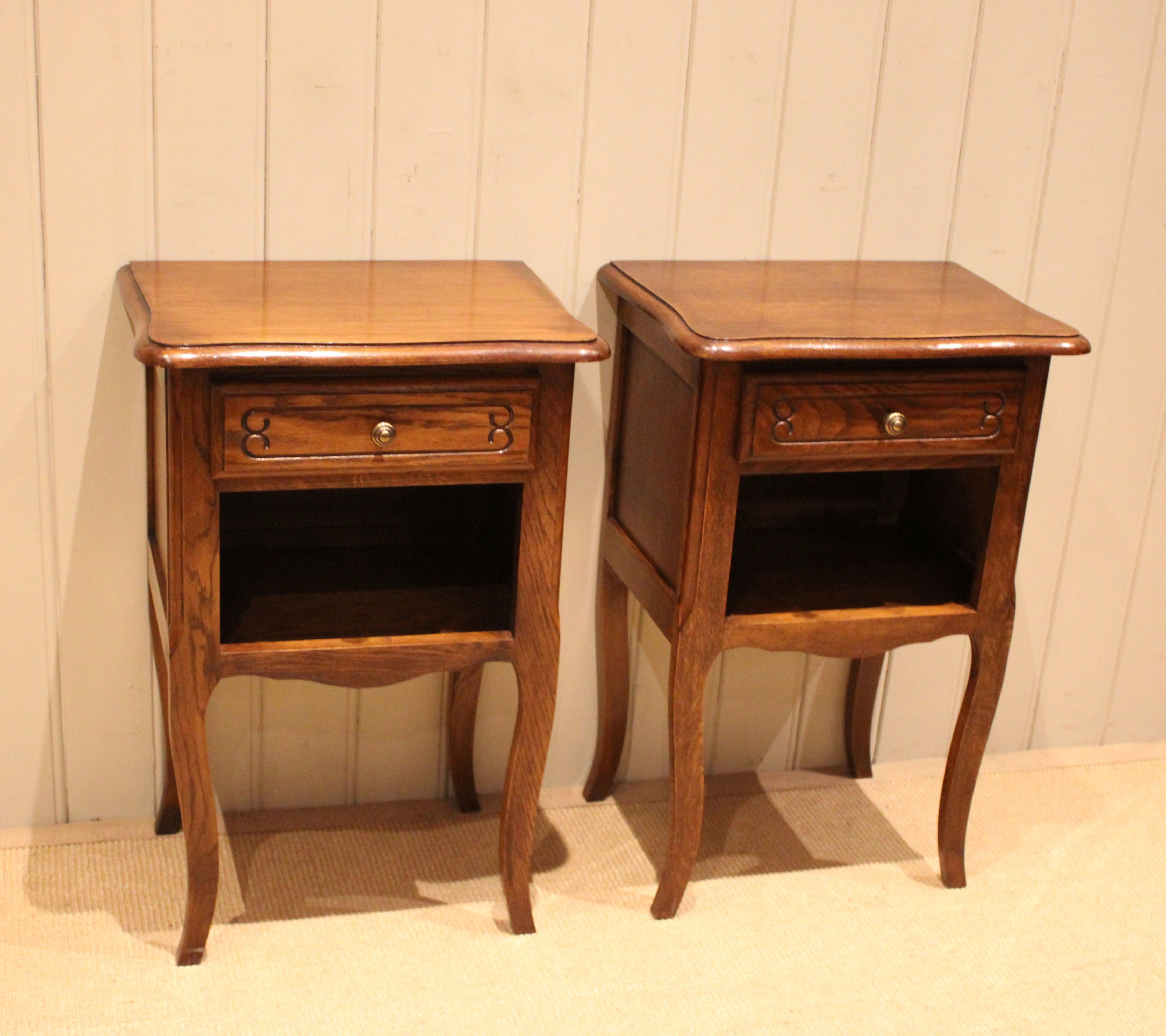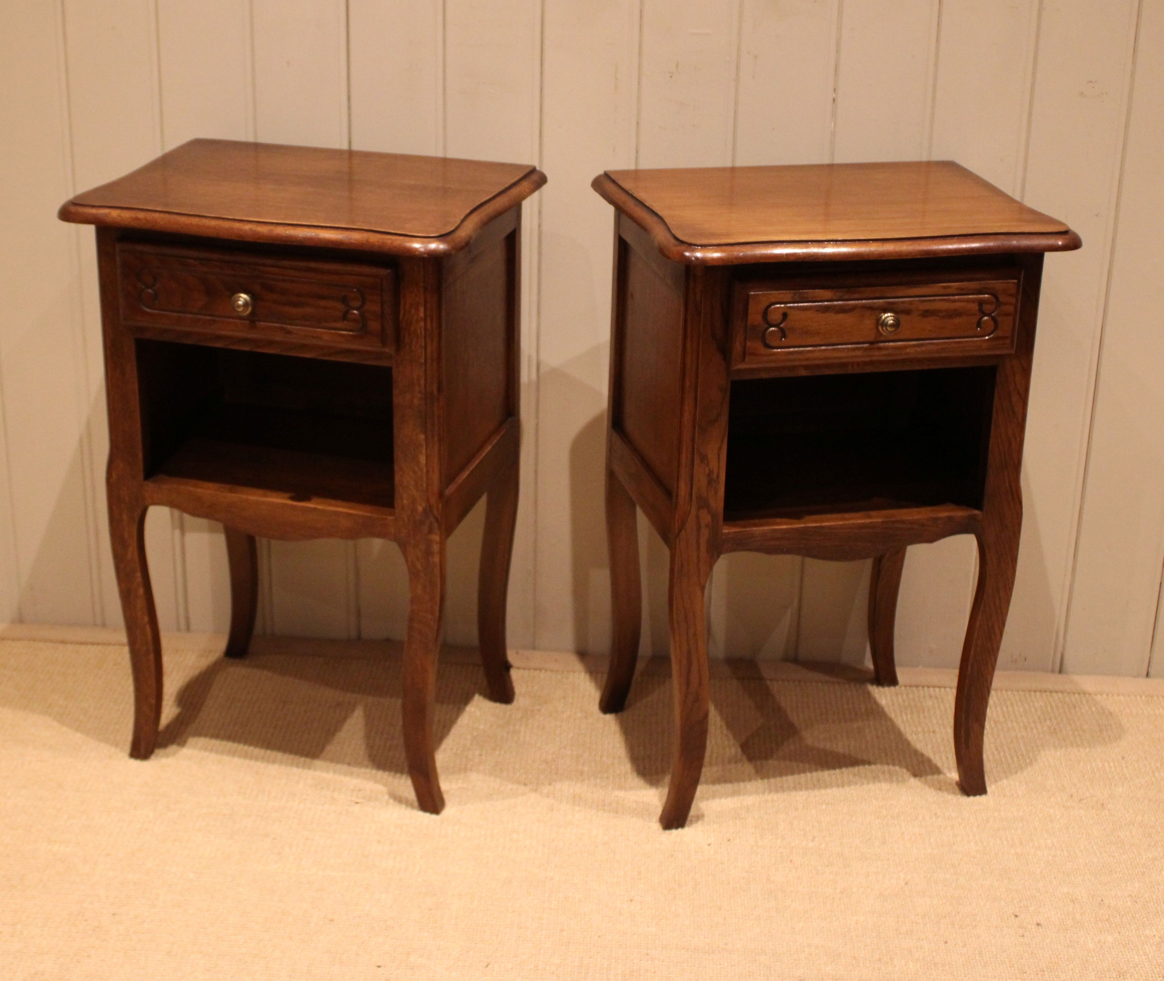 Pair of French oak bedside cabinets having shaped tops with a single drawer above an open cupboard to the base , raised on cabriole legs .