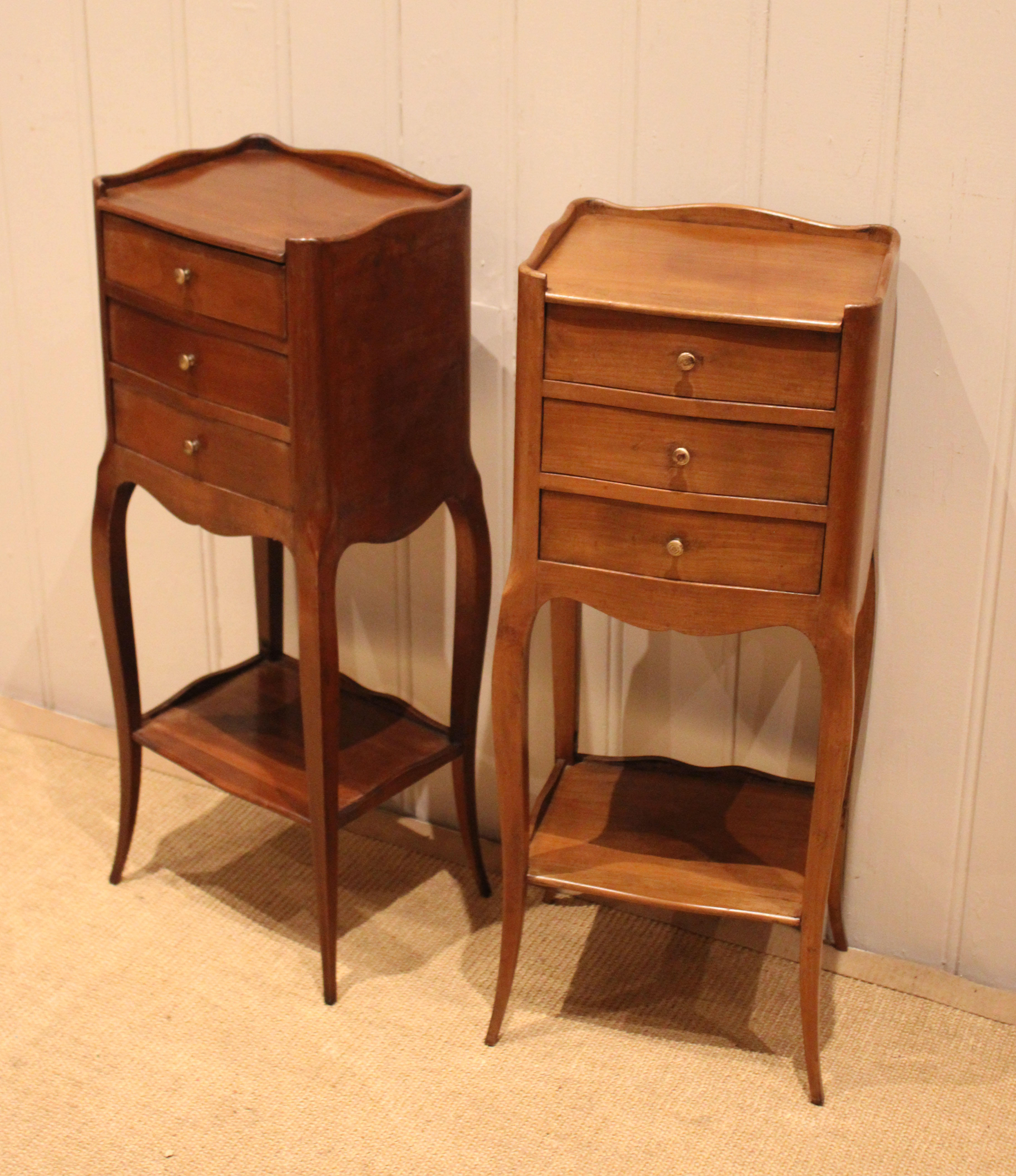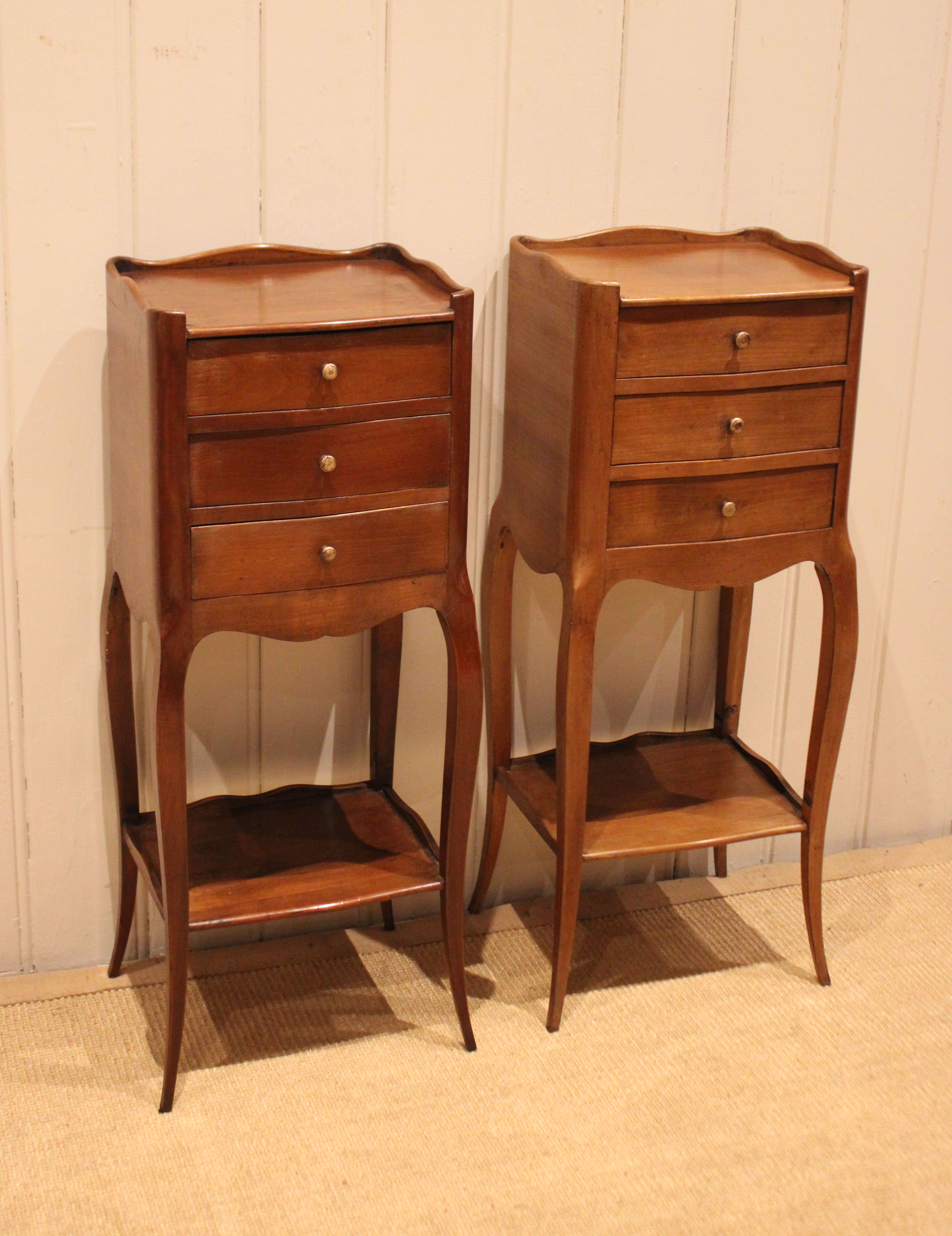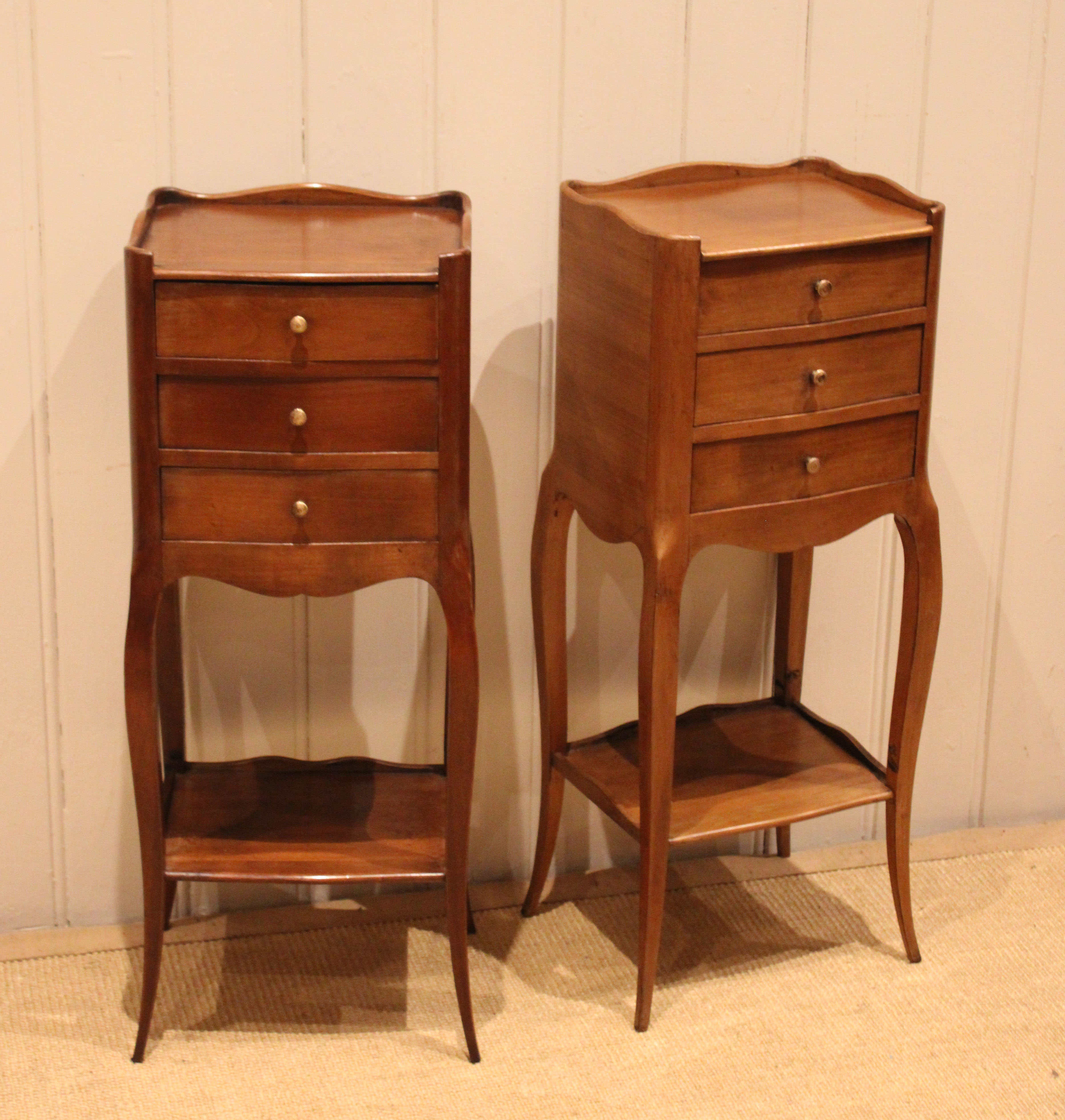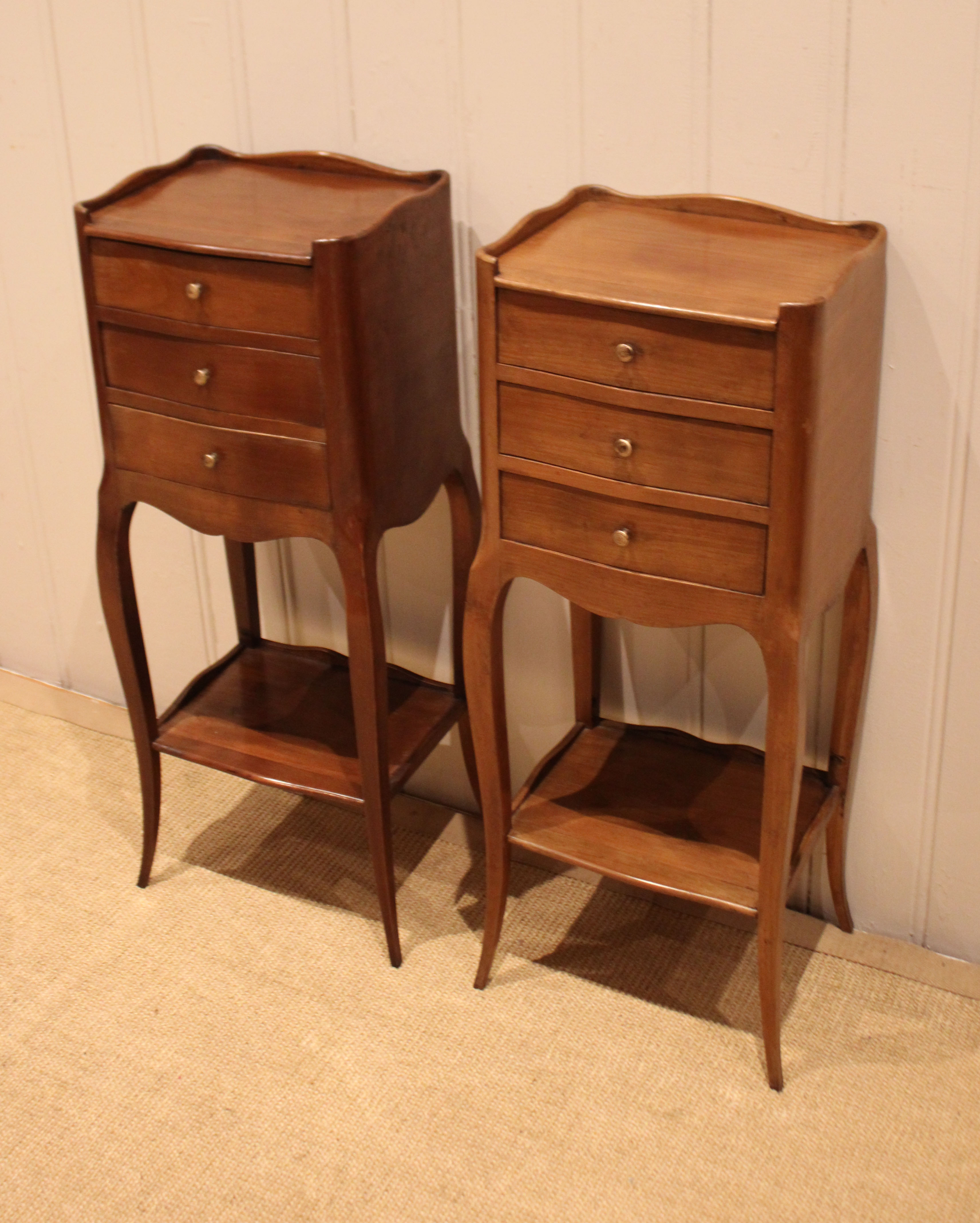Pair of French cherry wood small proportioned bedside cabinets having three drawers , with an under tier ,raised on outsplayed legs .