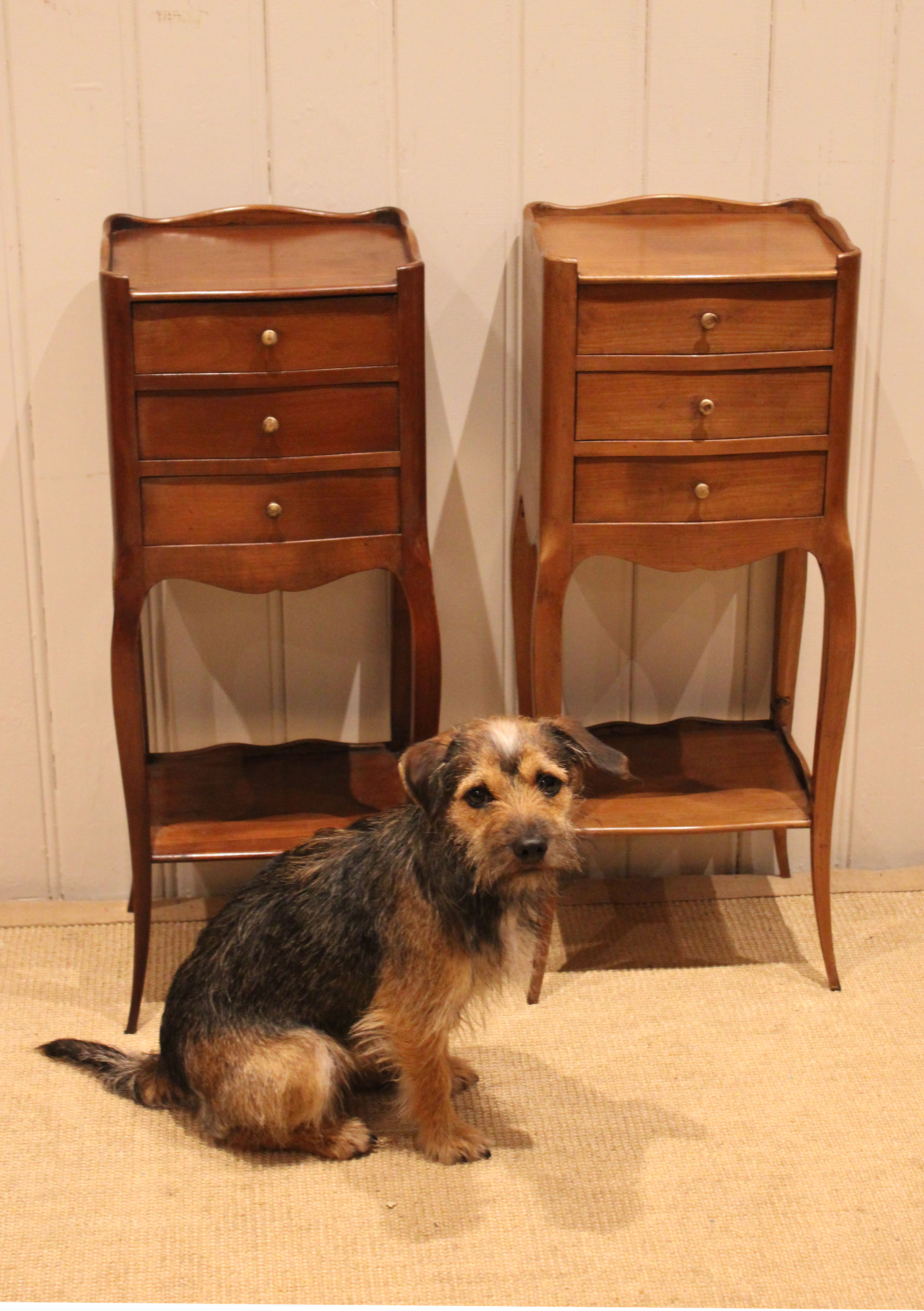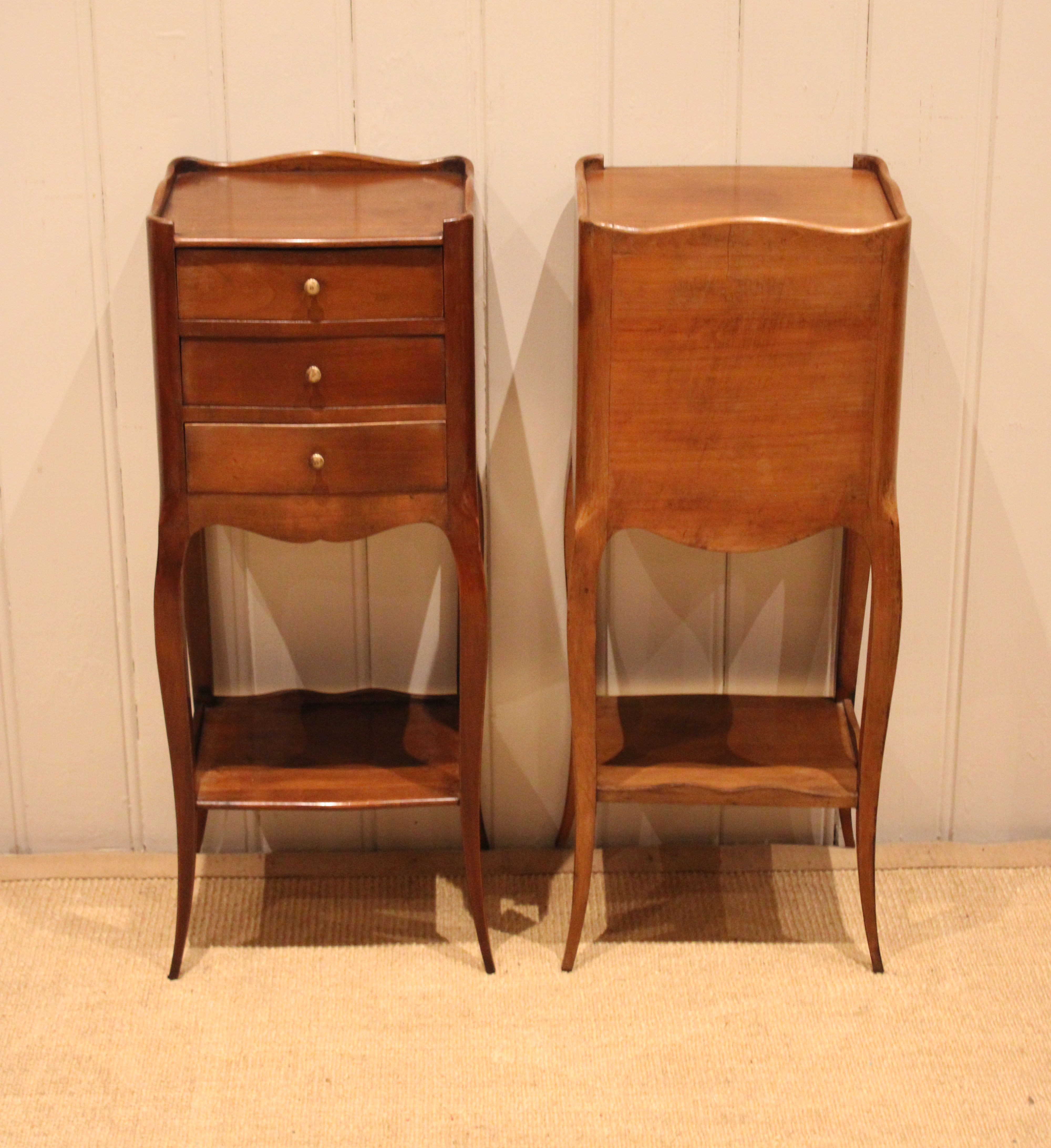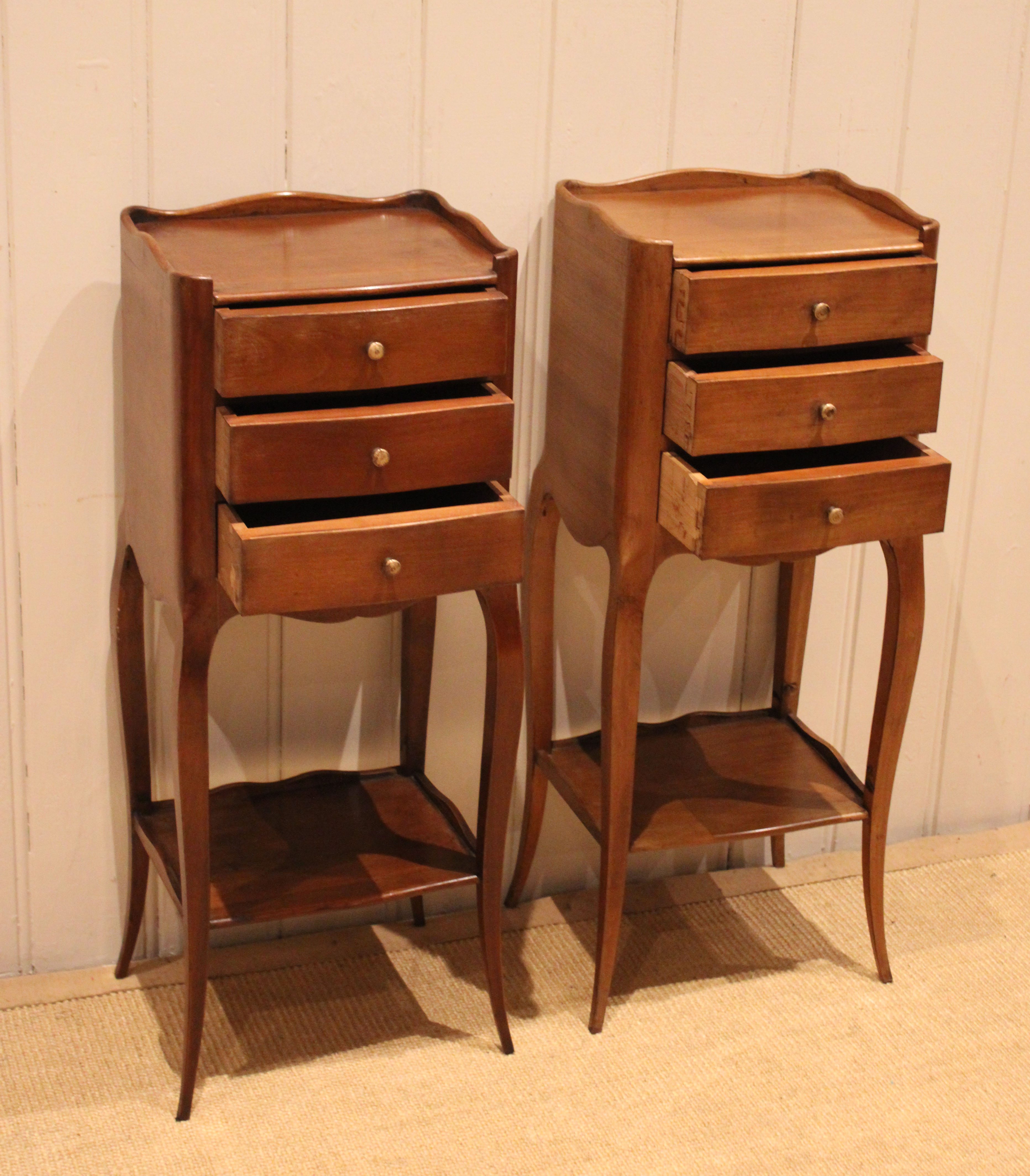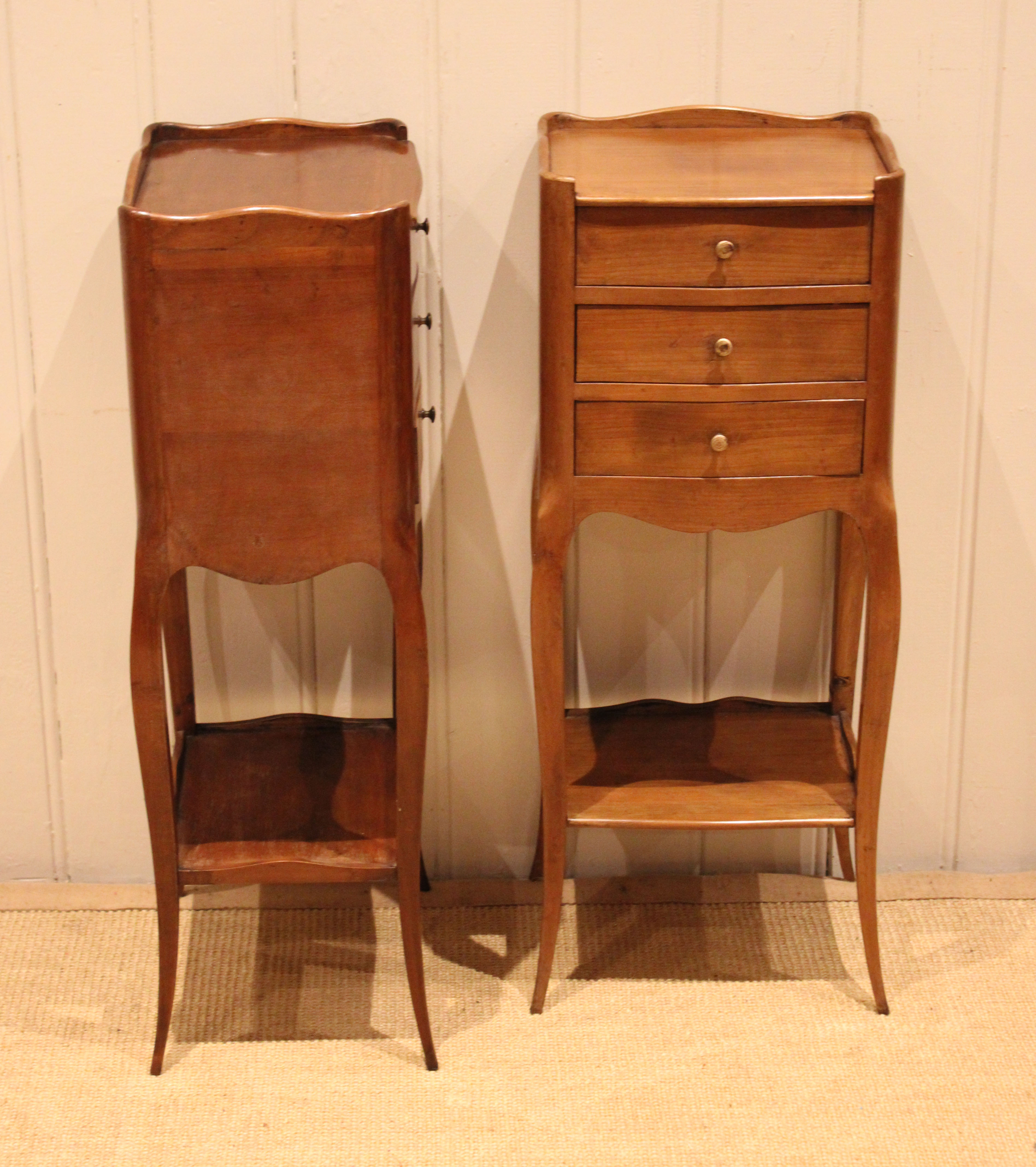 Pair of French cherry wood small proportioned bedside cabinets having three drawers , with an under tier ,raised on outsplayed legs .