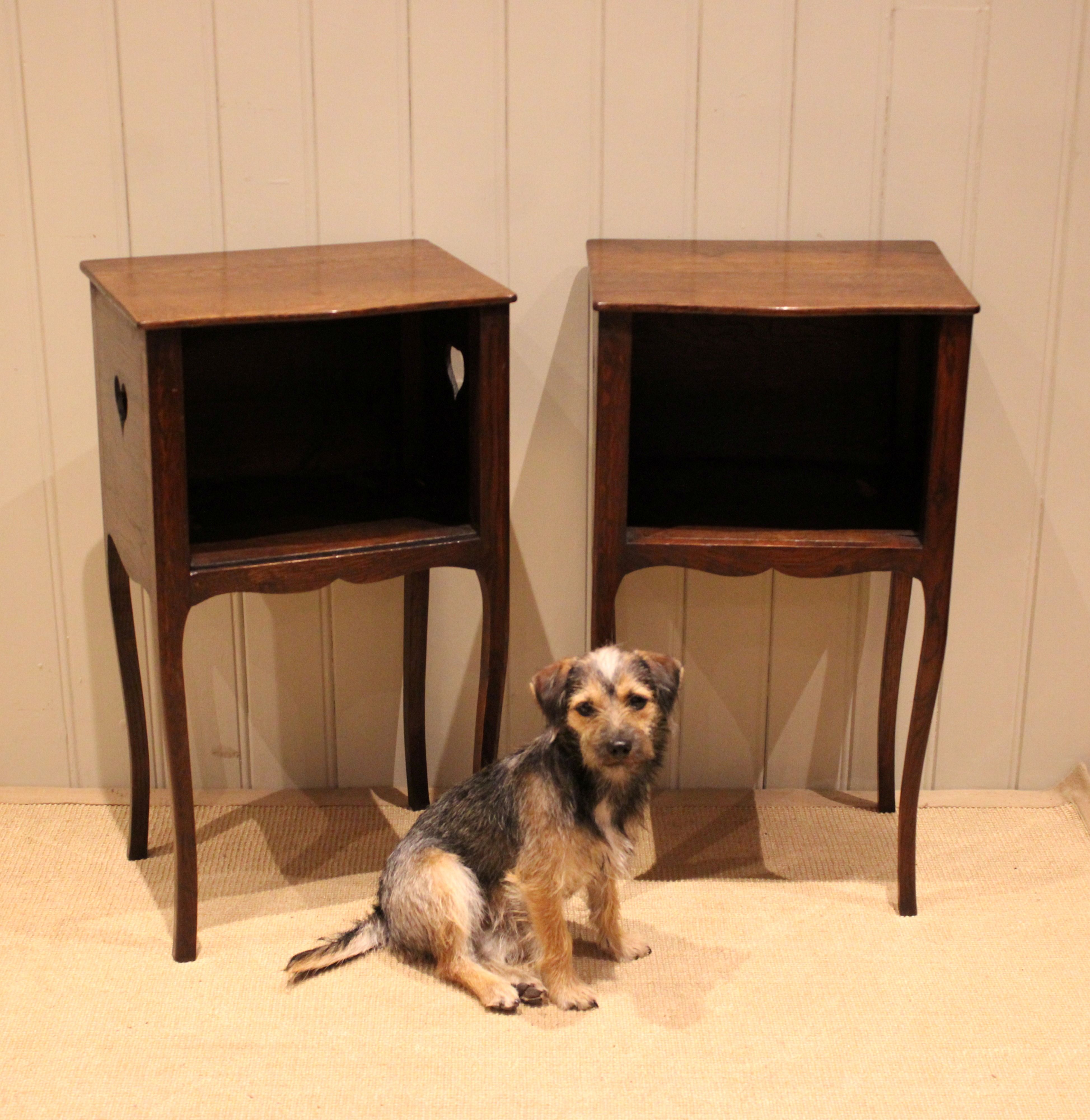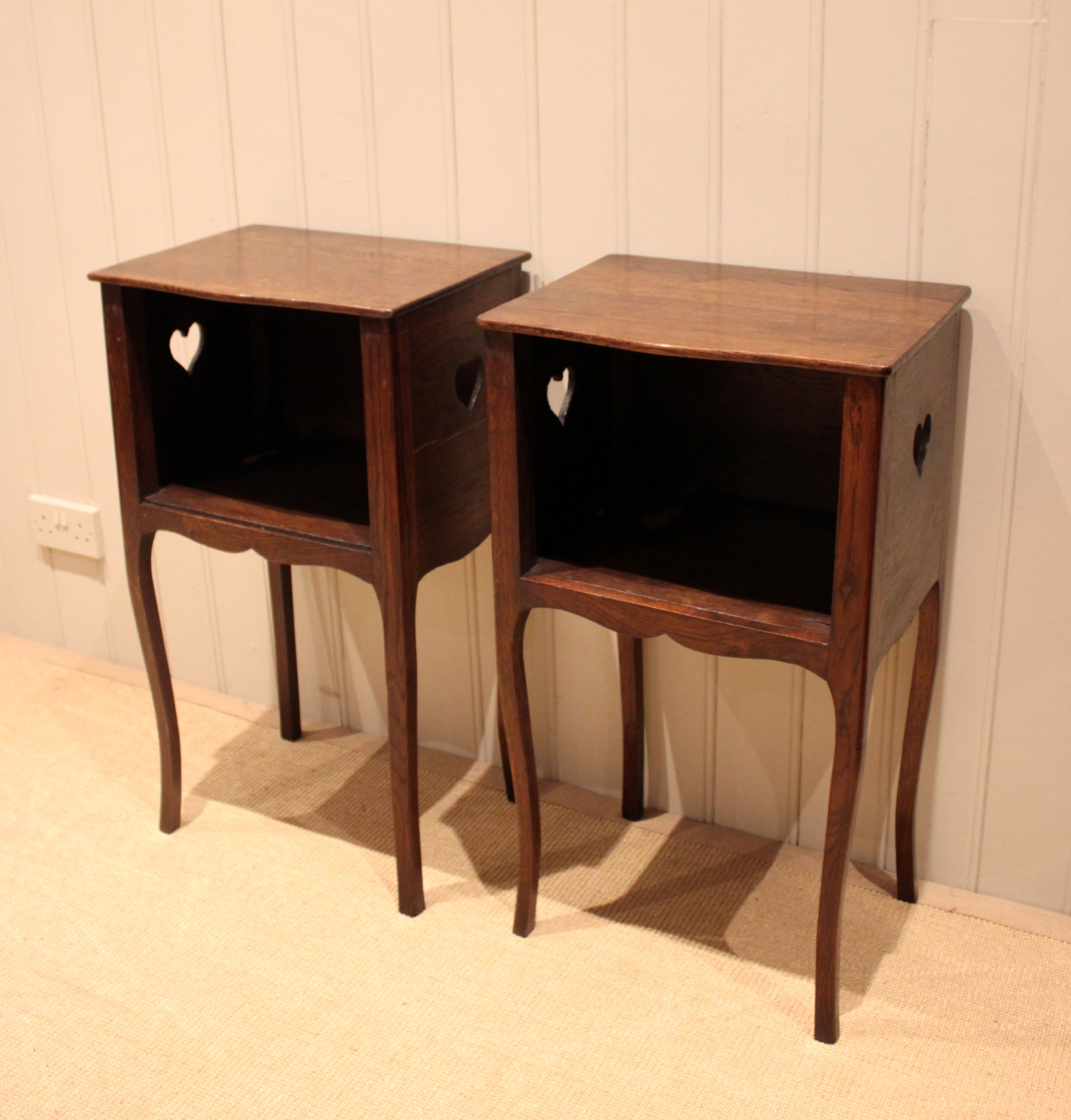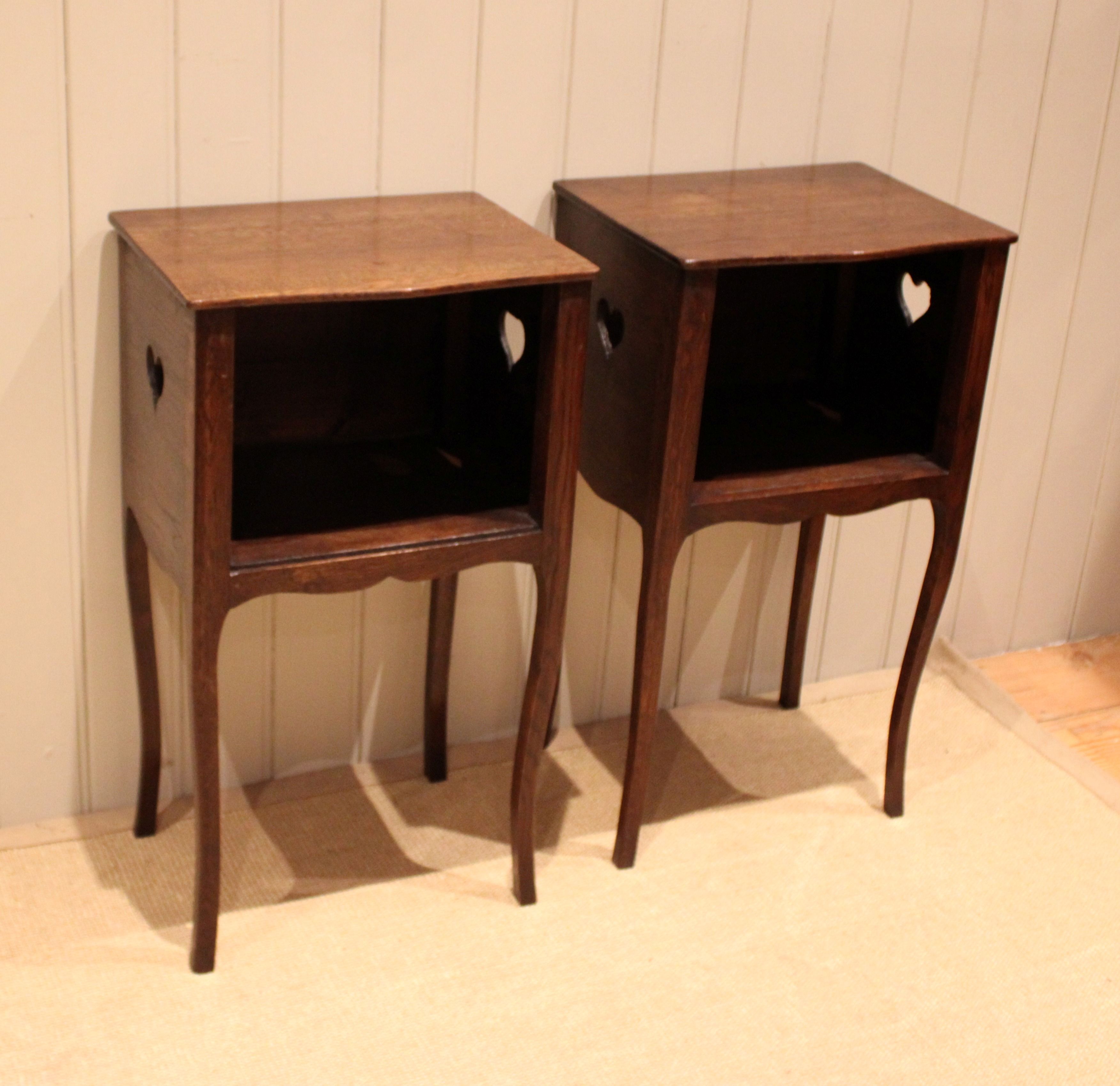 Pair of French oak open cupboard bedside cabinets having a pierced heart decoration to each side raised on curved tapering legs .