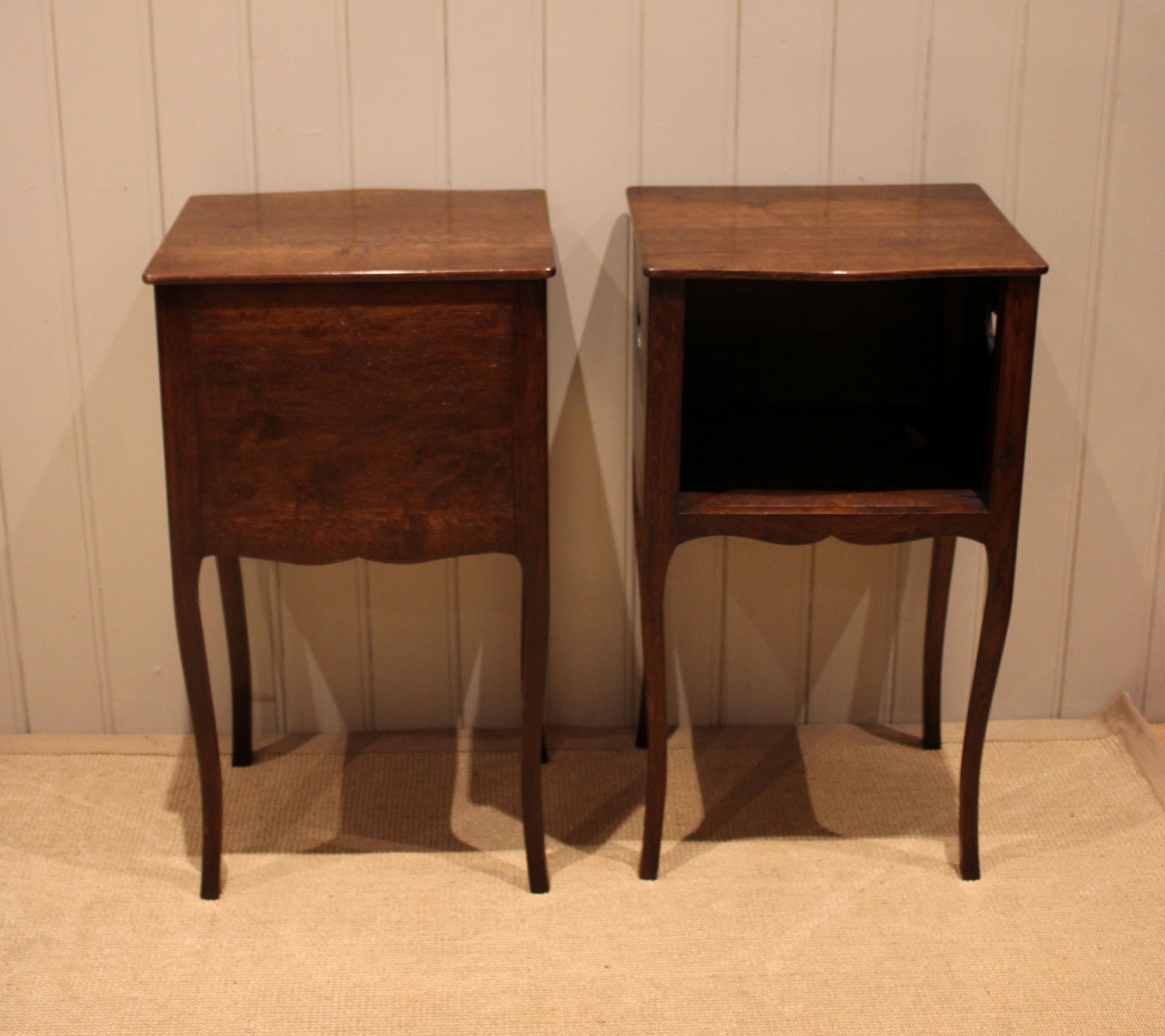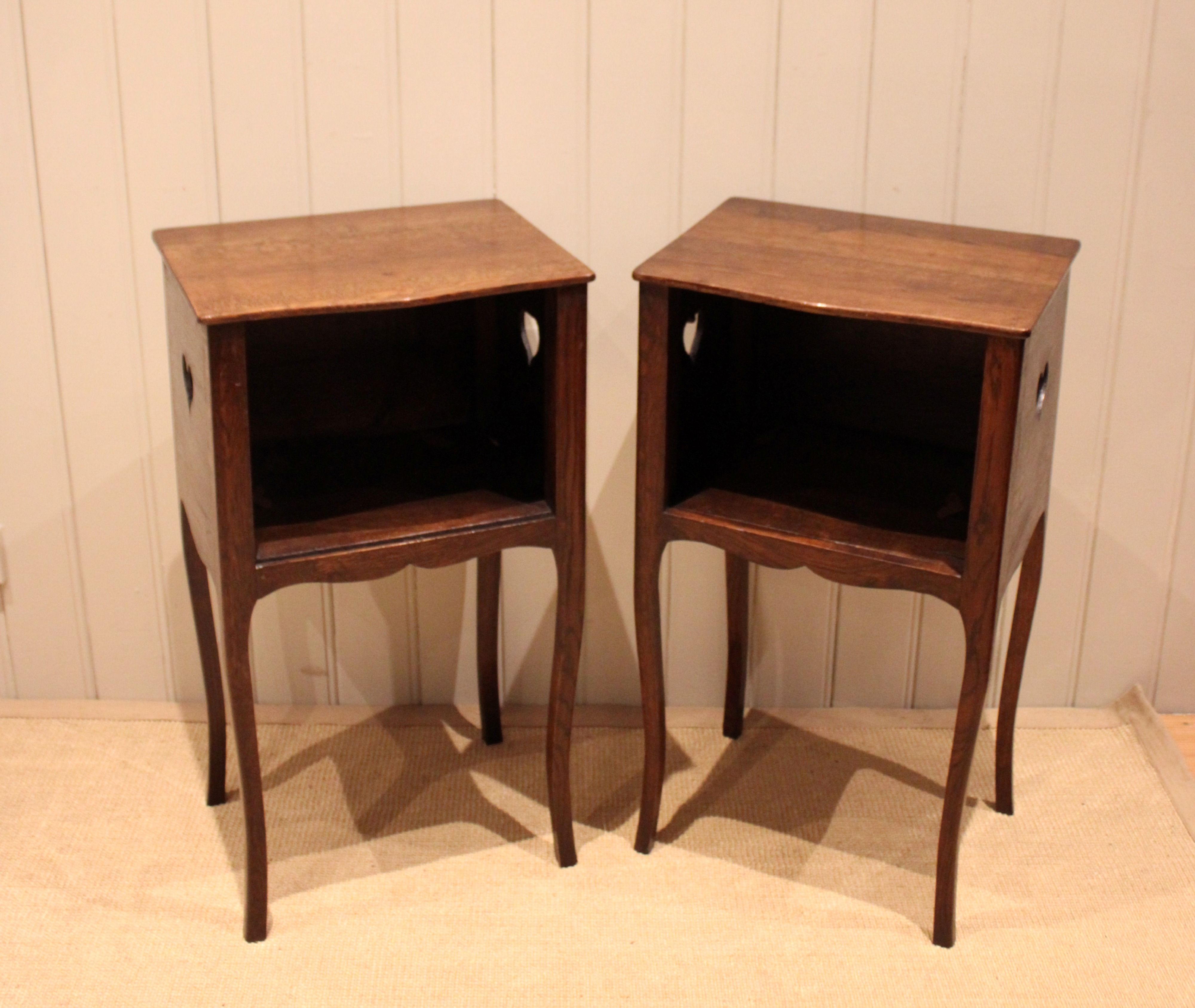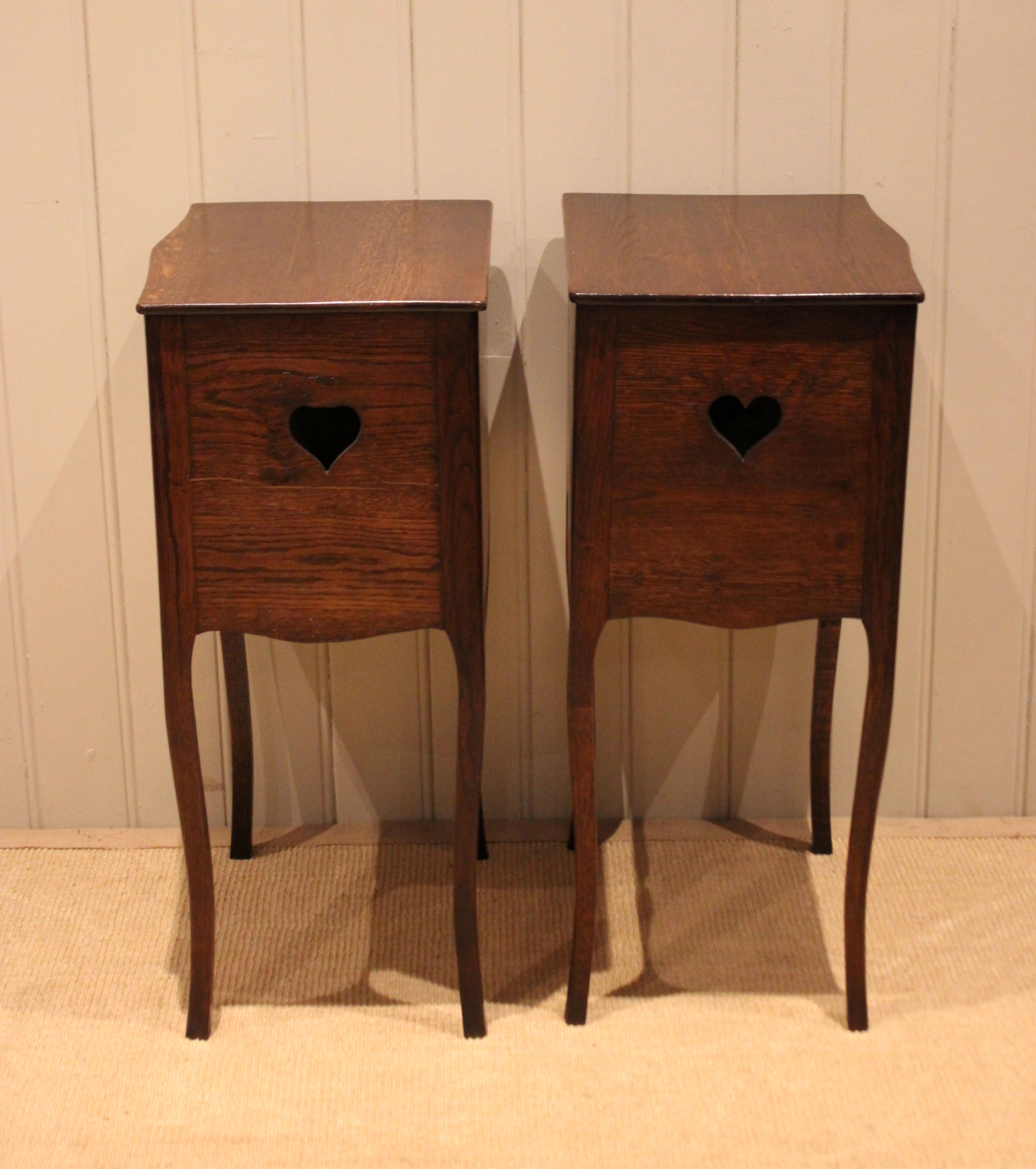 Pair of French oak open cupboard bedside cabinets having a pierced heart decoration to each side raised on curved tapering legs .
